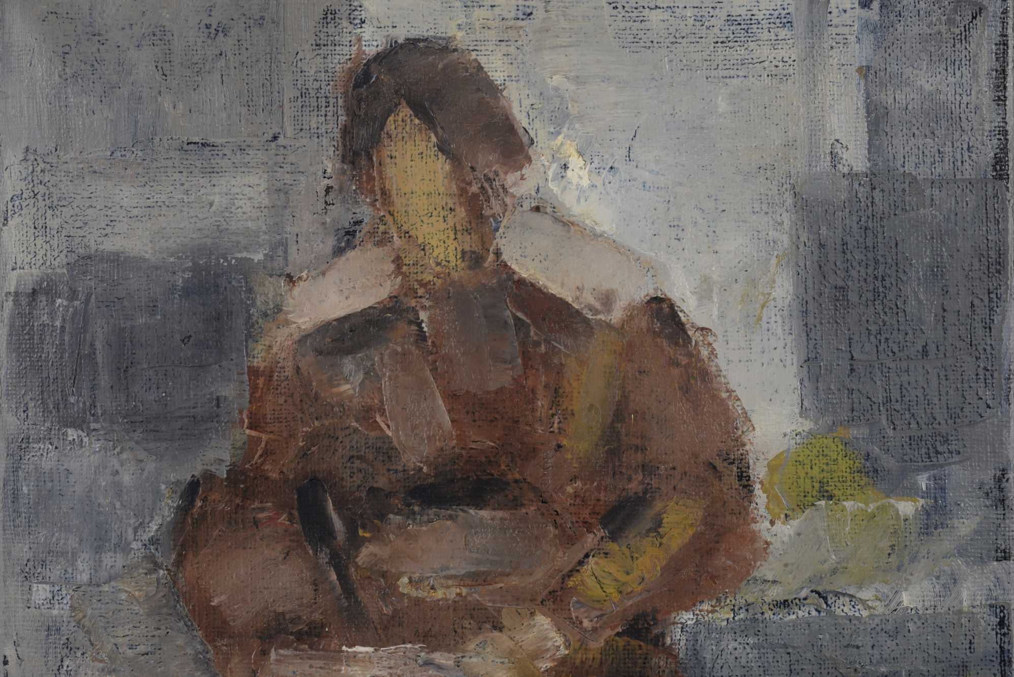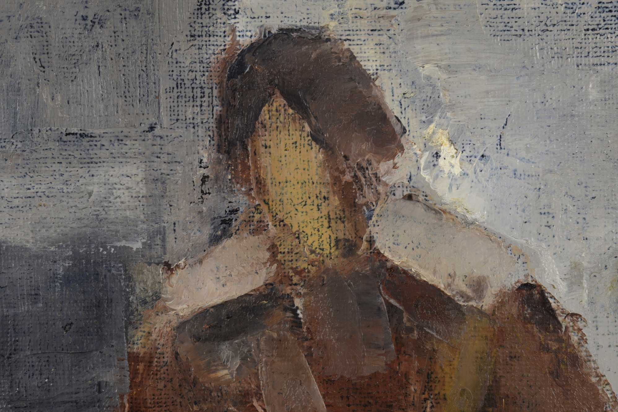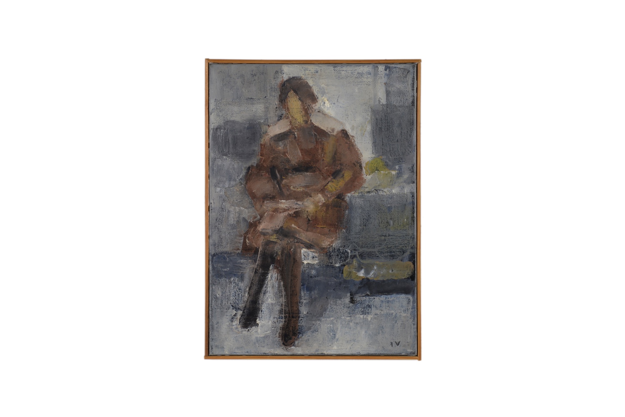 デンマークの画家、イェッペ・ヴォンティリウスによる人物画油彩作品です。モデルの女性は氏の奥方と伝えられており、風景と並び好んで描かれた画題です。キャンバスの裏書により1975年9月〜10月に描かれた作品と推測されます。家具デザイナーで知られるボーエ・モーエンセンの自邸にもヴォンティリウスの作品が飾られていたことが判っています。