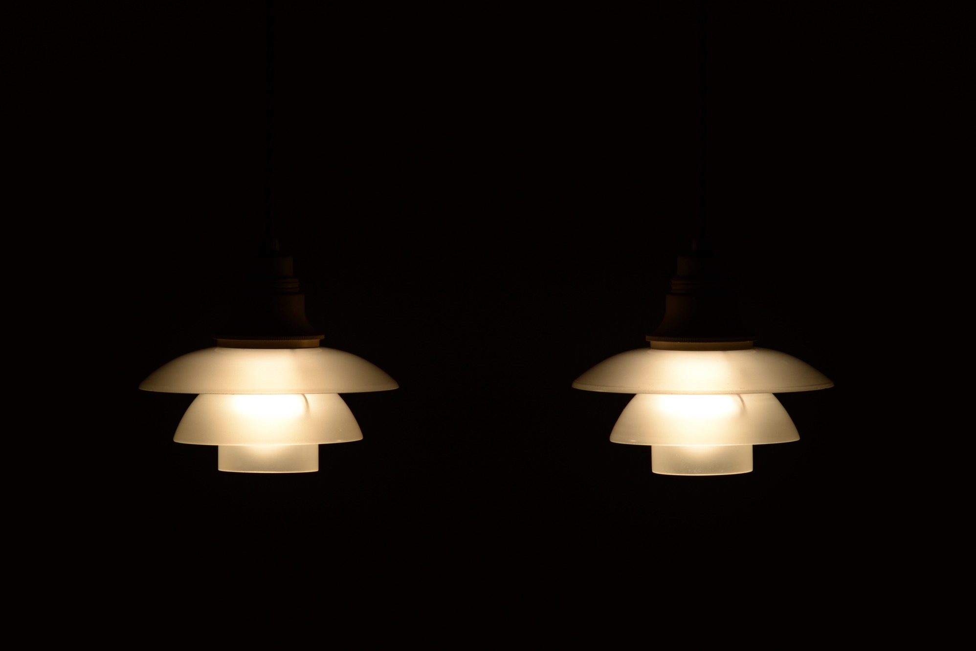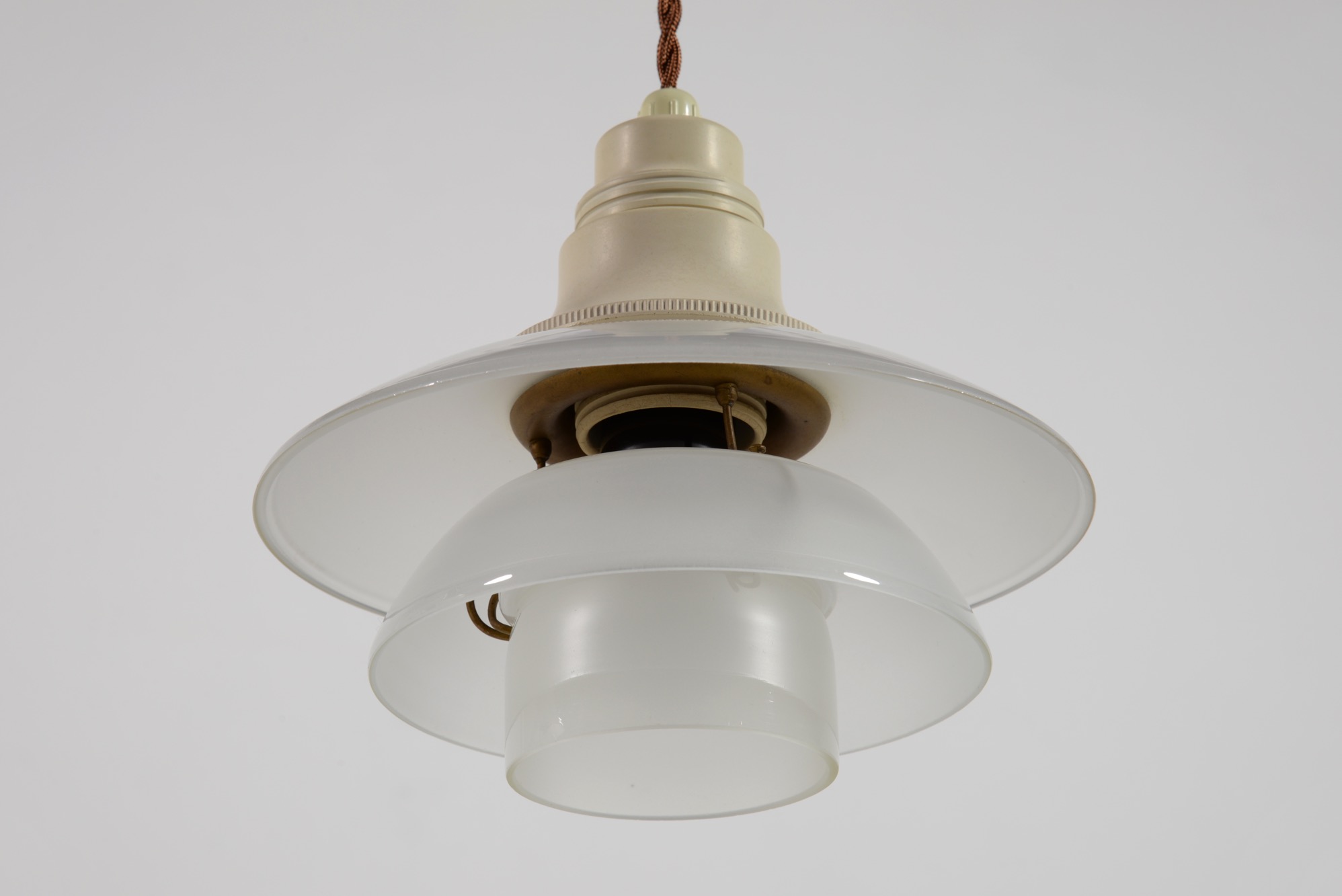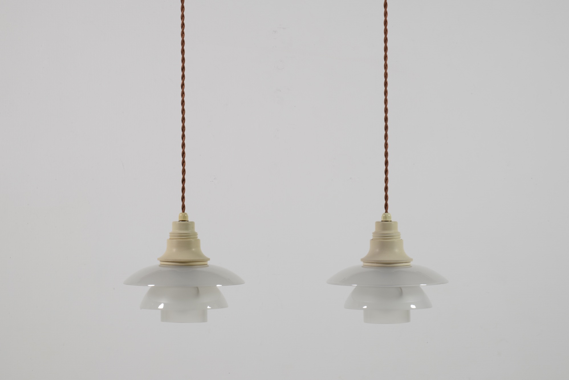 ポール・ヘニングセンによる、PH2/2ペンダントランプ一対、1940年代頃の製品です。腐食によるフロストガラスシェードには、吹きによる段文や、成形時に引っ張られた気泡などが見られ、ハンドメイドで作られていたことが伺えます。ホワイトベークライト製のソケットハウスの劣化は見られず、オリジナルのボトムボウルも備わり、コンディションは良好です。