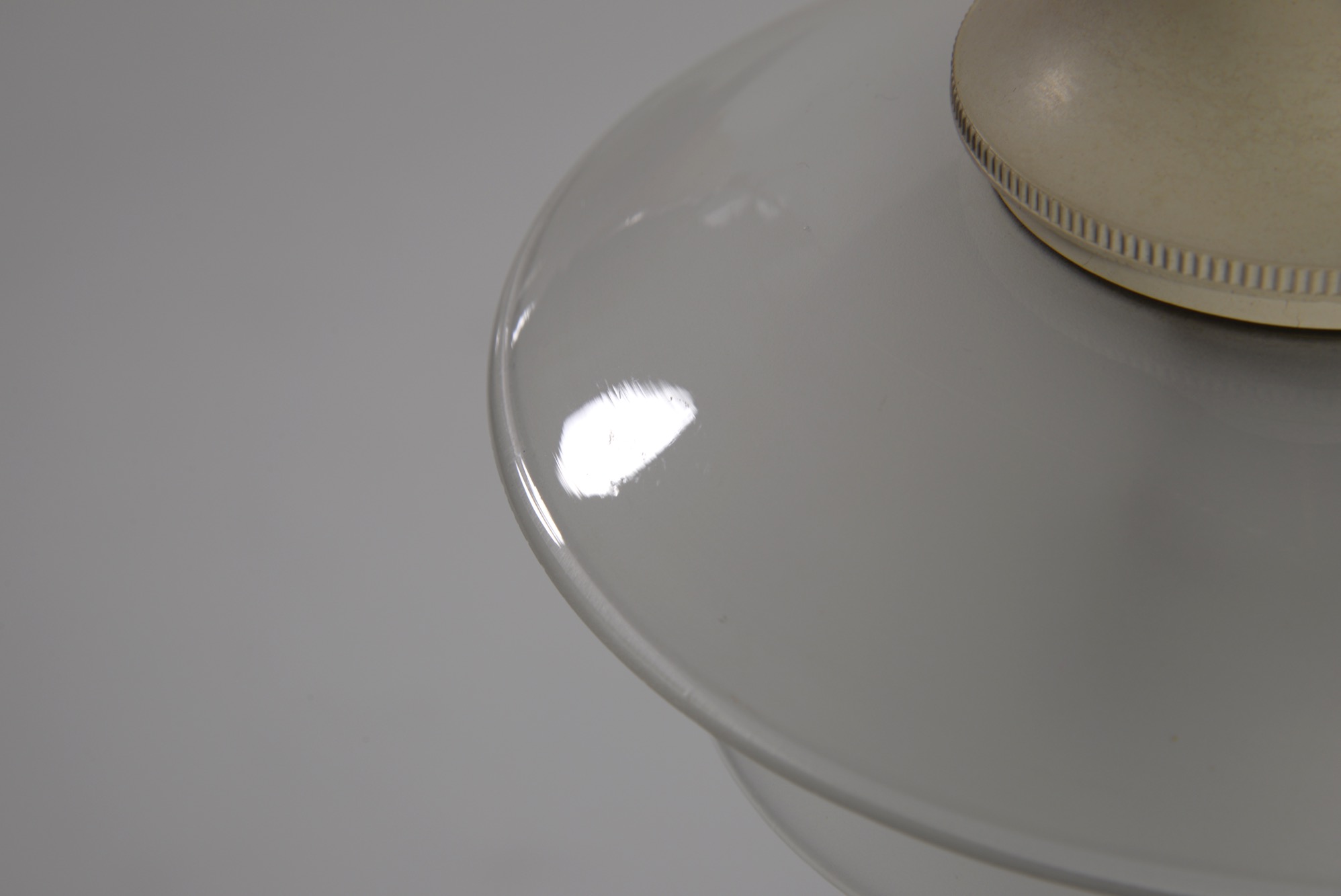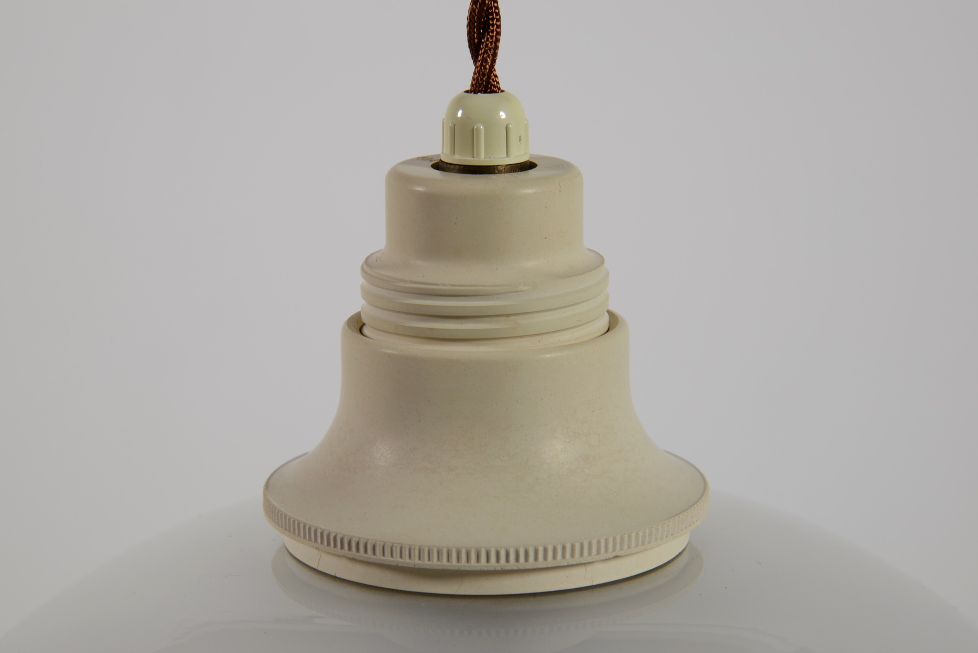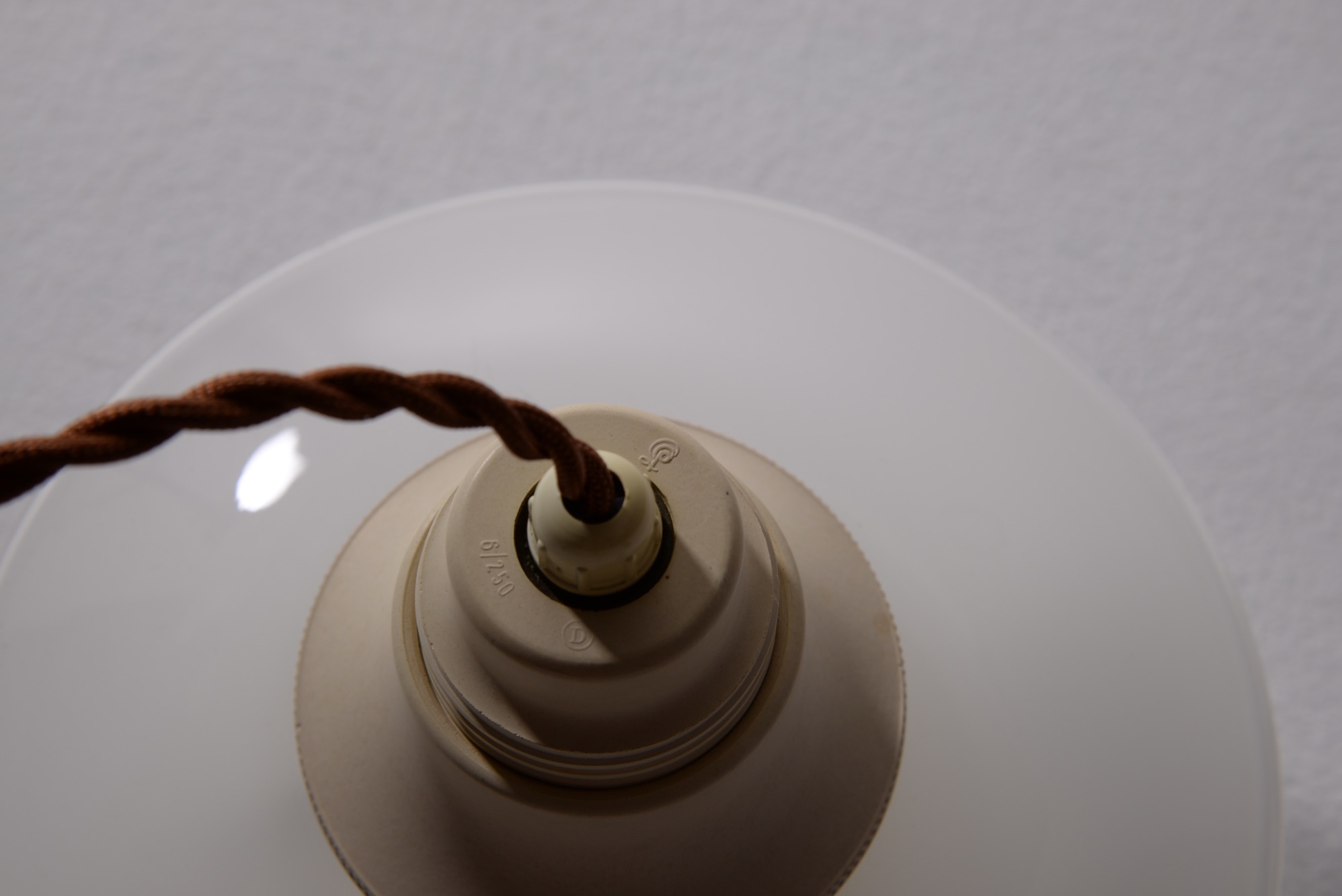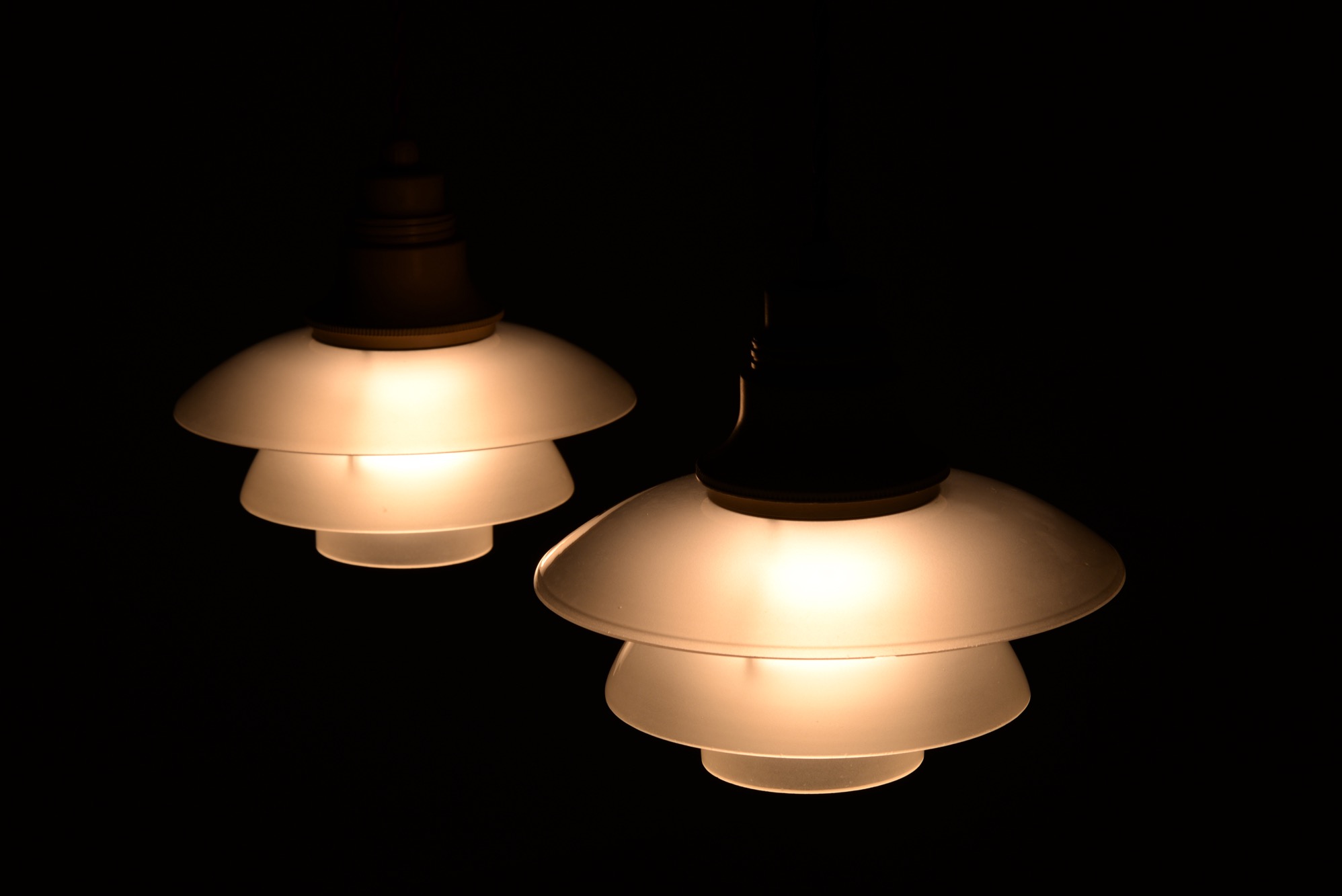 ポール・ヘニングセンによる、PH2/2ペンダントランプ一対、1940年代頃の製品です。腐食によるフロストガラスシェードには、吹きによる段文や、成形時に引っ張られた気泡などが見られ、ハンドメイドで作られていたことが伺えます。ホワイトベークライト製のソケットハウスの劣化は見られず、オリジナルのボトムボウルも備わり、コンディションは良好です。