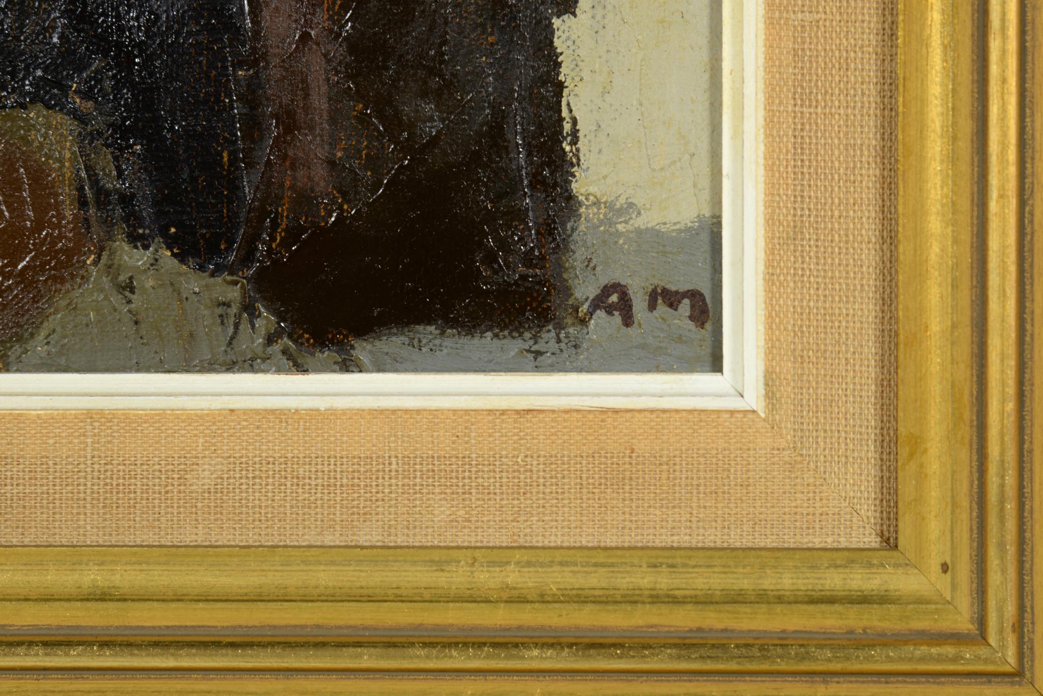 デンマーク、ボーンホルム島の画家、Axel Munch/アクセル・ムンクによる風景画油彩作品です。陽の光に照らされた納屋と、建物の陰で作業する農夫が描かれています。フレームはオリジナルのものをそのまま整えました。