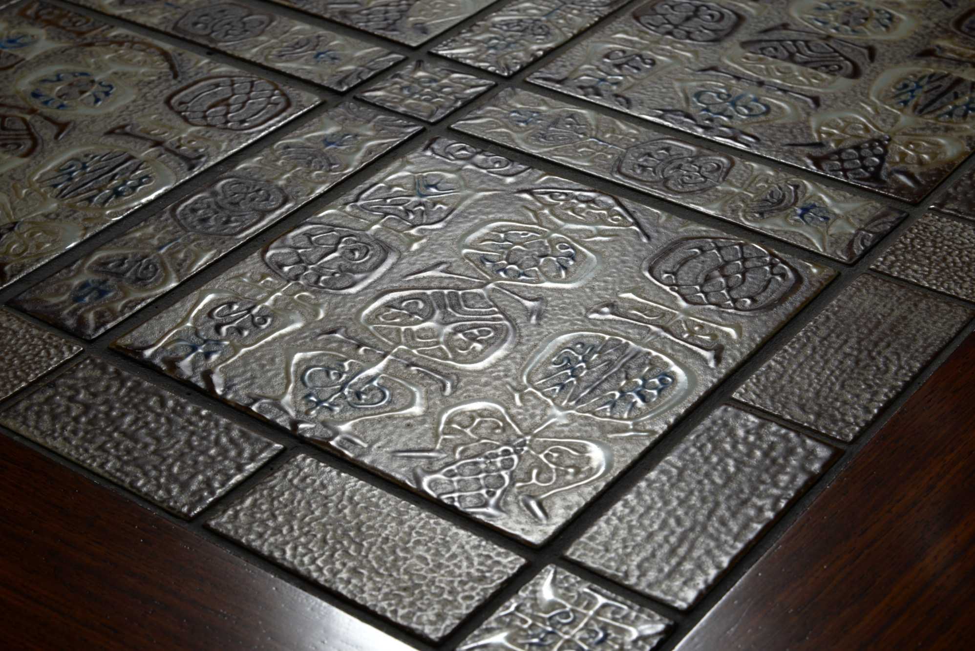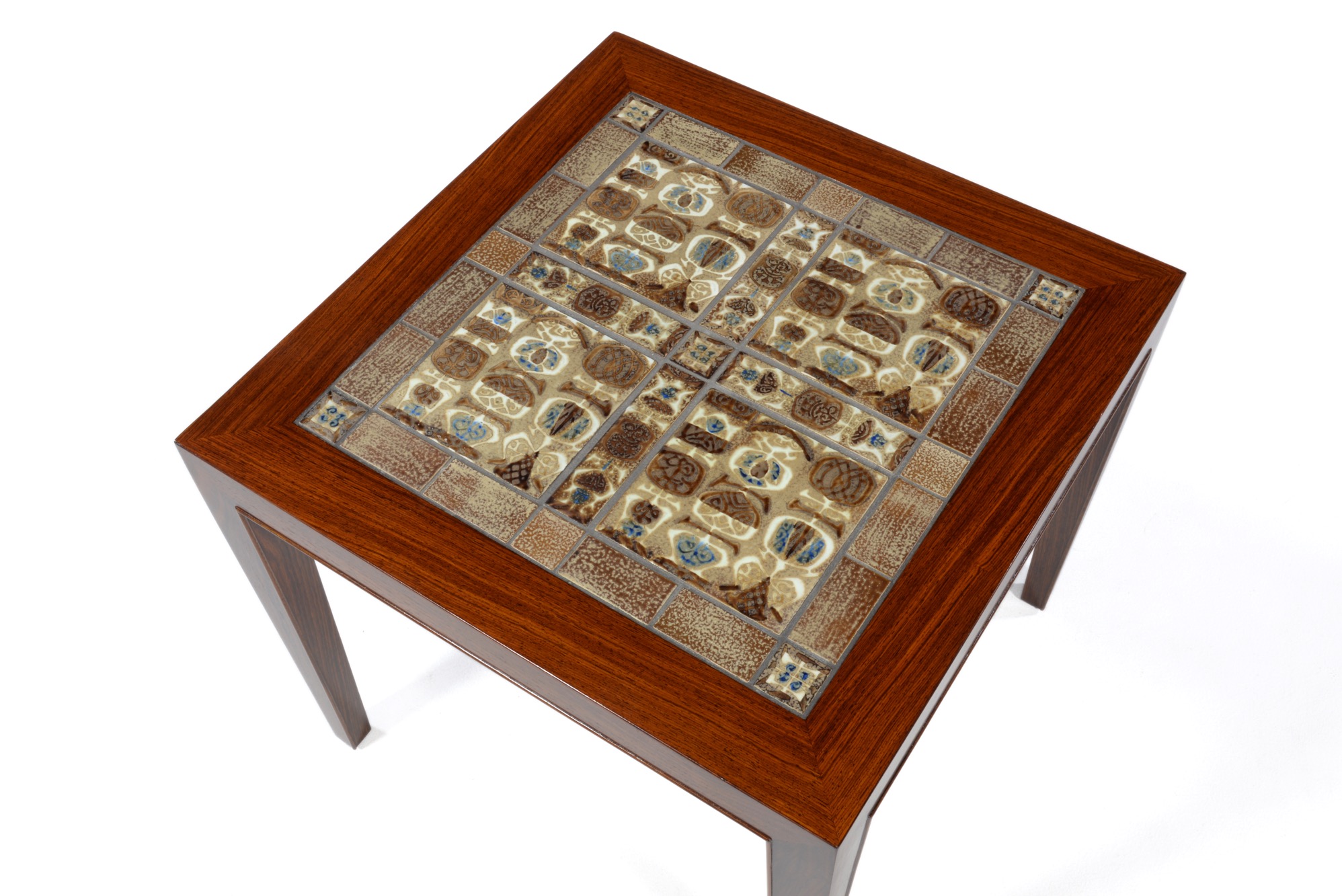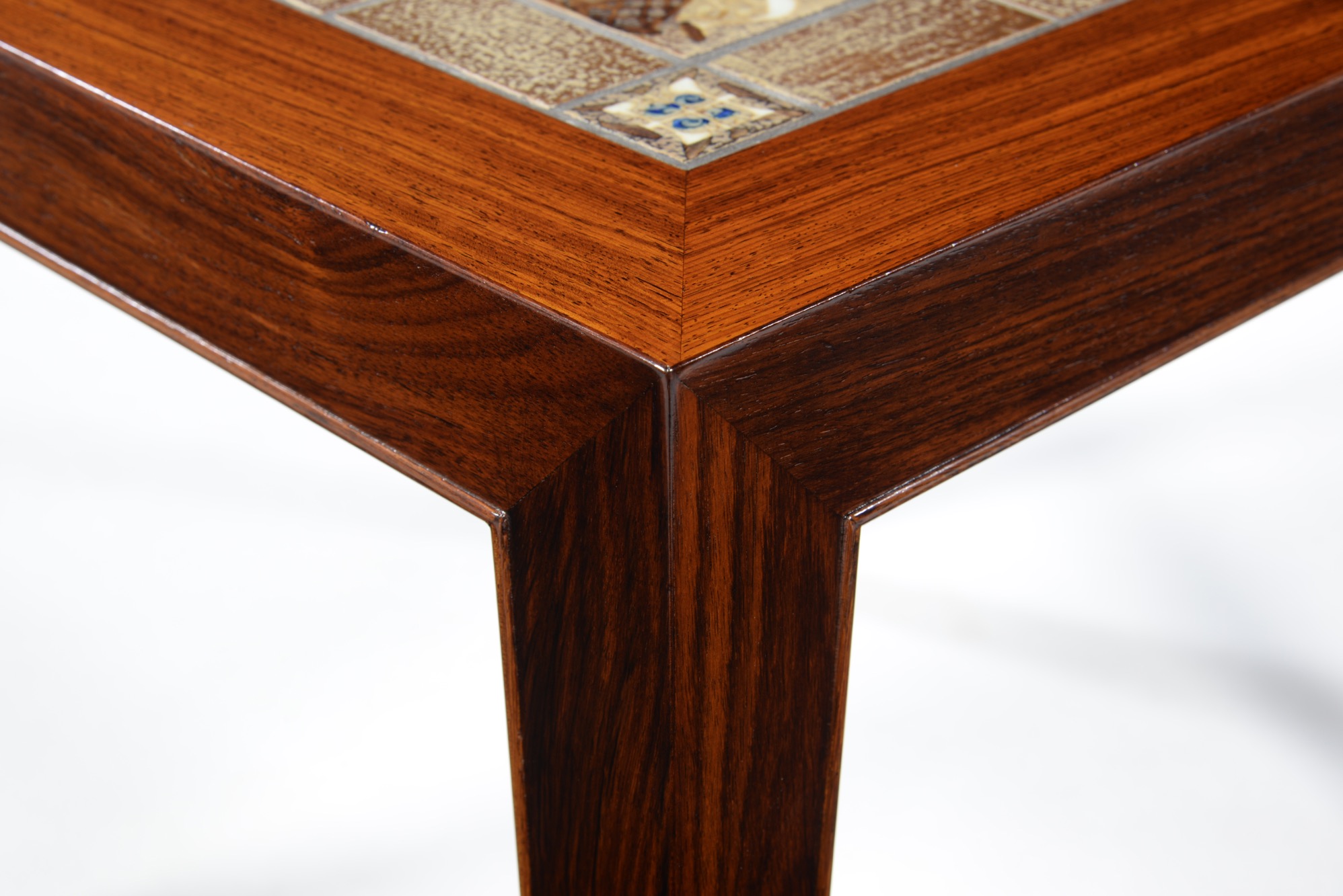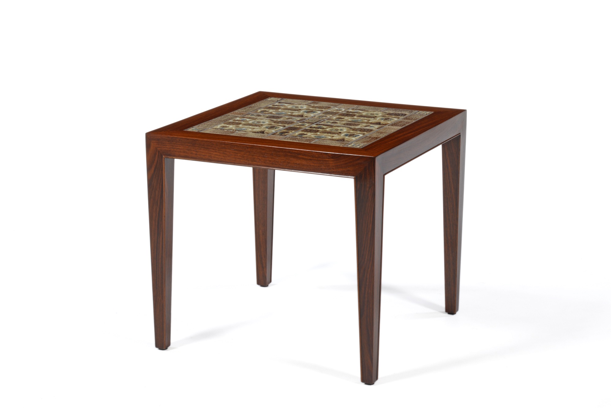 ロイヤルコペンハーゲン窯で焼成されたタイル”BACA”が天板に張られたスクエアテーブルです。1960年代に作られたもので、本体にはローズウッドが用いられており、脚の内側から天板の下部へかけて突帯が付いたクラシックなタイプです。タイルの発色も良く綺麗な状態です。