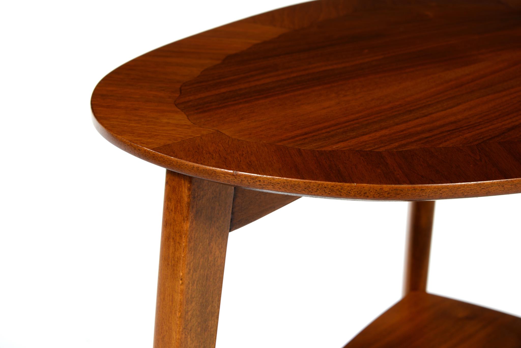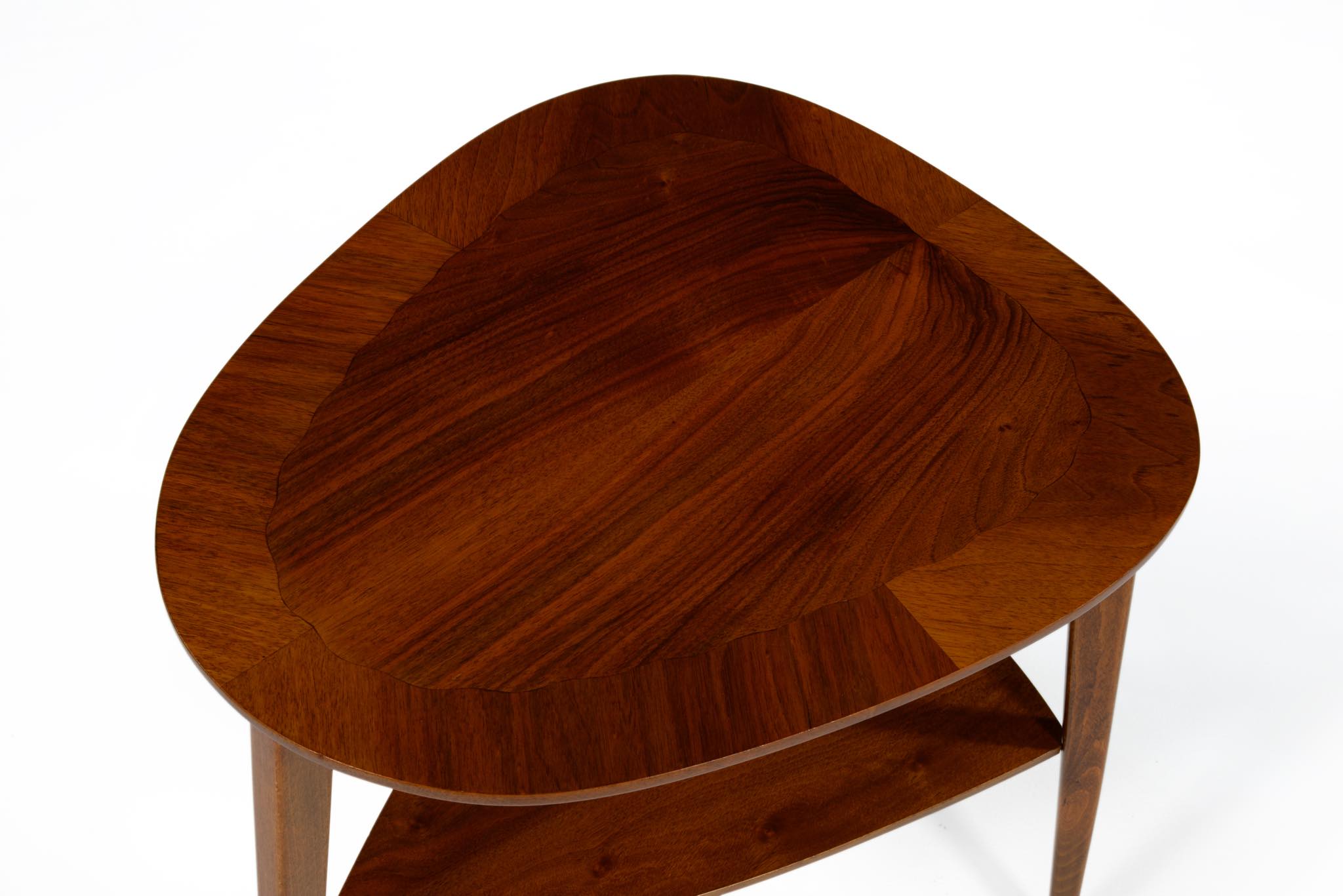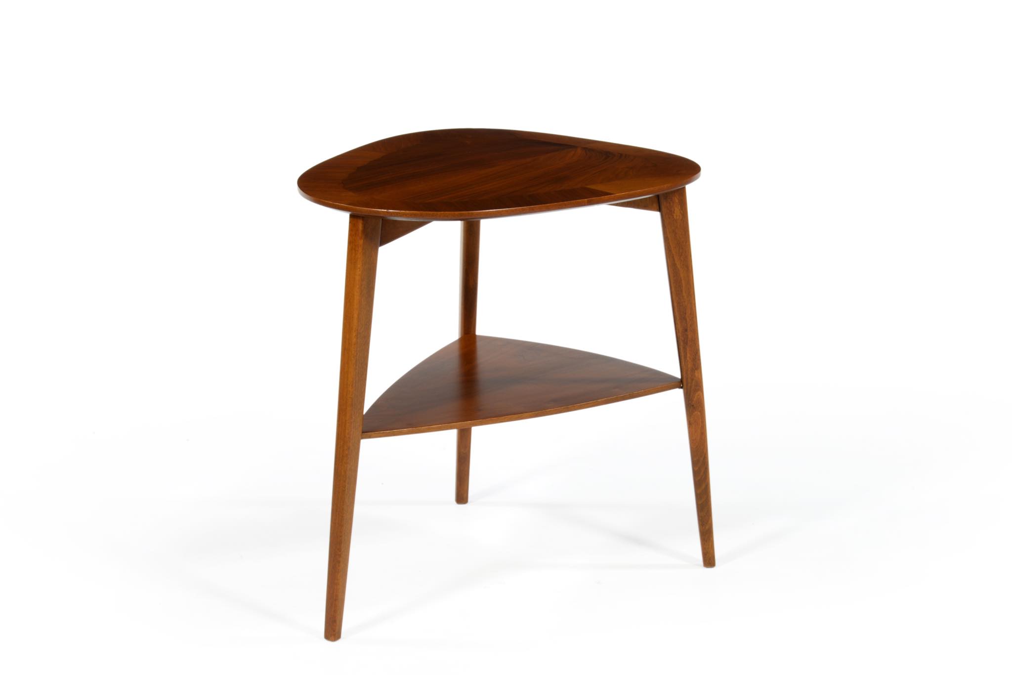 1950年代当時デンマークでヒットしたサイドテーブル、珍しいコーカサスウォルナット材です。丸みを帯びた三角形はイージーチェアの側に置けばピタリとハマり便利です。