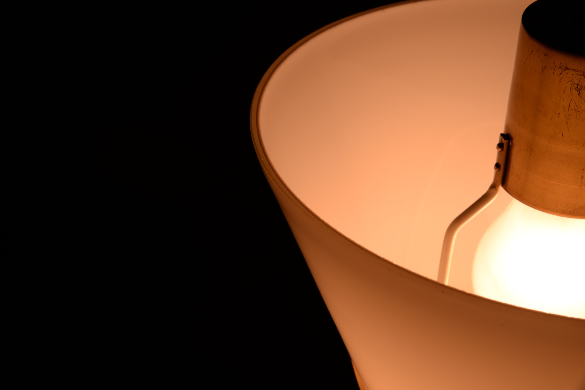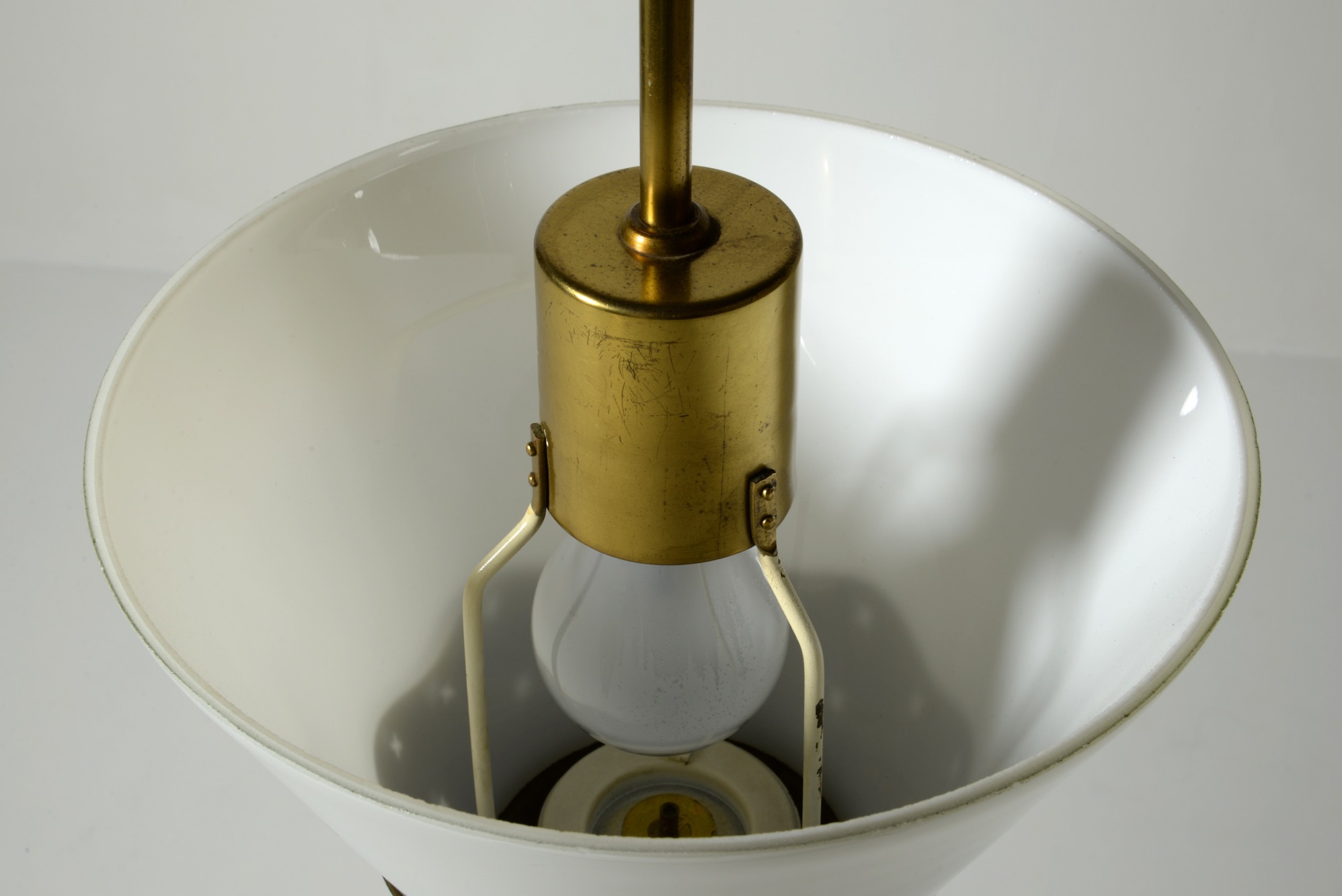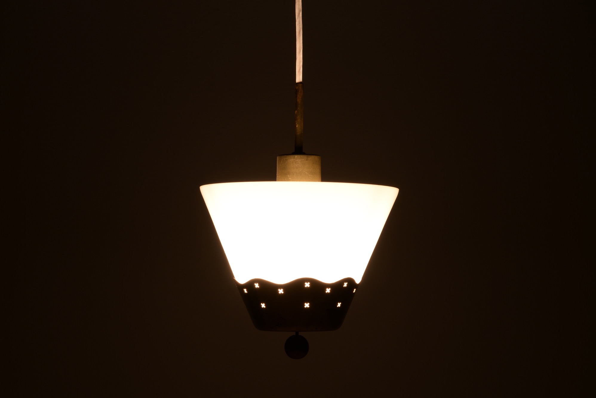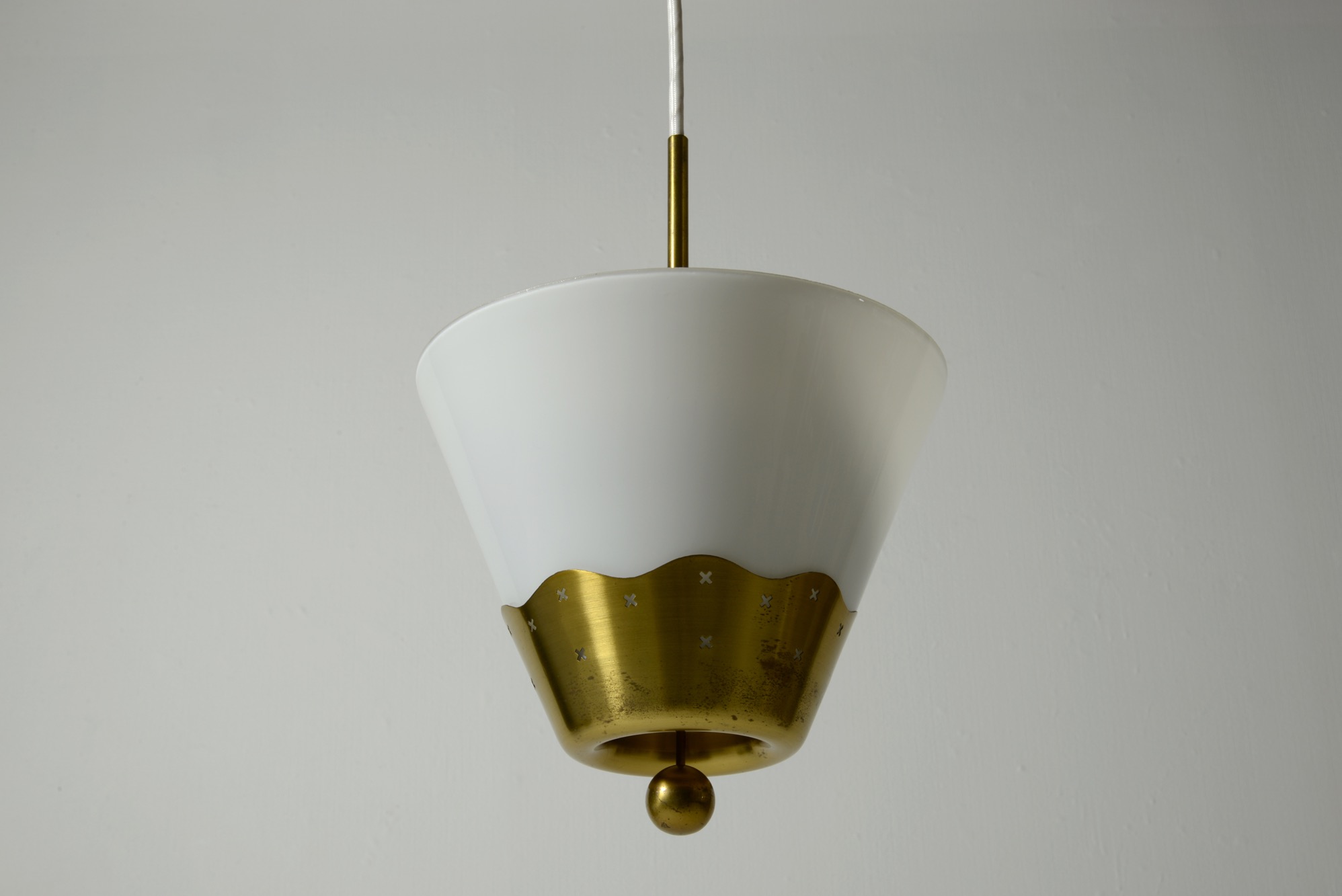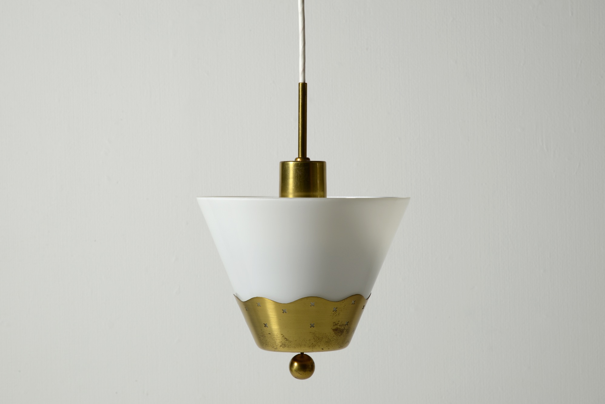 オパールの被せガラスと真鍮のコンビネーションの美しい小さなペンダントランプです。本来は玄関や通路用でしょうか。リビングの隅まで配線を伸ばし、お部屋のアクセントとしても良いでしょう。