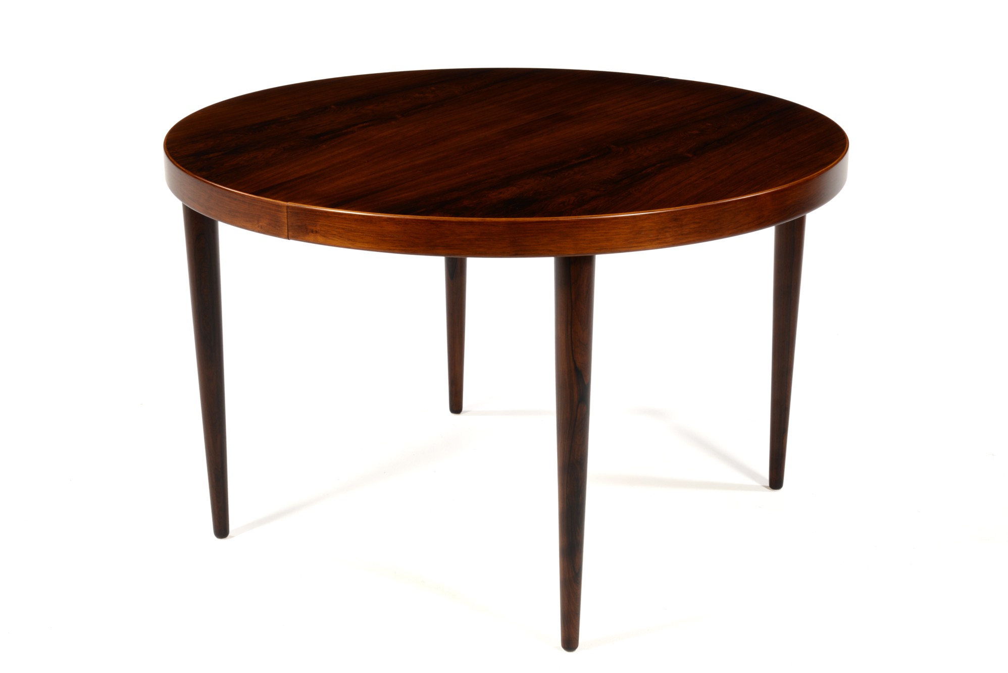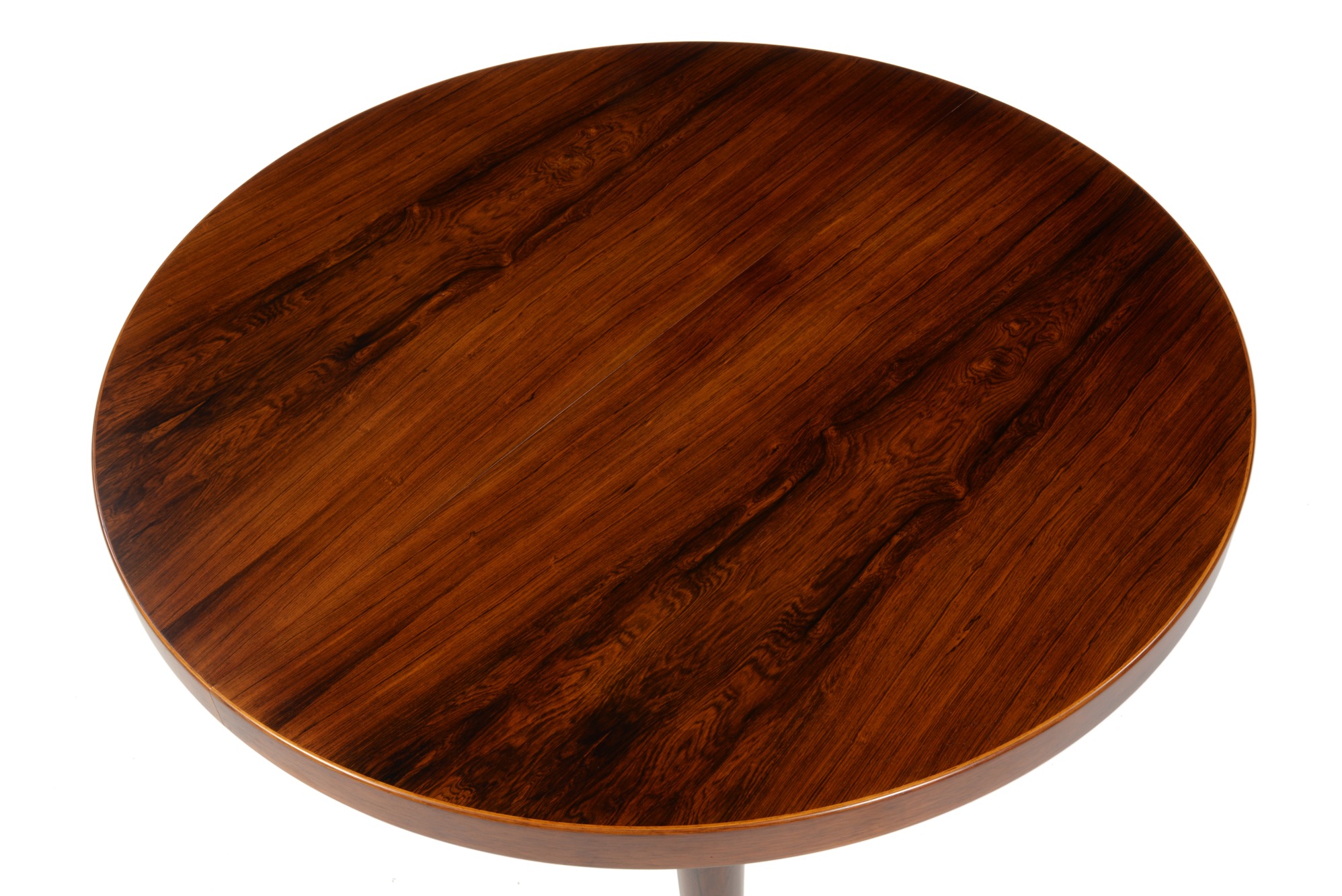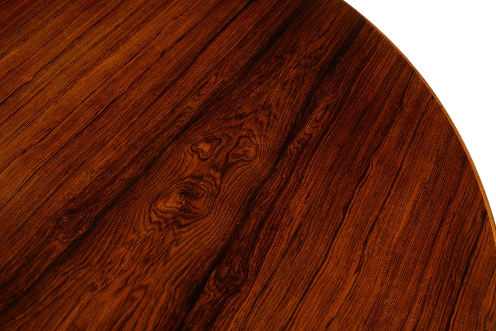 デンマークの家具デザイナー、カイ・クリスチャンセンによるブラジリアンローズウッドのダイニングテーブル、1960年代頃の製作品です。直径115cmは、当時のデンマーク家具としてはひとまわり小ぶりです。エクステンションリーフが1枚付属し天板の面積が拡張できます。(各サイズは下記をご参照ください)
