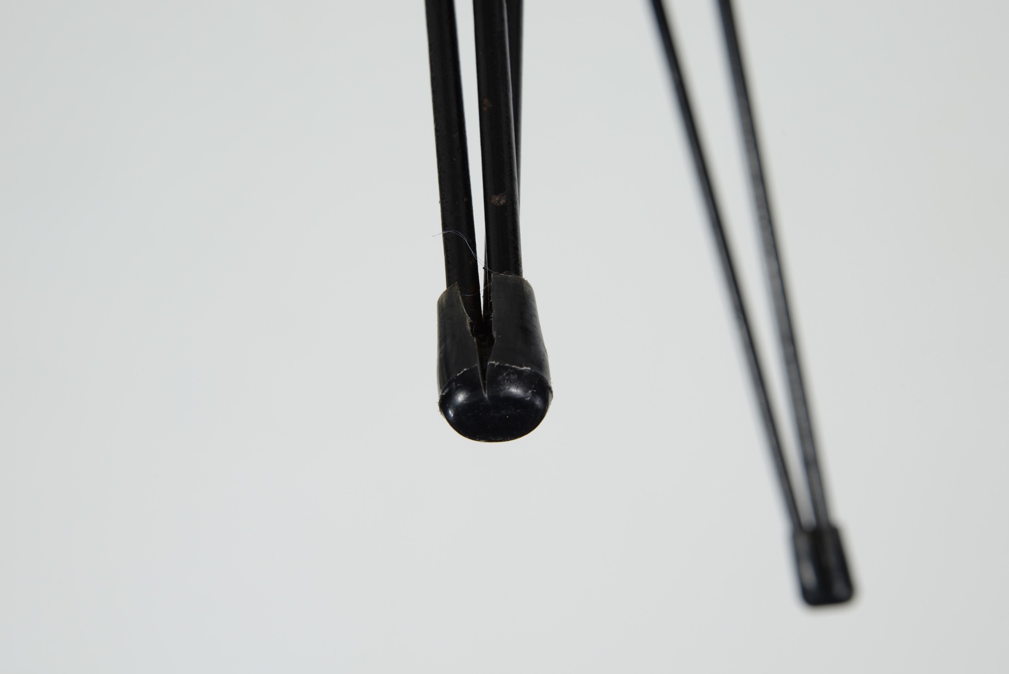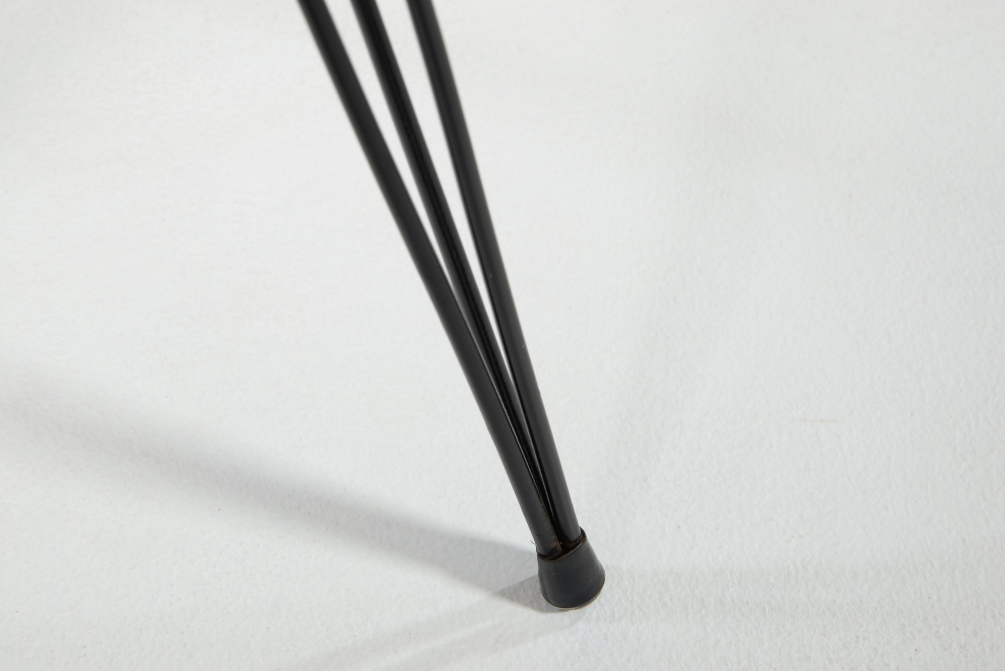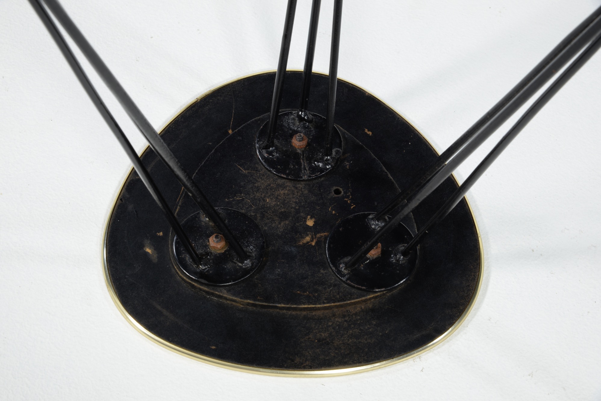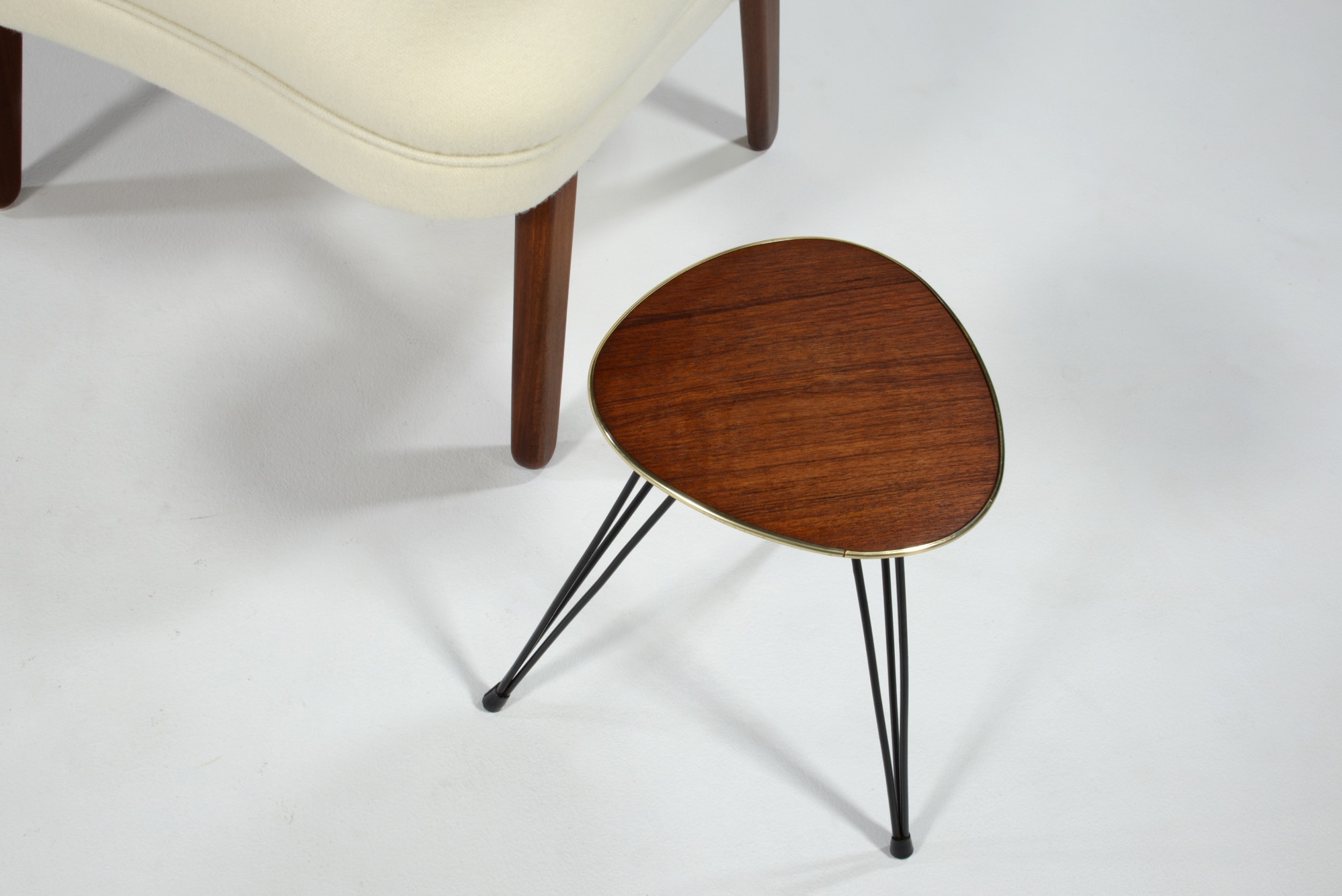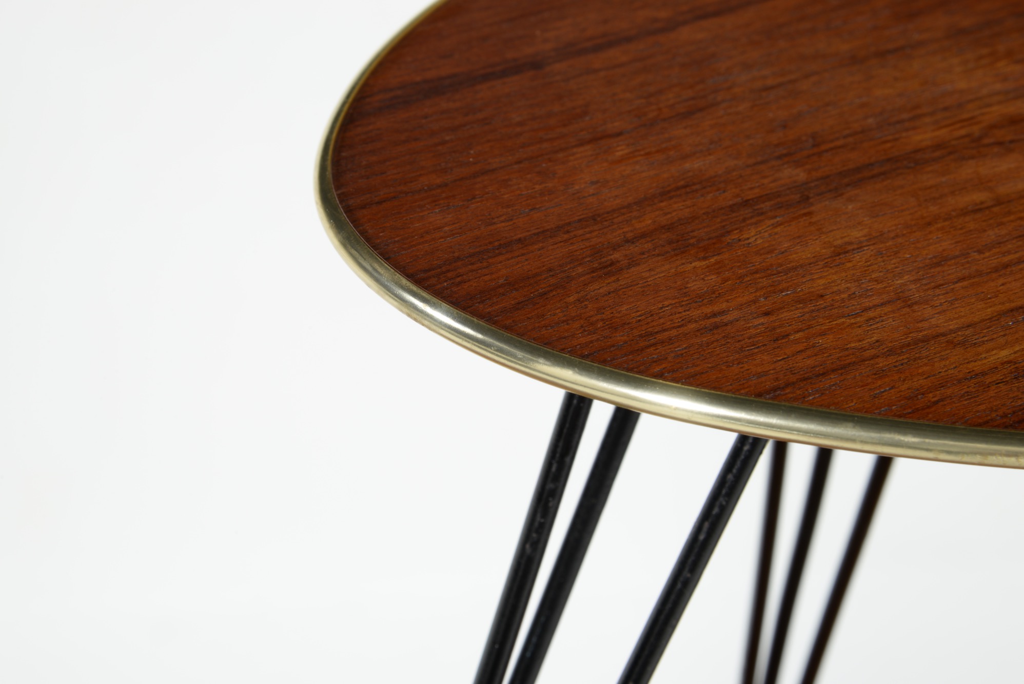 1950年代のアイアンワークの脚を備えた小さなテーブルです。天板はチーク材の突き板が張られています。観葉植物の台などにお使いいただけそうです。
