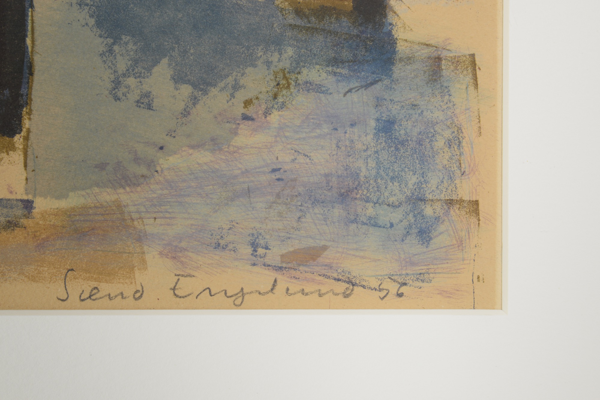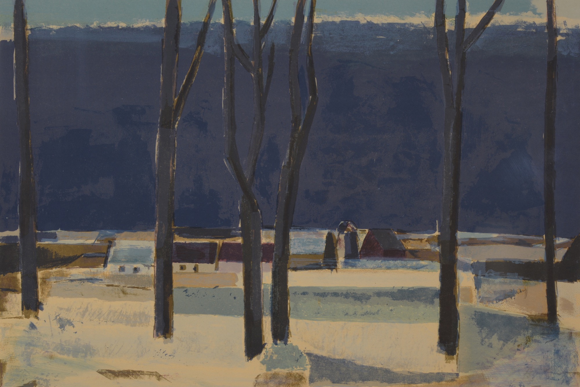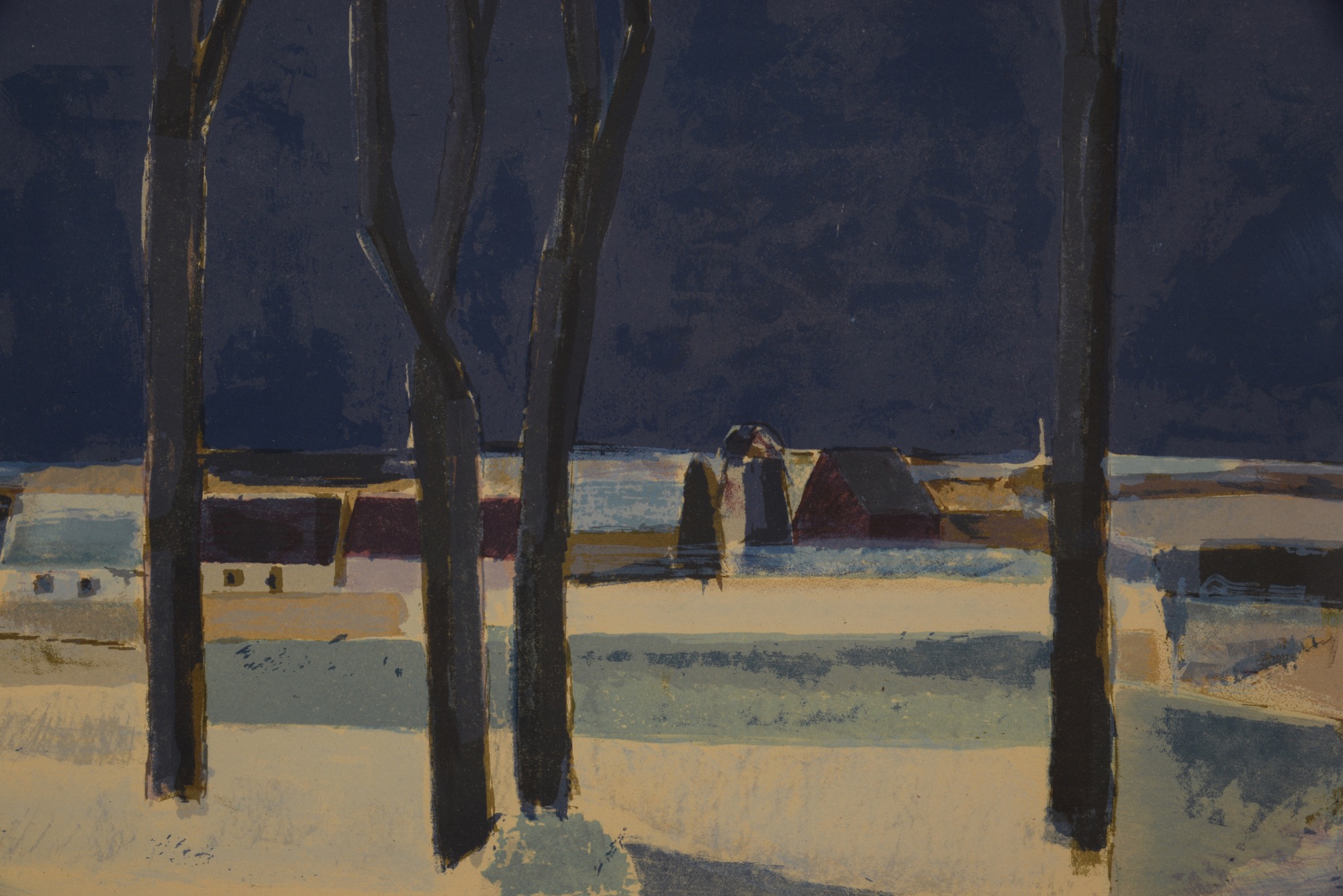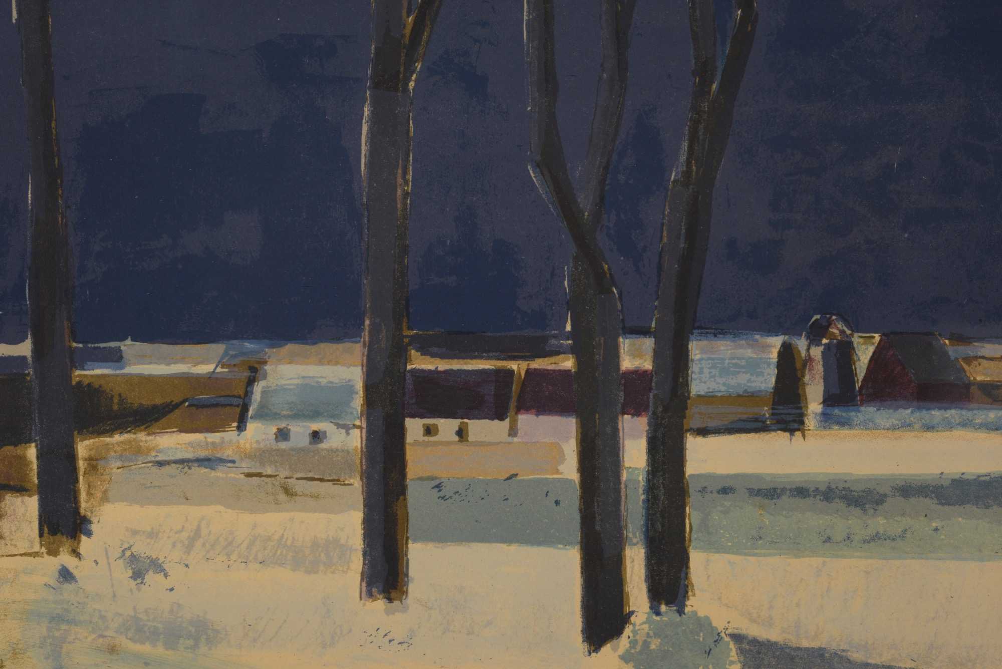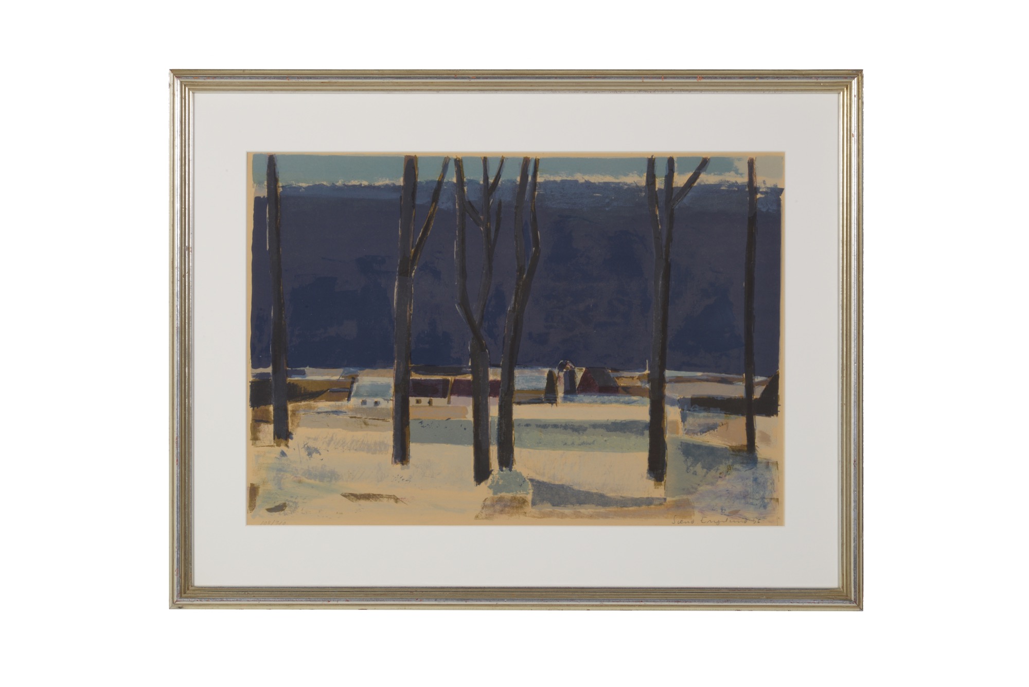 デンマークの画家、Svend Engelund/スヴェン・インゲルンドによる風景画、1956年に制作されたリトグラフ作品です。寒い季節の風景を描いたものでしょう。凛と張りつめた空気感の中、大地を照らす陽の光が暖かく感じられます。オリジナルと思われる銀箔のフレームはそのままに、マットを新たに差し替えました。タイトルは便宜上こちらでつけさせていただきました。