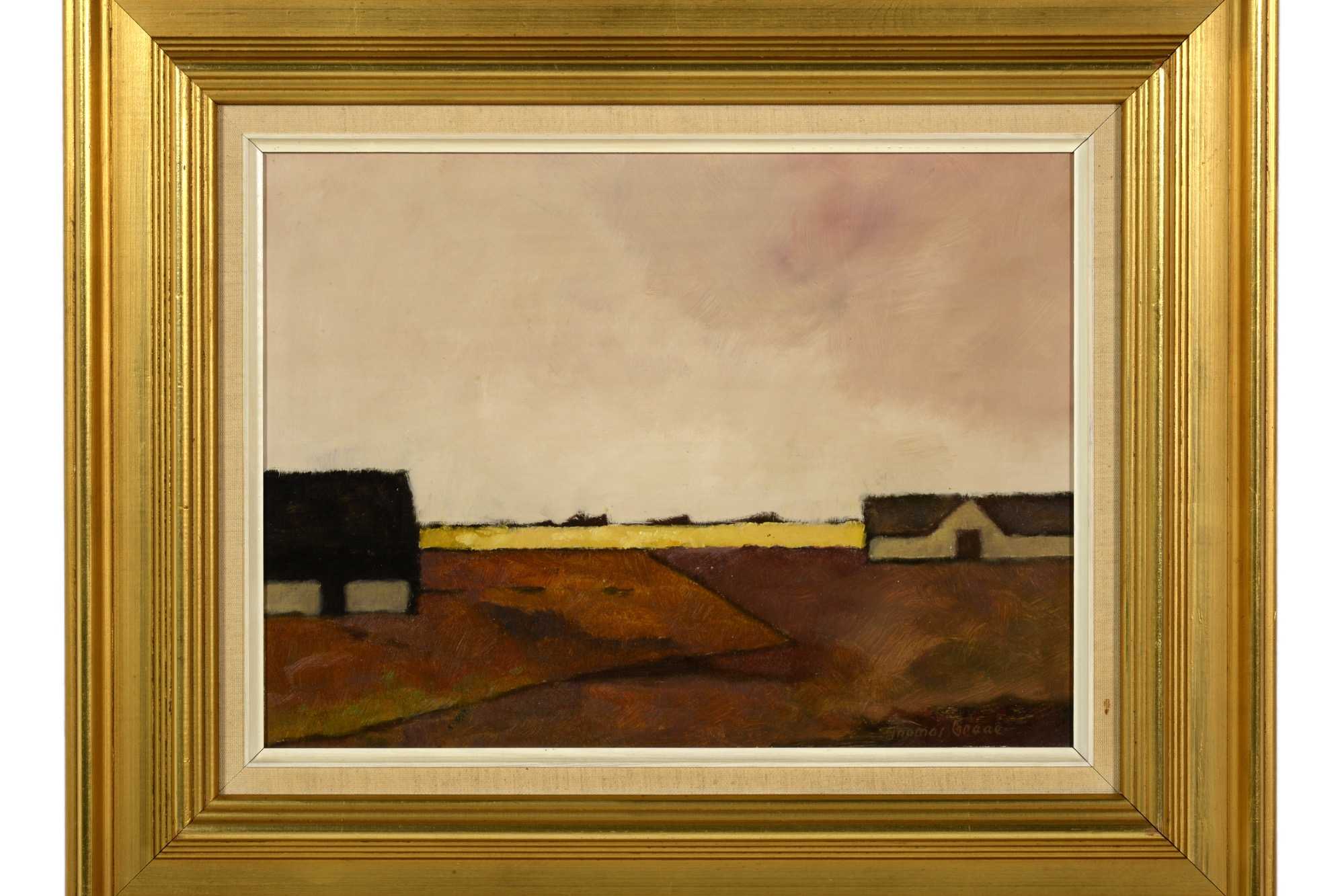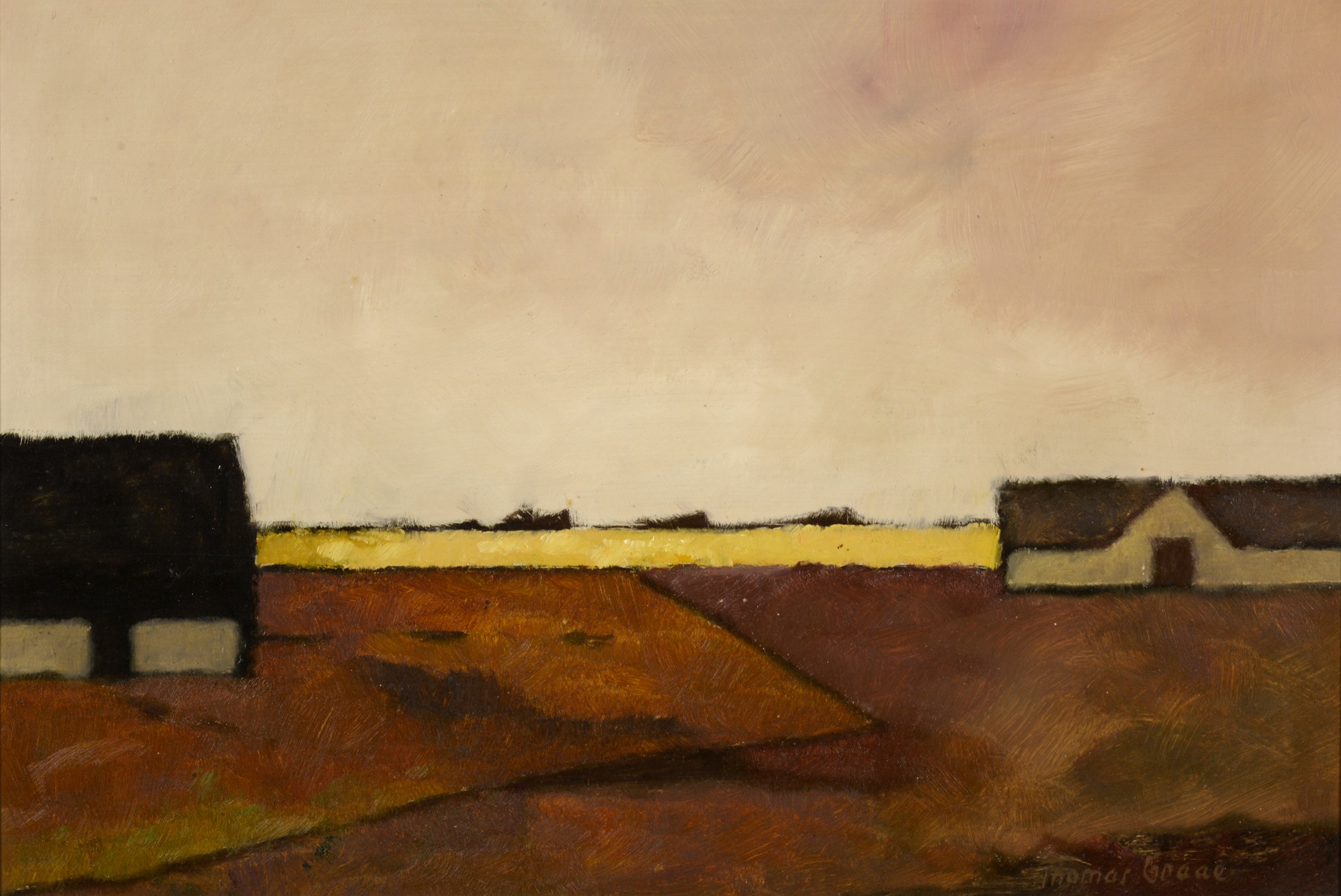 デンマークの画家、Thomas Graae/トーマス・グラーエによる油彩板絵風景画作品です。黄金色に染まる広大な麦畑が描かれています。フレームはオリジナルで、入れ子の布張り部分に汚れがありますが、コンディションは良好です。