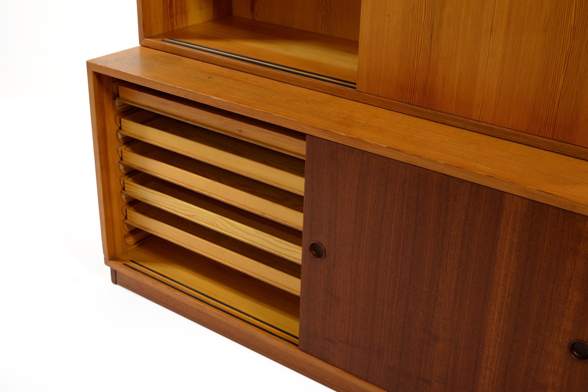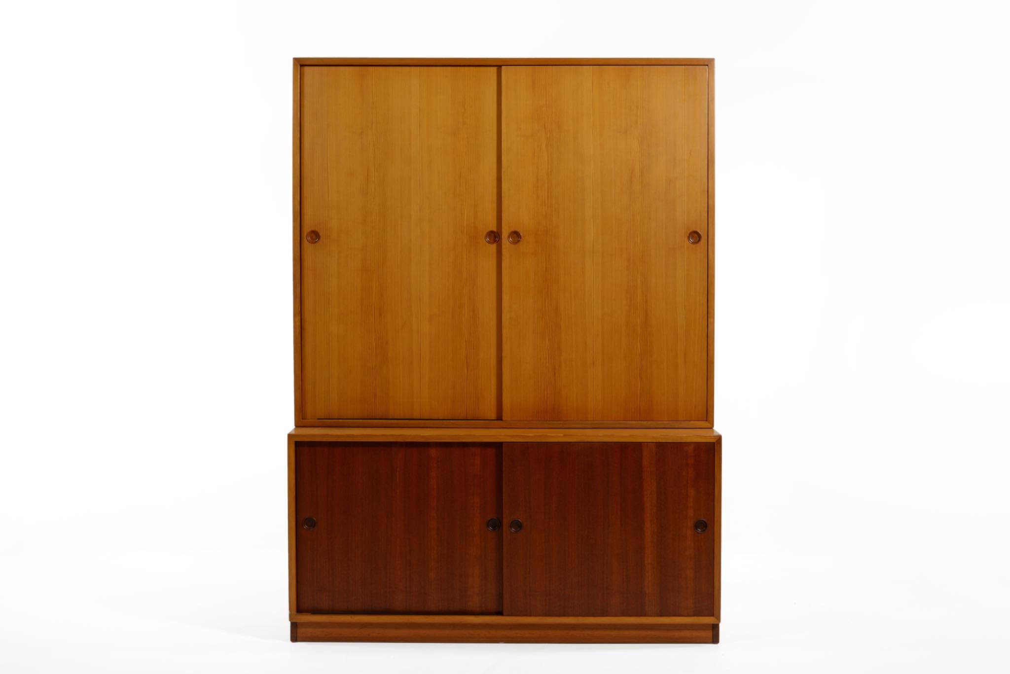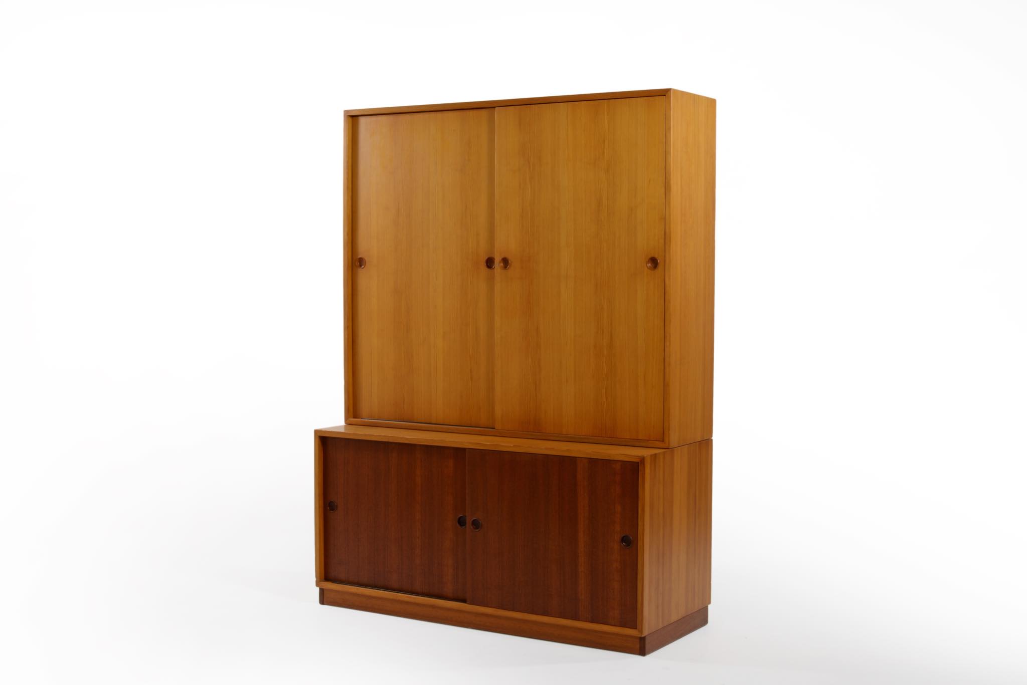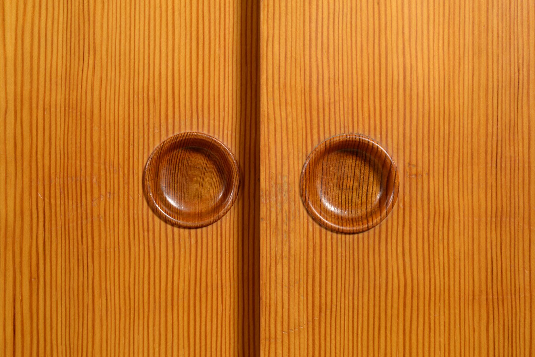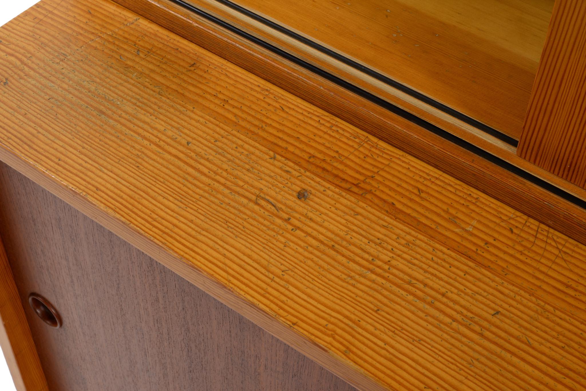 ボーエ・モーエンセンによるカップボードキャビネットで、カール・マルムステンのテーブルなどを手がけたスウェーデンの工房、Svensk Furniture/スヴェンスク・ファニチャー社によって1960年代頃に造られたものでしょう。本体は細かい木目のオレゴンパイン材、下部キャビネットの扉はチーク材が用いられたコンビネーションカラーとなります。引手や下部天板にこれまでの経年による小傷が見られますが、飴色になった本体を含め、ヴィンテージとしての質感がよく表れています。