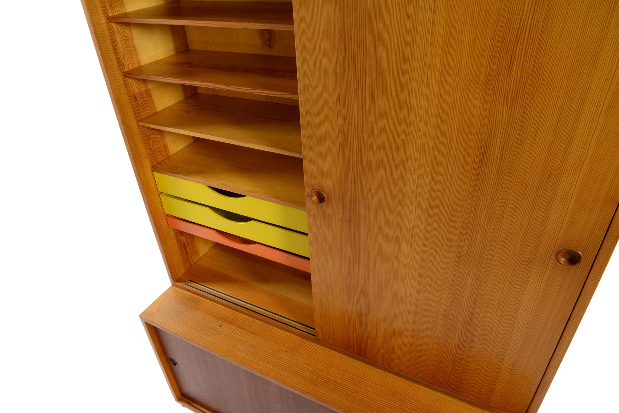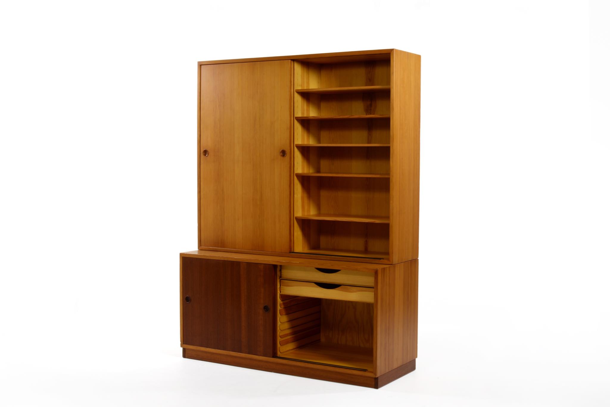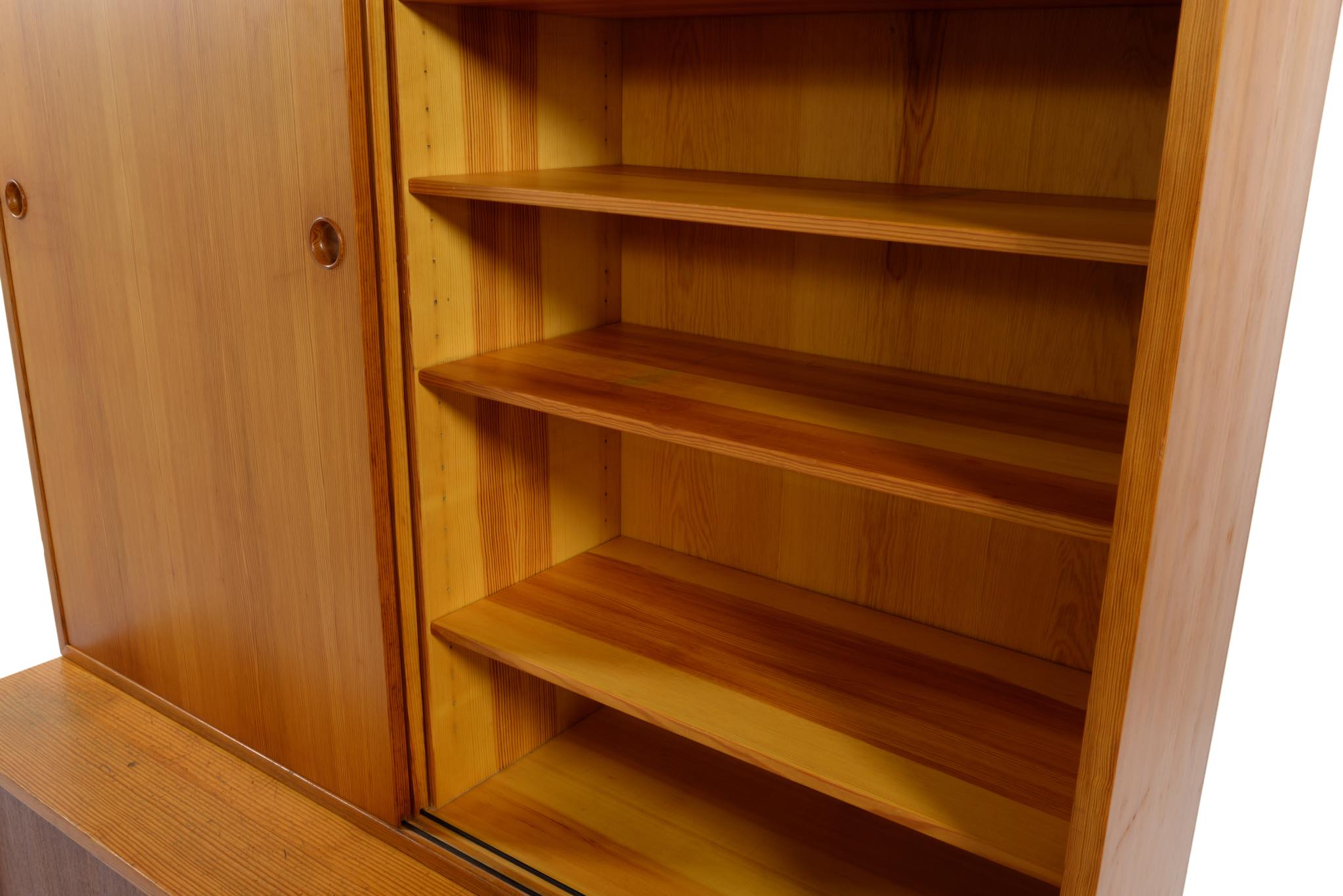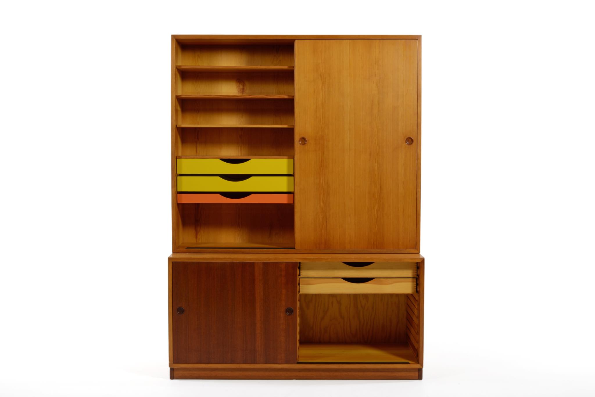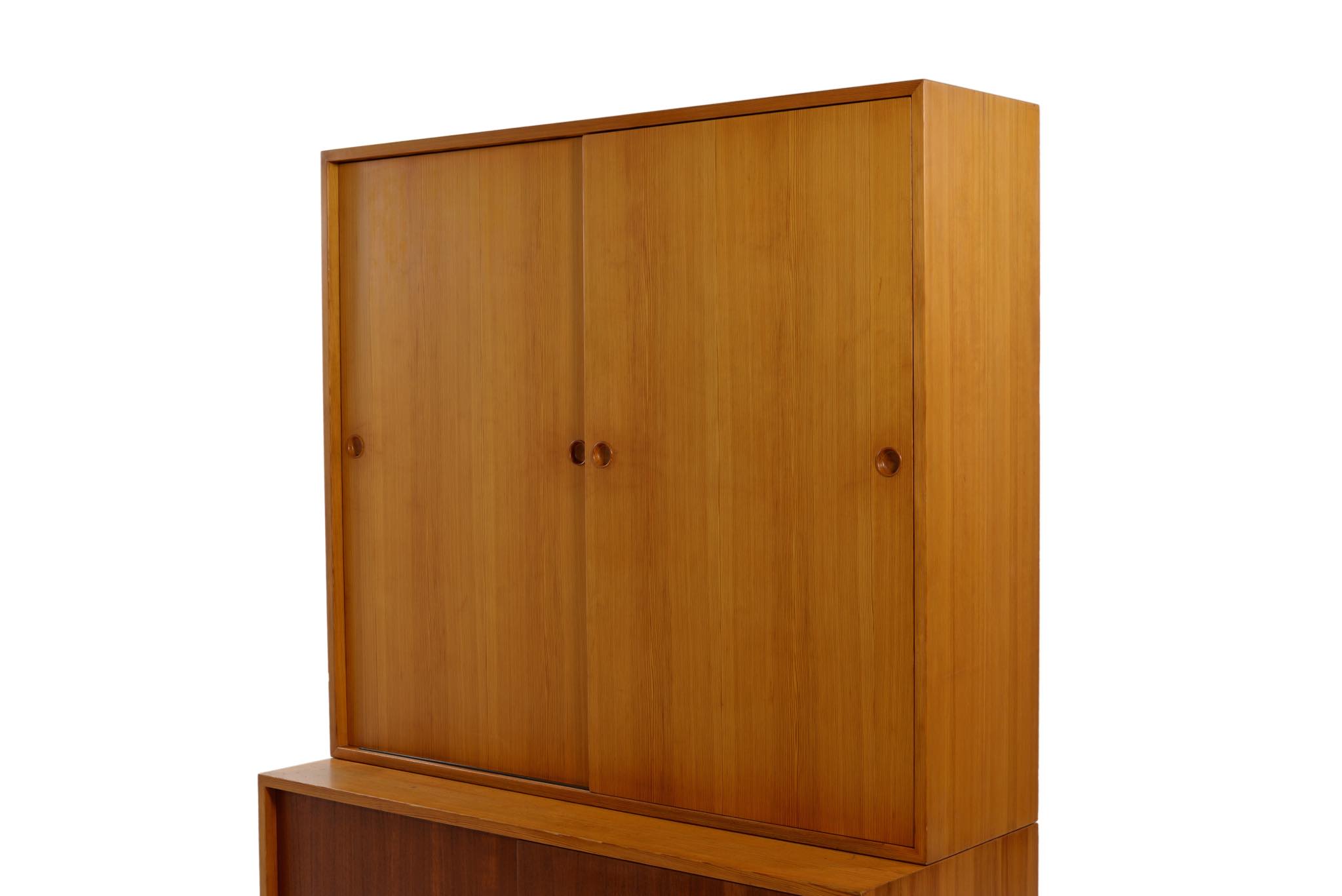 ボーエ・モーエンセンによるカップボードキャビネットで、カール・マルムステンのテーブルなどを手がけたスウェーデンの工房、Svensk Furniture/スヴェンスク・ファニチャー社によって1960年代頃に造られたものでしょう。本体は細かい木目のオレゴンパイン材、下部キャビネットの扉はチーク材が用いられたコンビネーションカラーとなります。引手や下部天板にこれまでの経年による小傷が見られますが、飴色になった本体を含め、ヴィンテージとしての質感がよく表れています。
