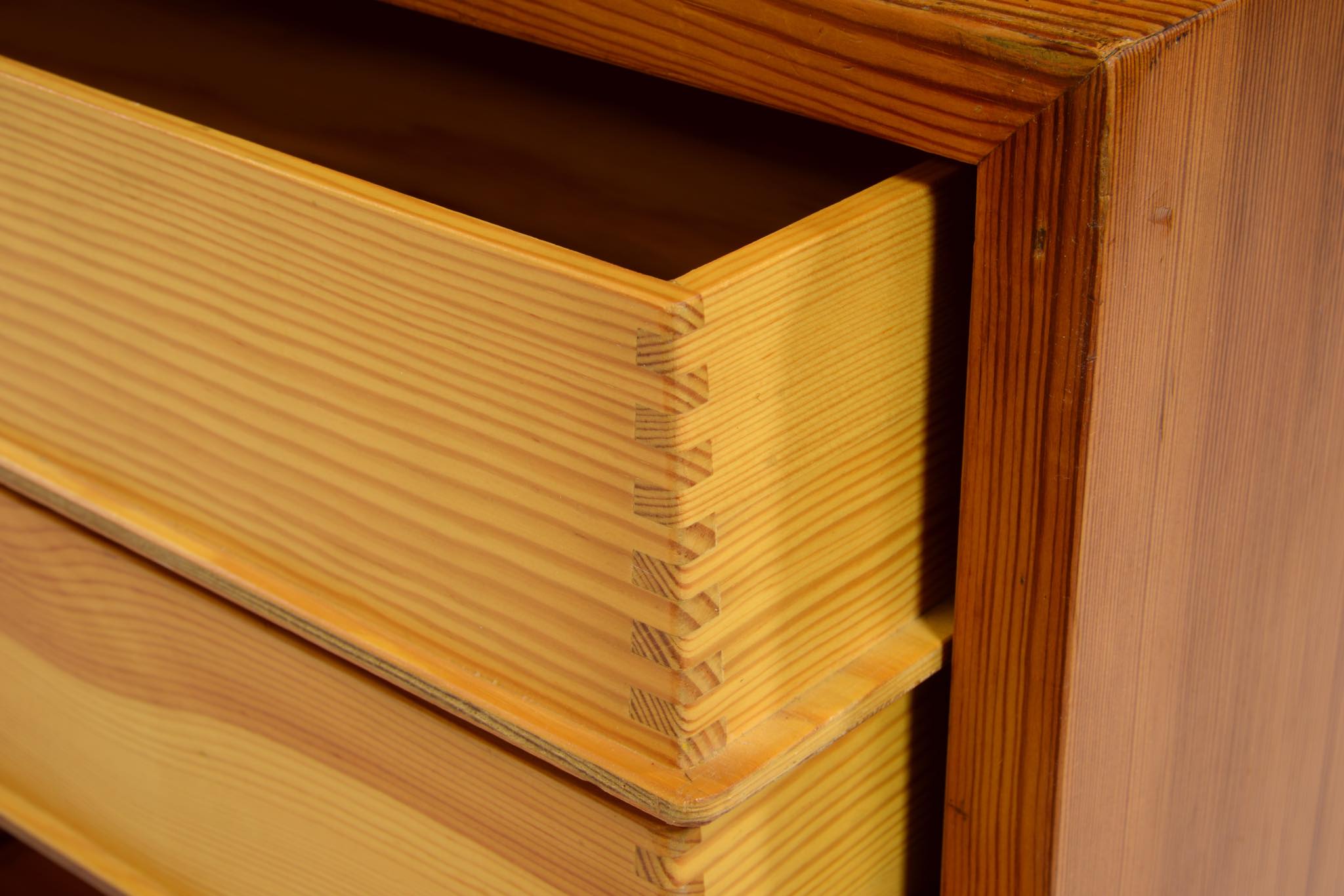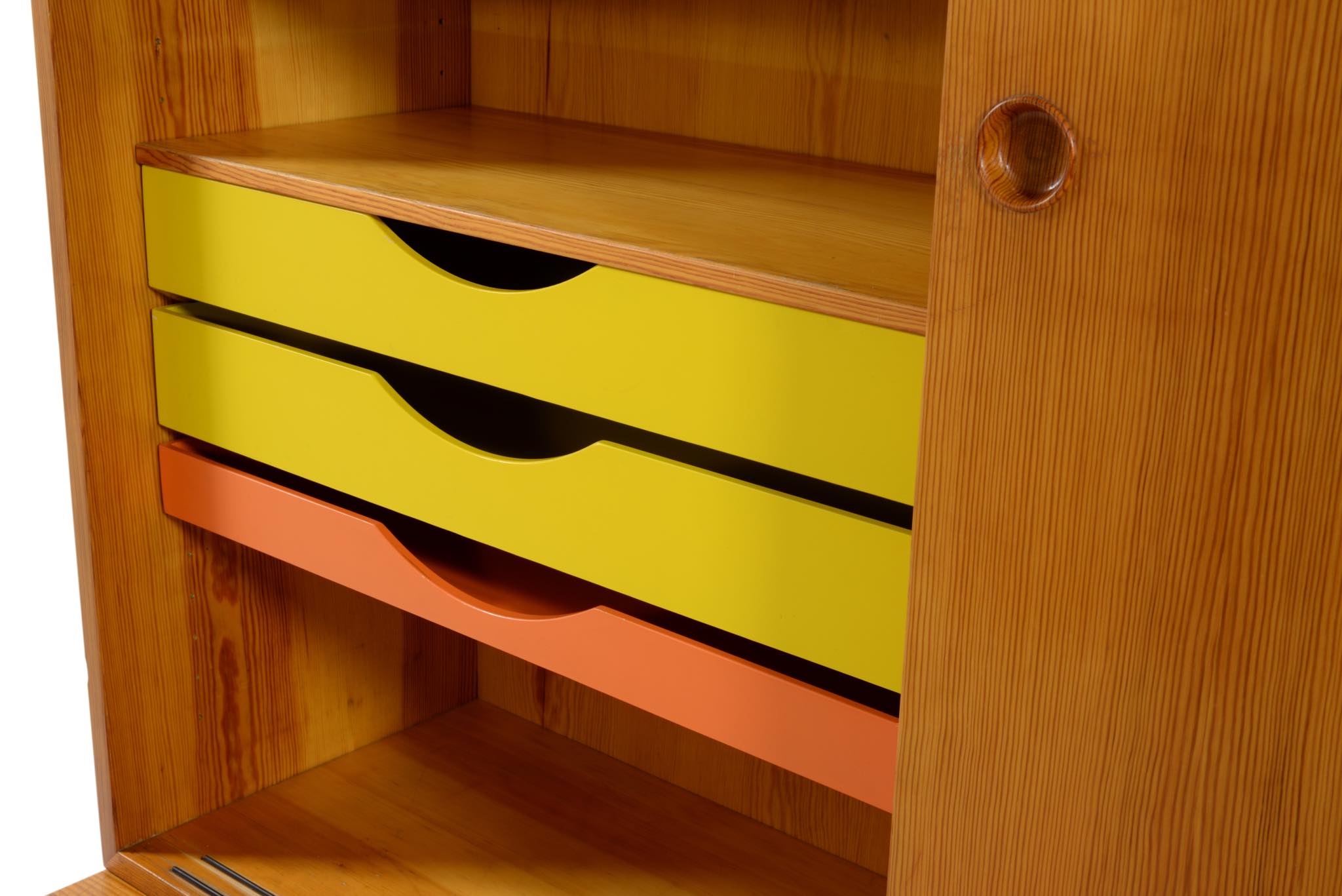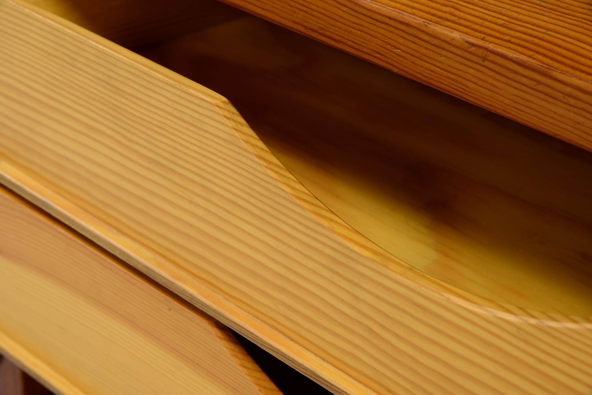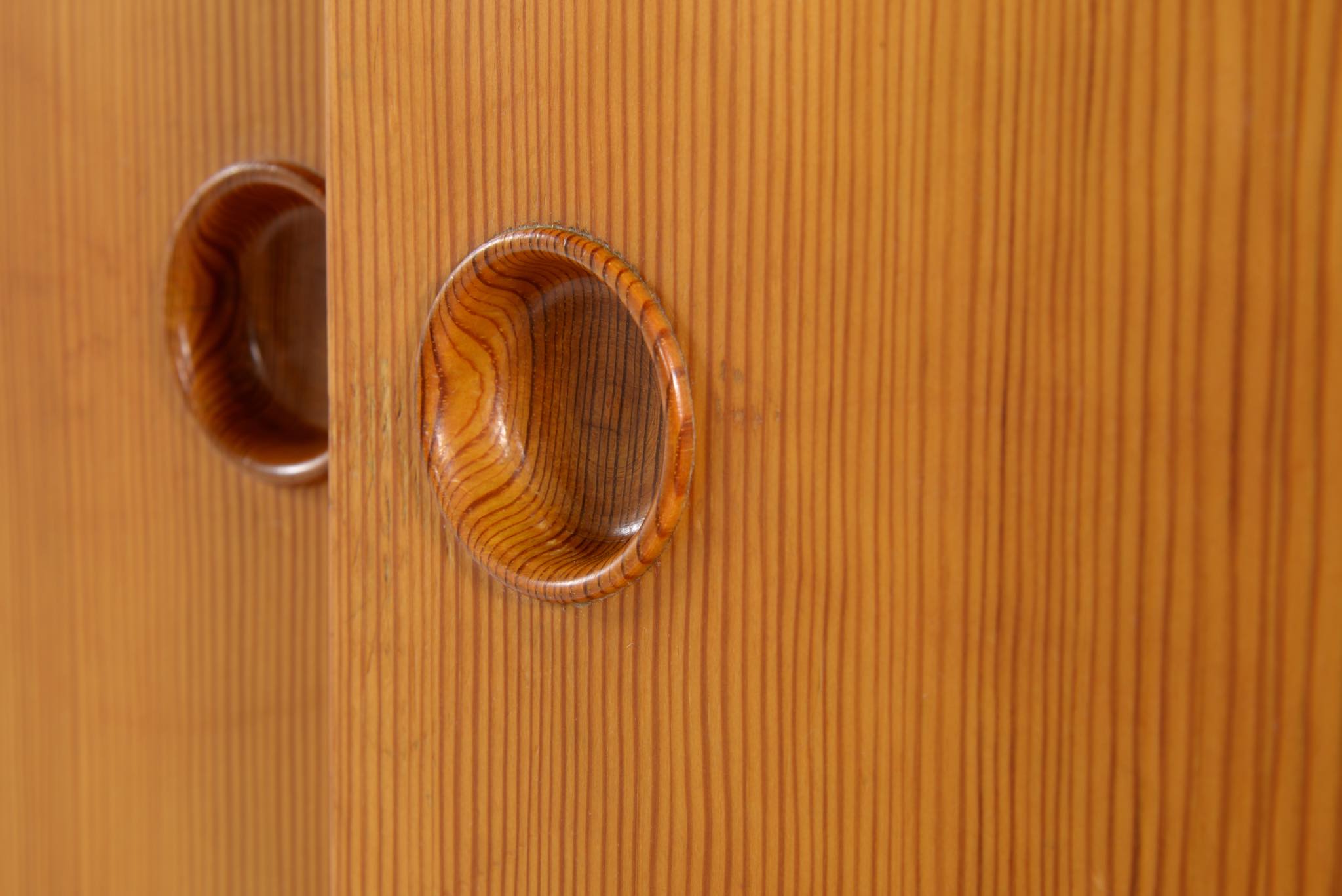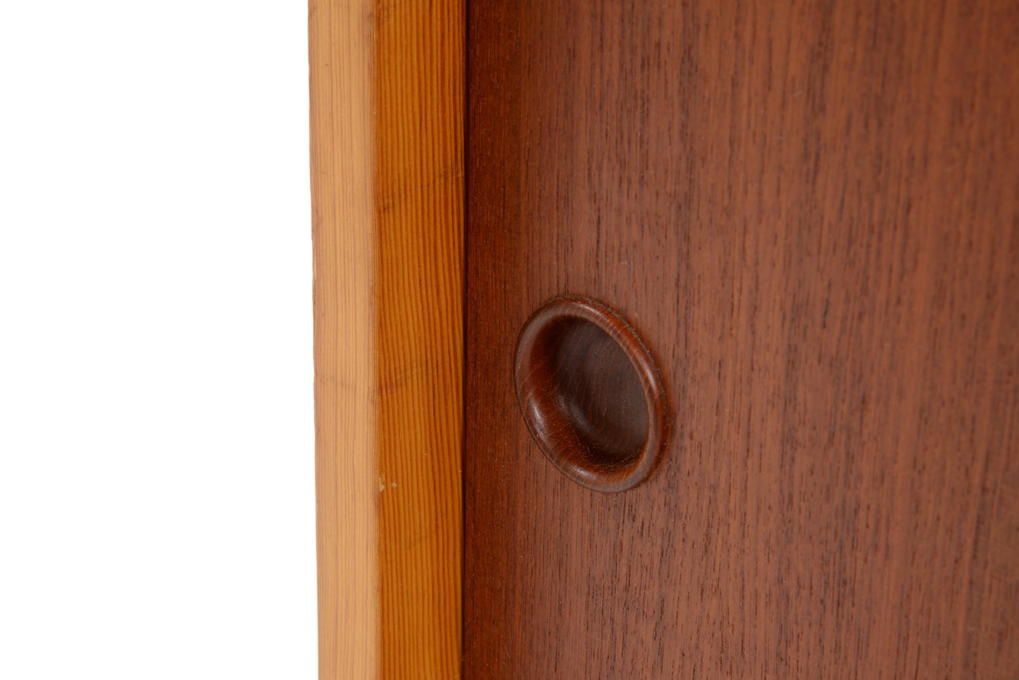 ボーエ・モーエンセンによるカップボードキャビネットで、カール・マルムステンのテーブルなどを手がけたスウェーデンの工房、Svensk Furniture/スヴェンスク・ファニチャー社によって1960年代頃に造られたものでしょう。本体は細かい木目のオレゴンパイン材、下部キャビネットの扉はチーク材が用いられたコンビネーションカラーとなります。引手や下部天板にこれまでの経年による小傷が見られますが、飴色になった本体を含め、ヴィンテージとしての質感がよく表れています。
