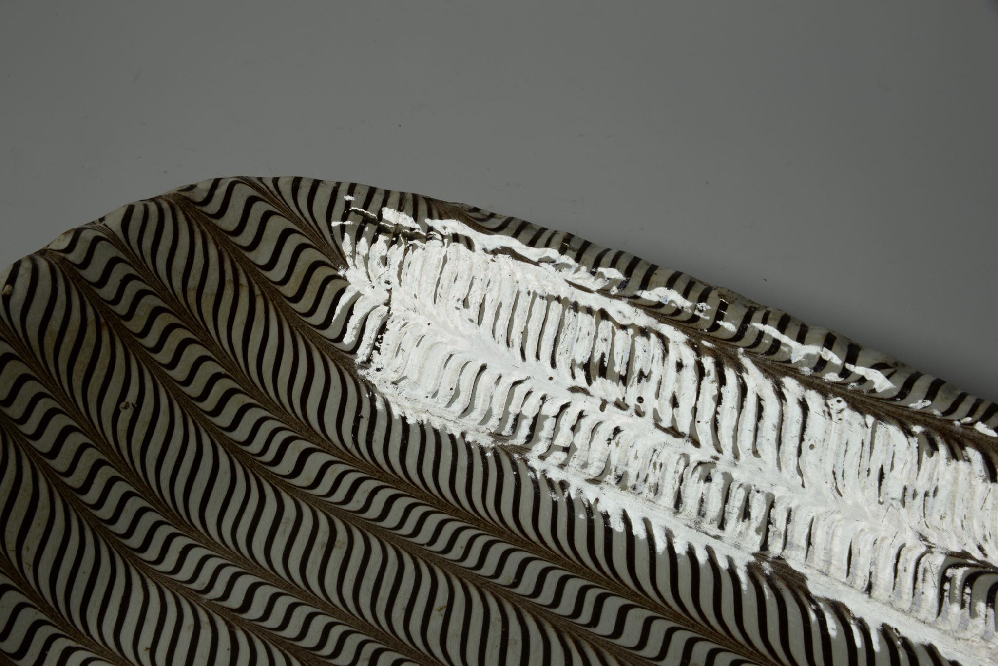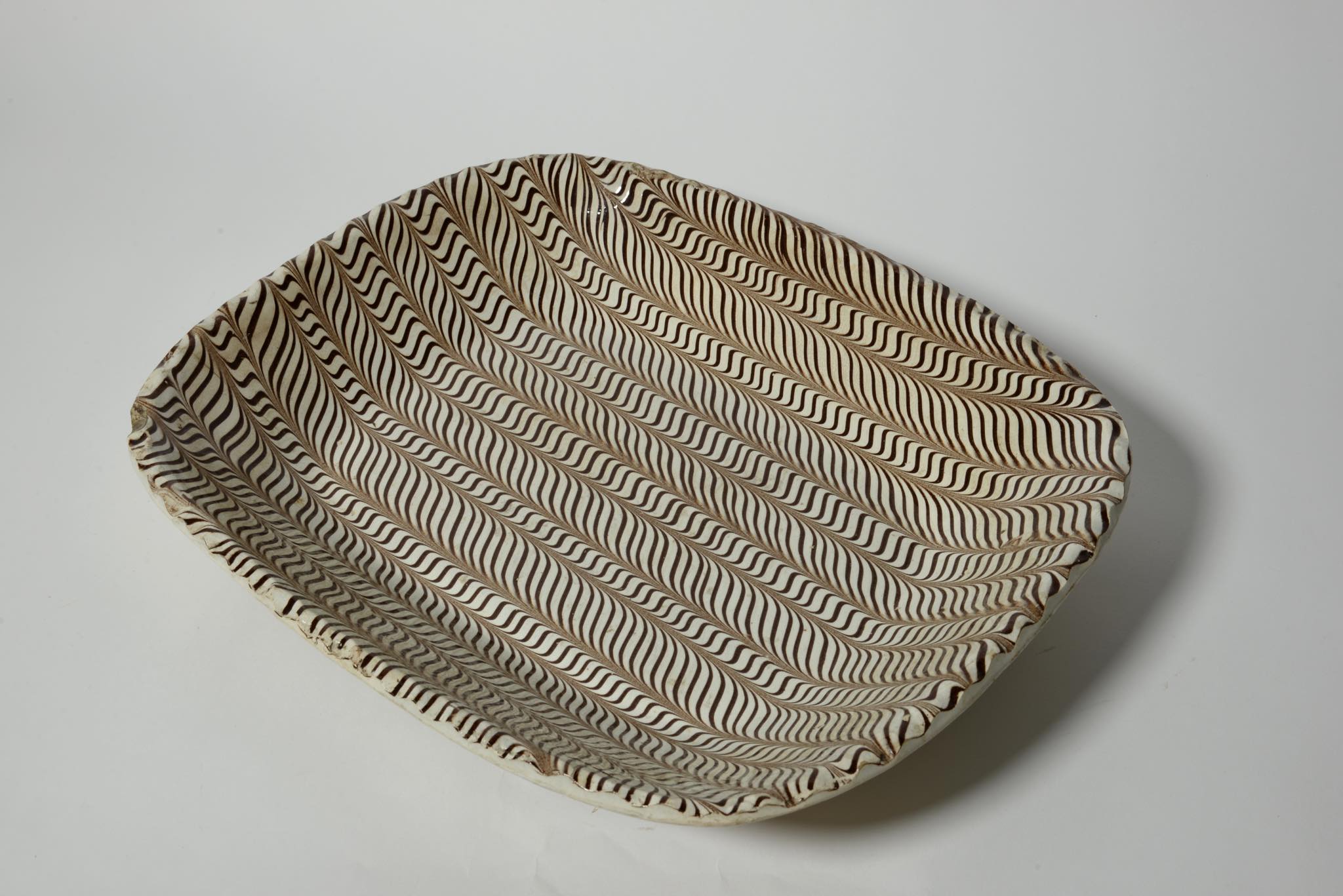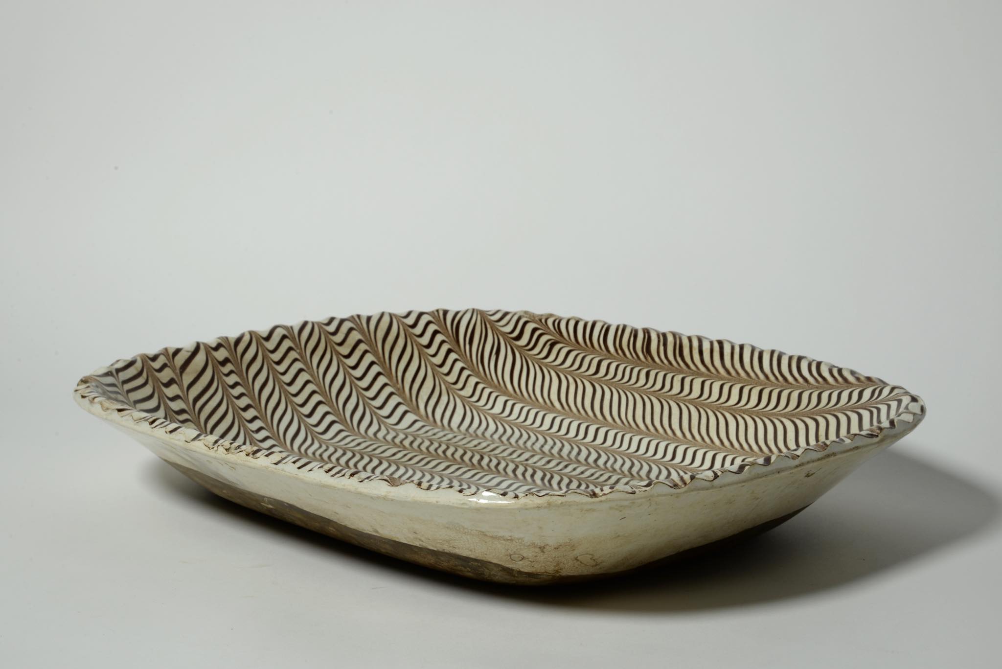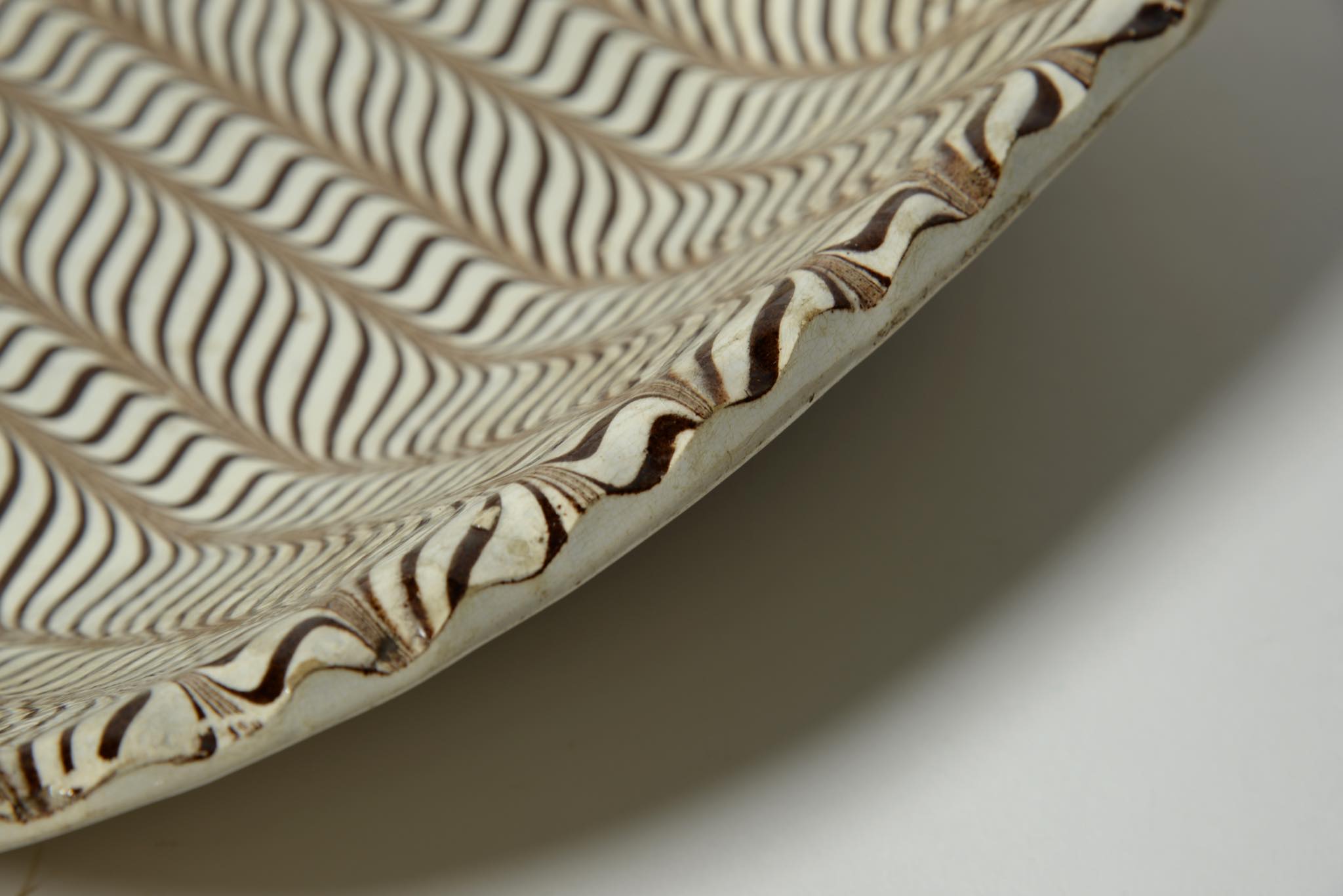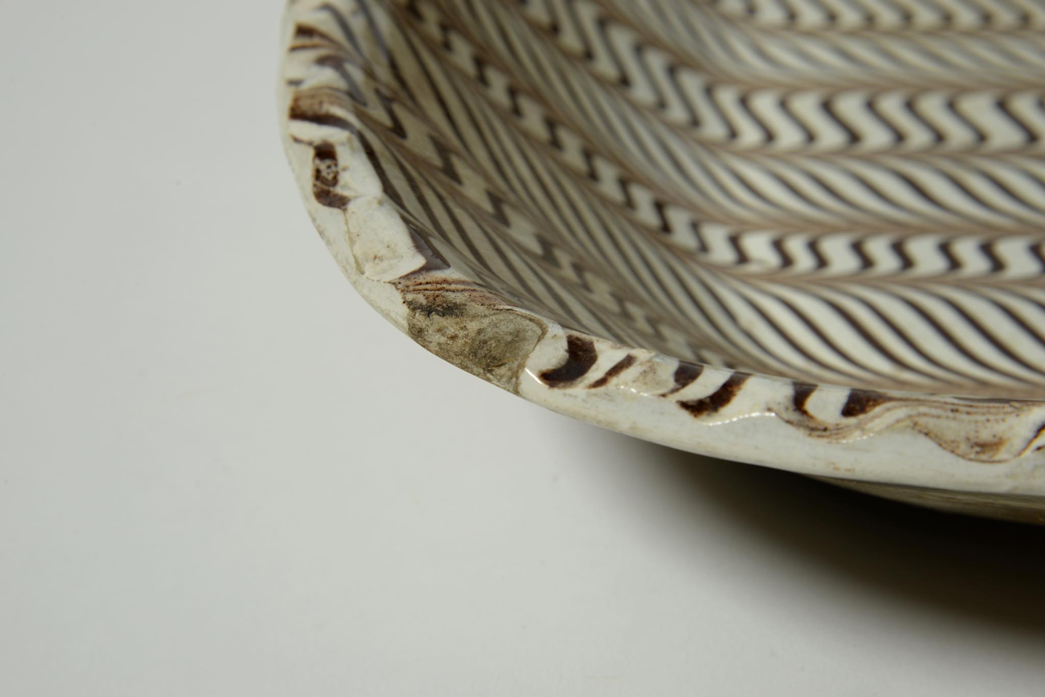きめ細かなフェザーコーム文様が施された大ぶりなスリップウェアです。時代と産地は19世紀のアメリカだろうとのことで、当然ながら英国からの移民による作陶でしょう。指先ほどの古いチップと浅いニュウ(クラック)が見られますが、コンディションは良好です。