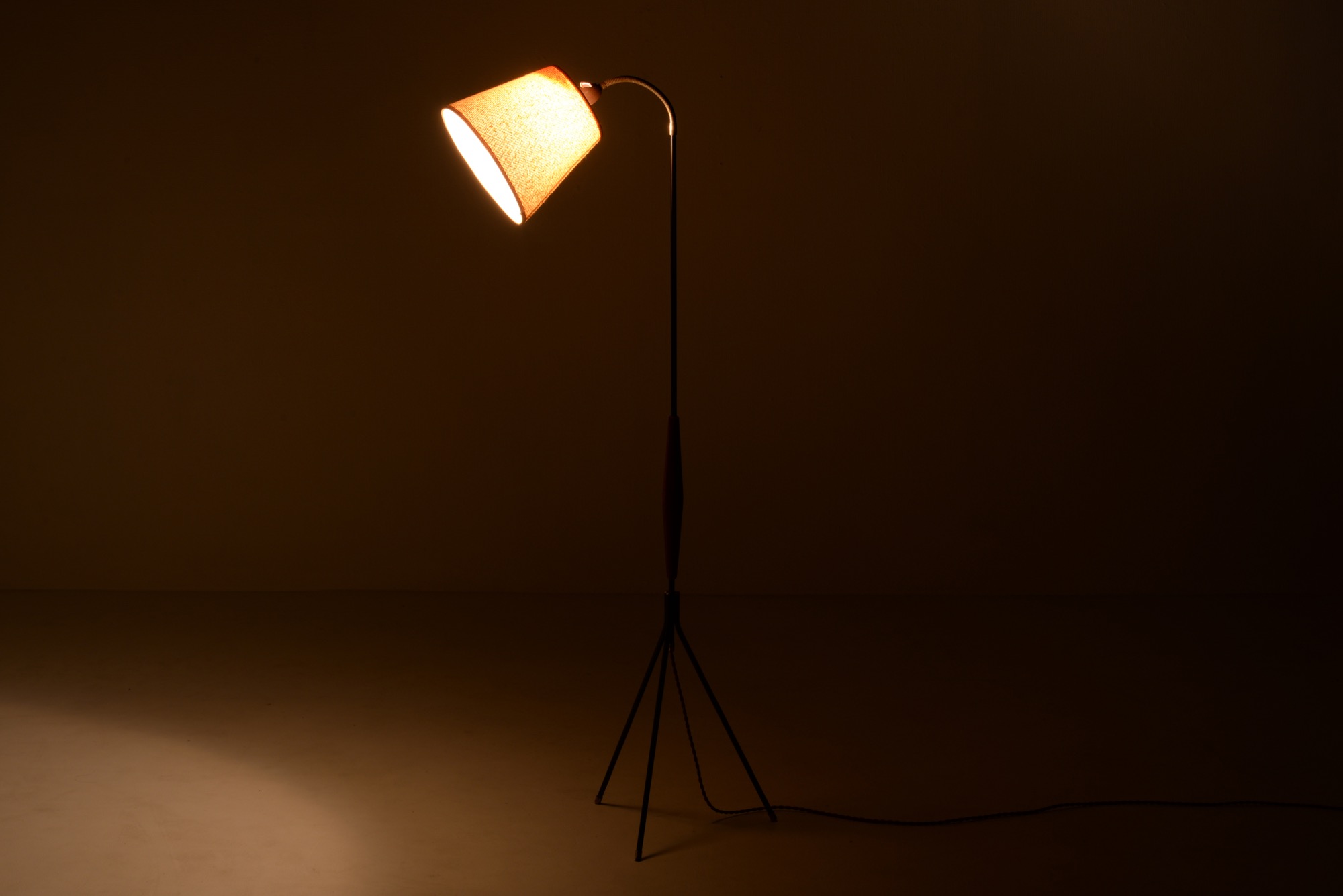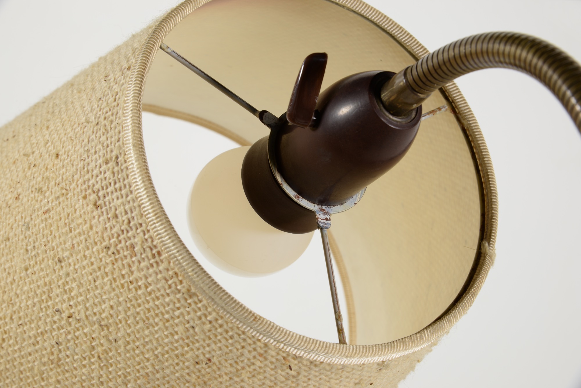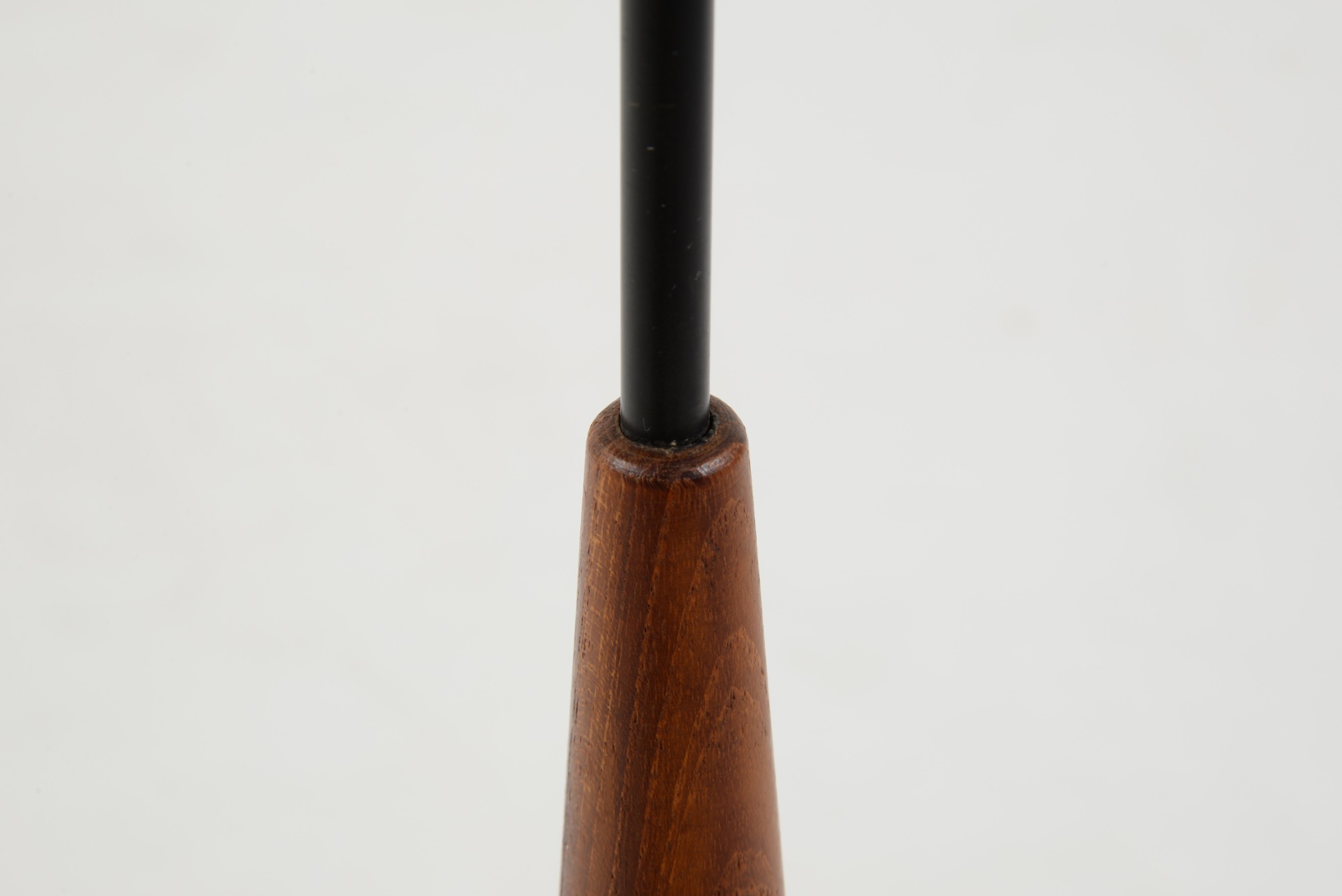 デンマーク製、1950年代のリーディングランプ、椅子に座って本を読むときに使う照明です。移動させるためにフレームが持ちやすいようチーク材が巻かれており、首は自在に動かせます。シェードの張替えも可能です。