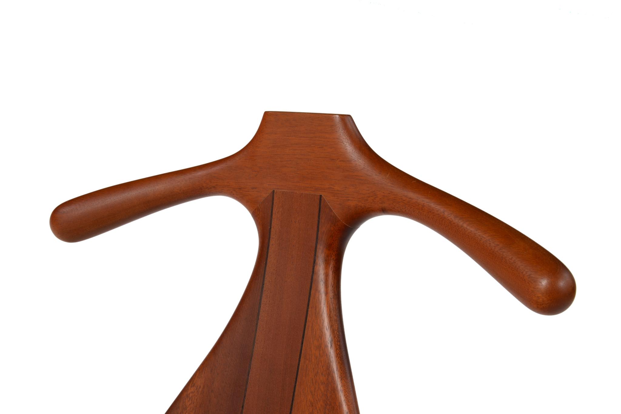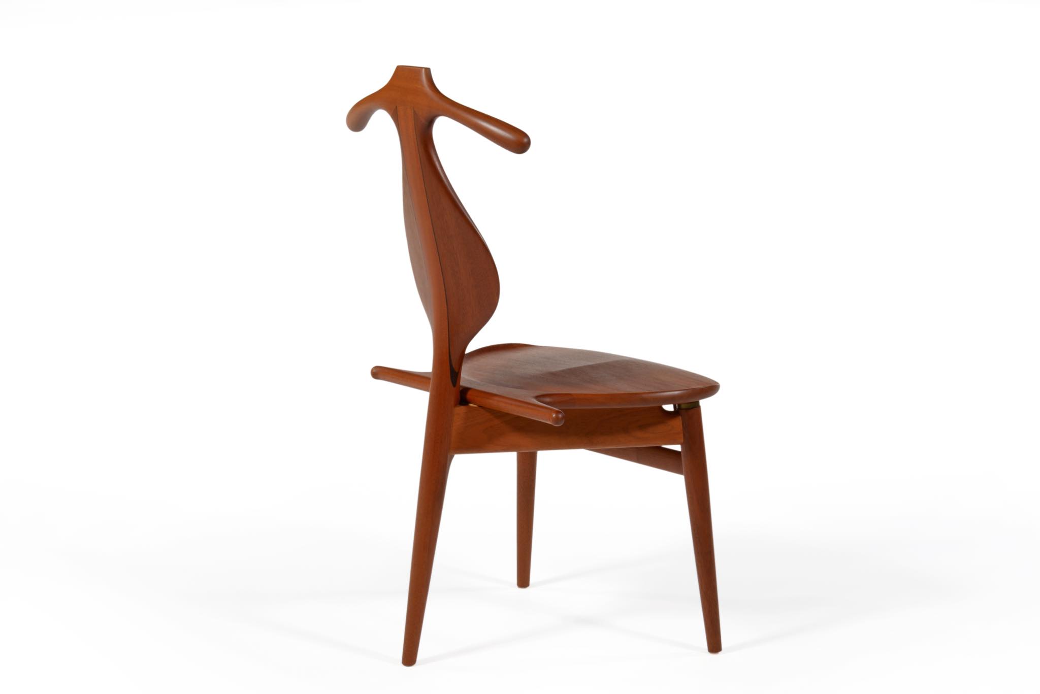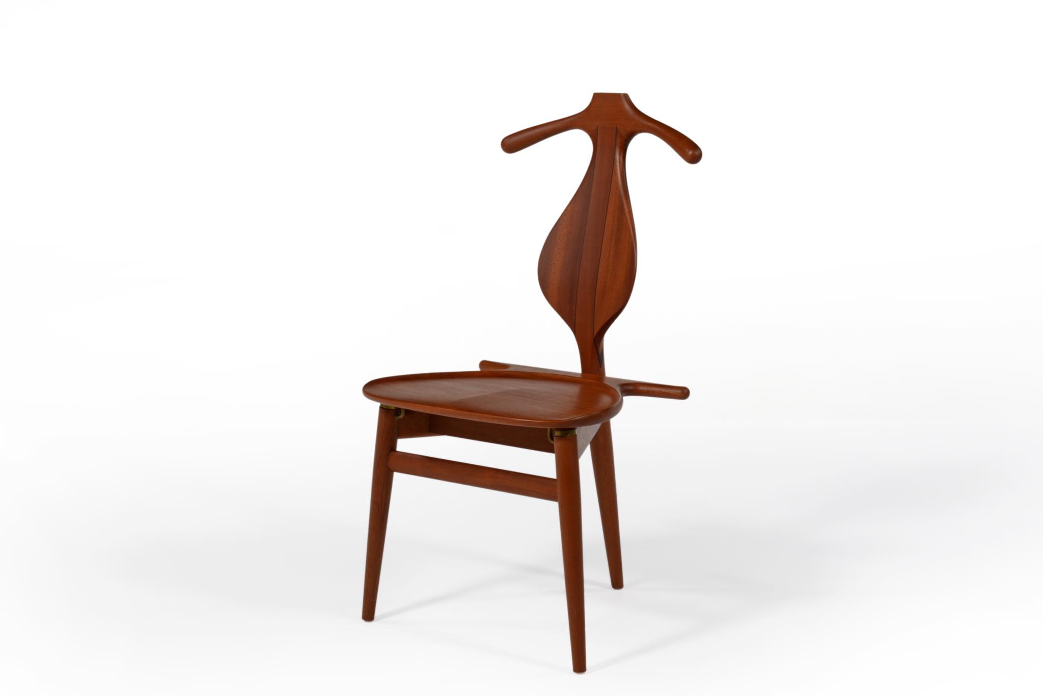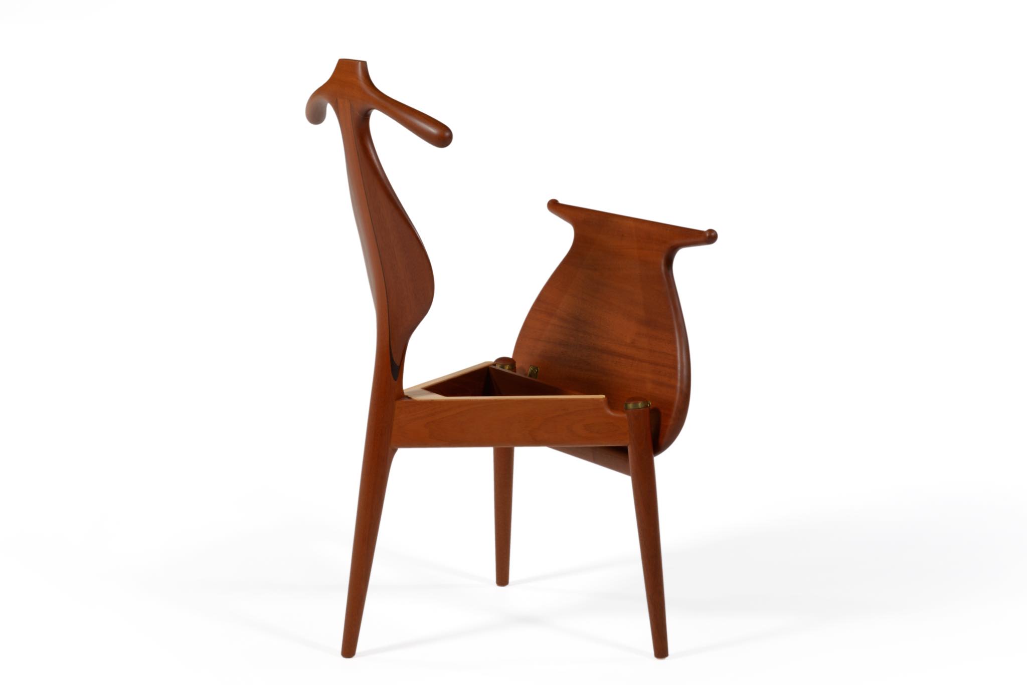 家具職人のハンス・ウェグナー、建築学教授のスティーン・アイラー・ラスムセン、デザイナーのカイ・ボイスンの三人によって衣類の収納方法について協議したことががきっかけとなり、考案された名作椅子”ヴァレットチェア”。笠木はハンガー、座を起こせばパンツが掛けられ、座の下のボックスへは小物も入れられるというユニークなモデルです。寝室や玄関に、あるいはオフィスの隅に映える一脚です。こちらは1982年以降にPPモブラー社によって製作されたもので、現在では廃番となっているマホガニー材が用いられています。コンディションは極めて良好です。