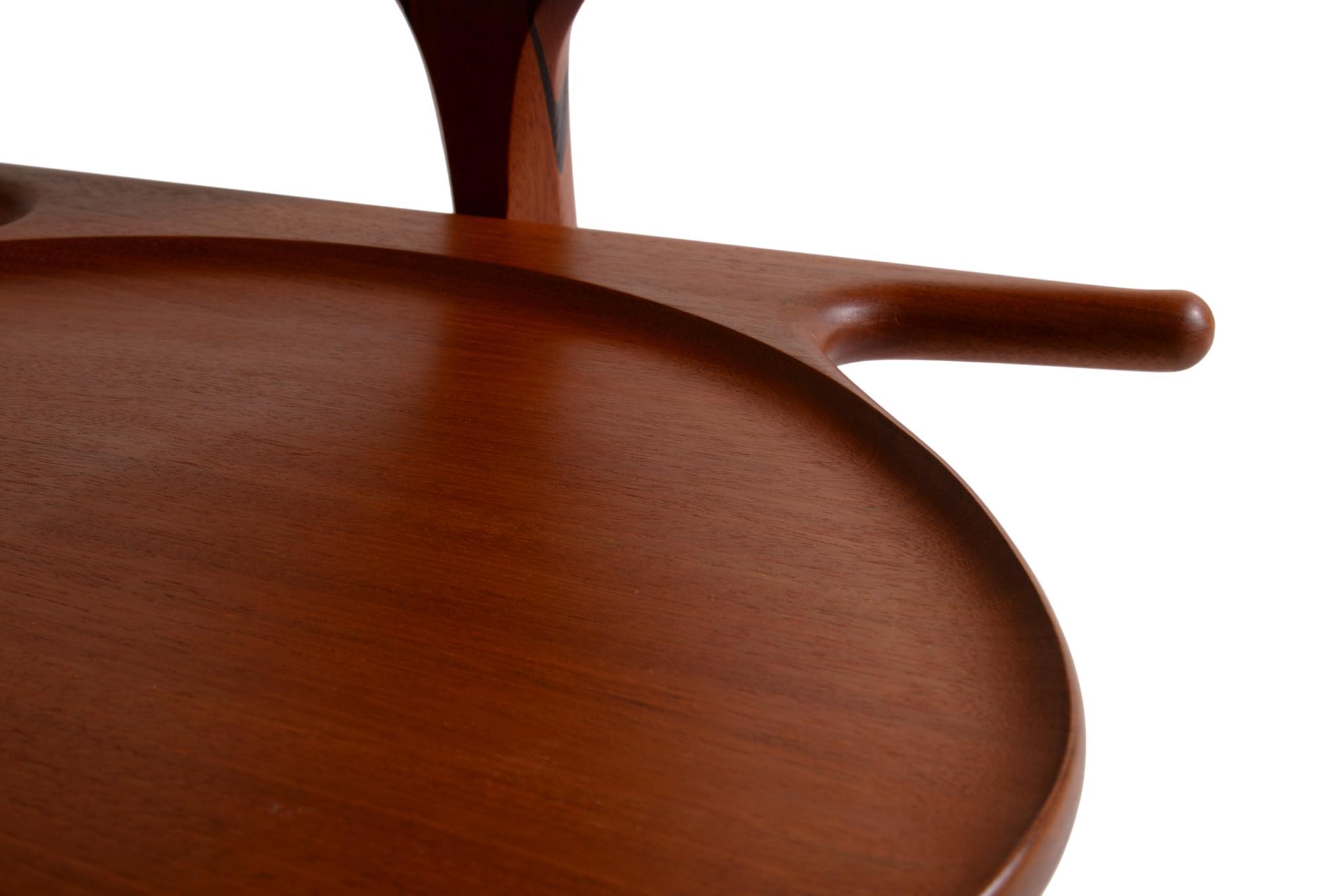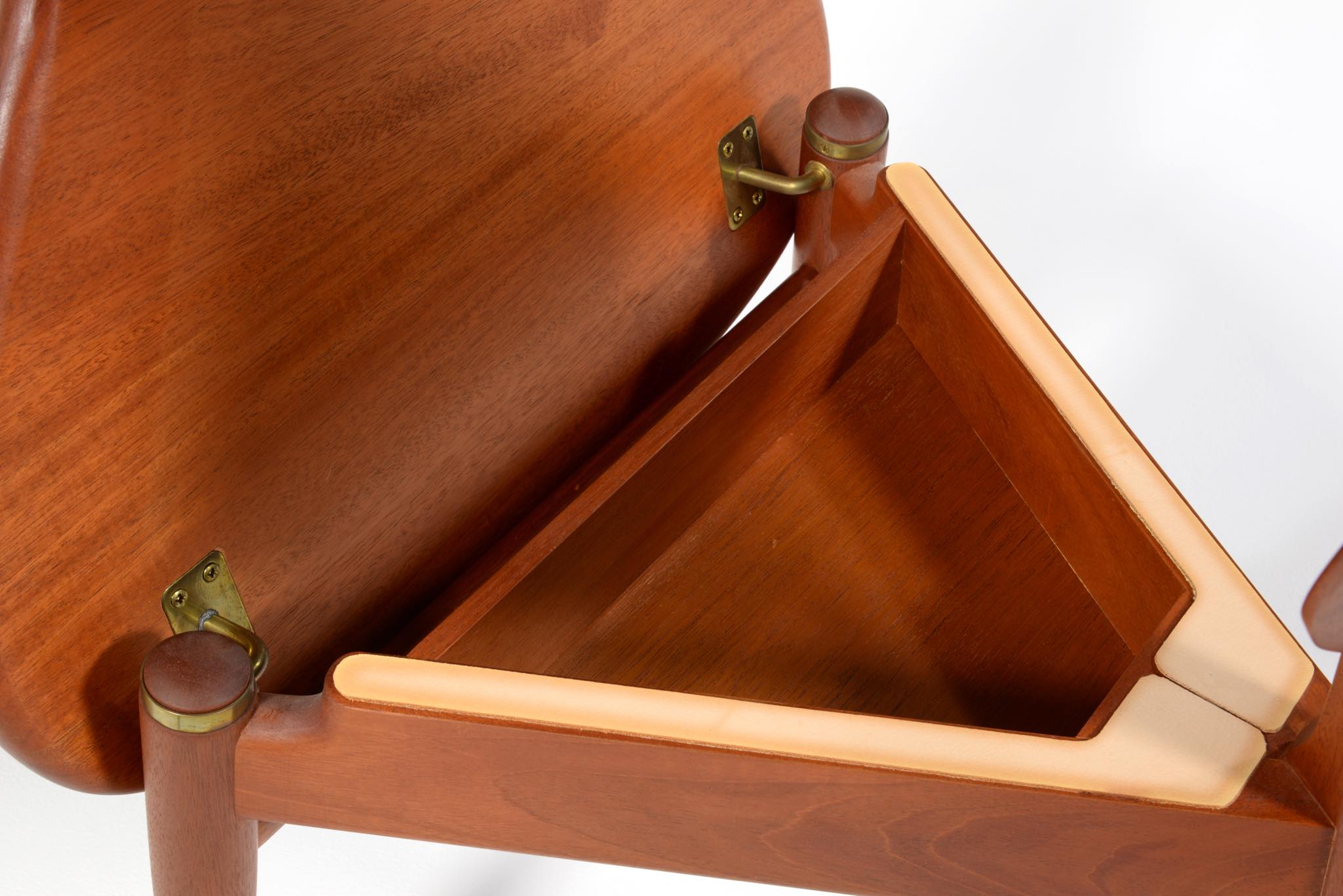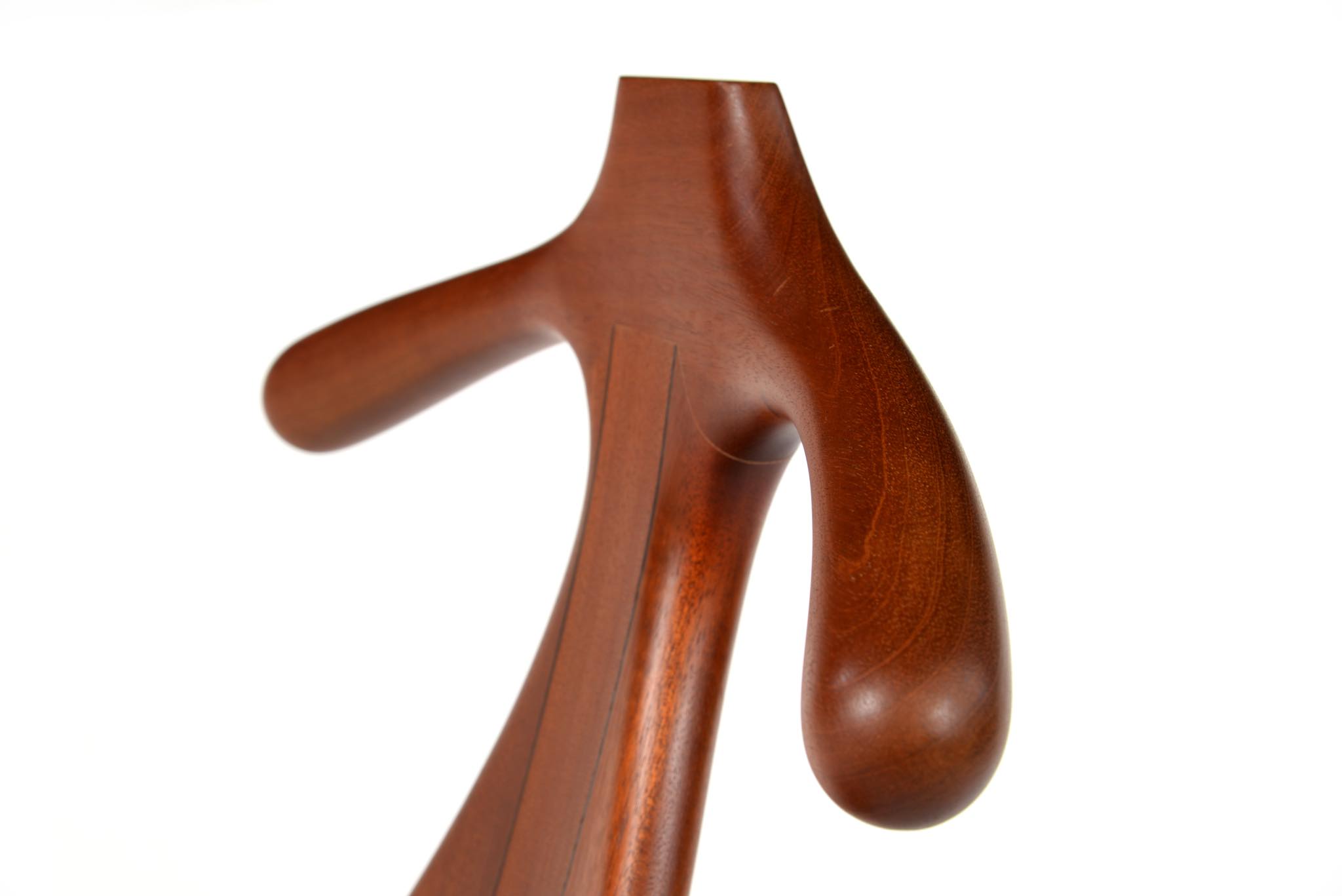 家具職人のハンス・ウェグナー、建築学教授のスティーン・アイラー・ラスムセン、デザイナーのカイ・ボイスンの三人によって衣類の収納方法について協議したことががきっかけとなり、考案された名作椅子”ヴァレットチェア”。笠木はハンガー、座を起こせばパンツが掛けられ、座の下のボックスへは小物も入れられるというユニークなモデルです。寝室や玄関に、あるいはオフィスの隅に映える一脚です。こちらは1982年以降にPPモブラー社によって製作されたもので、現在では廃番となっているマホガニー材が用いられています。コンディションは極めて良好です。