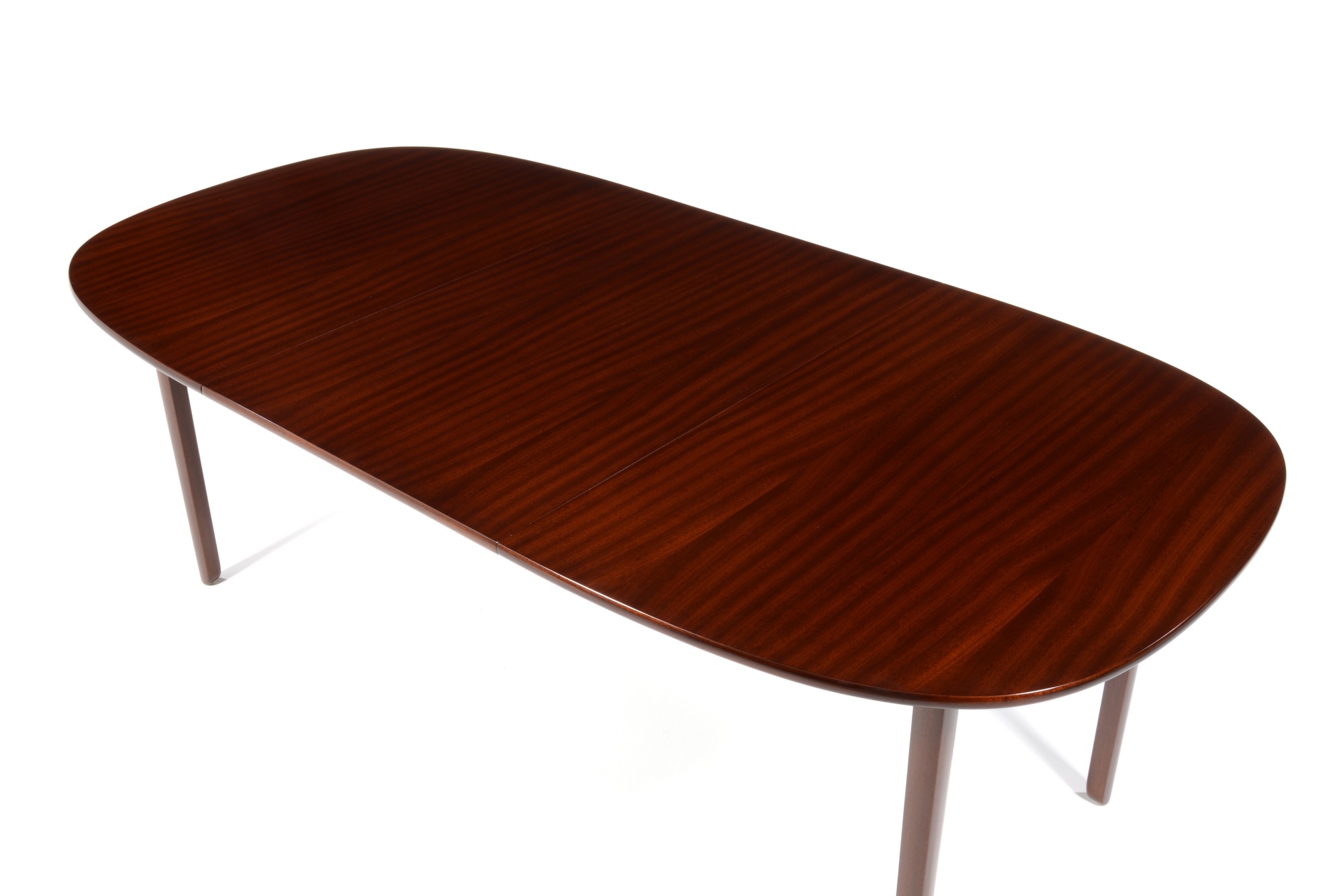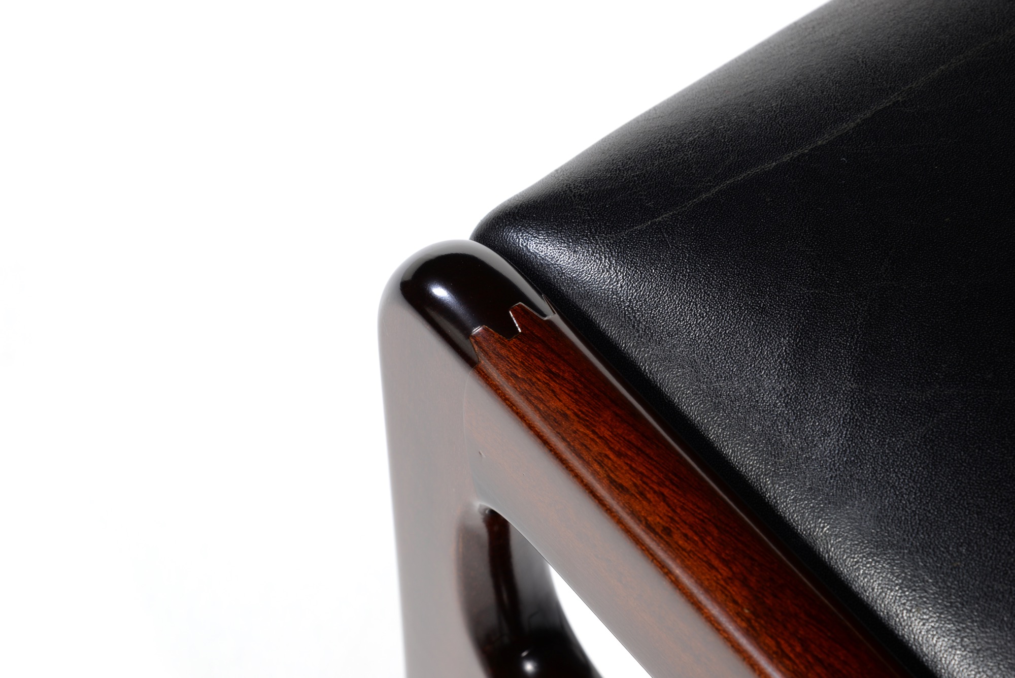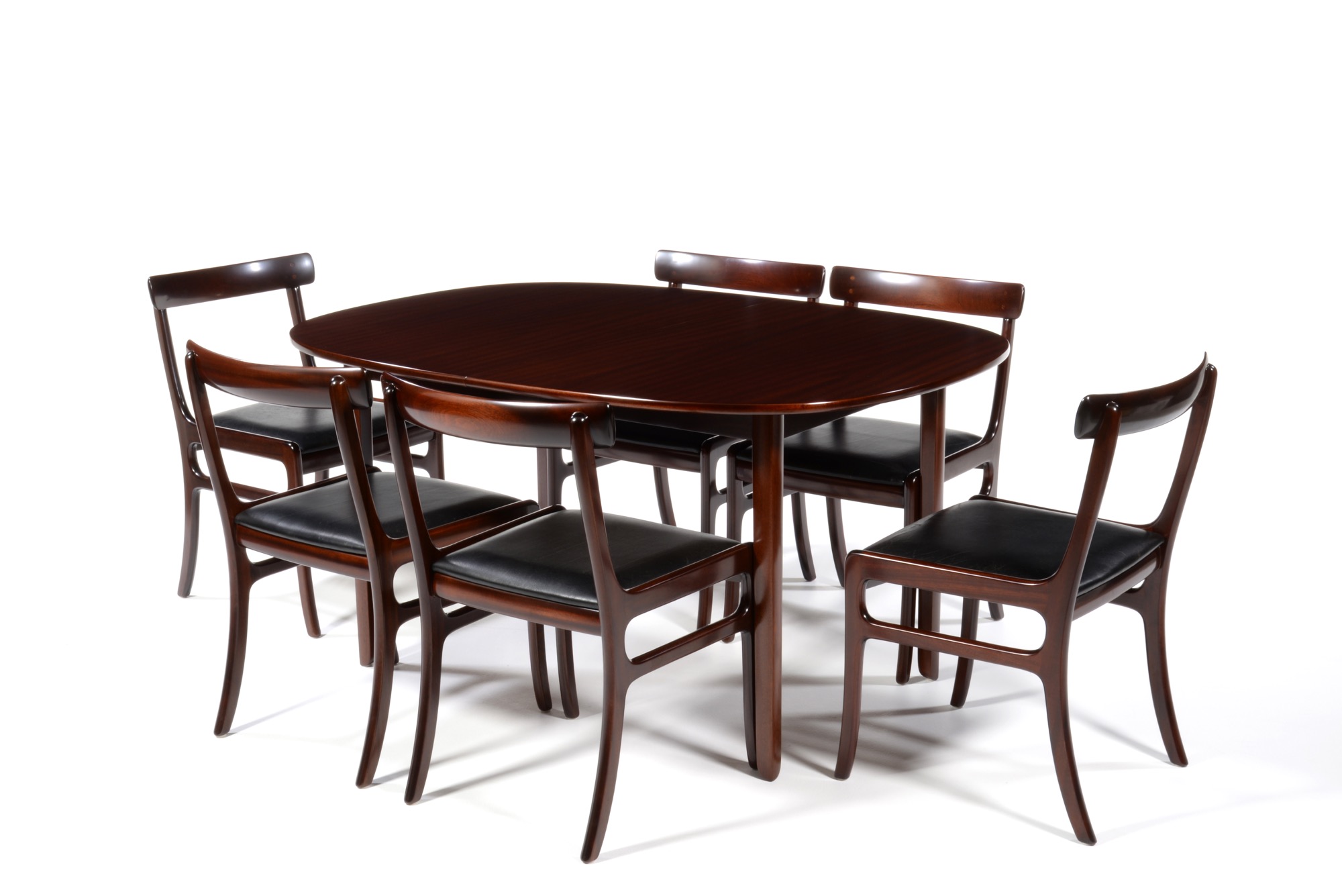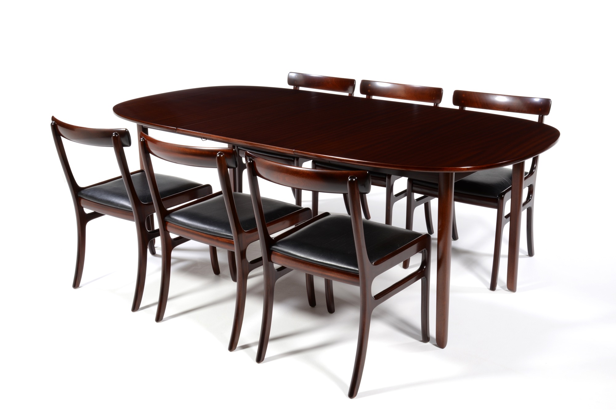 20世紀のデンマークを代表する文豪、Baroness Karen von Blixen-Finecke/カリン・ブリクセンの邸宅にちなんで名付けられた “Rungstedlund/ルンステッドランド” シリーズのダイニングセットです。クラシックな趣を有するデザインは当時人気を博したようで、マホガニーを用いたモデルはたくさんの製品が作られました。こちらはエクステンション(伸張式)のテーブルと椅子6脚との7点セットとなります。写真での座面は古い黒色皮革が張られたままの状態で、使い込まれた雰囲気はヴィンテージ感を醸していますが、お好きな生地や皮革で張り替えることも可能です。テーブルのエクステンションは2枚のリーフが備わり、最大で275センチまで伸ばすことができます。
