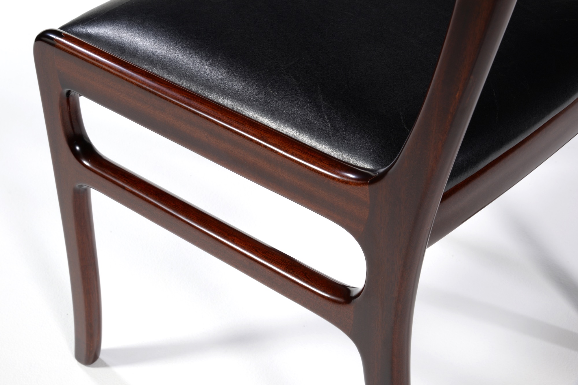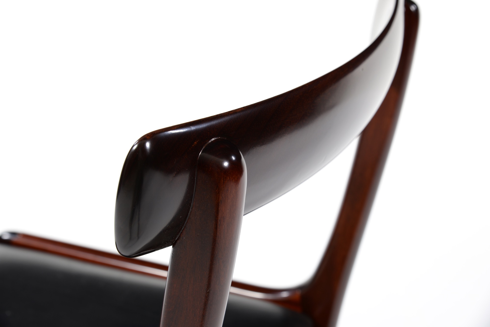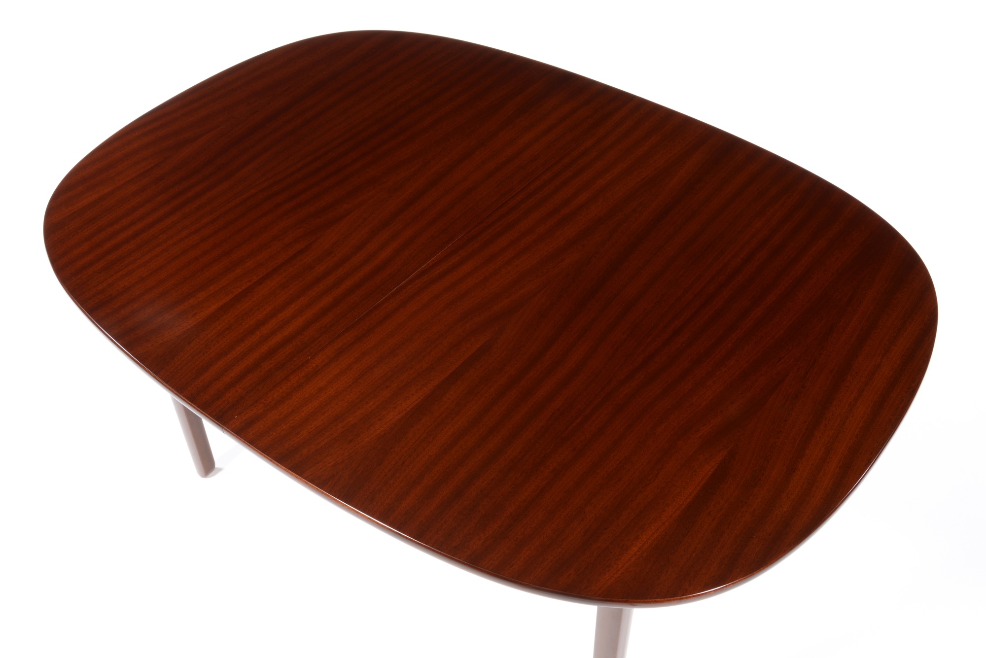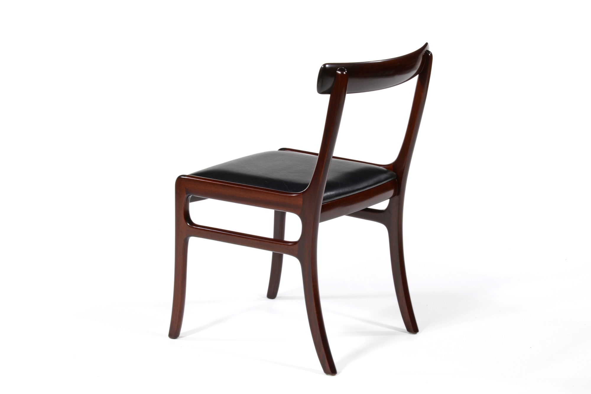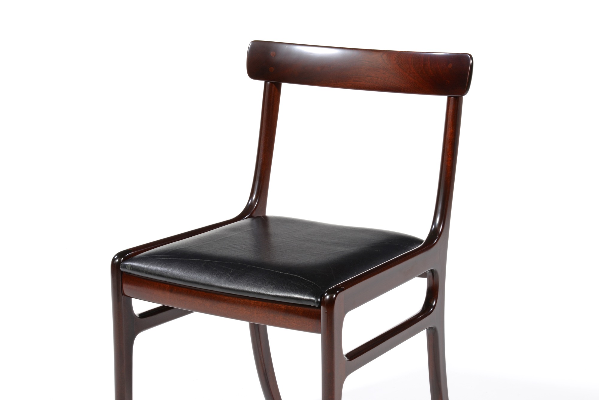 20世紀のデンマークを代表する文豪、Baroness Karen von Blixen-Finecke/カリン・ブリクセンの邸宅にちなんで名付けられた “Rungstedlund/ルンステッドランド” シリーズのダイニングセットです。クラシックな趣を有するデザインは当時人気を博したようで、マホガニーを用いたモデルはたくさんの製品が作られました。こちらはエクステンション(伸張式)のテーブルと椅子6脚との7点セットとなります。写真での座面は古い黒色皮革が張られたままの状態で、使い込まれた雰囲気はヴィンテージ感を醸していますが、お好きな生地や皮革で張り替えることも可能です。テーブルのエクステンションは2枚のリーフが備わり、最大で275センチまで伸ばすことができます。