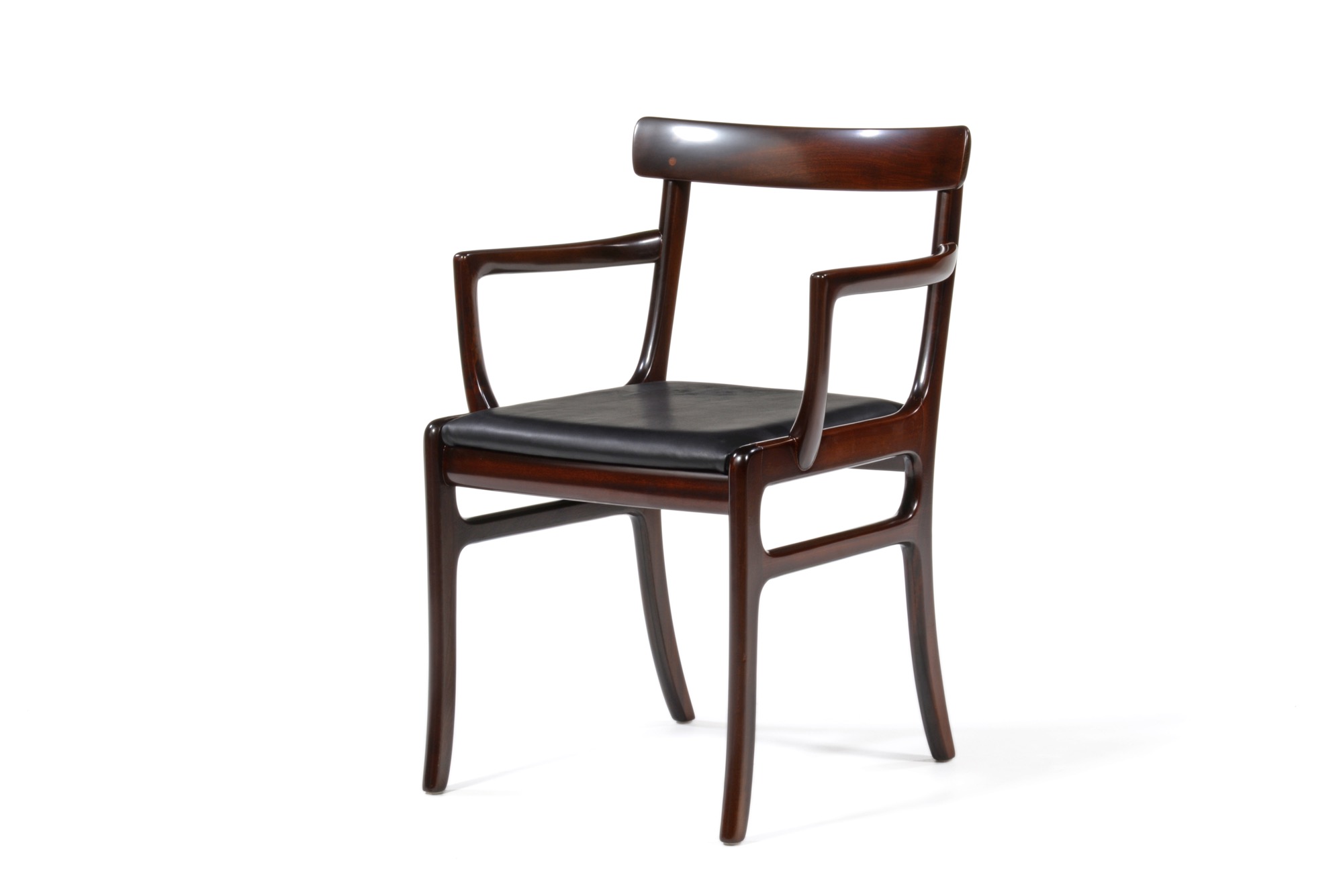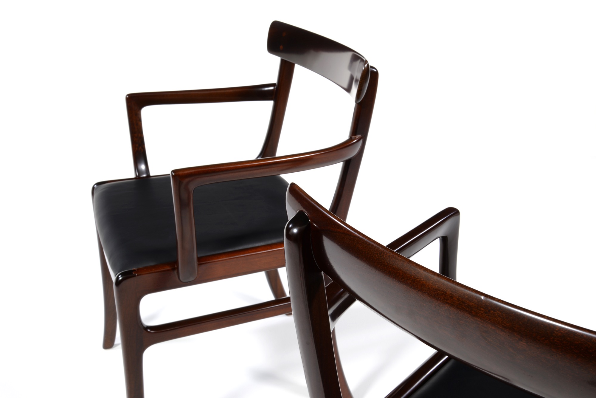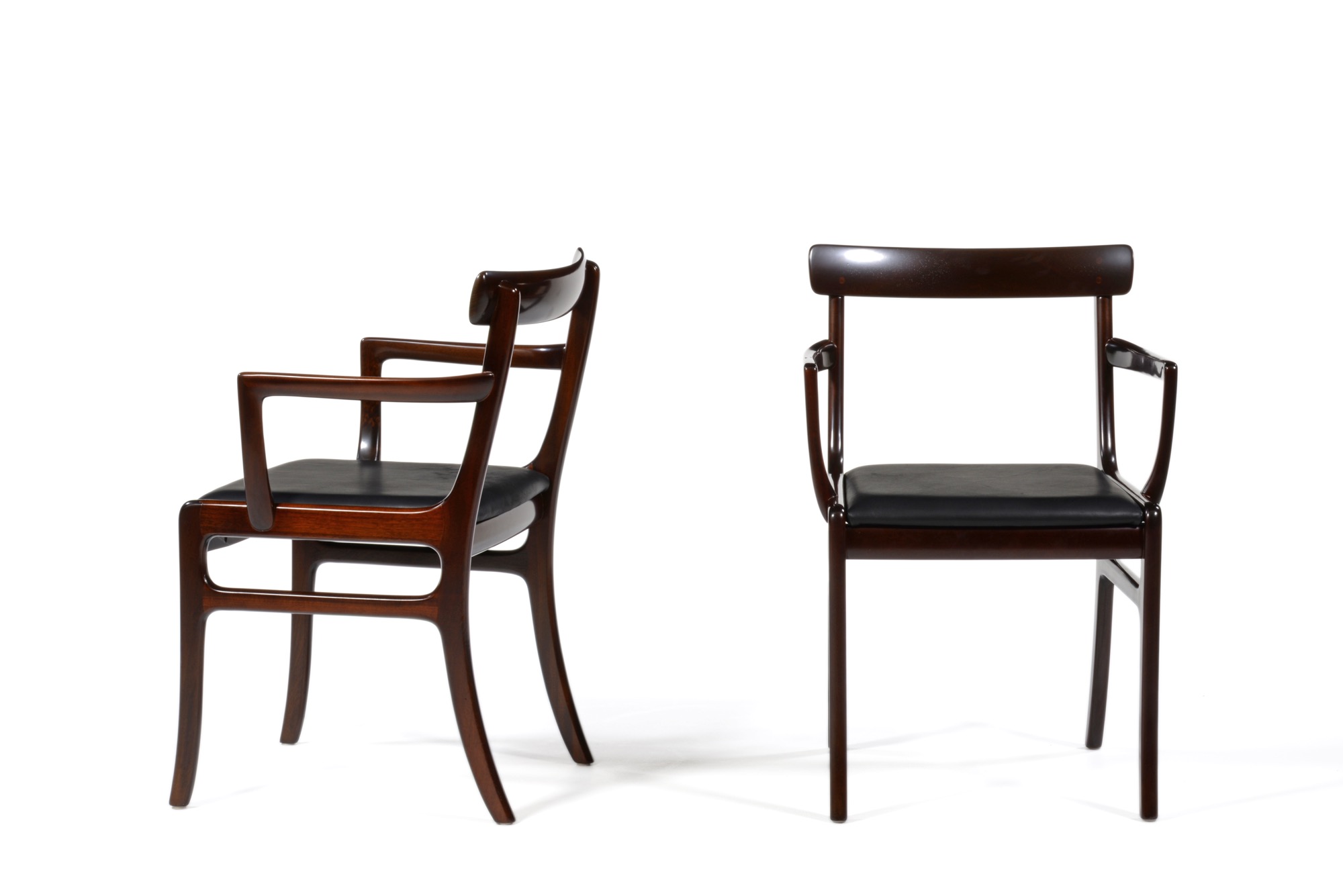 20世紀のデンマークを代表する文豪、Baroness Karen von Blixen-Finecke/カリン・ブリクセンの邸宅にちなんで名付けられた “Rungstedlund/ルンステッドランド” シリーズのアームチェアです。クラシックな趣を有するデザインは当時人気を博したようで、マホガニーを用いたモデルはたくさんの製品が作られました。こちらは肘つき椅子2脚のセットとなります。シートの皮革は新たに張り替えました。