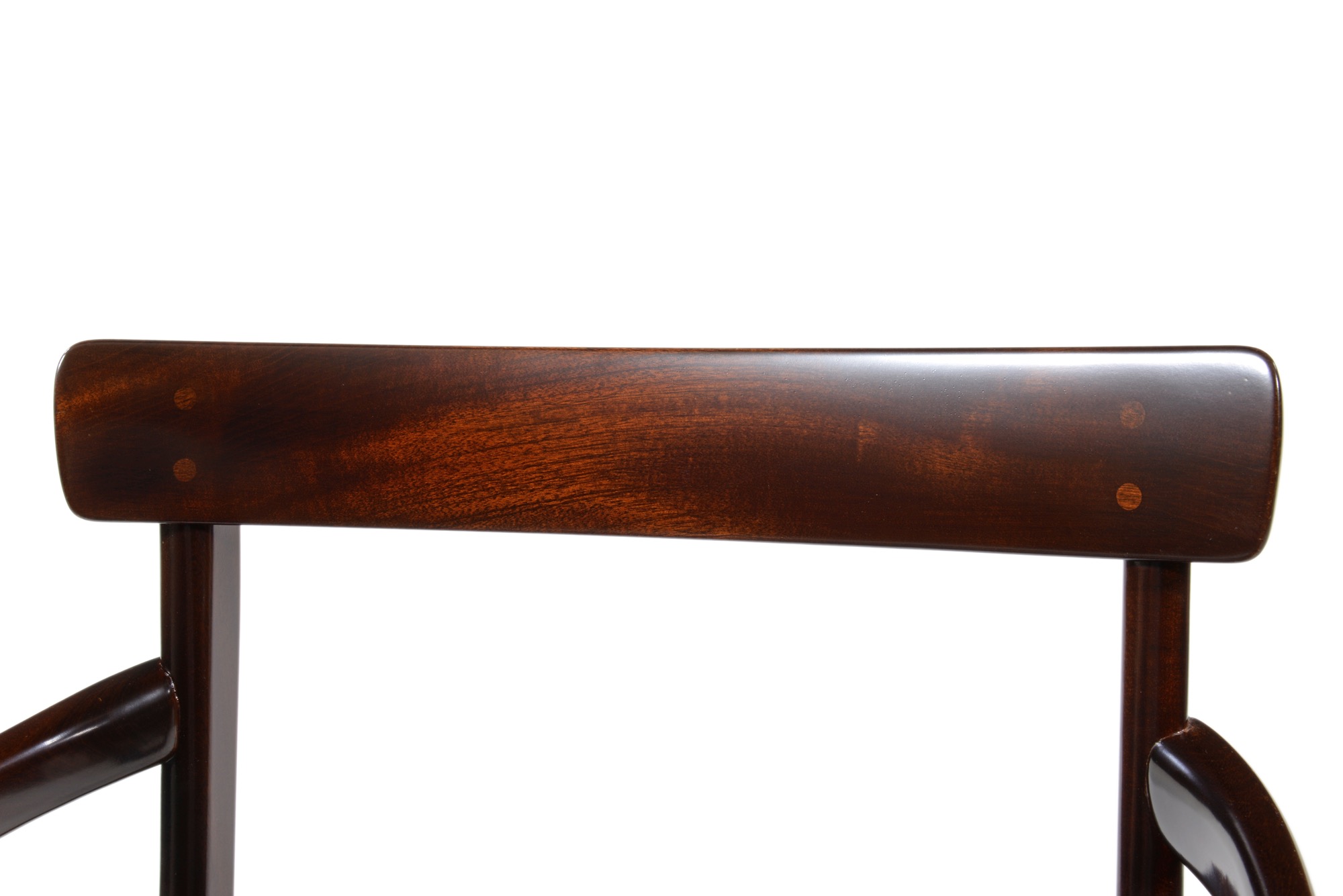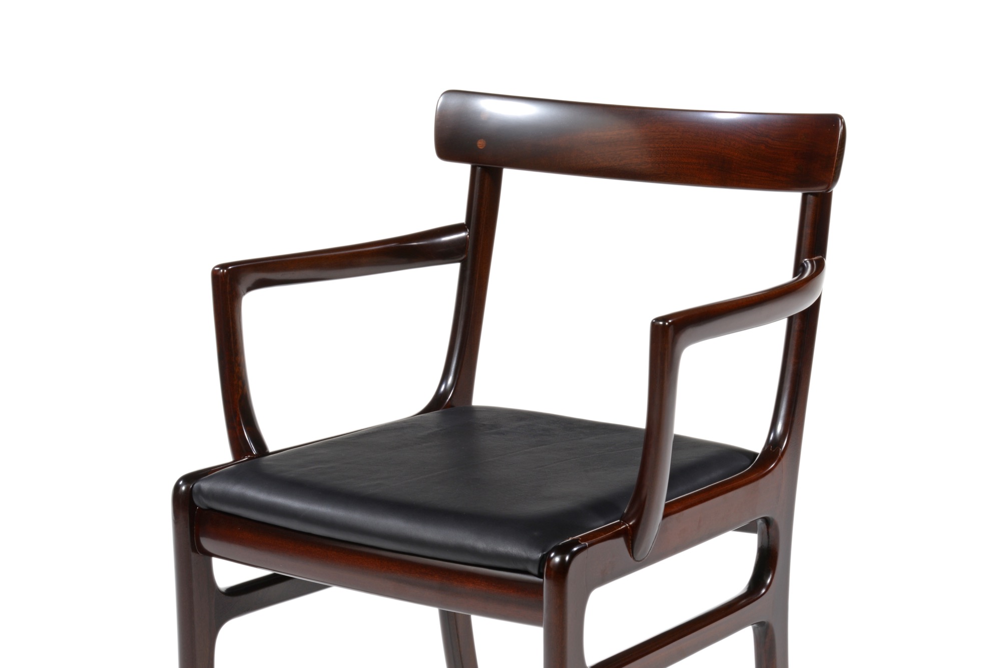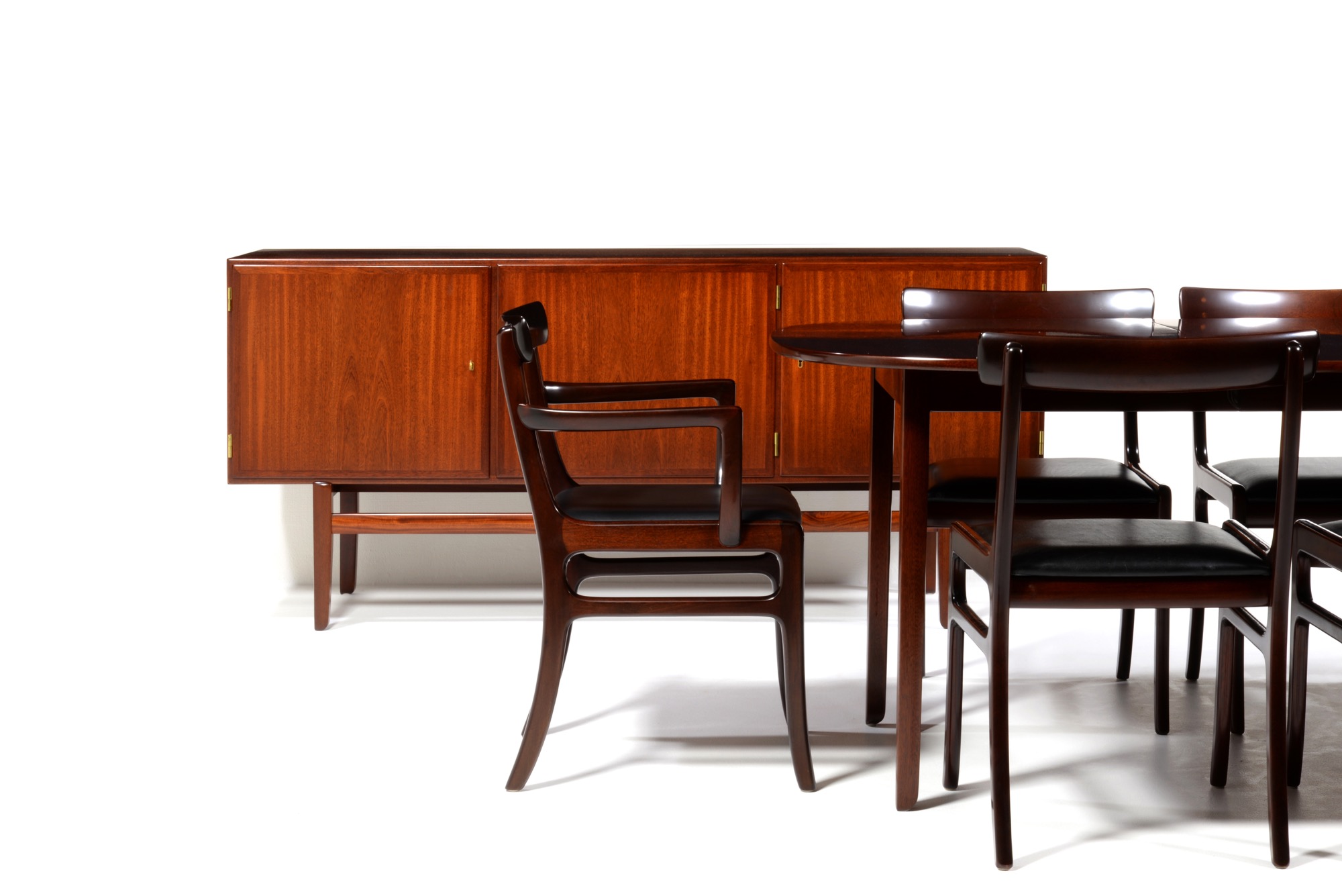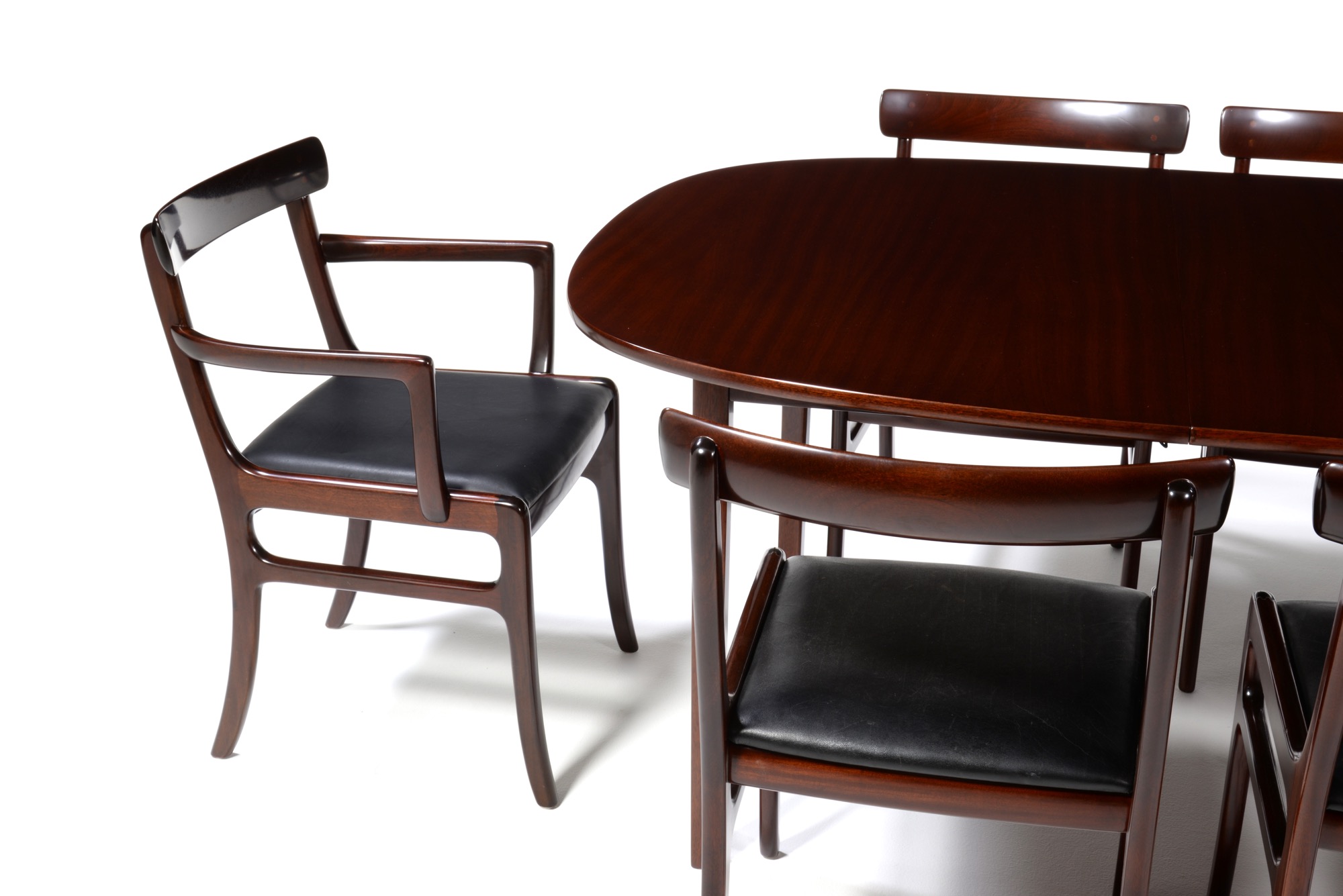 20世紀のデンマークを代表する文豪、Baroness Karen von Blixen-Finecke/カリン・ブリクセンの邸宅にちなんで名付けられた “Rungstedlund/ルンステッドランド” シリーズのアームチェアです。クラシックな趣を有するデザインは当時人気を博したようで、マホガニーを用いたモデルはたくさんの製品が作られました。こちらは肘つき椅子2脚のセットとなります。シートの皮革は新たに張り替えました。
