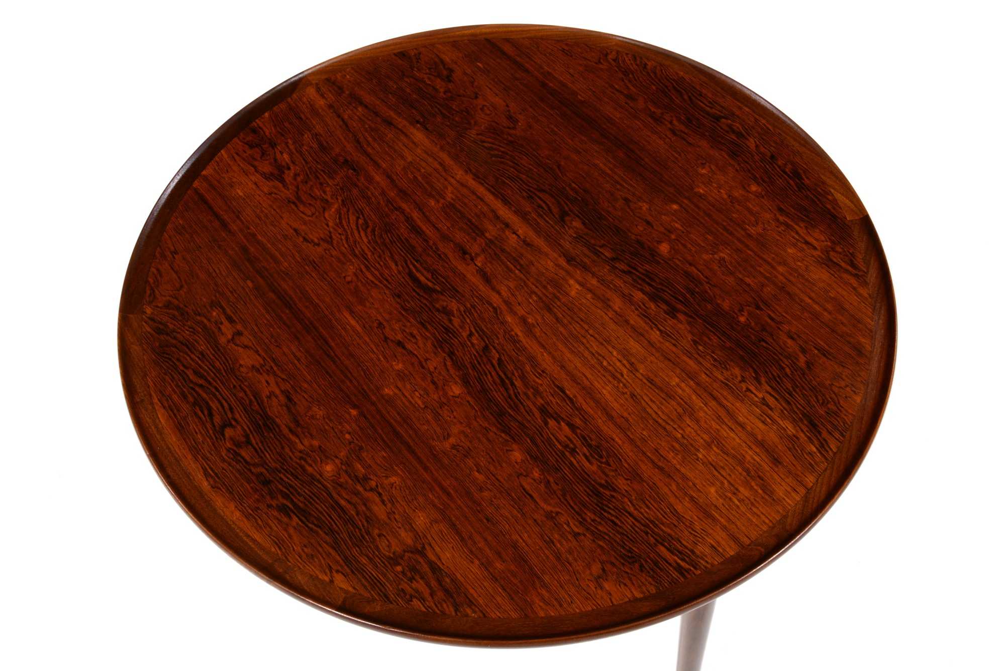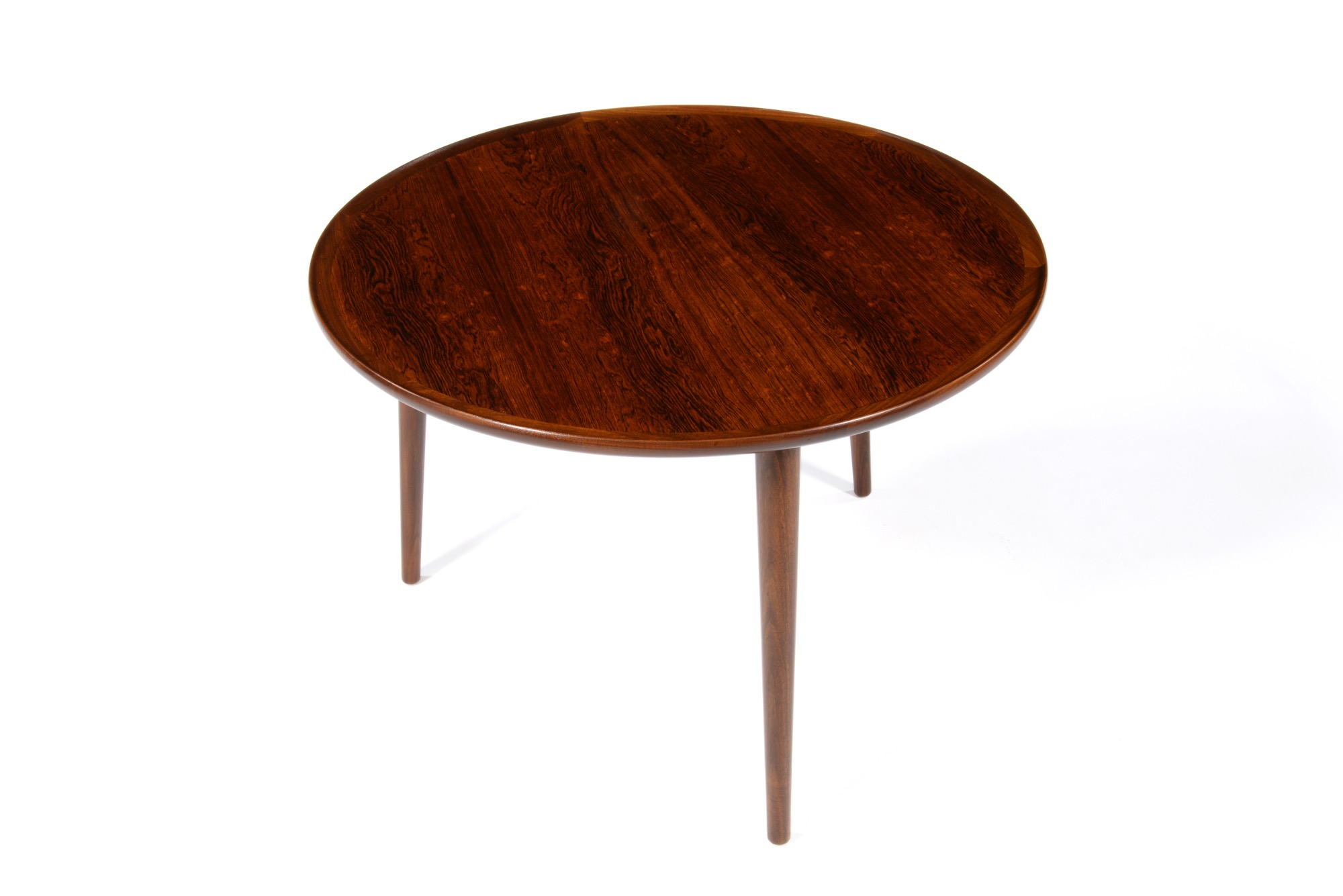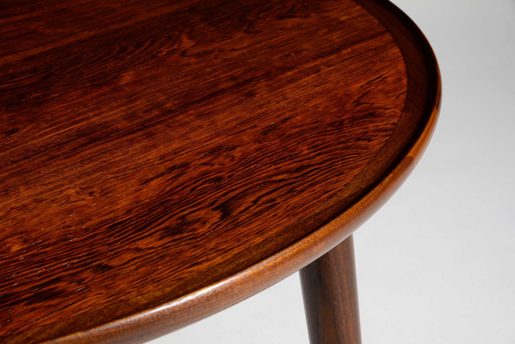 デンマークの家具工房、Anton Kildebergsによるコーヒーテーブルです。少なくとも二種類のサイズ展開があったようで、こちらは直径の大きなタイプです。天板はローズウッドの突き板で作られており、天板の縁回しと、取り外し可能な脚にはマホガニーの無垢材を用いています。
