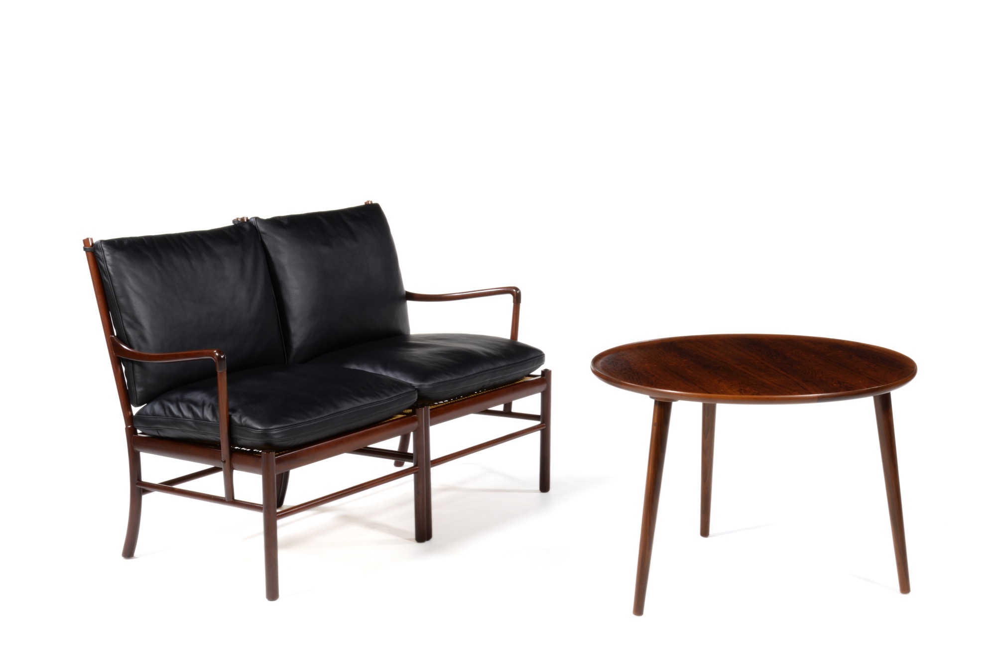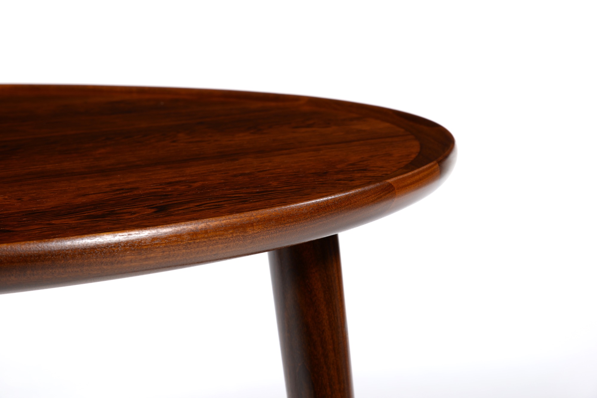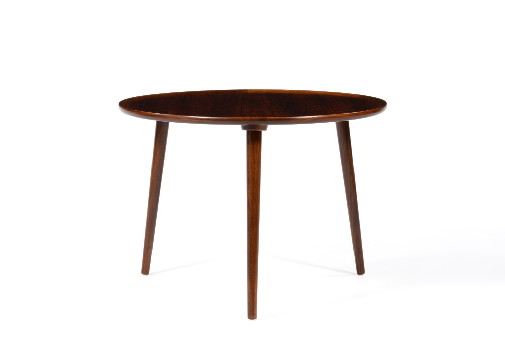 デンマークの家具工房、Anton Kildebergsによるコーヒーテーブルです。少なくとも二種類のサイズ展開があったようで、こちらは直径の大きなタイプです。天板はローズウッドの突き板で作られており、天板の縁回しと、取り外し可能な脚にはマホガニーの無垢材を用いています。