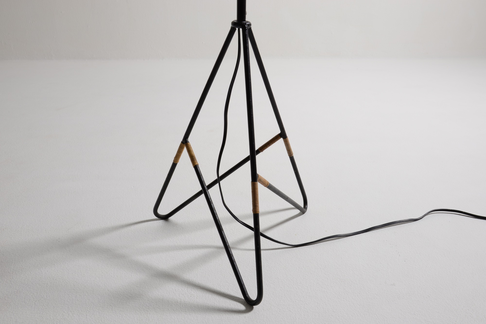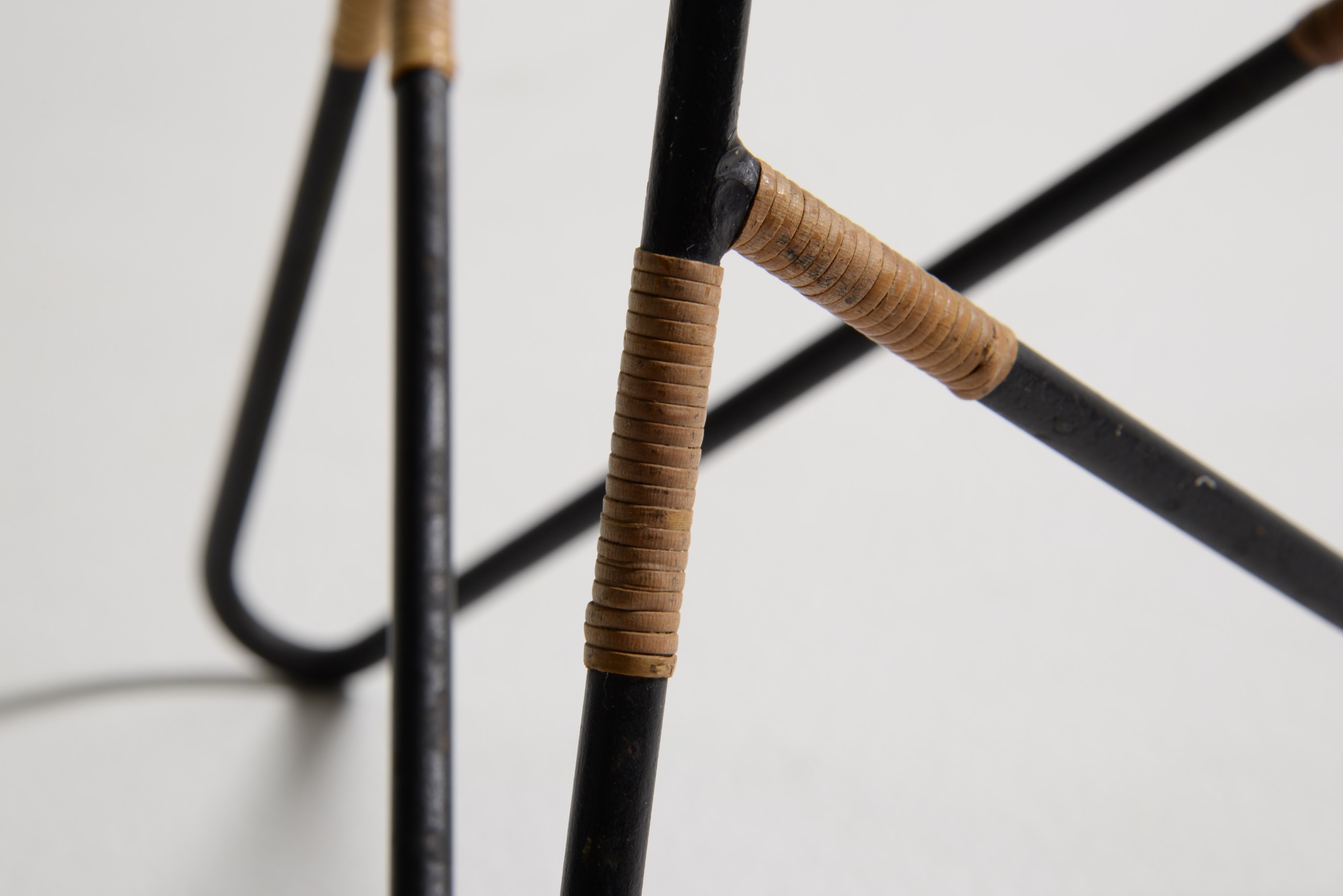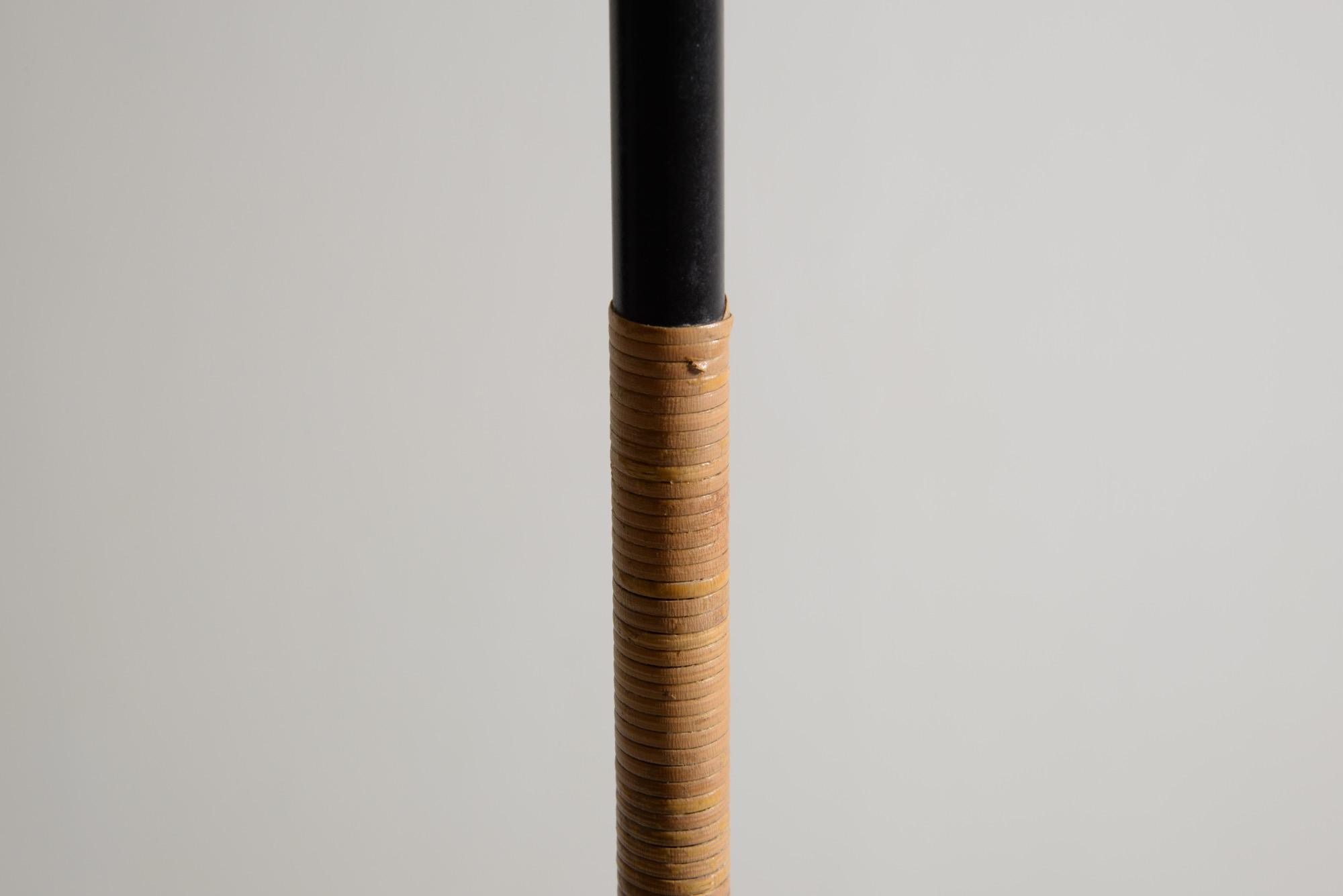 アイアンワークのフレームに籐をアクセントとした1950年代製の趣あるフロアランプです。シェードは当時のセルロイド製で、亀裂の補修がありますが、機能や、鑑賞上の美観は損ねておりません。新たに白色布張りのシェードを製作しましたのでこちらもお付けいたします。