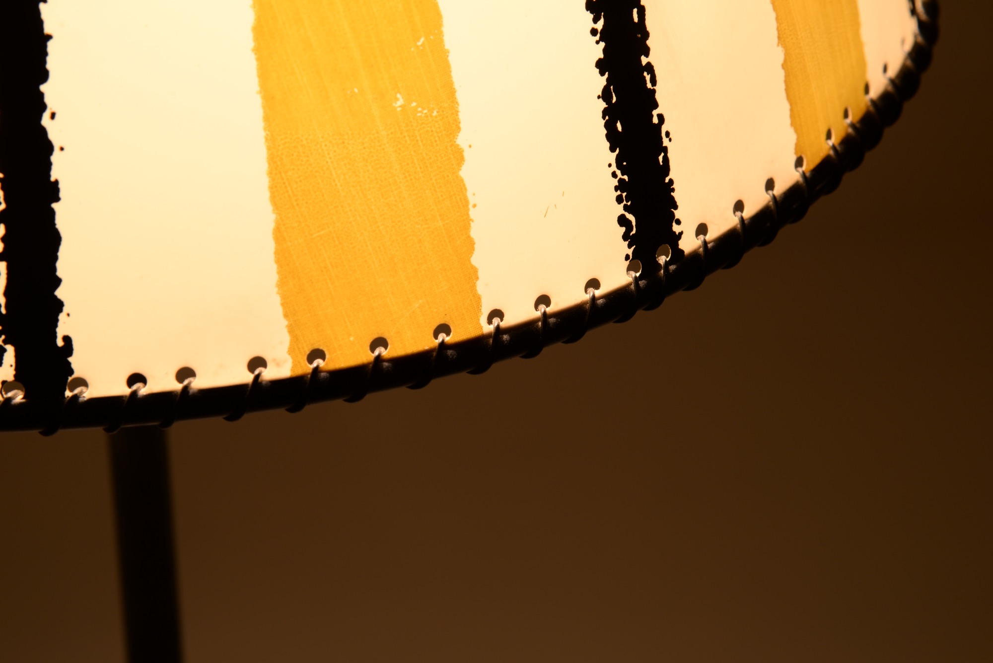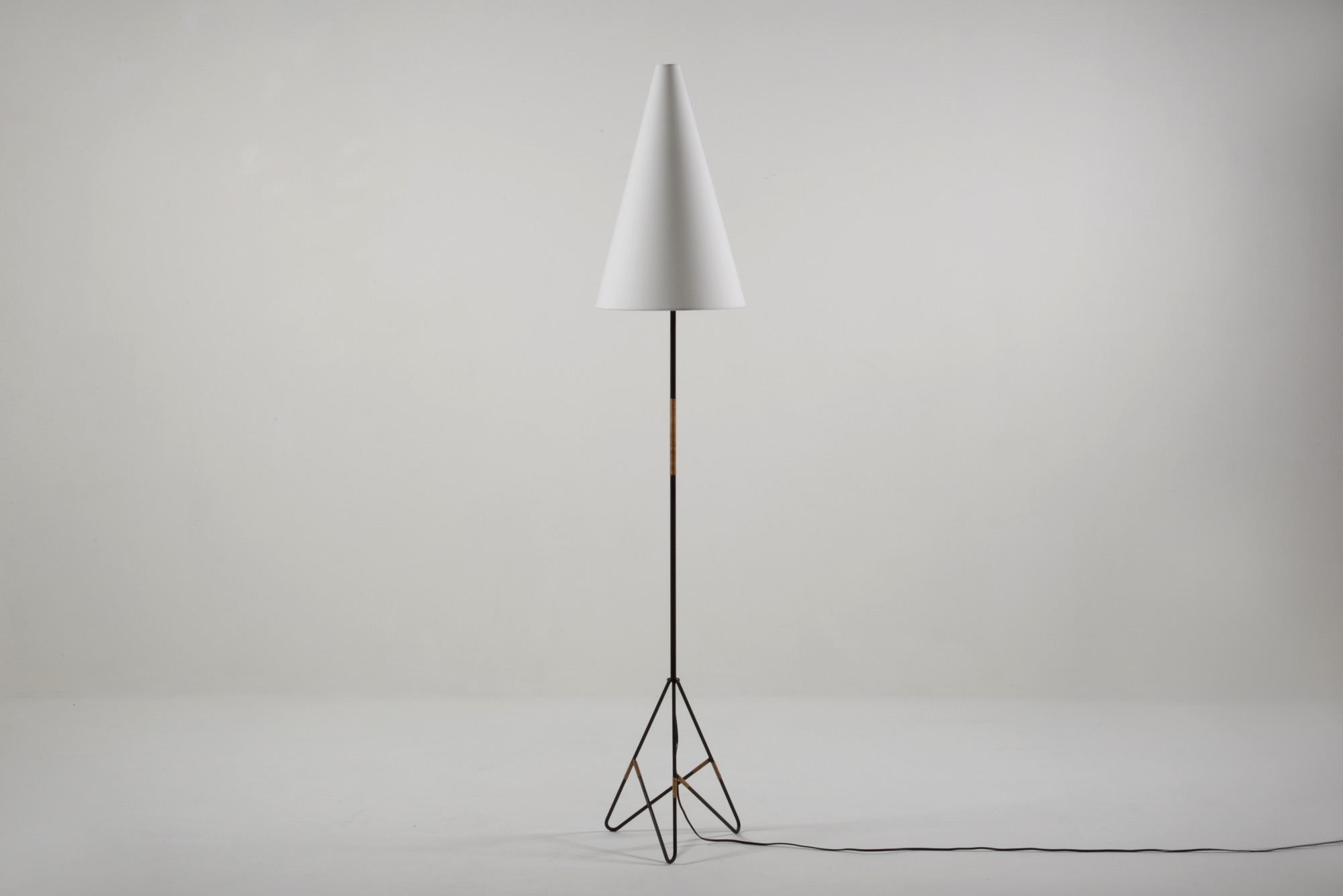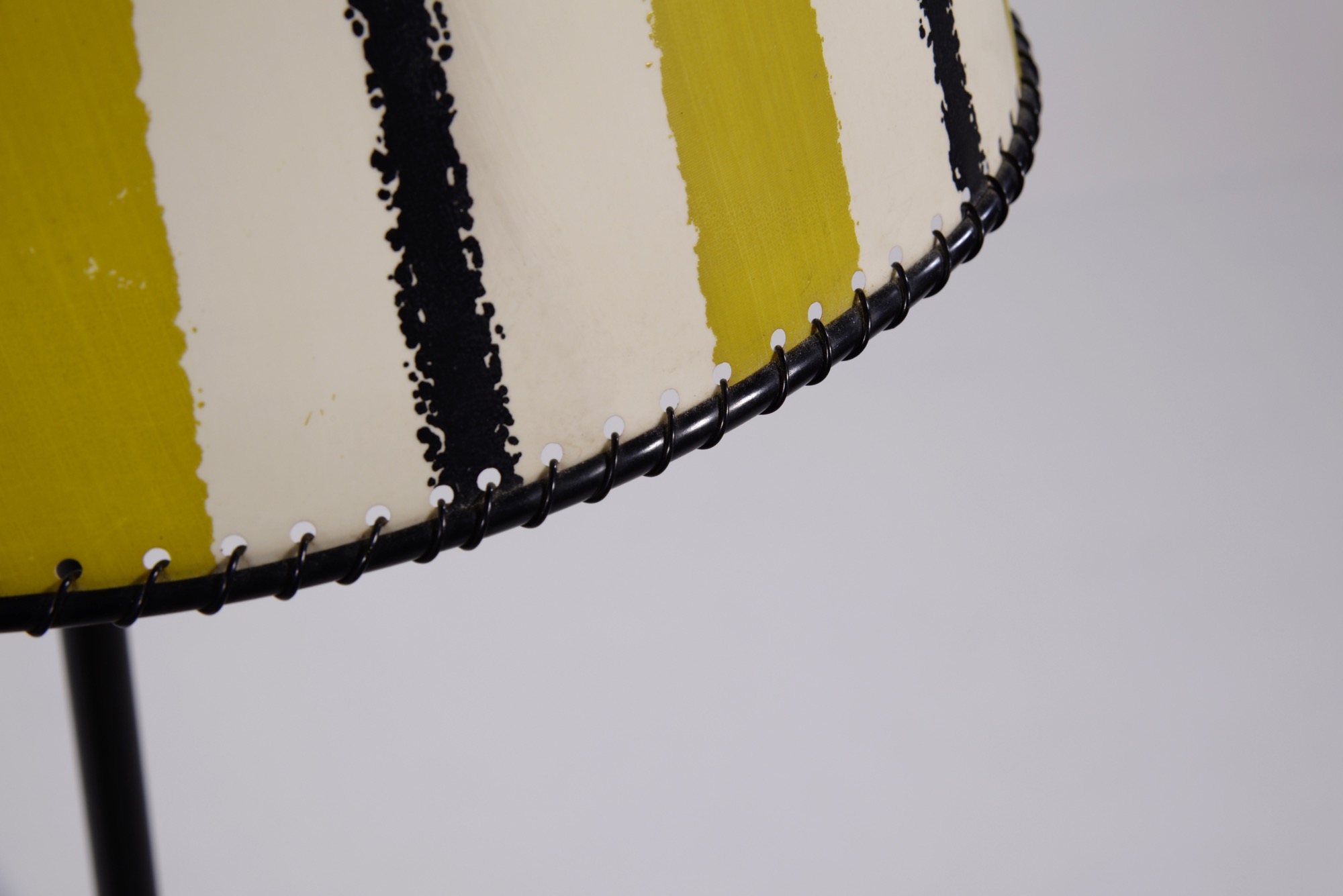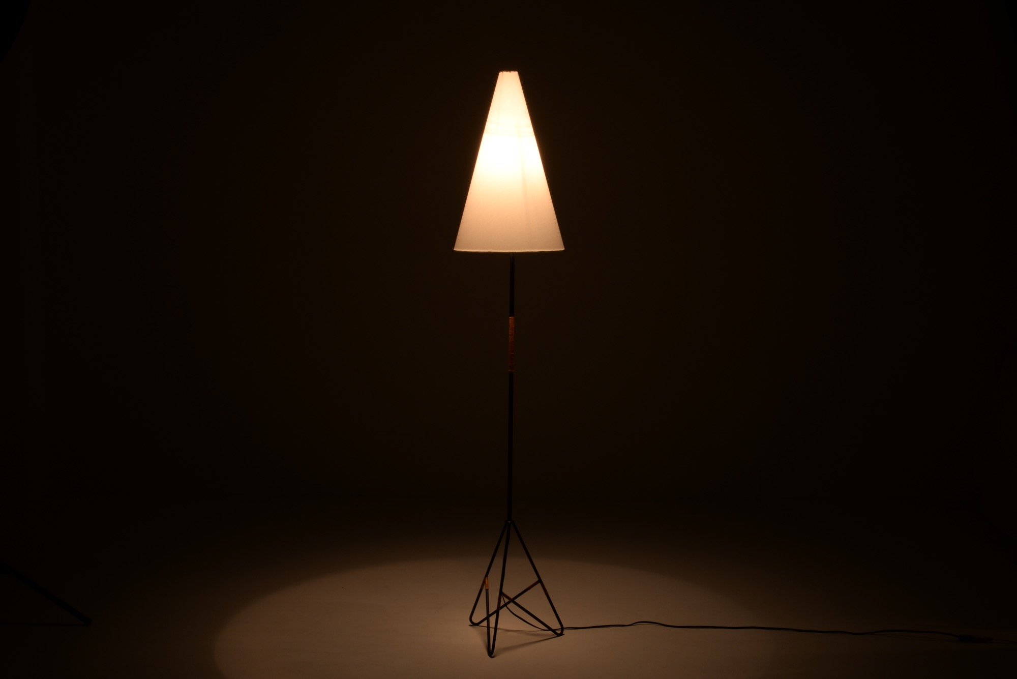 アイアンワークのフレームに籐をアクセントとした1950年代製の趣あるフロアランプです。シェードは当時のセルロイド製で、亀裂の補修がありますが、機能や、鑑賞上の美観は損ねておりません。新たに白色布張りのシェードを製作しましたのでこちらもお付けいたします。