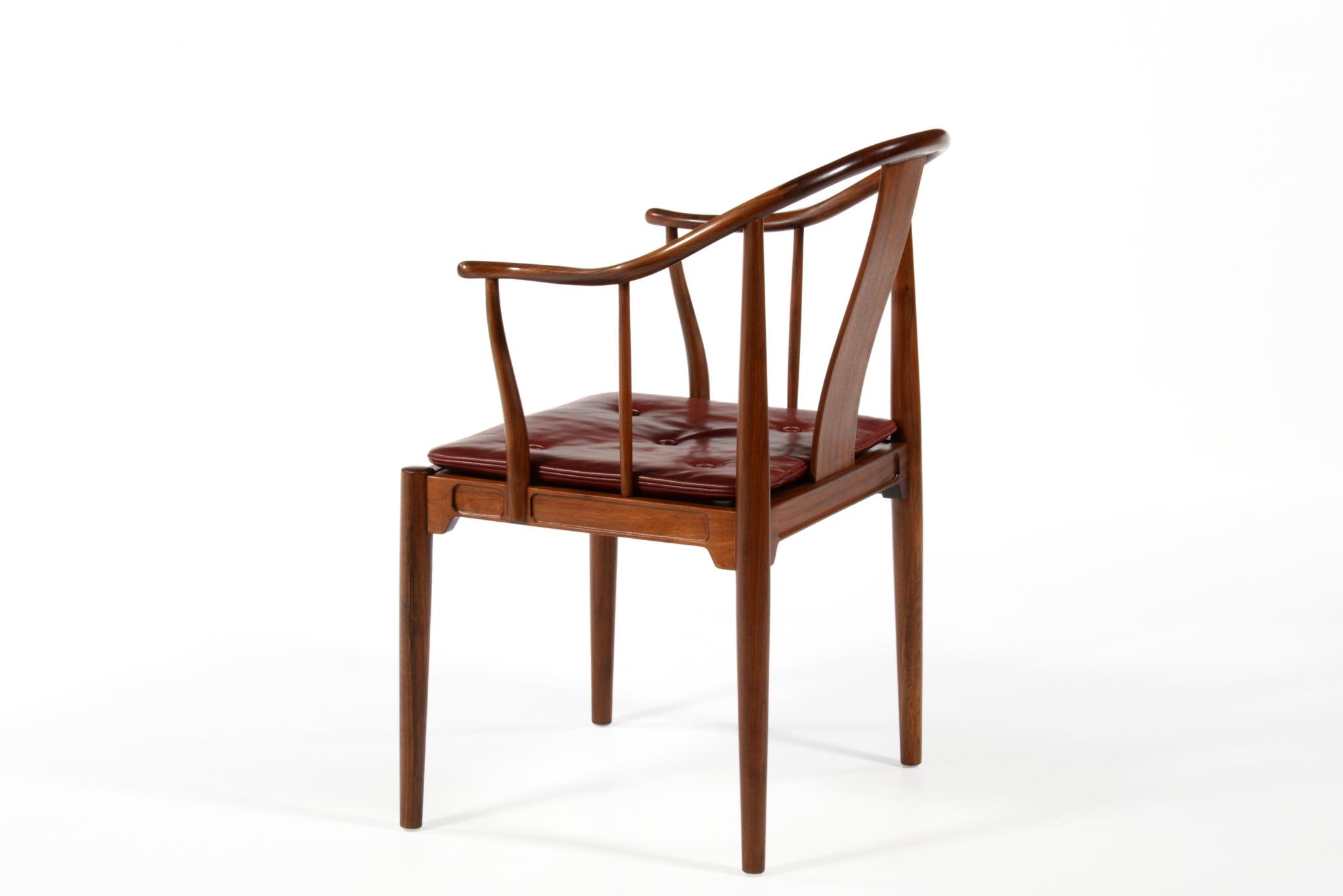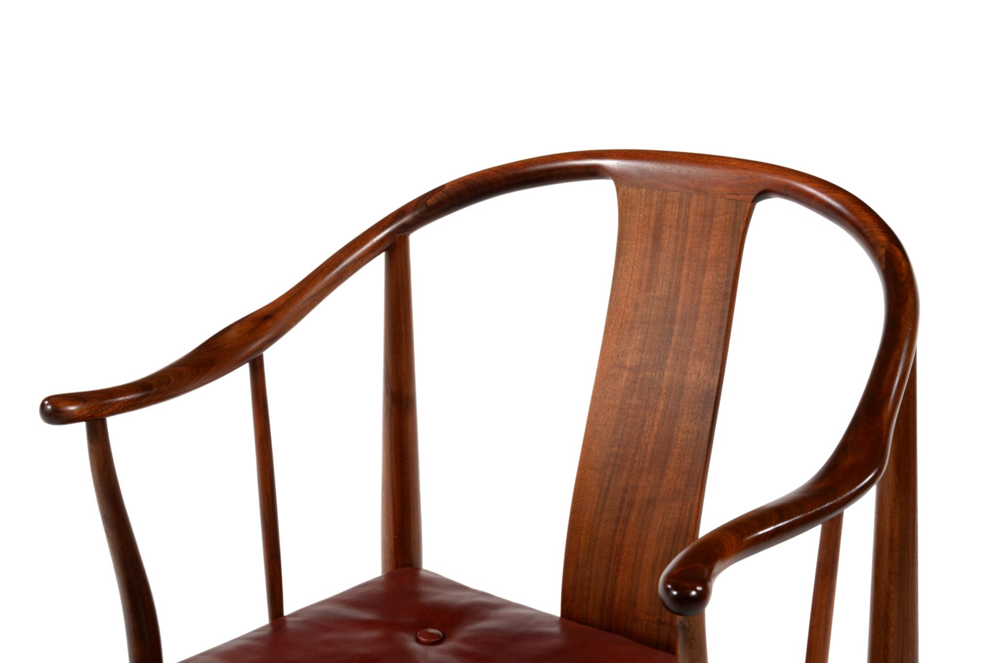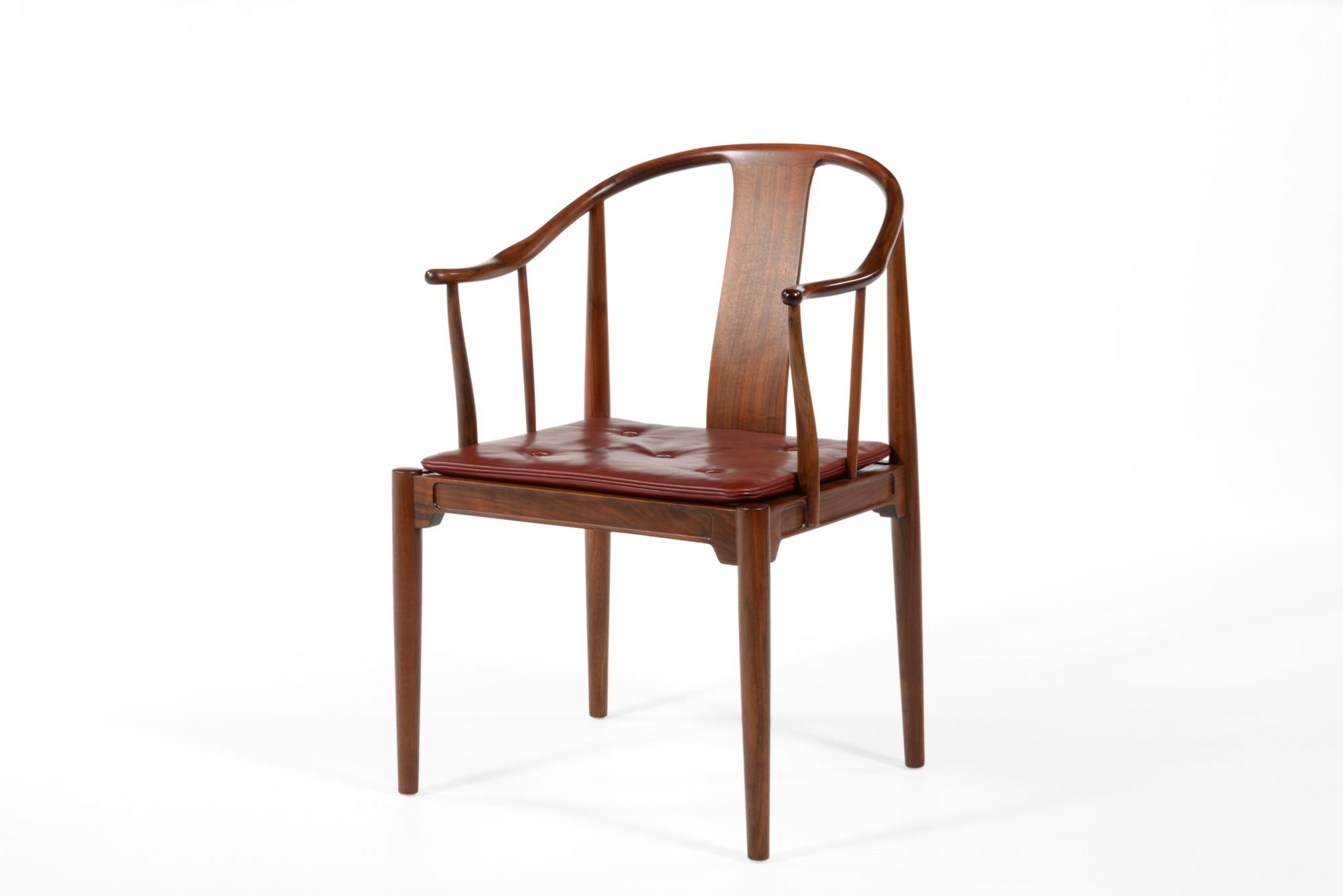 デンマークの家具デザイナー、ハンス・ウェグナーによる代表作のひとつ ”チャイナチェア” 同ロットで作られたペアとなり、1960~70年代頃に作られたものと思われます。コーカサス地方原産と思しきウォールナット材を用いたモデルは比較的希少なようで、シートは後にソーレンセンレザー社製の皮革”エレガンス”にて張られています。木取り、皮革、コンディション全て良好です。