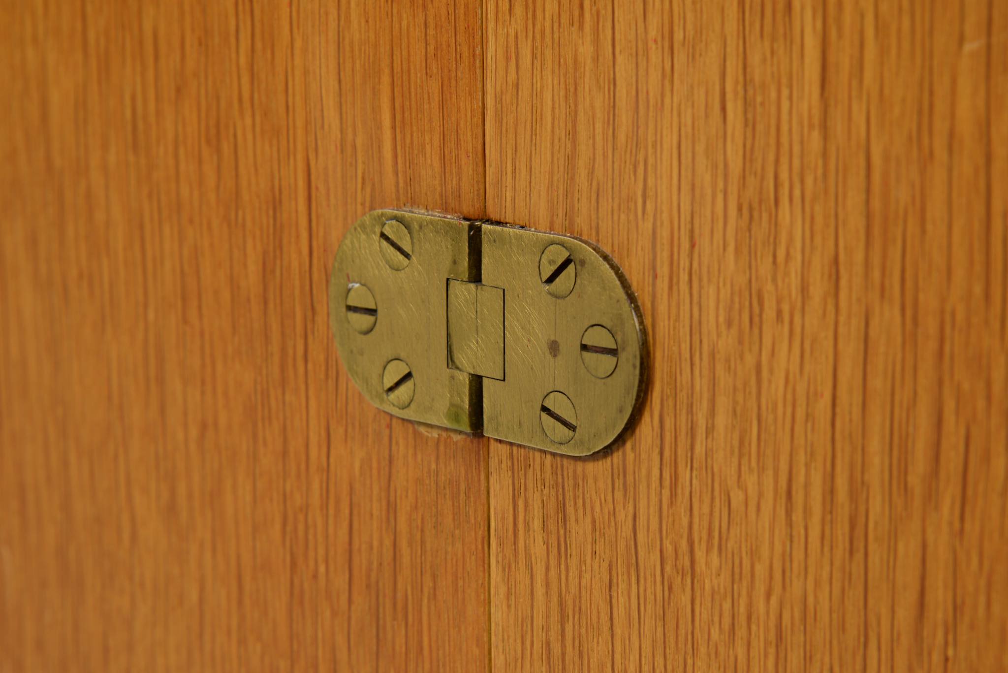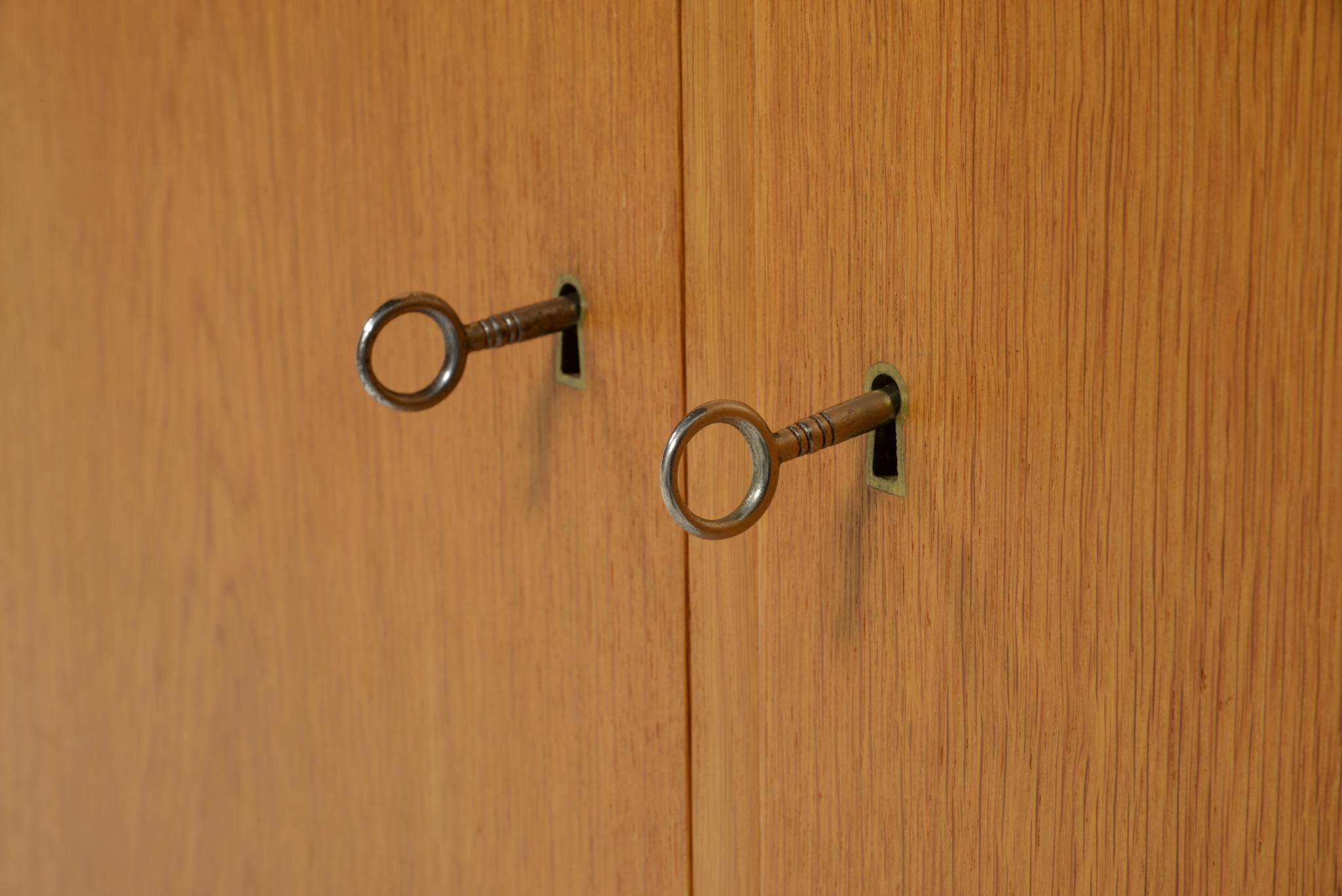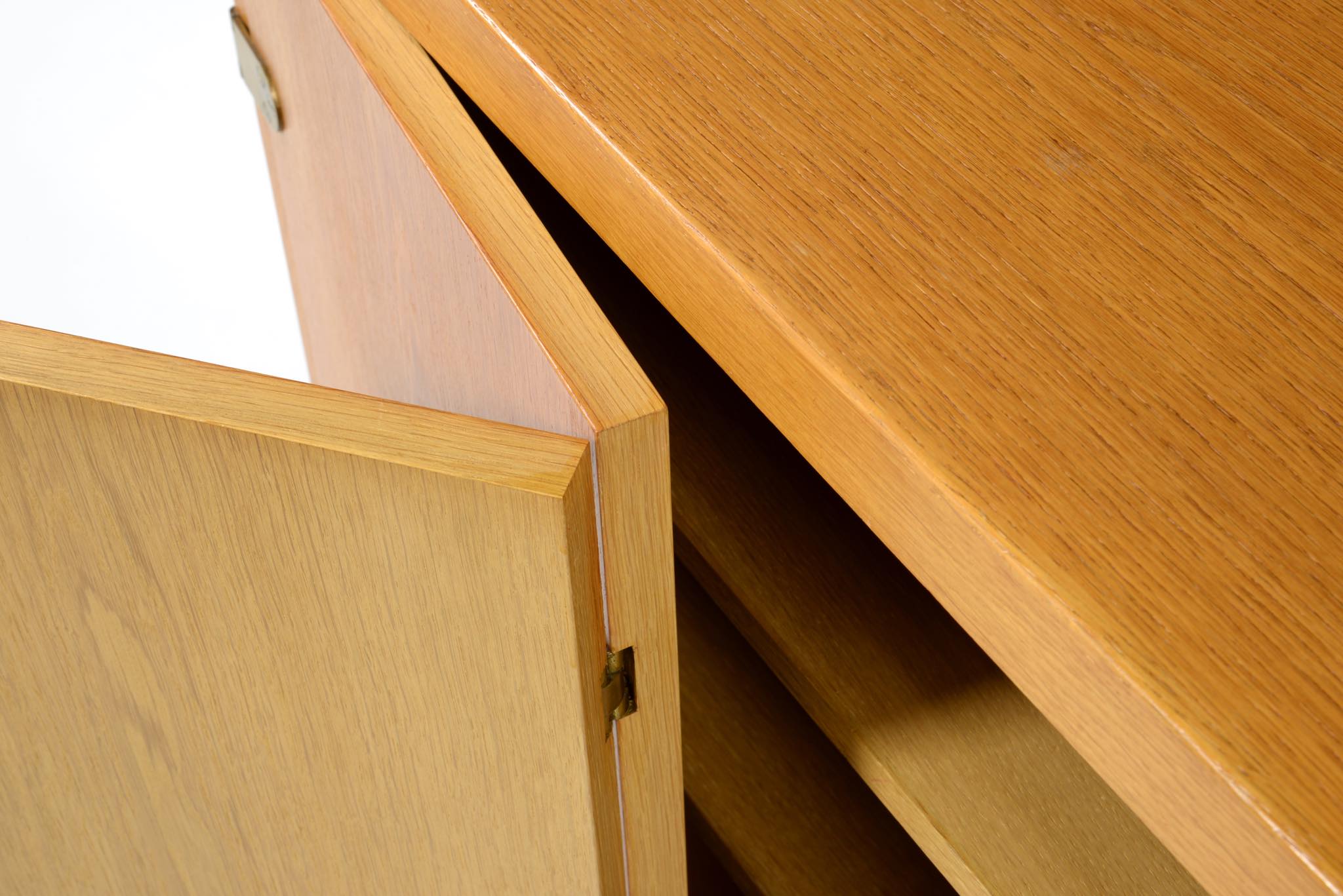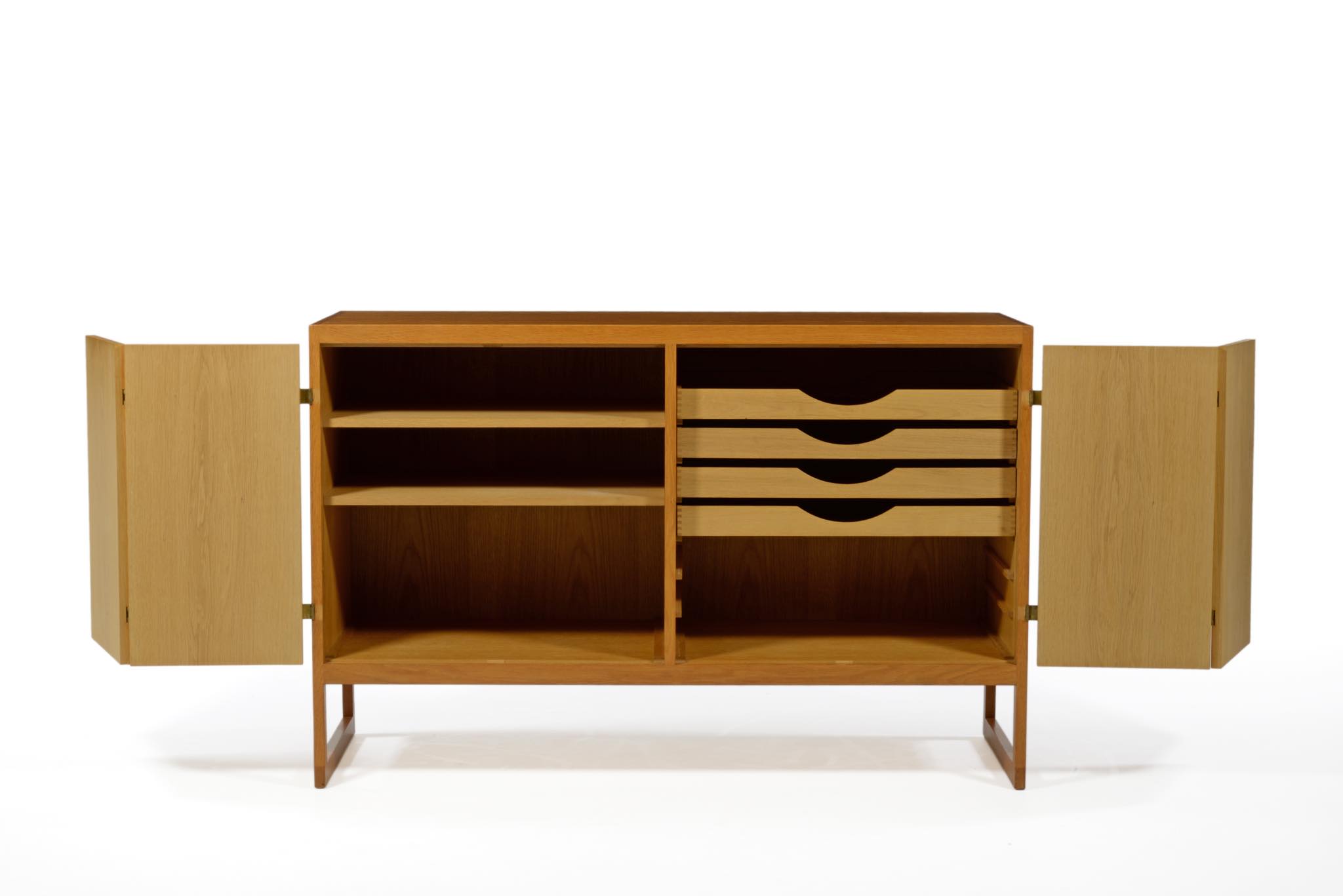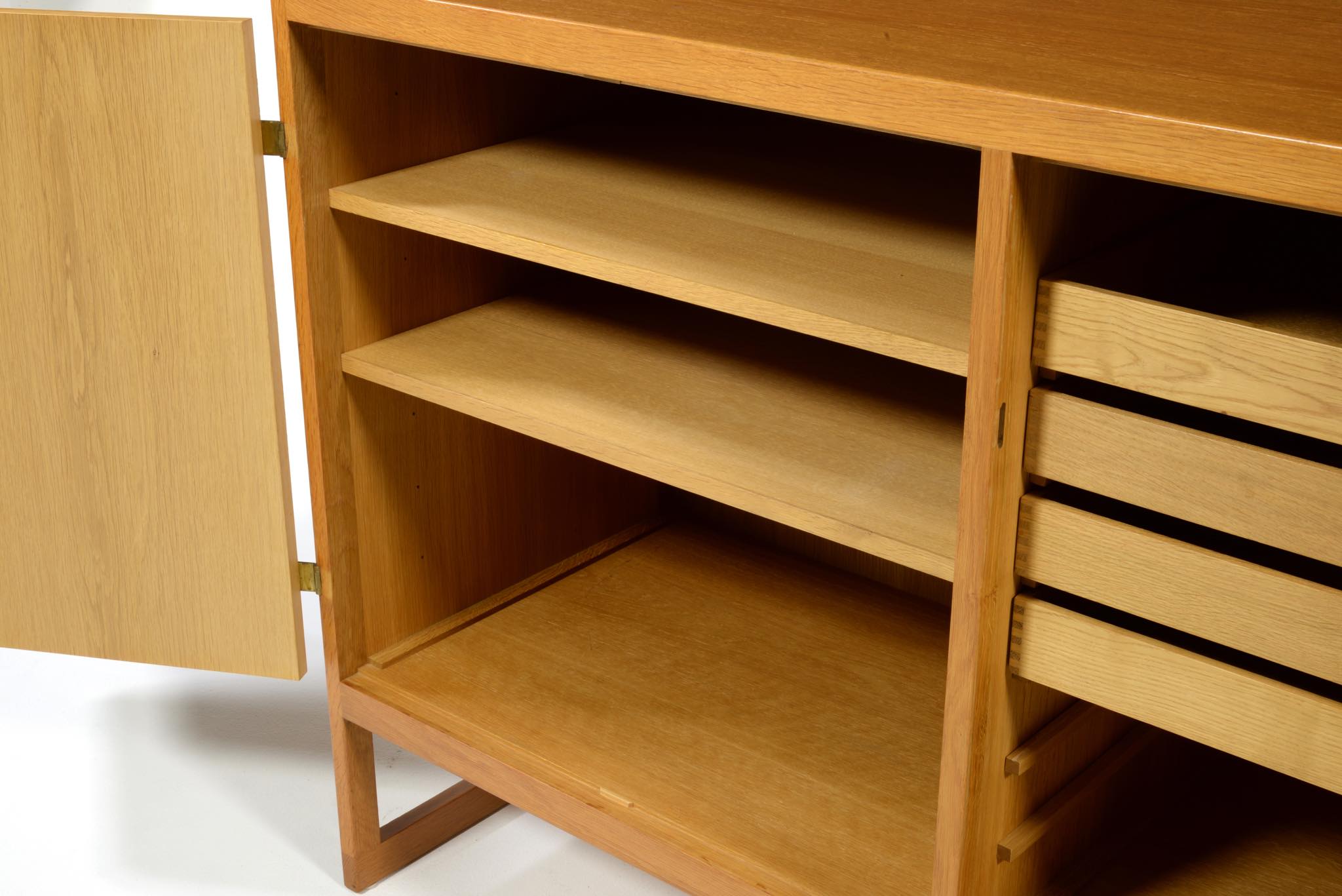 Børge Mogensen/ボーエ・ モーエンセンによる "BM57" サイドボードキャビネット、オーク材の仕様です。蝶番のついた折扉は使いやすく、扉を開く際に場所を取りません。背板は後年にオークの突き板が張られており、間仕切りとしての設置も可能です。全体に綺麗な状態です。