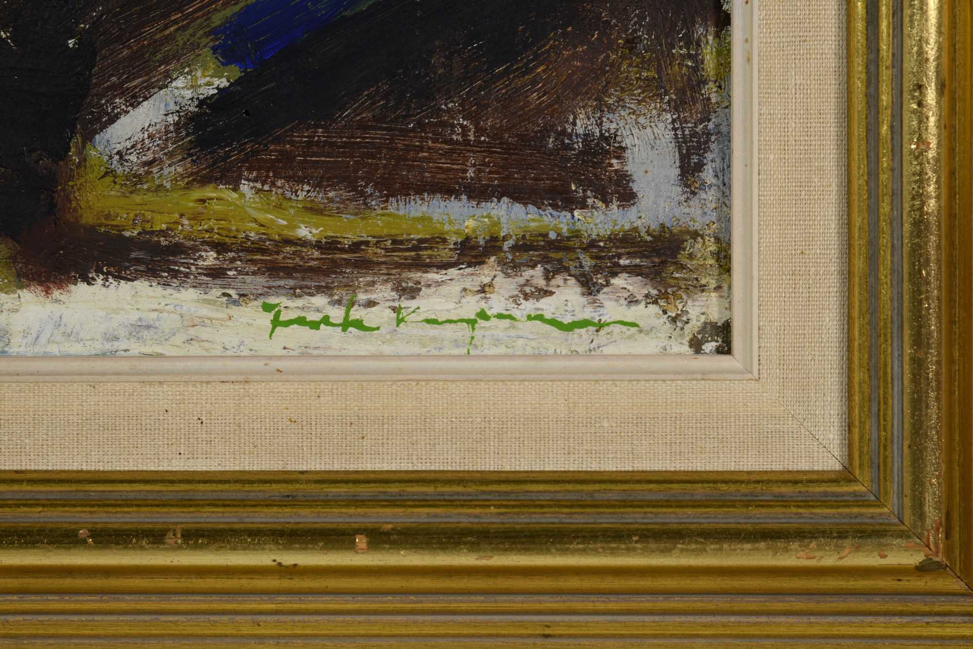 フェロー諸島の厳しい自然環境と対峙しながら生活する島民たちの家々や情景を、独自のタッチで描いた画家のジャック・カンプマンによる油彩作品です。フレームはオリジナルをそのまま使用しています。