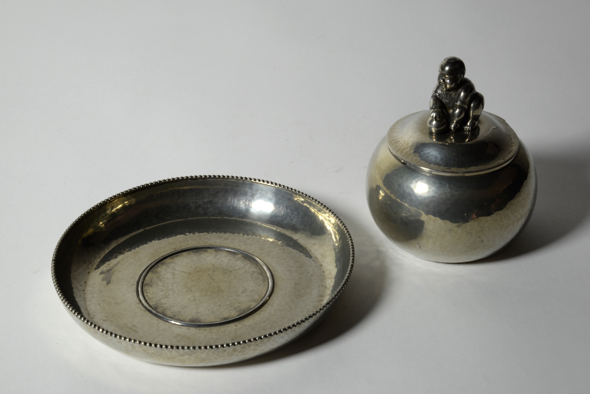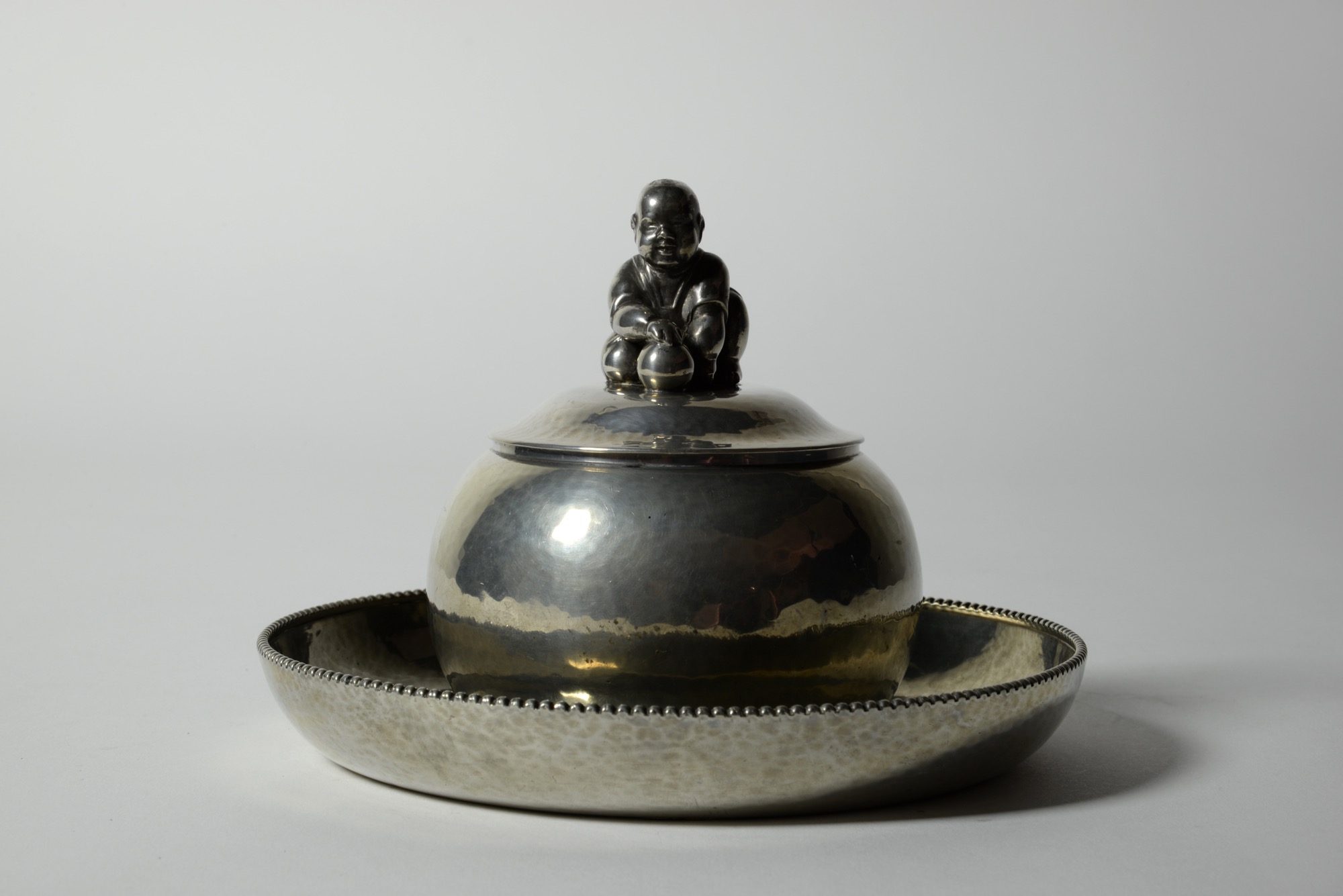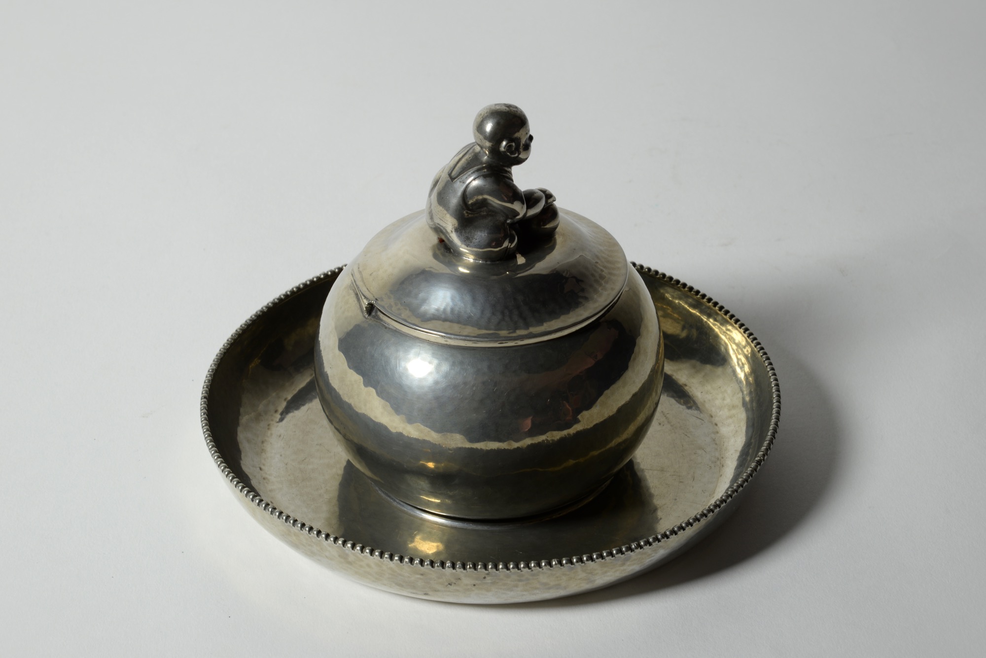 デンマークの金工作家、Just Andersen/ユスト・アナセンによる錫製の蓋物で、おそらくインク壺と思われます。球を転がす唐子のようなモチーフがトップに鎮座する姿はあまり類を見たことがありません。本体は鍛造による造形で、打ち出しの金槌痕が心地よく表面を覆います。古いタイプのホールマークが押されており、1918年の創業に近い頃の作品ではないかと思われます。壺の底にインク痕が残りますが、目立ったダメージはありません。