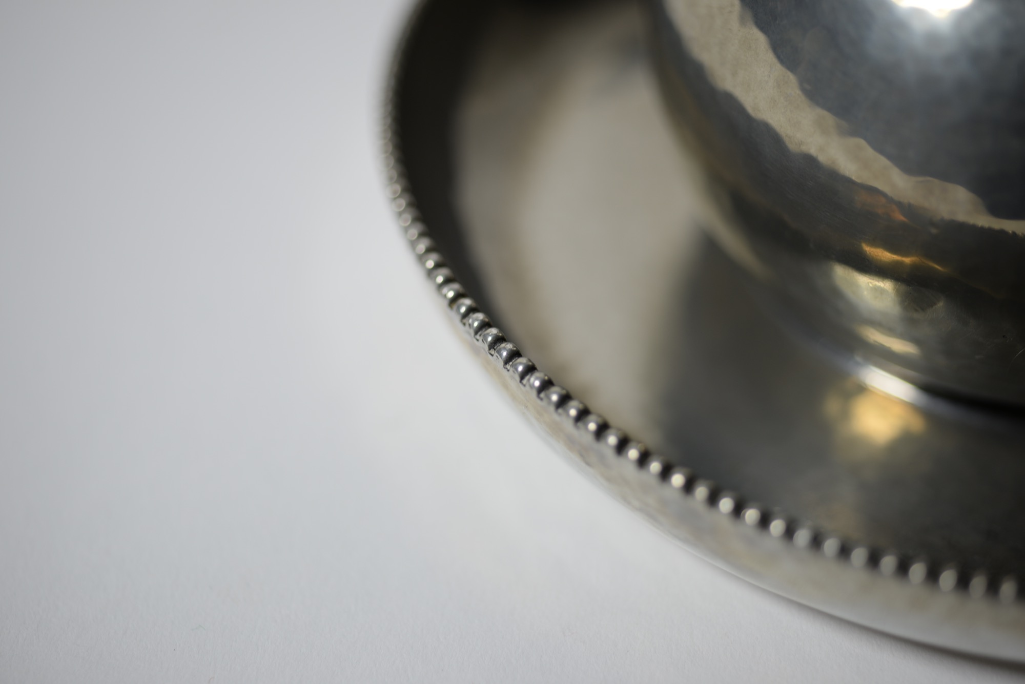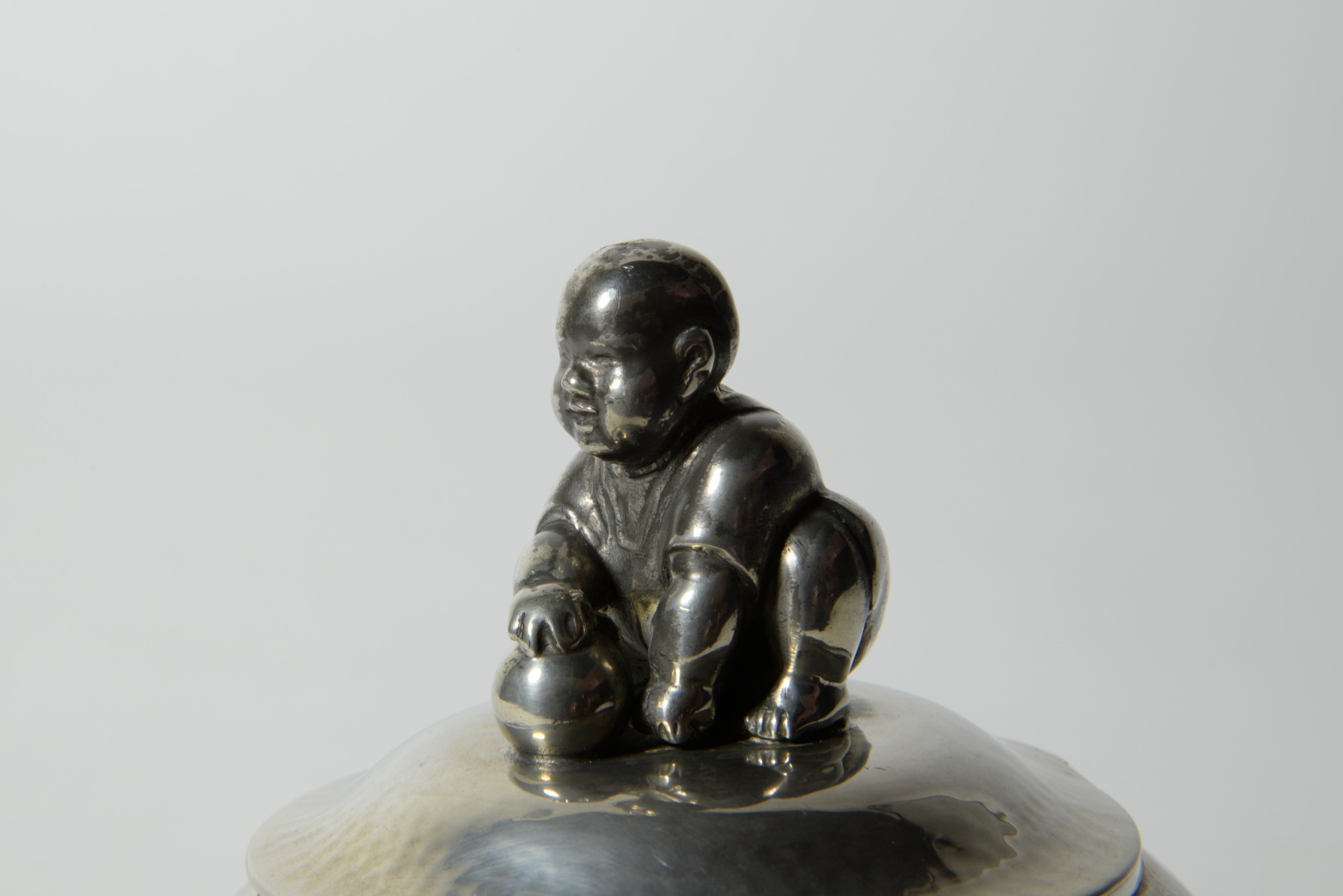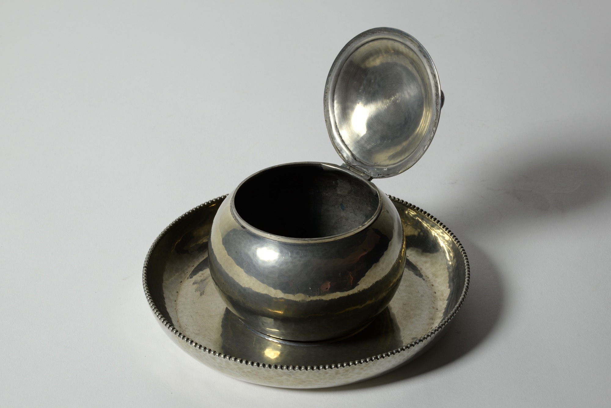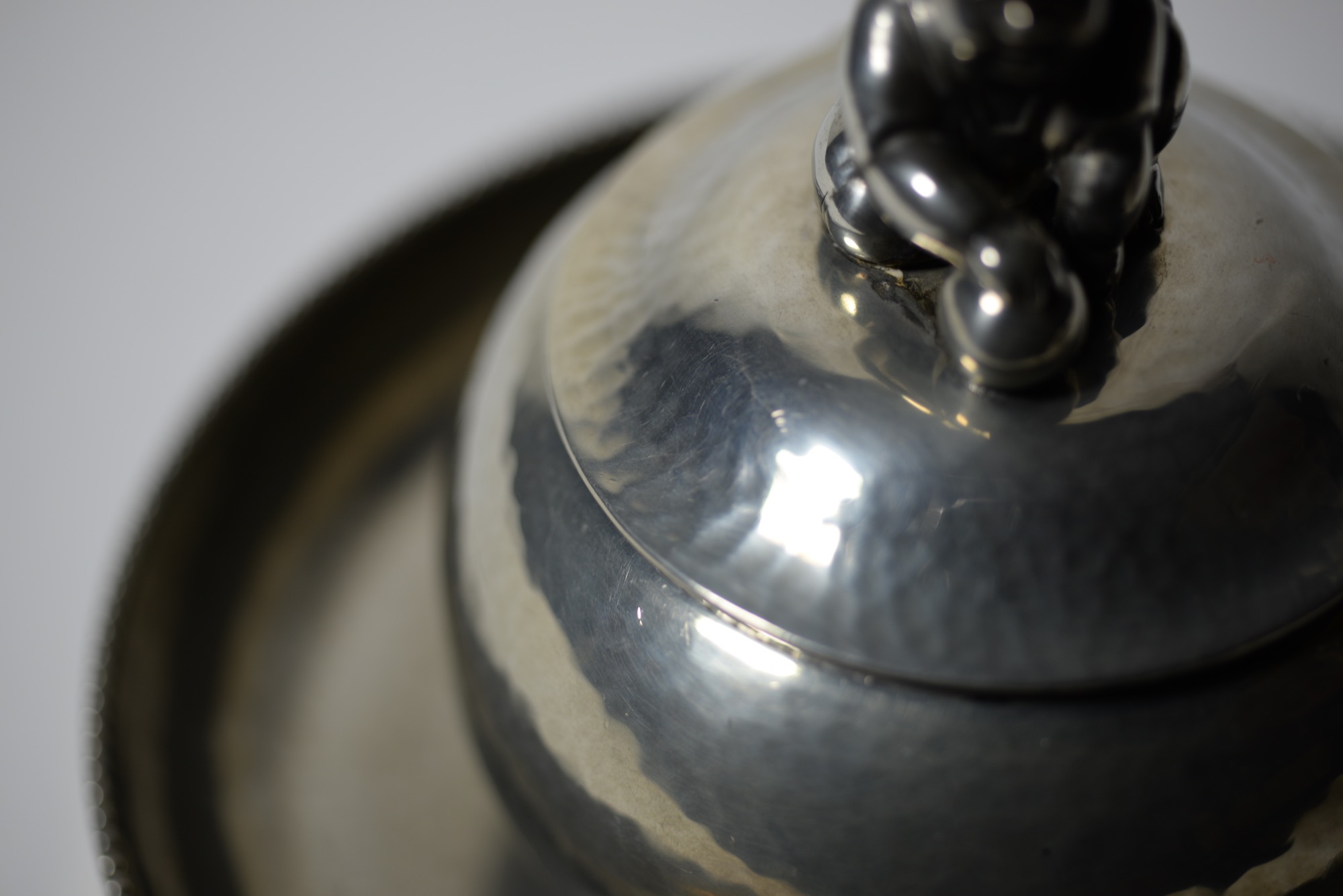 デンマークの金工作家、Just Andersen/ユスト・アナセンによる錫製の蓋物で、おそらくインク壺と思われます。球を転がす唐子のようなモチーフがトップに鎮座する姿はあまり類を見たことがありません。本体は鍛造による造形で、打ち出しの金槌痕が心地よく表面を覆います。古いタイプのホールマークが押されており、1918年の創業に近い頃の作品ではないかと思われます。壺の底にインク痕が残りますが、目立ったダメージはありません。