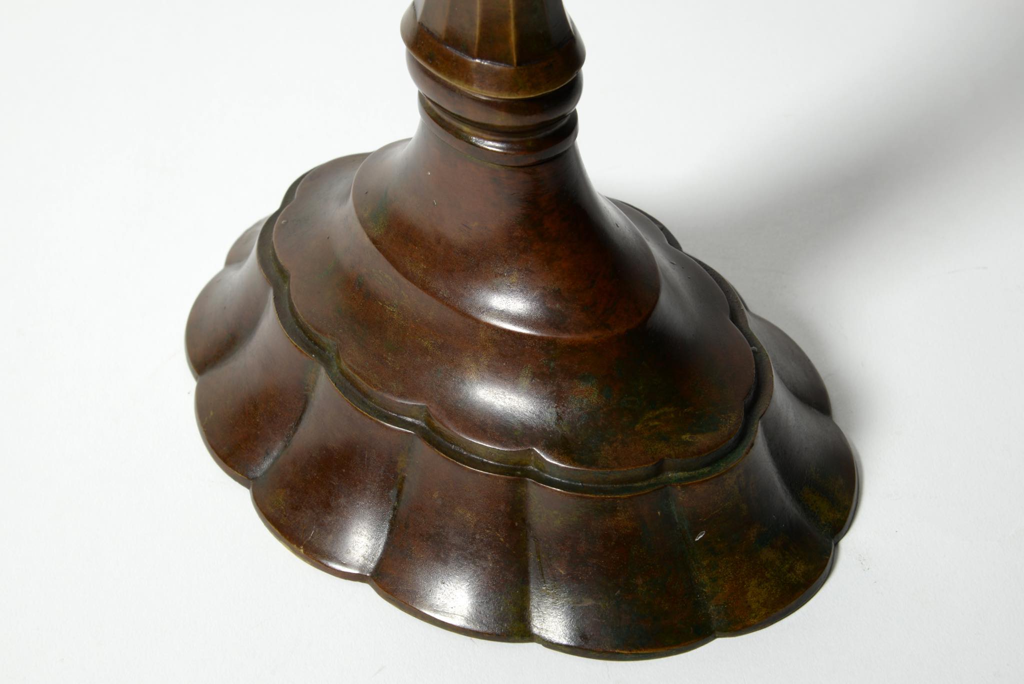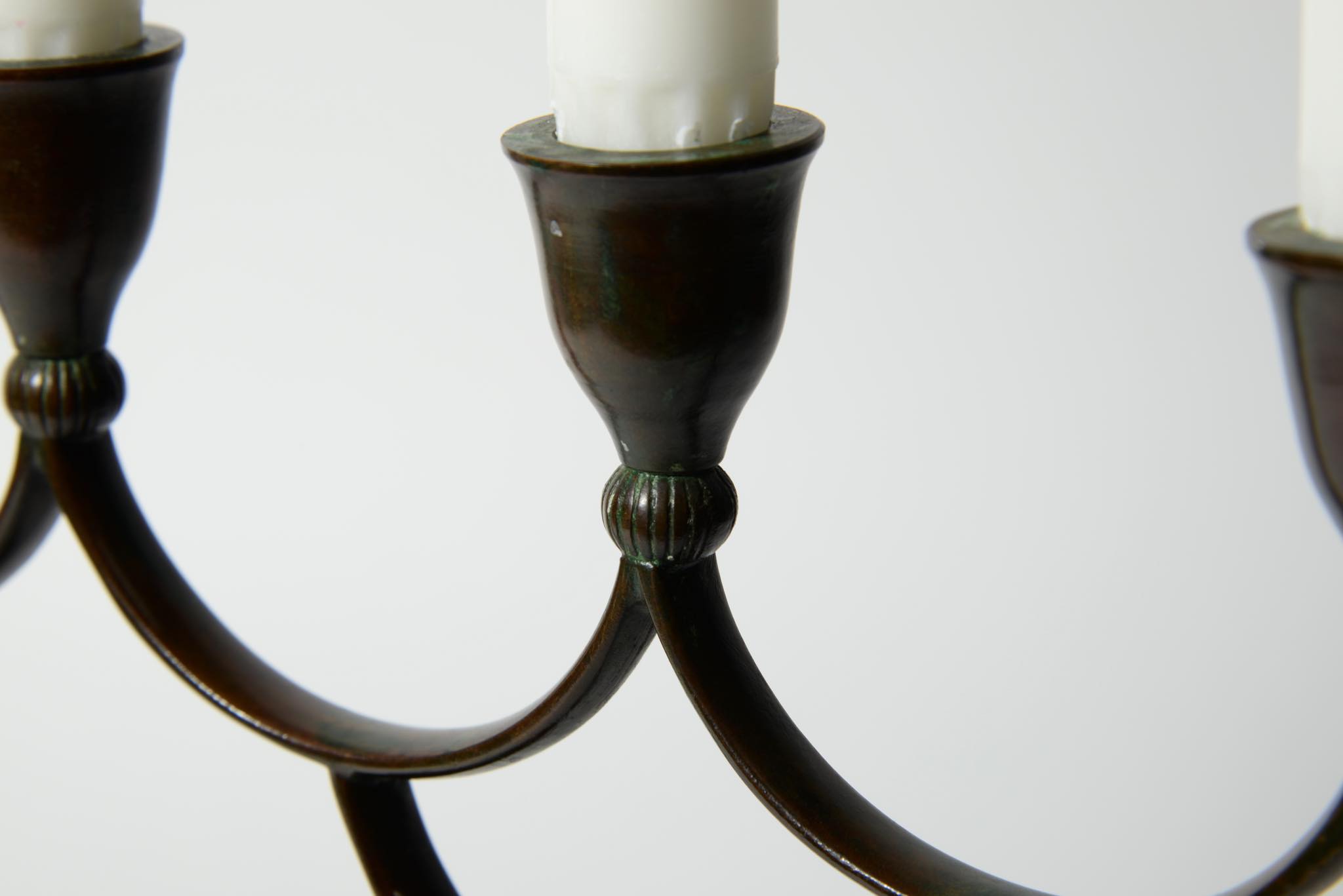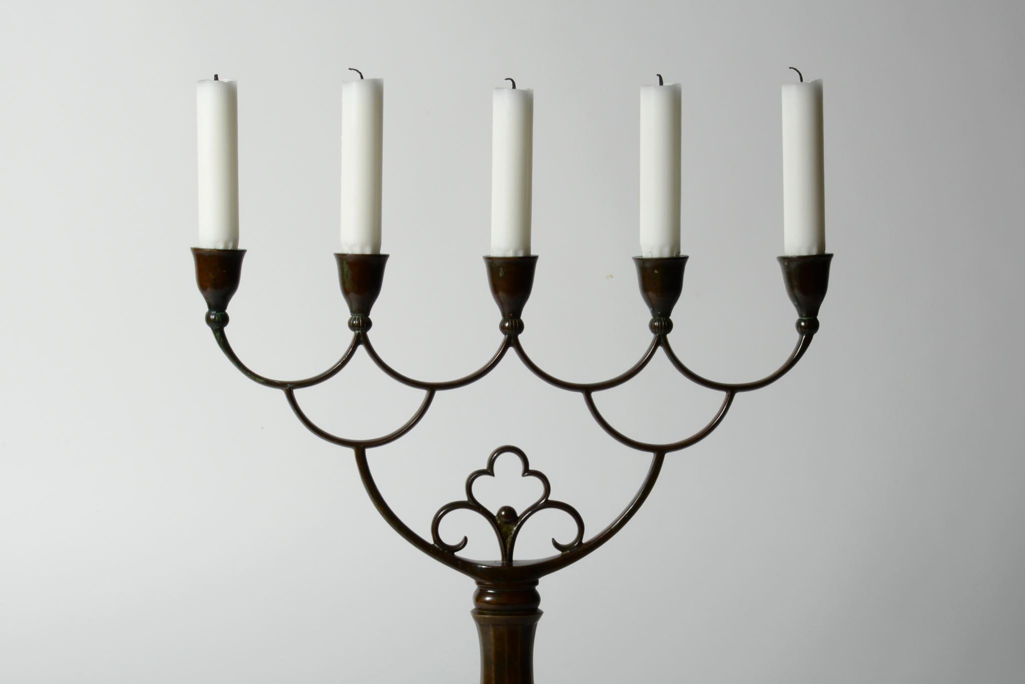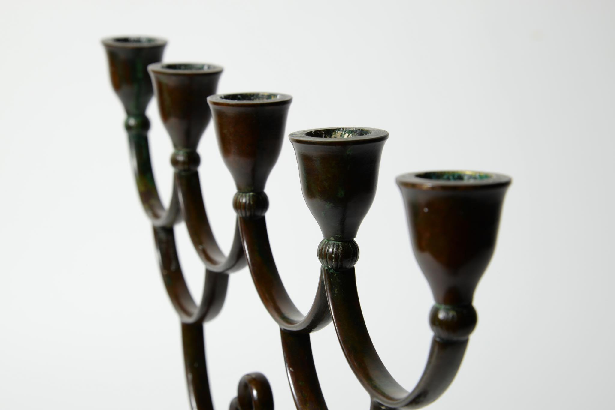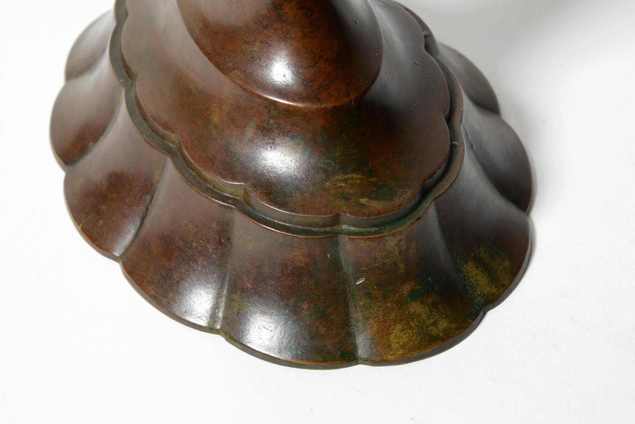 デンマークの金工家、ユスト・アナセンによるブロンズ造のキャンデラブラ、1920〜30年代頃に作られたものと思われます。ユスト・アナセン特有のペインテッドブロンズは100年近い経年により鈍く奥ゆかしい輝きを放っています。素材が柔らかいためか「曲がり」が生じていると思われ、左右の高さが僅かに異なります。また、台座辺りに古い小傷が見られますが、いずれも鑑賞の妨げとはならない程度でしょう。IKEAの蝋燭がジャストサイズで安定し、黒煙も出難く炎は安定しています。火の扱いにはくれぐれもご用心ください。