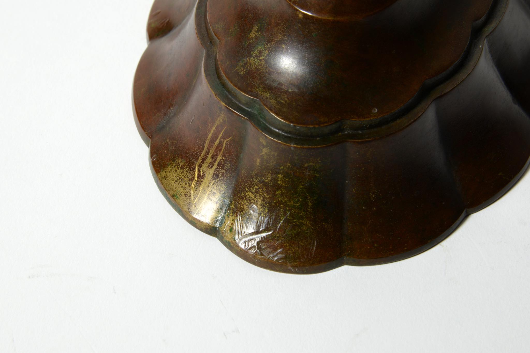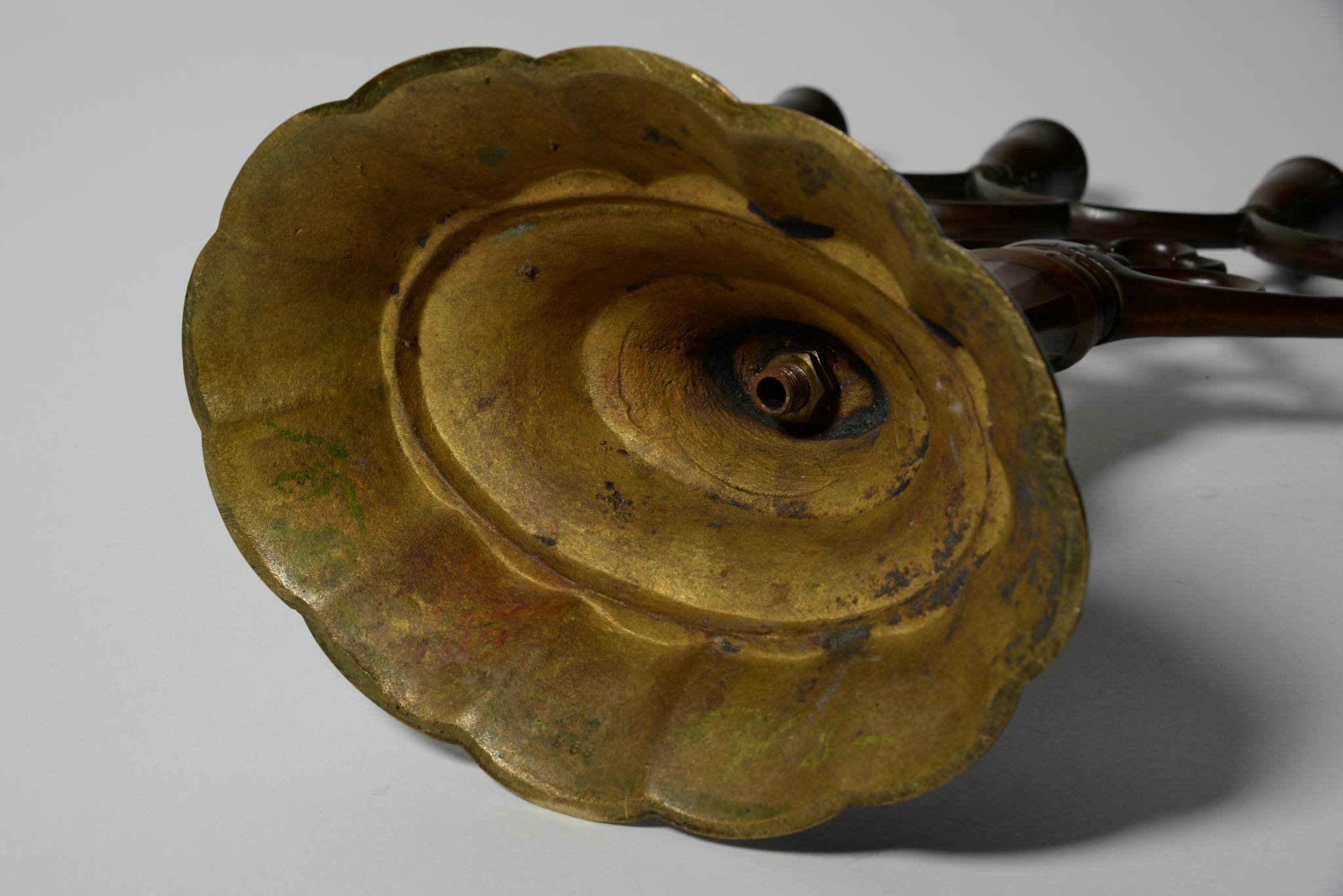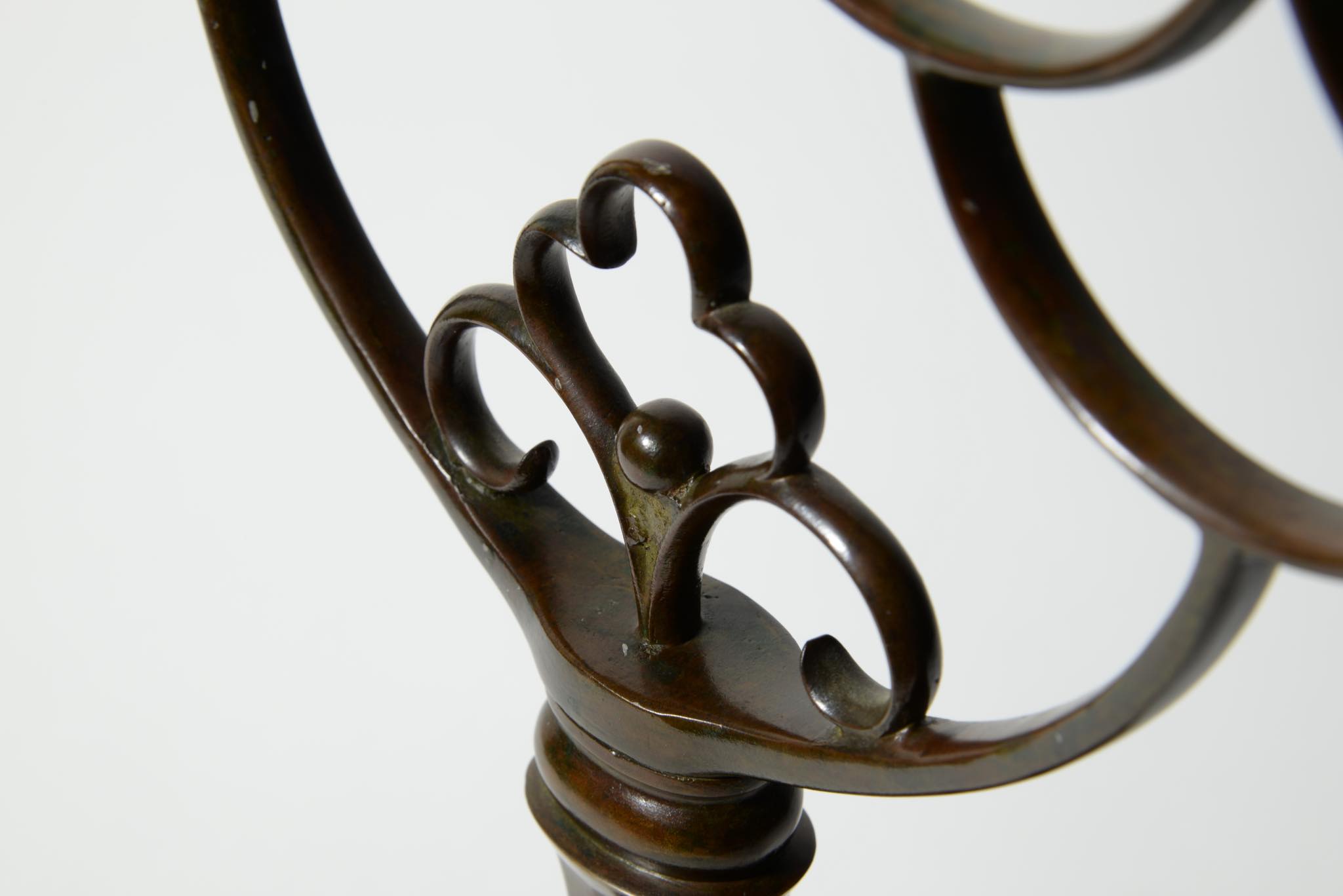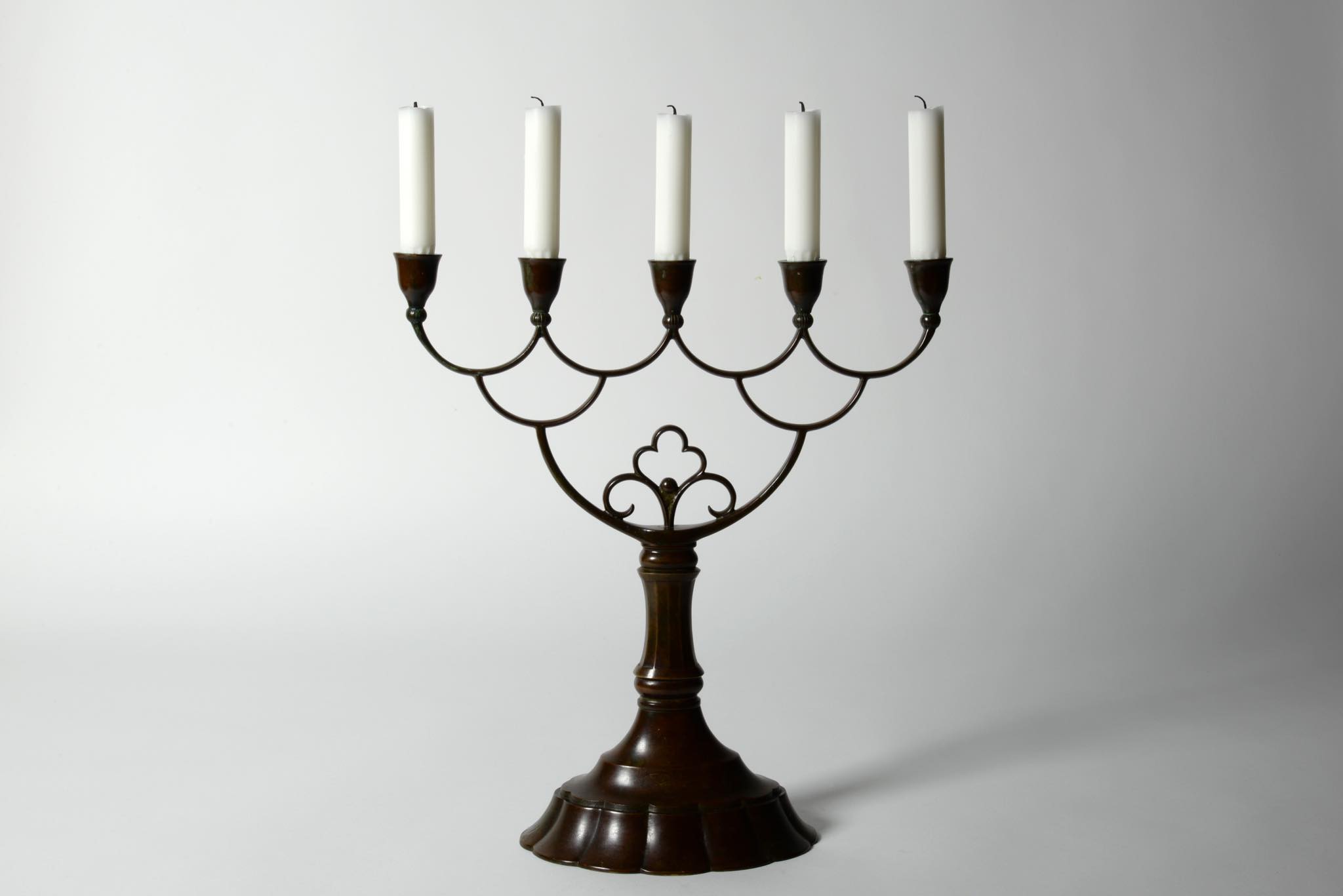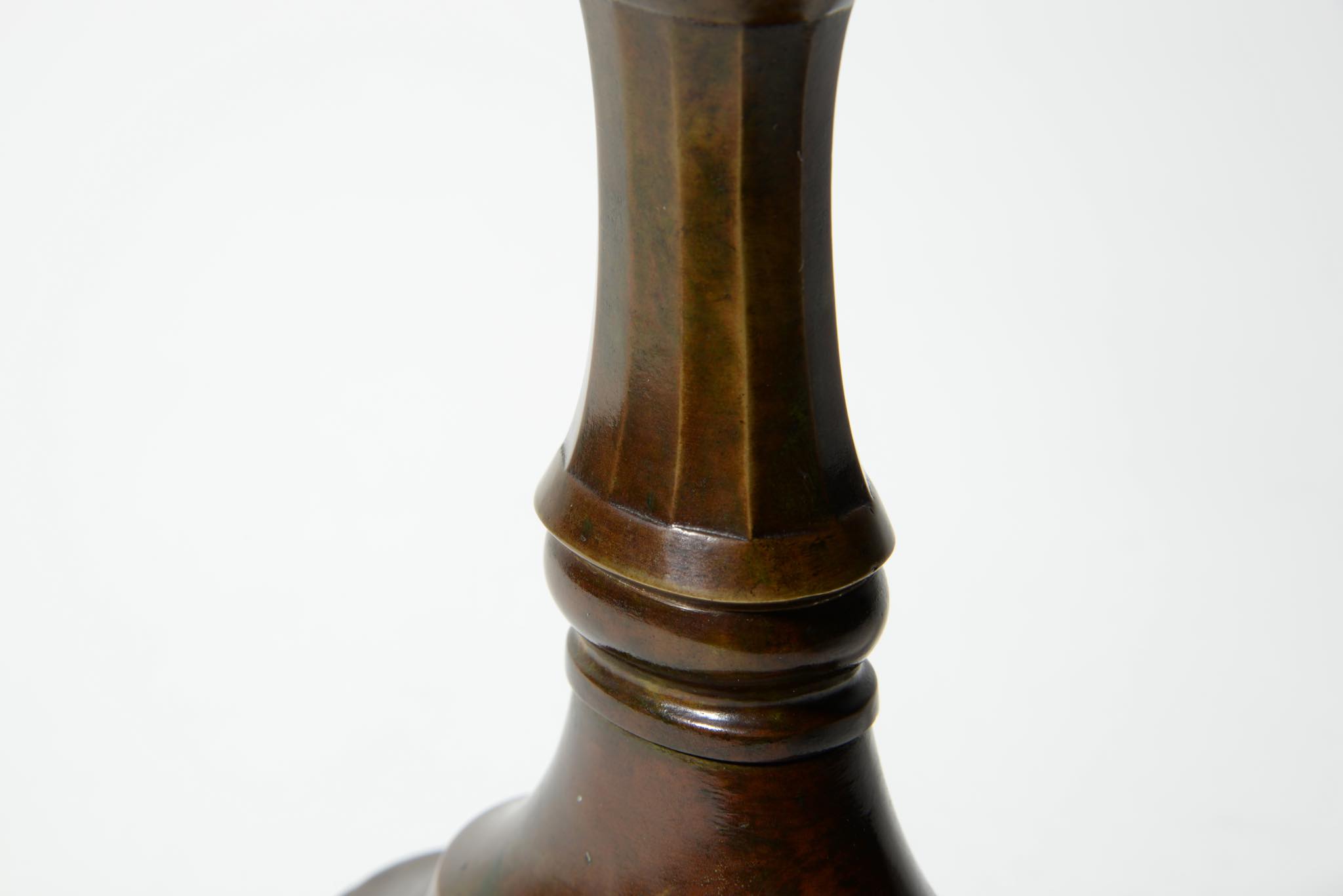 デンマークの金工家、ユスト・アナセンによるブロンズ造のキャンデラブラ、1920〜30年代頃に作られたものと思われます。ユスト・アナセン特有のペインテッドブロンズは100年近い経年により鈍く奥ゆかしい輝きを放っています。素材が柔らかいためか「曲がり」が生じていると思われ、左右の高さが僅かに異なります。また、台座辺りに古い小傷が見られますが、いずれも鑑賞の妨げとはならない程度でしょう。IKEAの蝋燭がジャストサイズで安定し、黒煙も出難く炎は安定しています。火の扱いにはくれぐれもご用心ください。