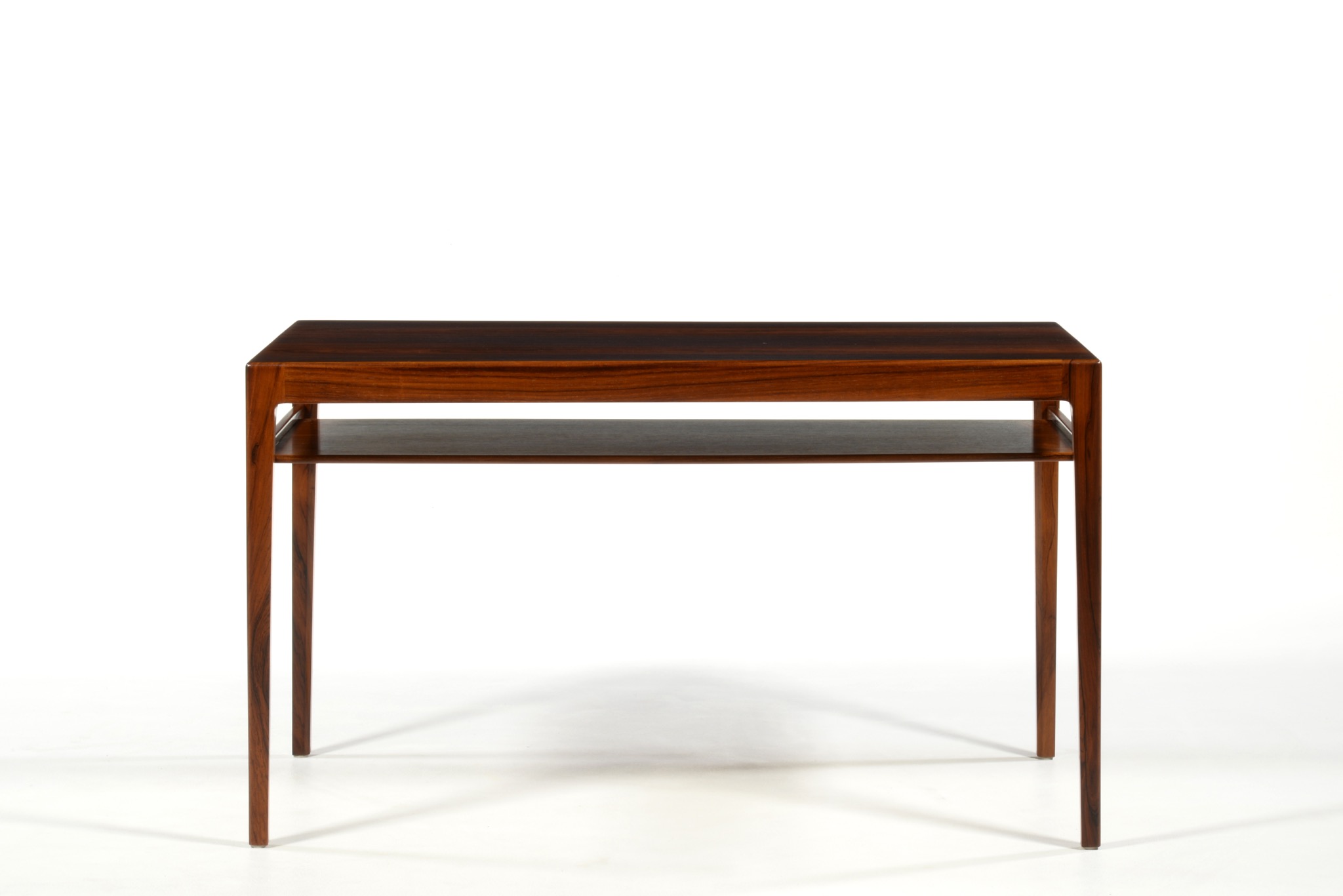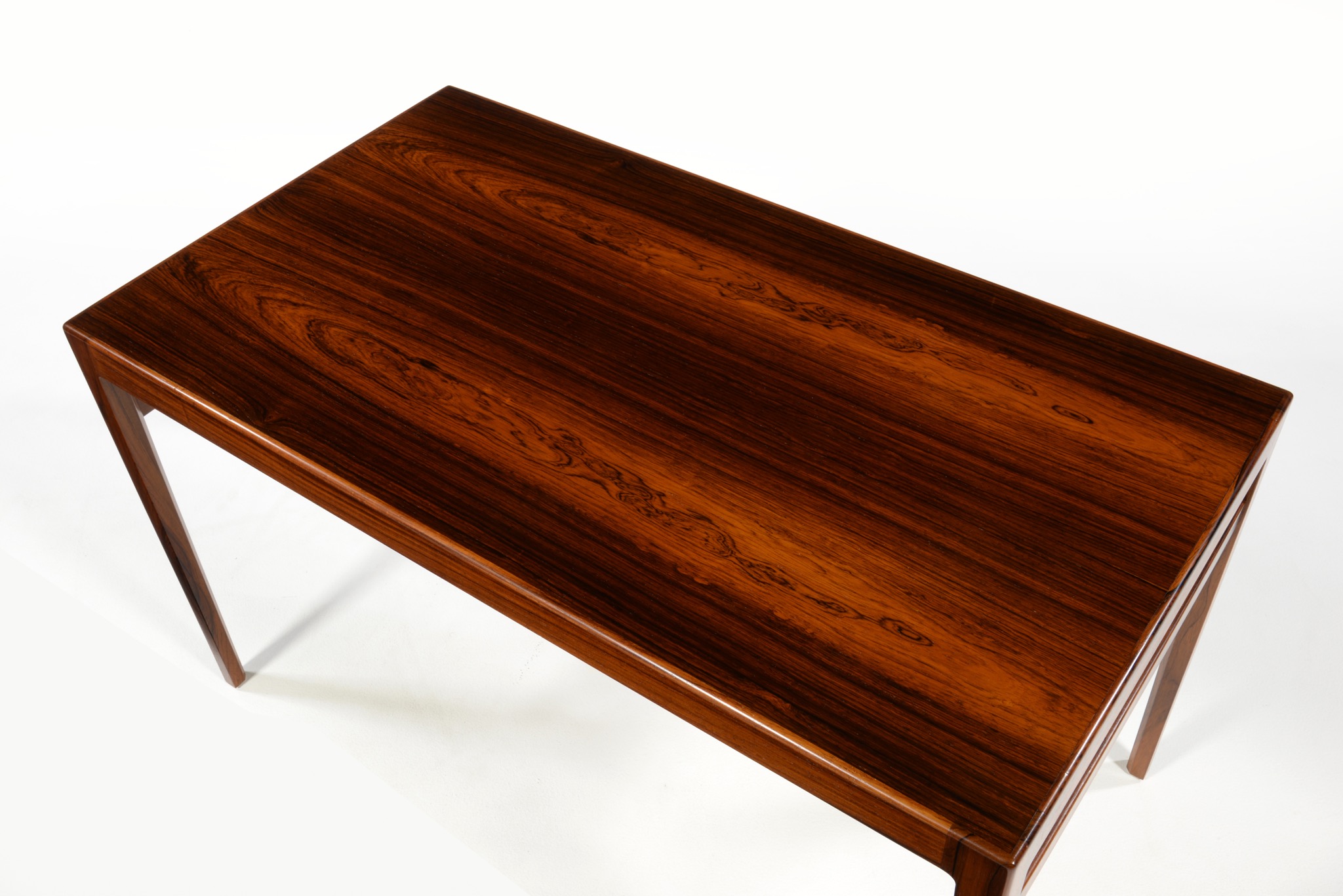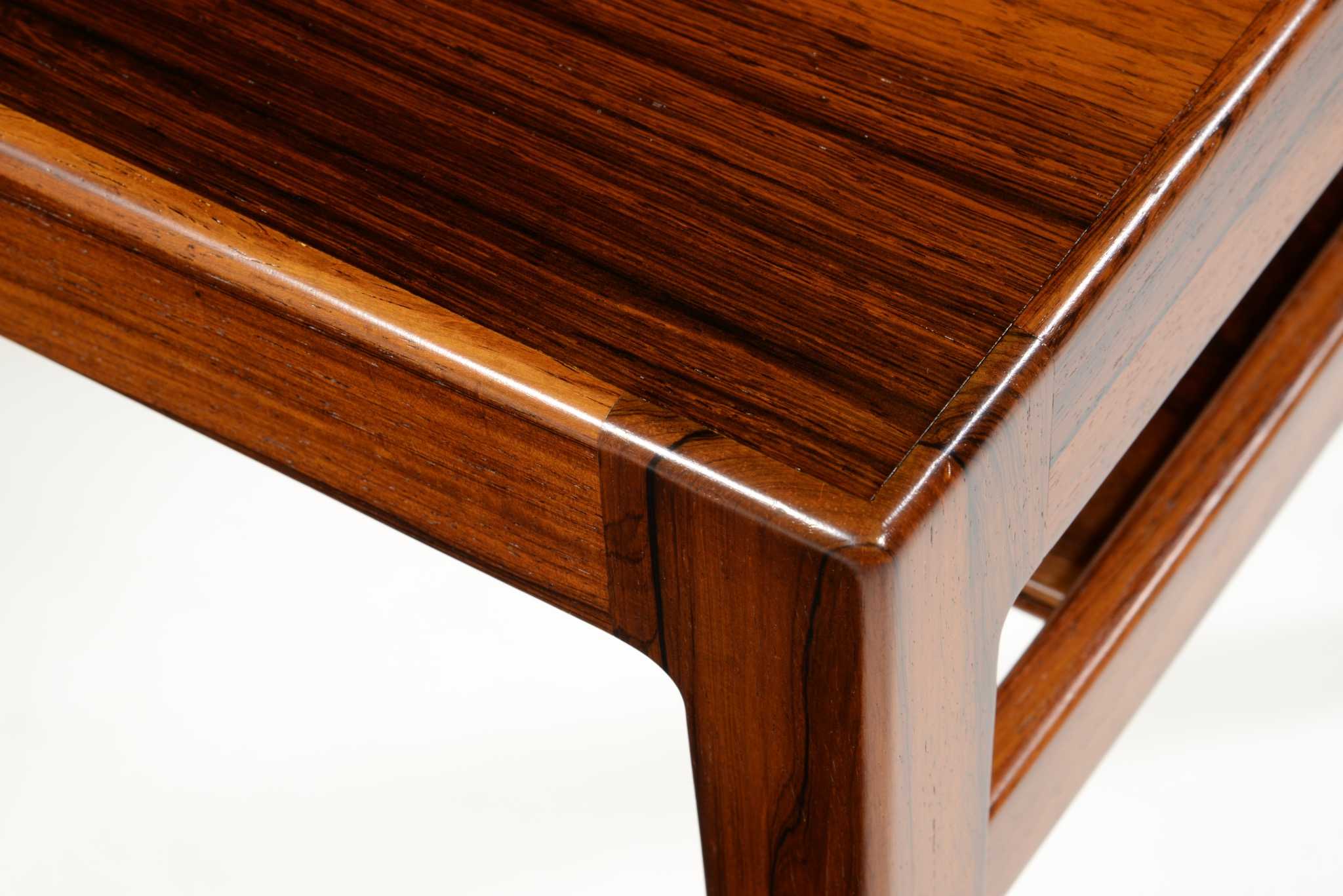 良質な家具を手がける工房として知られる、ポントピダンによるコーヒーテーブルです。1950年代後半頃に作られたものでしょう。ブラジリアンローズウッドと思しき良質な材が用いられており、整った木目文様が現れています。コンディションは良好です。