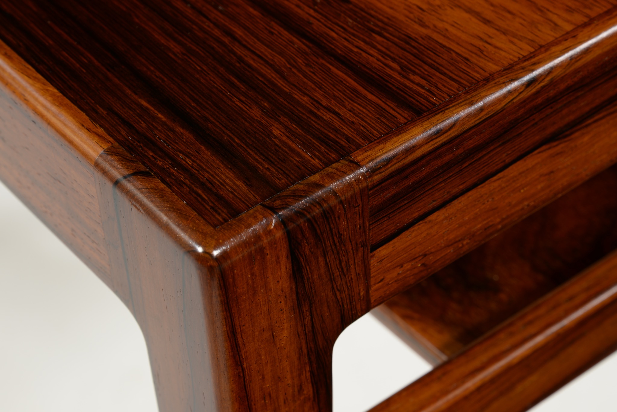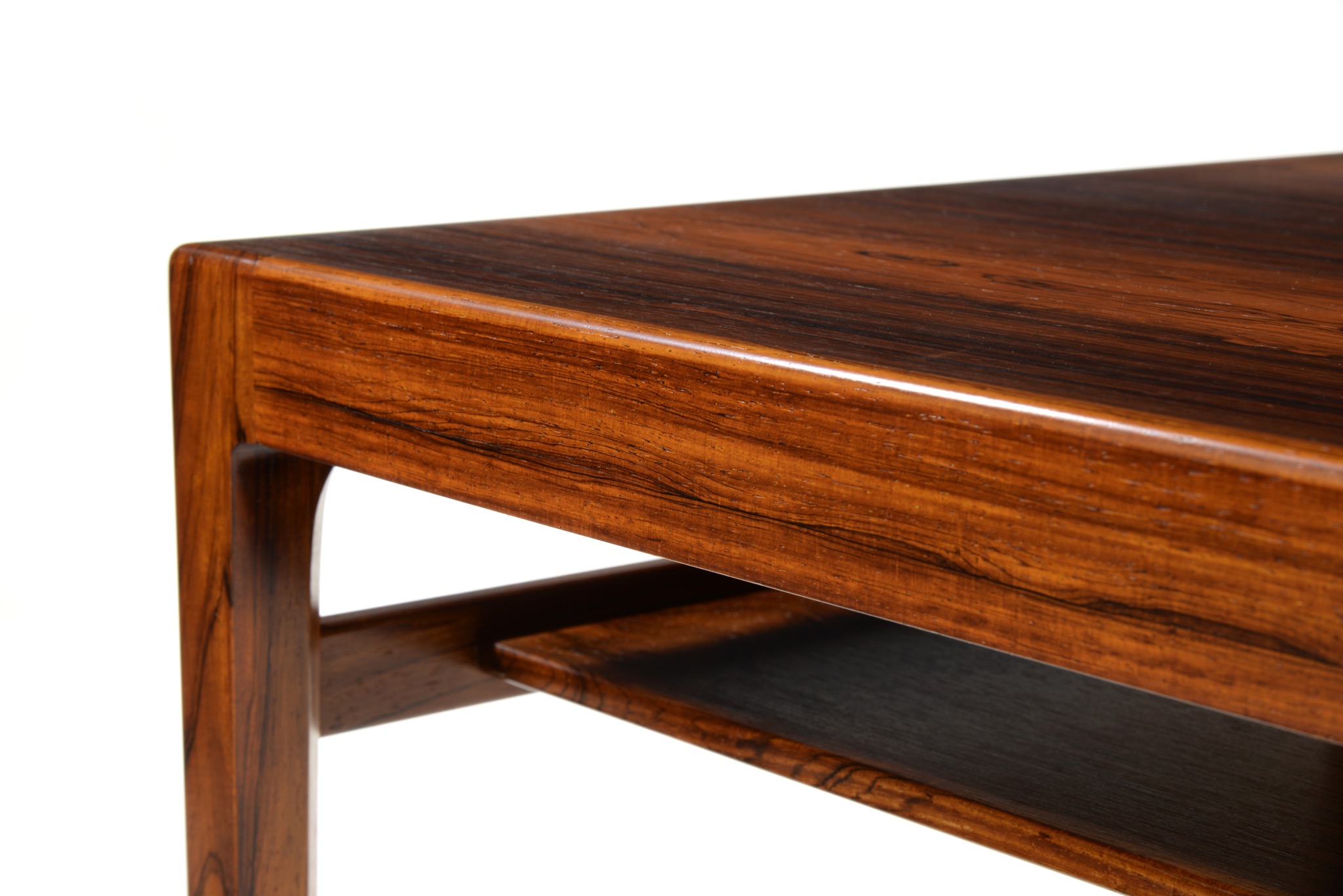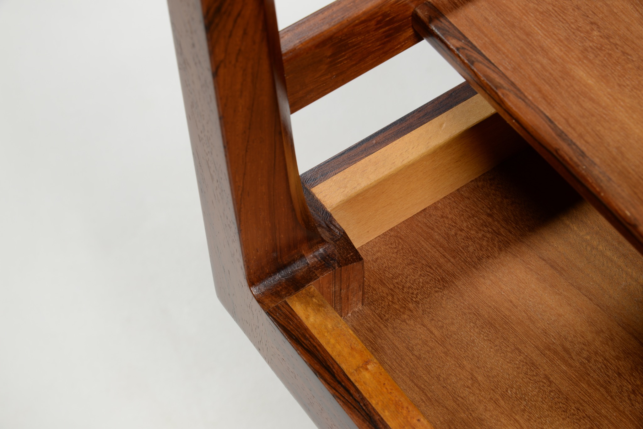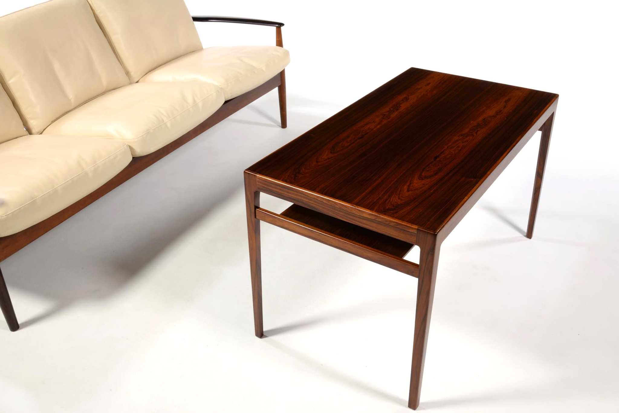 良質な家具を手がける工房として知られる、ポントピダンによるコーヒーテーブルです。1950年代後半頃に作られたものでしょう。ブラジリアンローズウッドと思しき良質な材が用いられており、整った木目文様が現れています。コンディションは良好です。