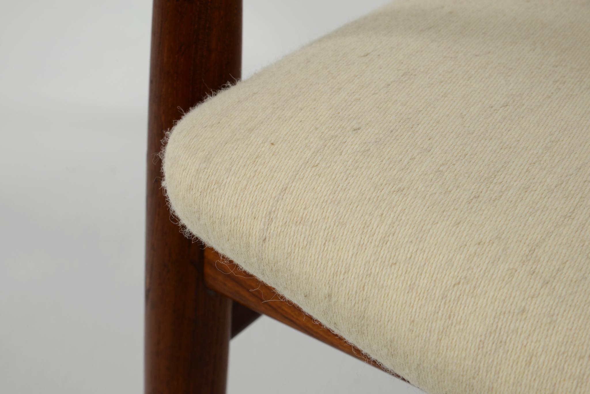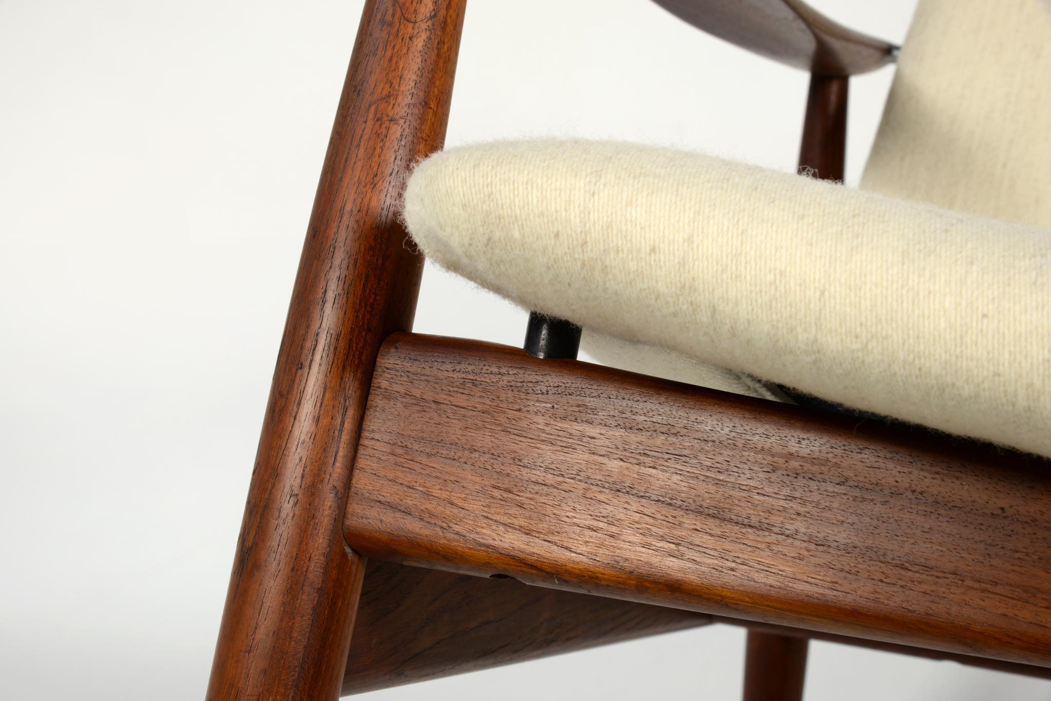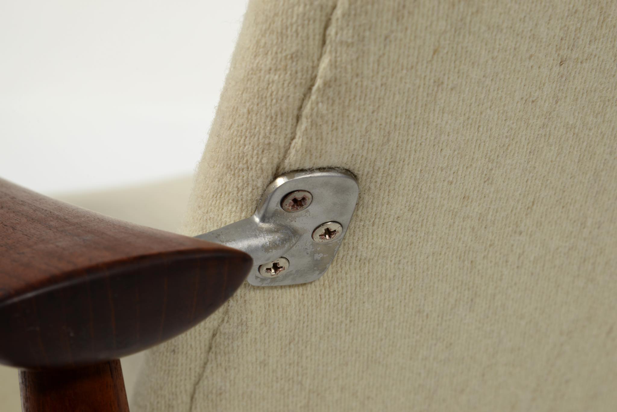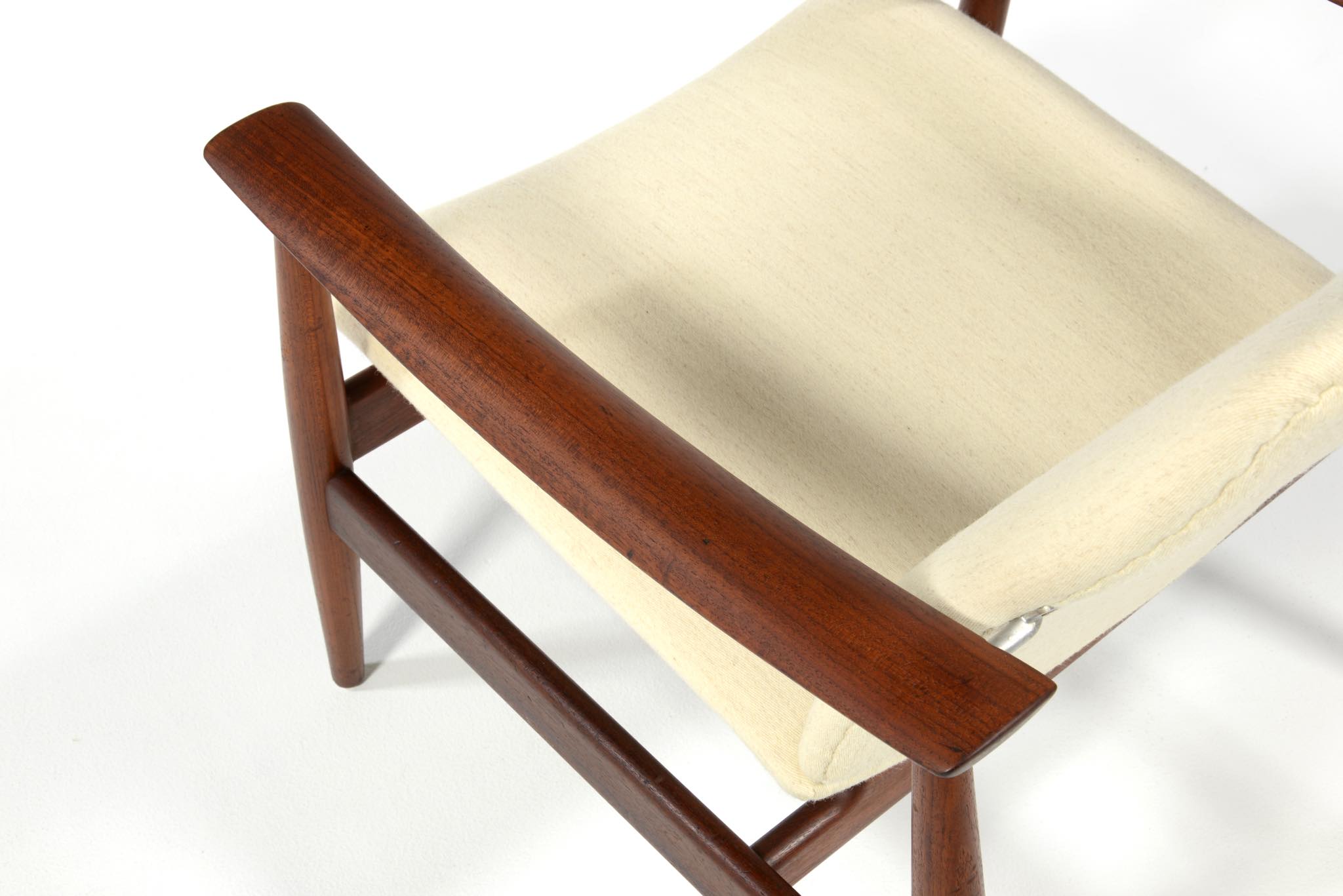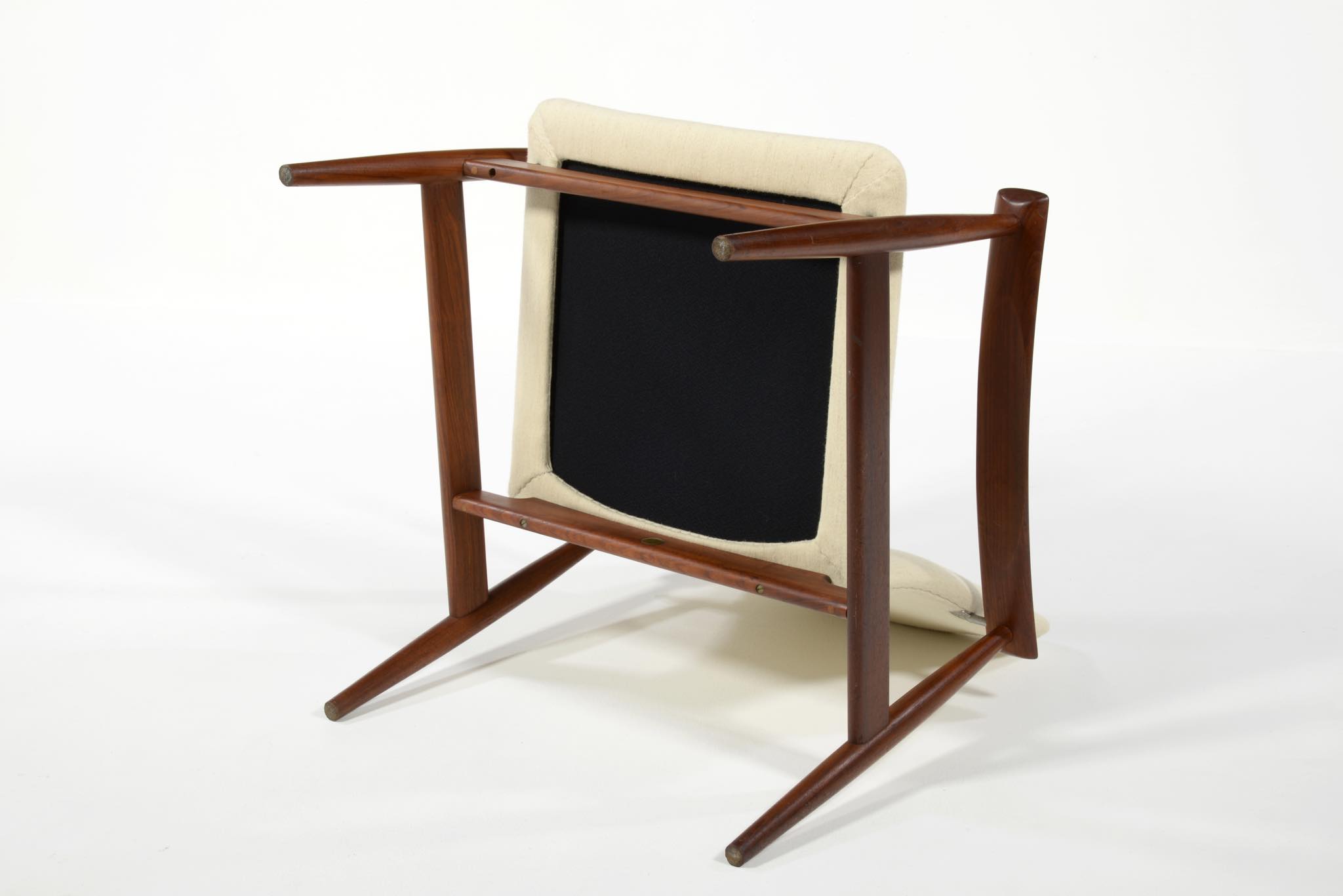 Finn Juhl/フィン・ユールによって1961に発表された”model 138”イージーチェアです。懸垂線を描いたアームが特徴のモデルで、小振りで座り易い椅子です。フレームには無垢のチーク材を用いており、端の断面から木取りの良さが伺えます。ファブリックと内部のウレタンは交換しておりきれいな状態です。