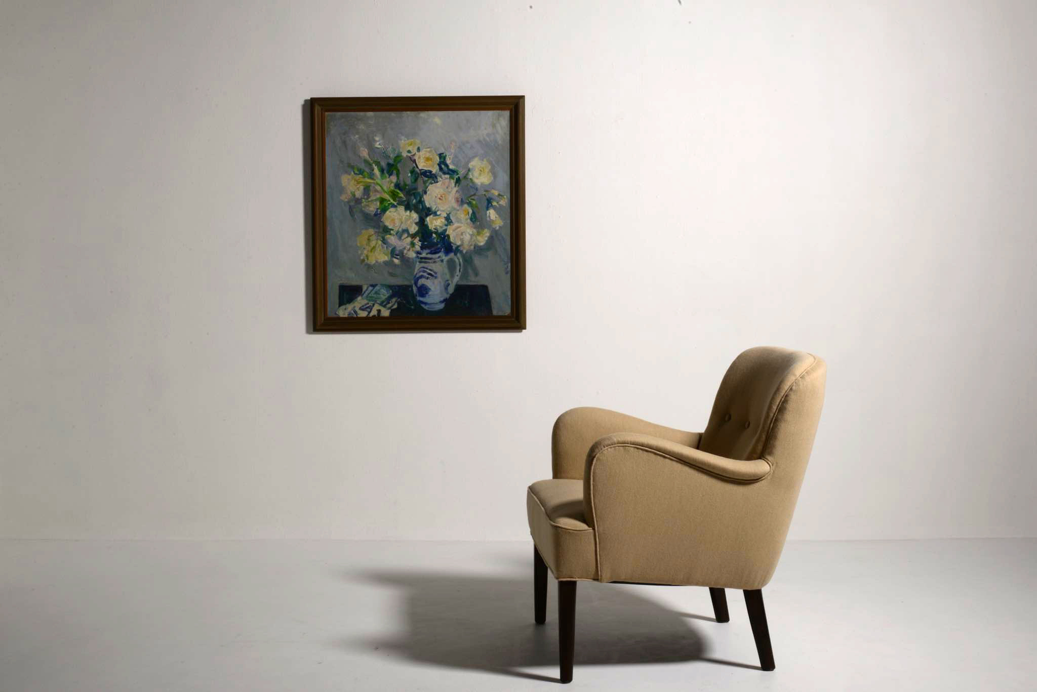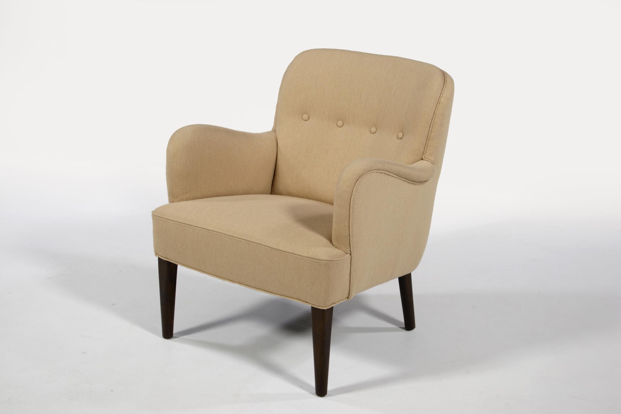 デンマークの家具工房で作られたイージーチェア、1940年代頃のものと思われます。工房名など詳しいことは判っておりませんが、丁寧に作られたものです。内部の緩衝材には天然素材が使われており、座面下にはコイルスプリングが内包され、身体を優しく支えてくれます。日本人に合った小振りなサイズ感で、座り心地の良い椅子です。ファブリックは張り替えており綺麗な状態です。