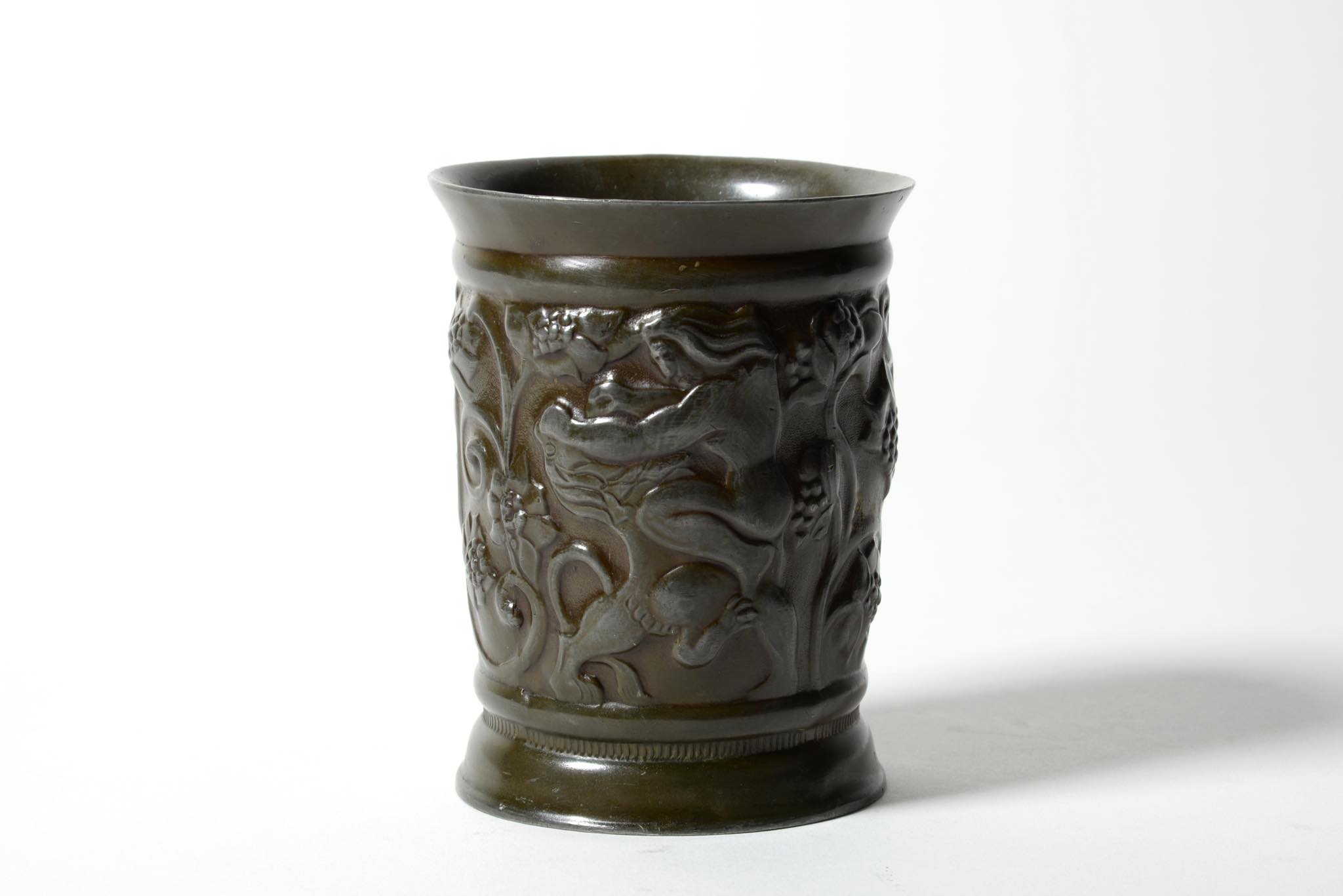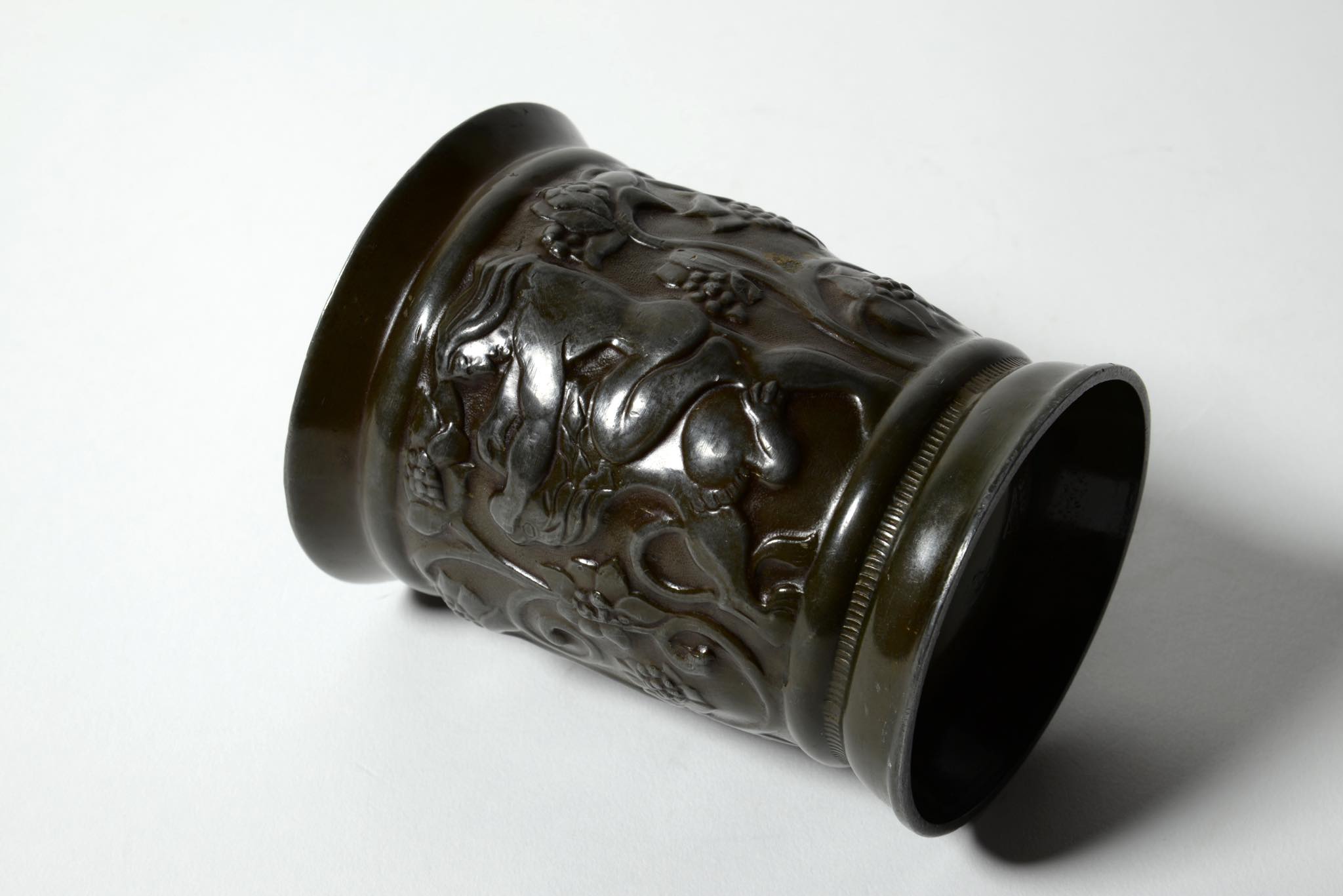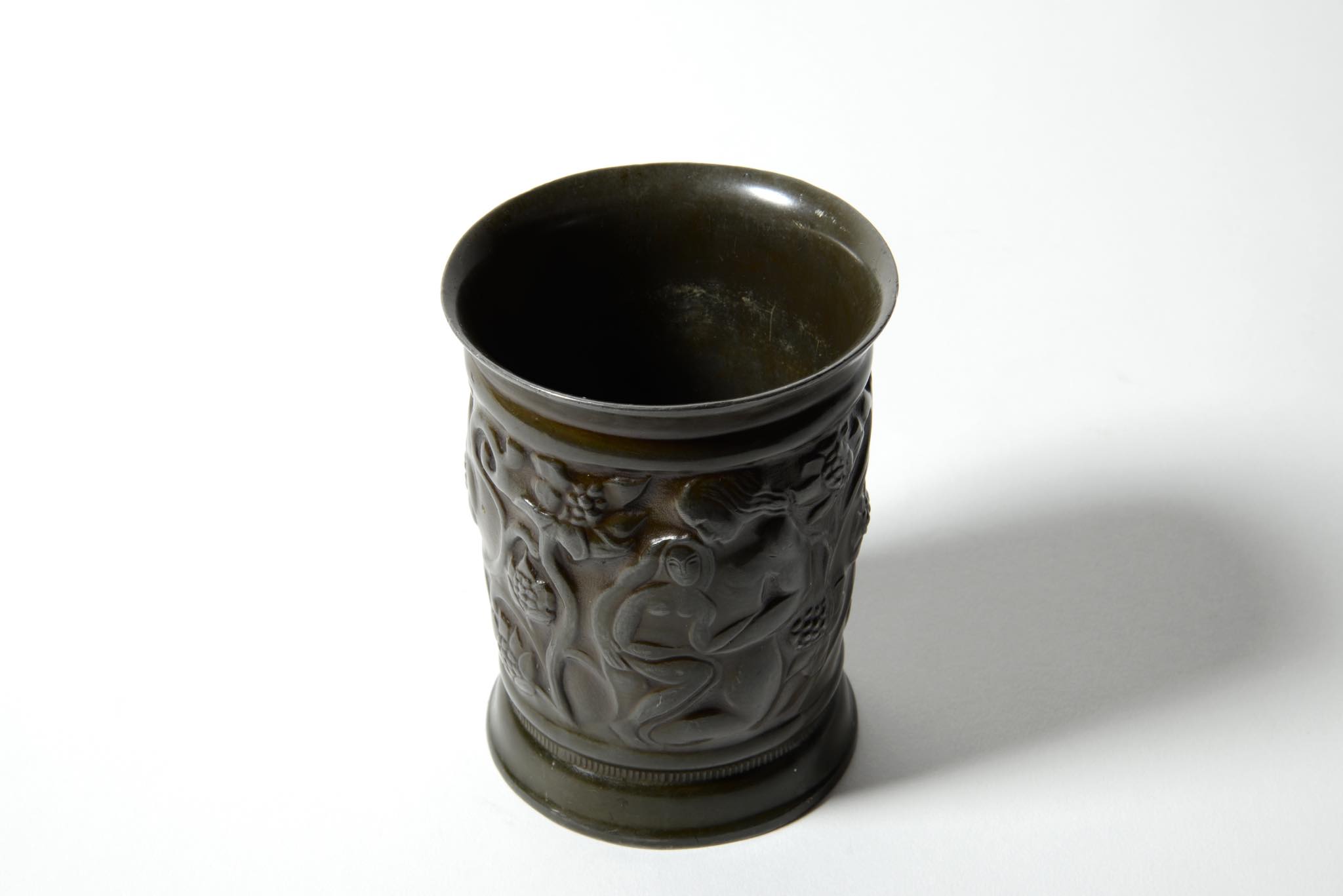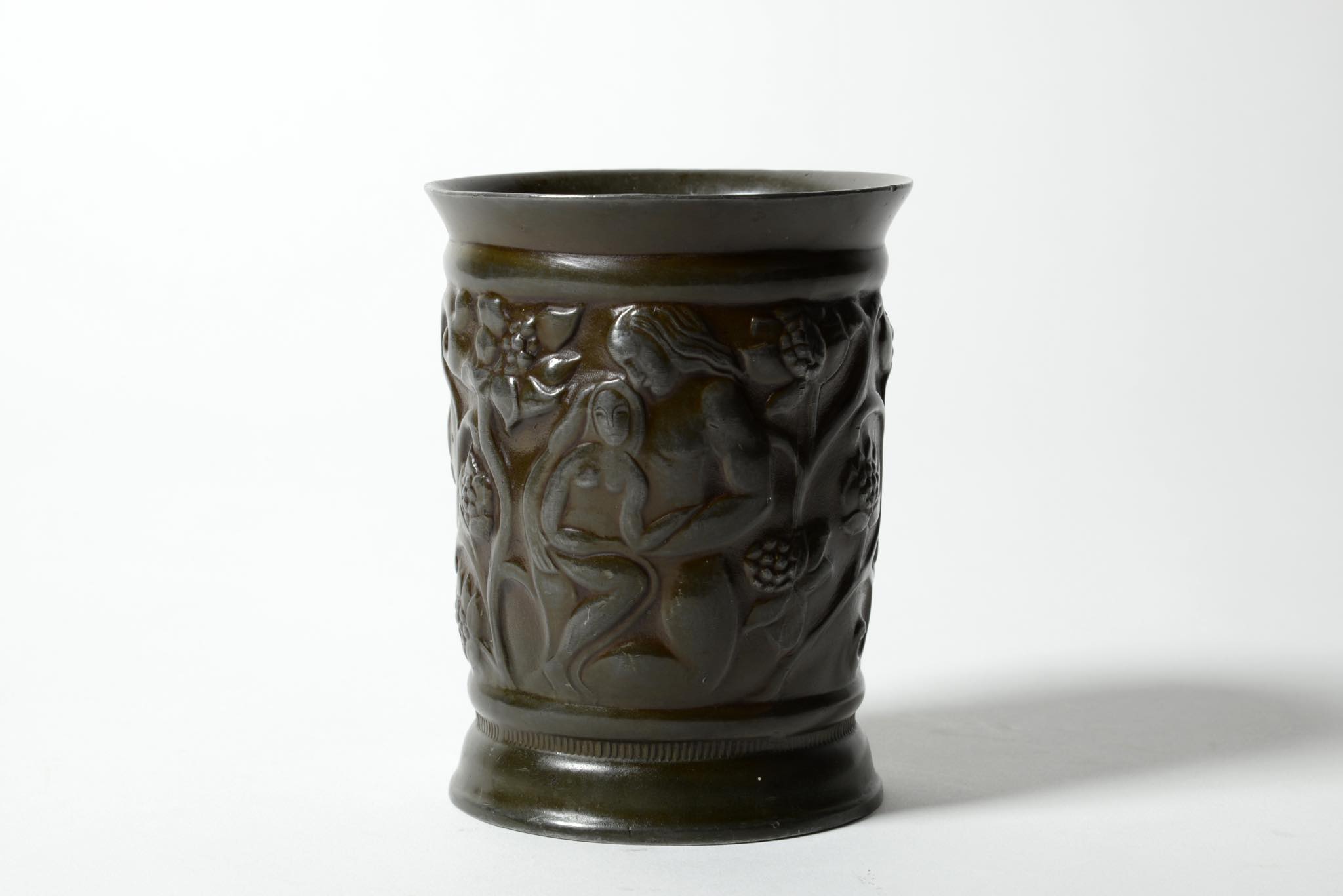 デンマークの金工家、ユスト・アナセンによるベースです。筆筒としてもお使いいただけるサイズです。1930年代頃に作られたものでしょう。かつて筆筒として使われ握ることが多かったのか、ディスコメタルの表面に施された「着色」がやや剥がれており地金が露出しています。大きなダメージはありません。