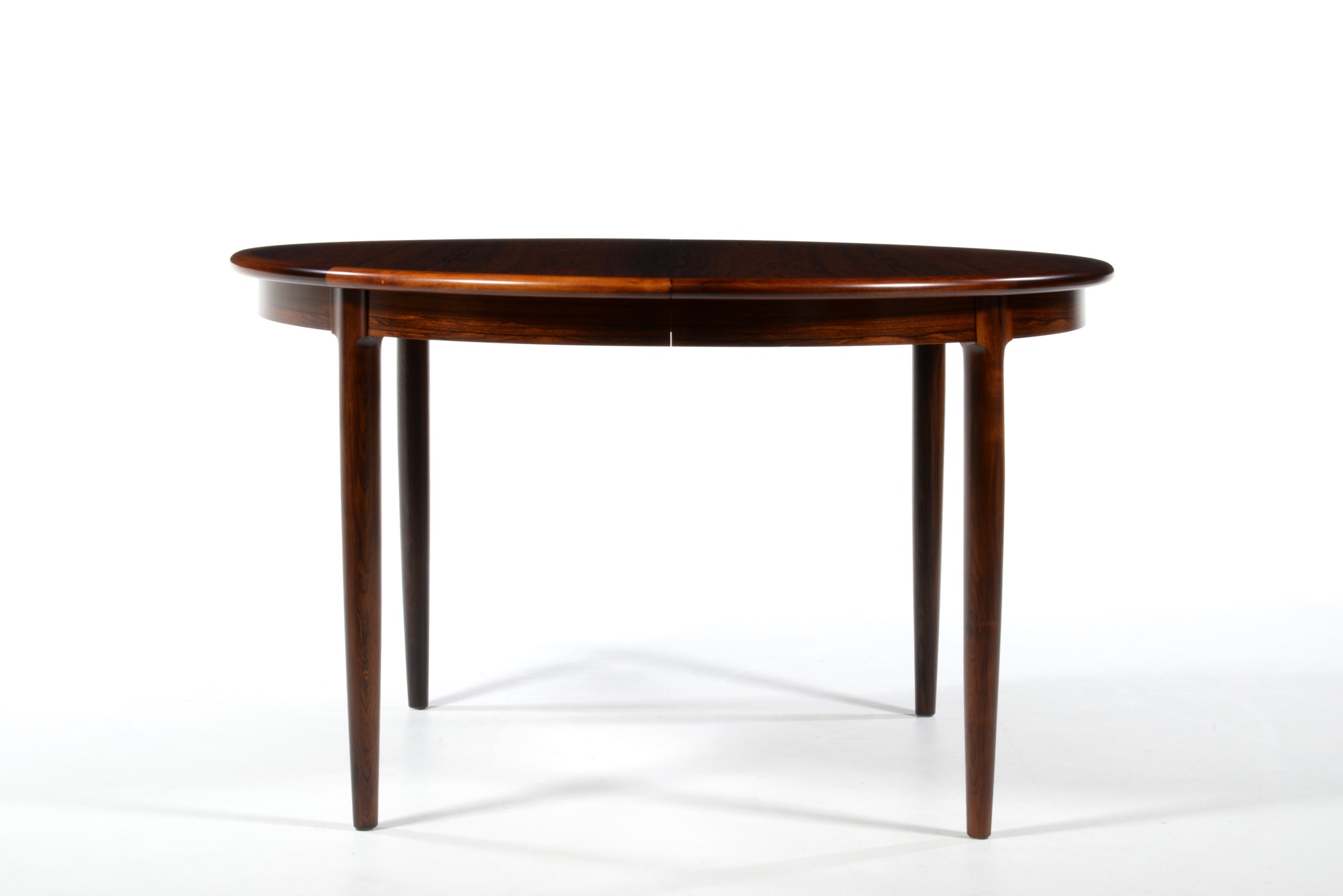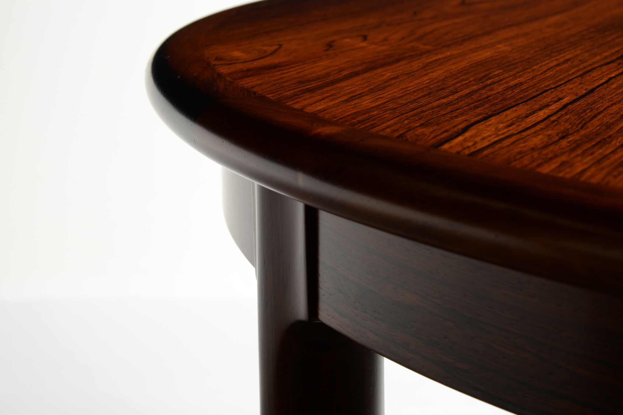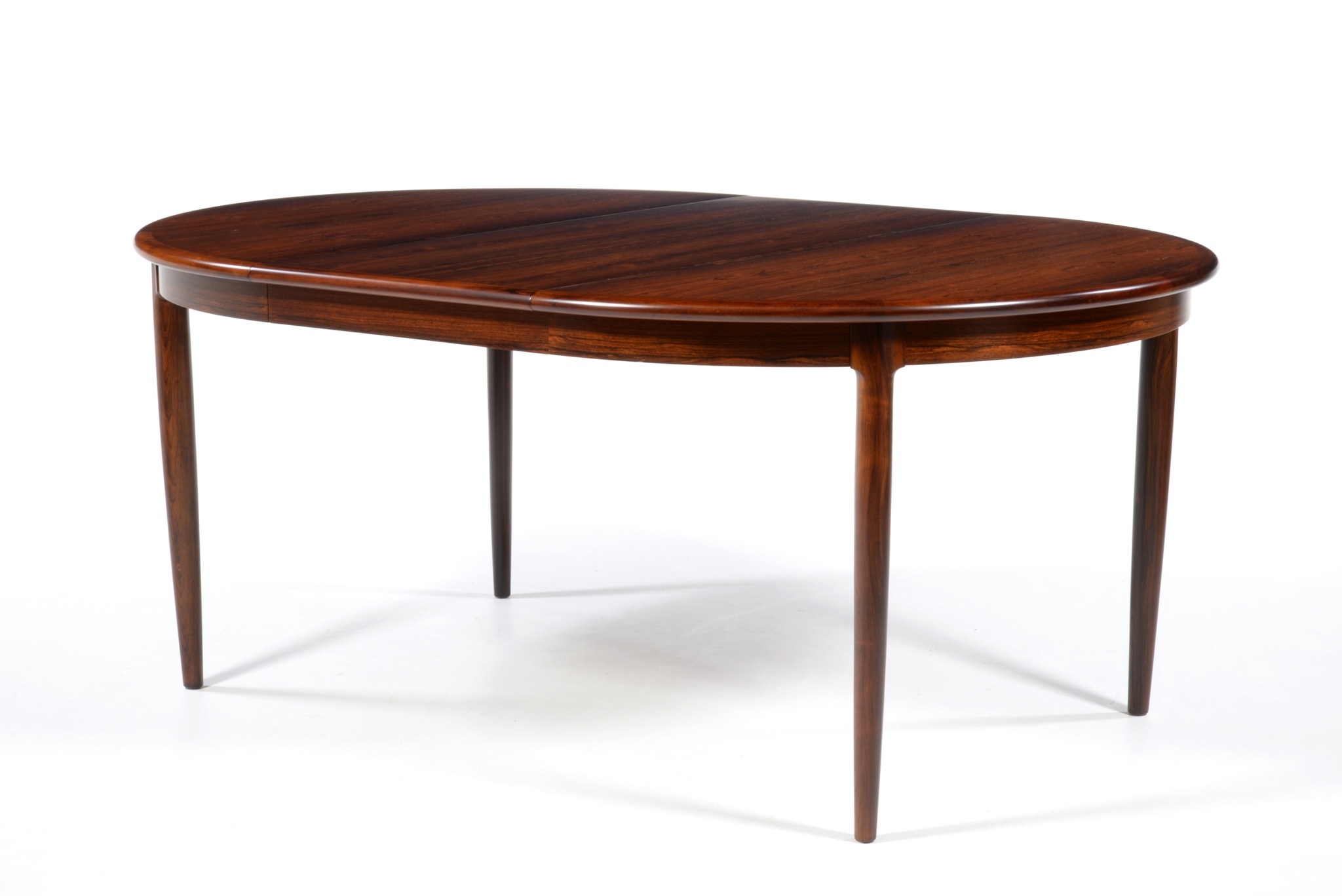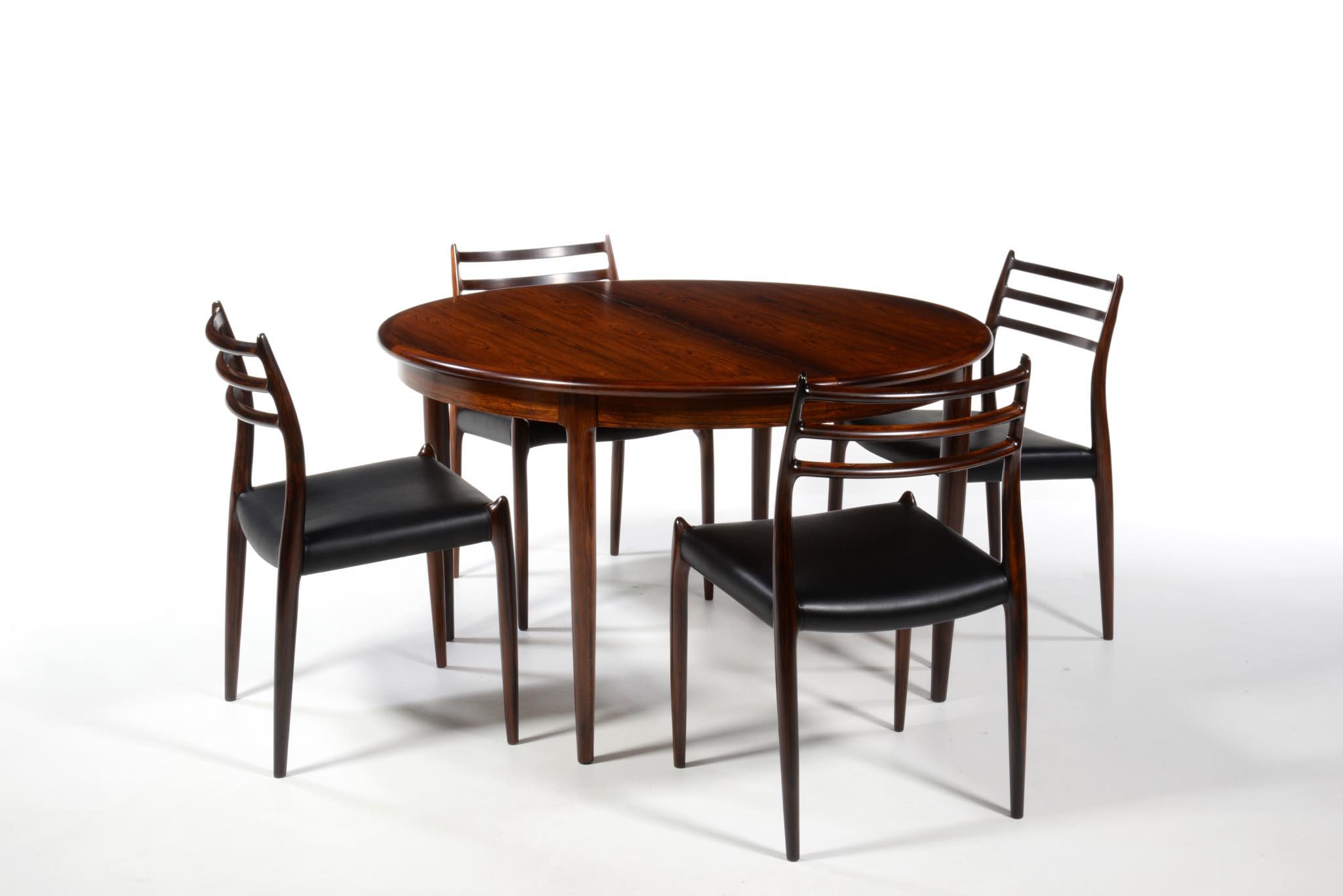 デンマークの家具工房、J.L. Møller/J.L. モラー社によって作られたダイニングテーブルです。1960年代頃に作られたものでしょう。ラウンド型の天板は中央にエクステンションリーフを差し込み天板の面積を拡張することができます。パーツそれぞれが重厚で丁寧に作られており、安定感のあるテーブルです。