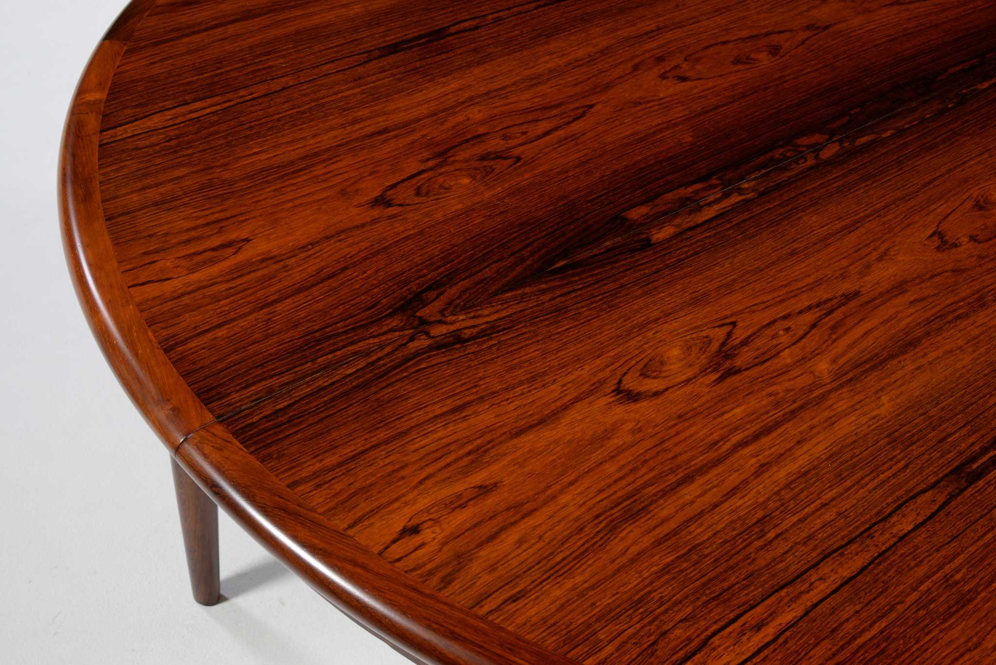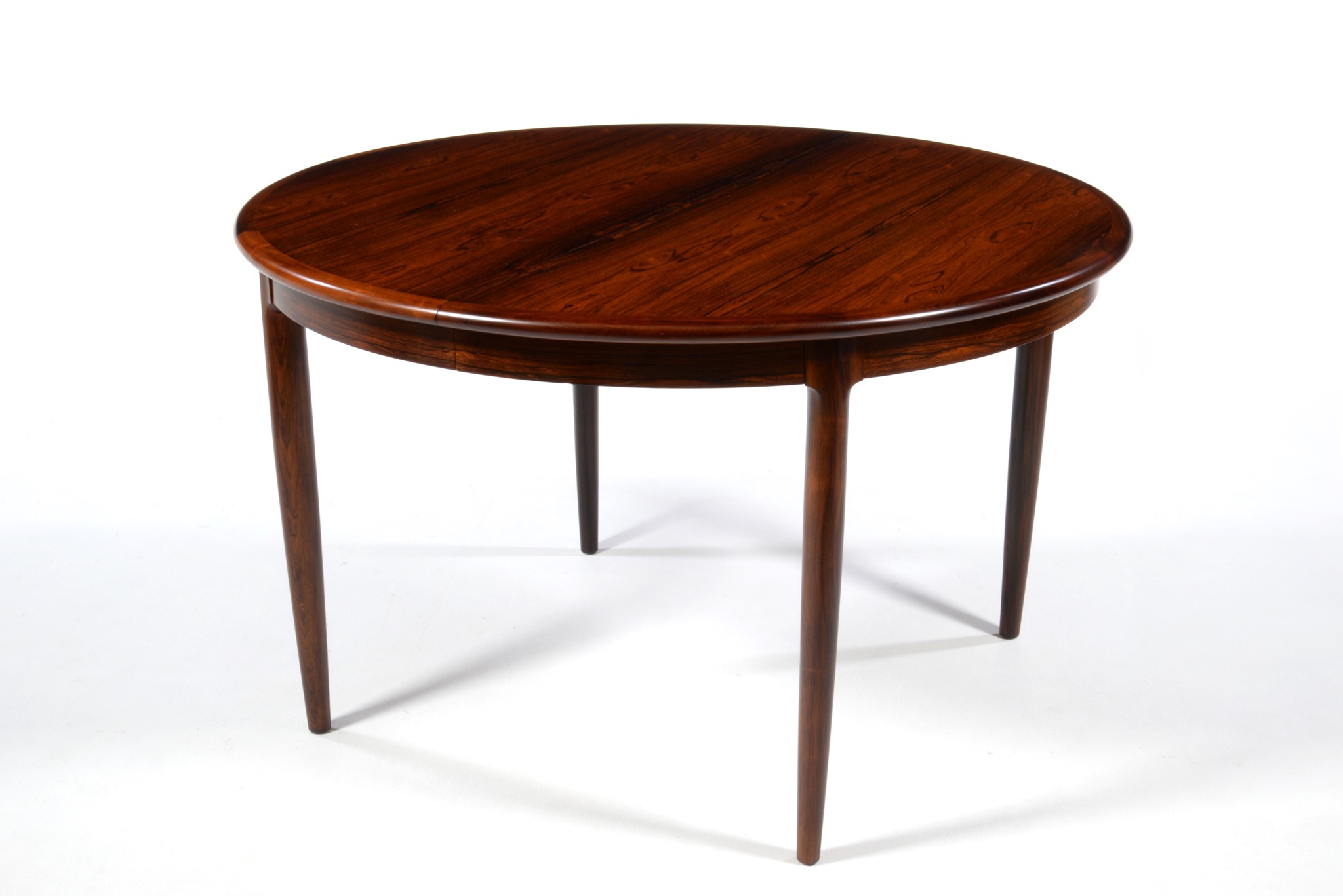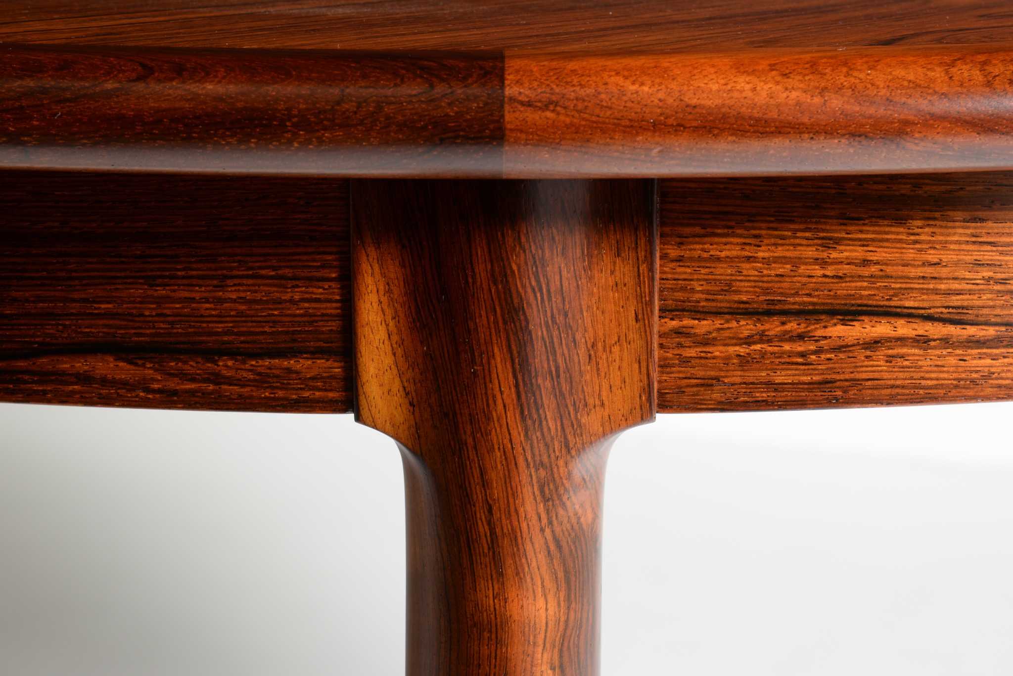 デンマークの家具工房、J.L. Møller/J.L. モラー社によって作られたダイニングテーブルです。1960年代頃に作られたものでしょう。ラウンド型の天板は中央にエクステンションリーフを差し込み天板の面積を拡張することができます。パーツそれぞれが重厚で丁寧に作られており、安定感のあるテーブルです。