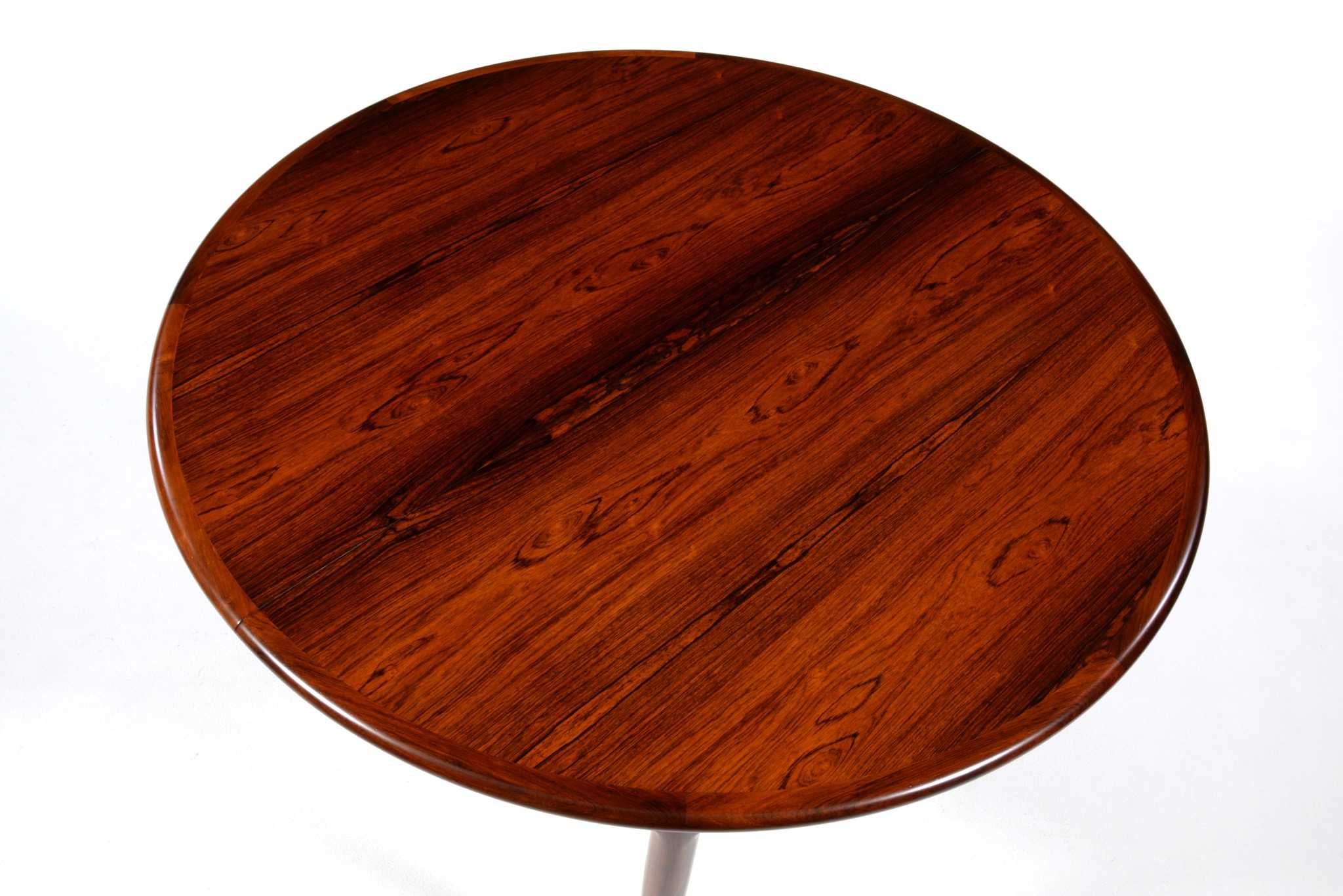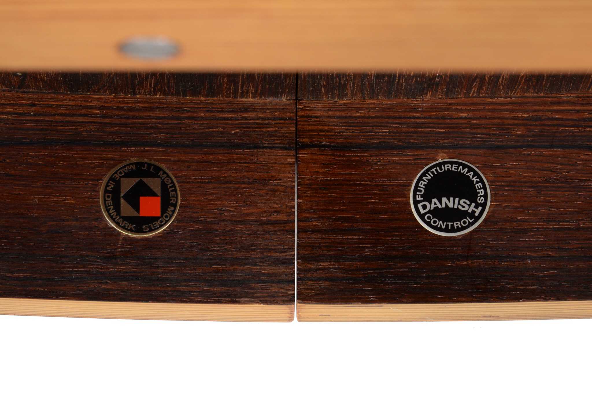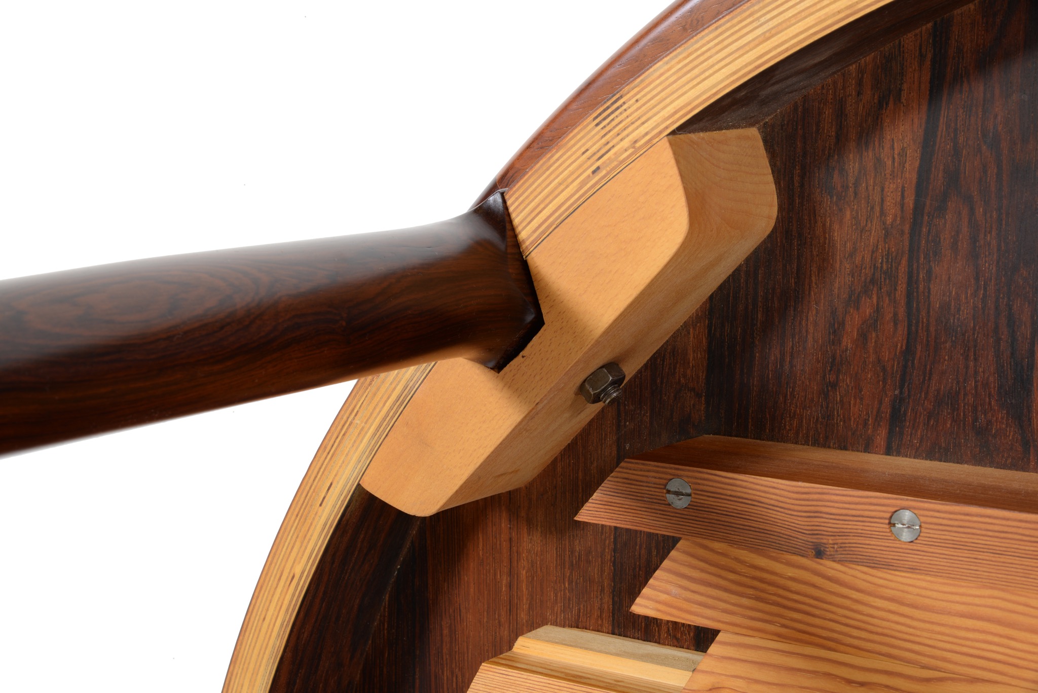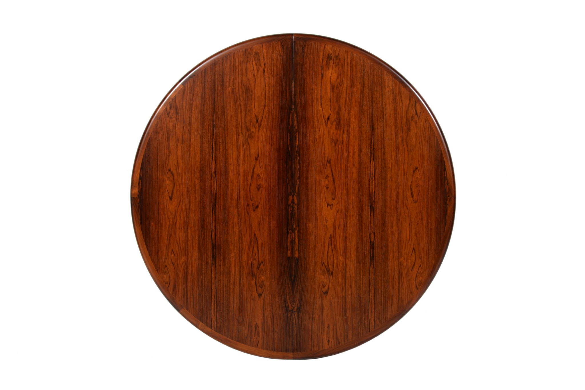 デンマークの家具工房、J.L. Møller/J.L. モラー社によって作られたダイニングテーブルです。1960年代頃に作られたものでしょう。ラウンド型の天板は中央にエクステンションリーフを差し込み天板の面積を拡張することができます。パーツそれぞれが重厚で丁寧に作られており、安定感のあるテーブルです。
