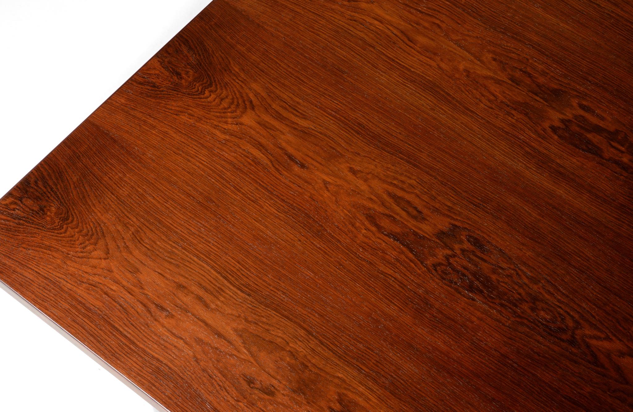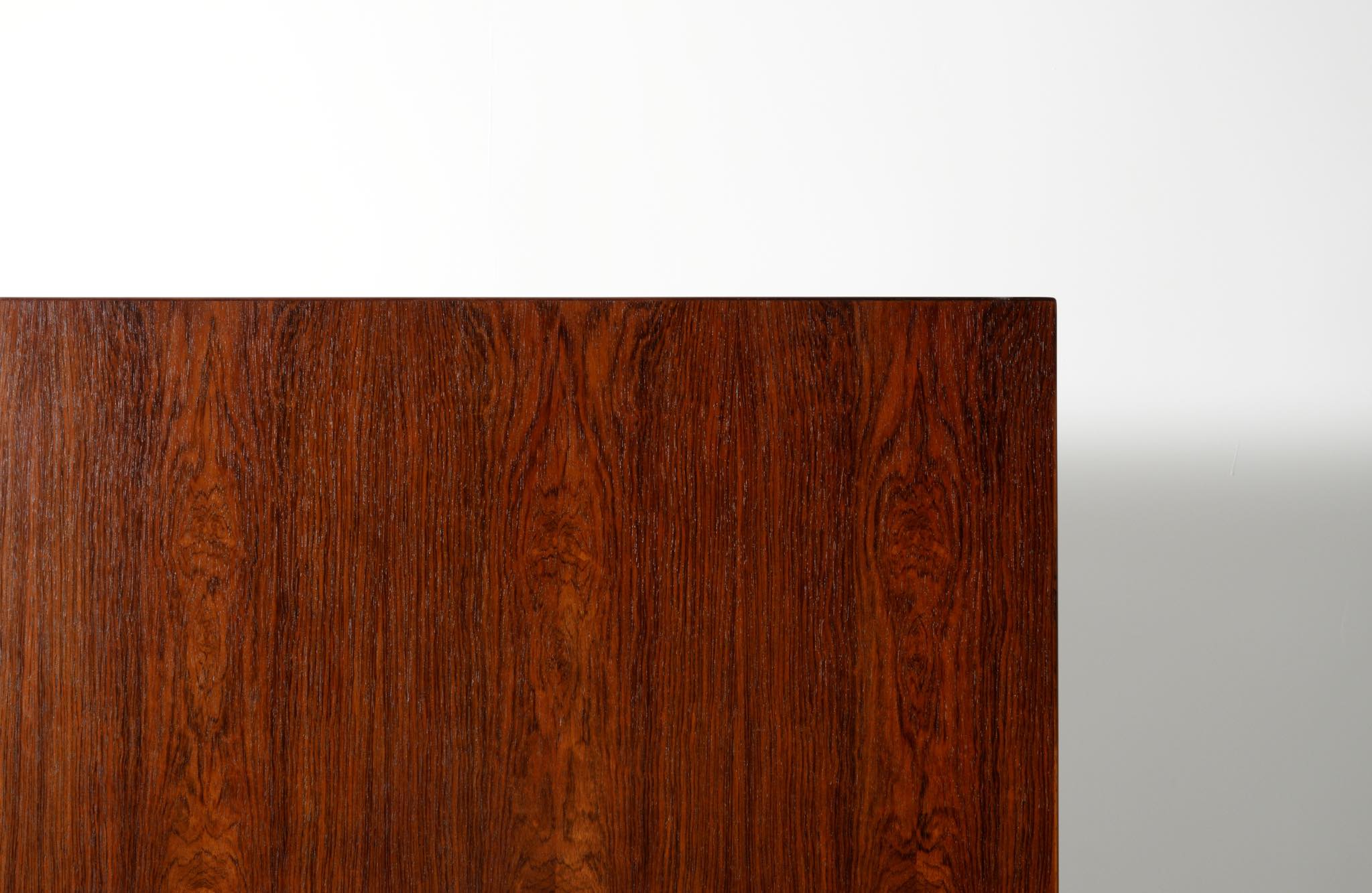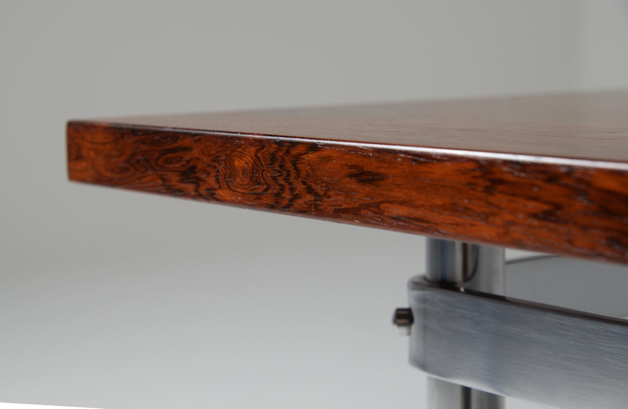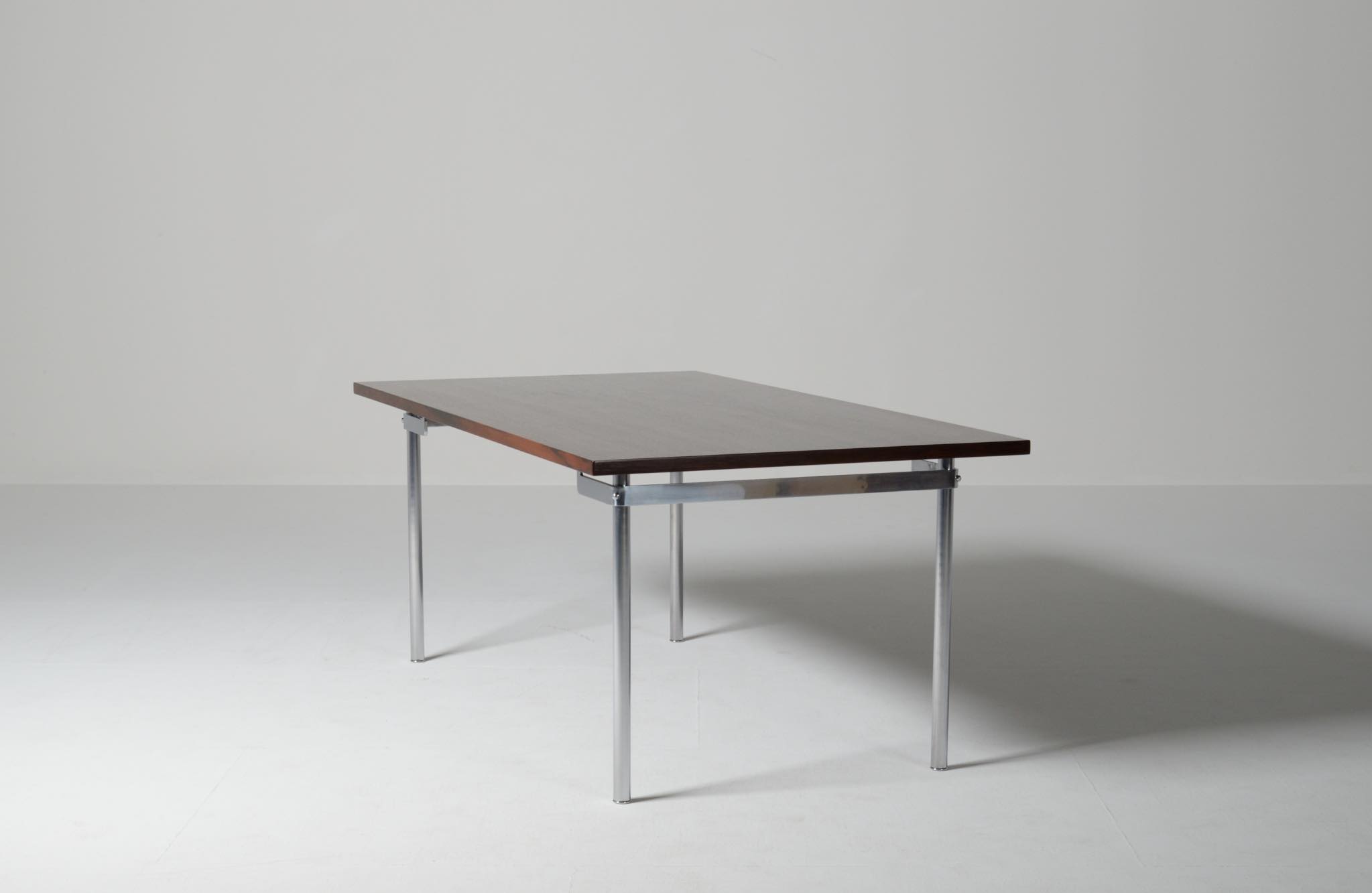 デンマークを代表する家具デザイナー、Hans J. Wegner/ハンス・ウェグナーによるダイニングテーブルです。ローズウッドの天板とクロームドスティールレッグとのコントラストが効いたスクエアな雰囲気のテーブルです。脚の揺れを抑えるための幕板の構造に特徴があり、ウェグナーの鉄素材へのこだわりを感じさせる作りとなっています。ミニマルでありながら重厚感もあわせ持つデザインで、ワークテーブルとしてもお使いいただけるでしょう。コンディションは良好です。