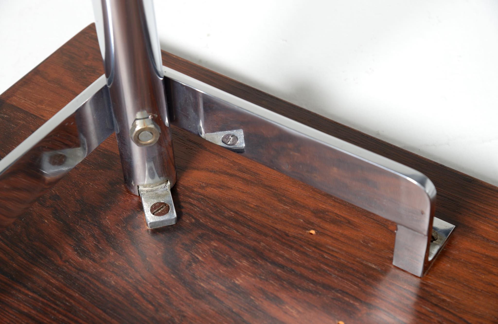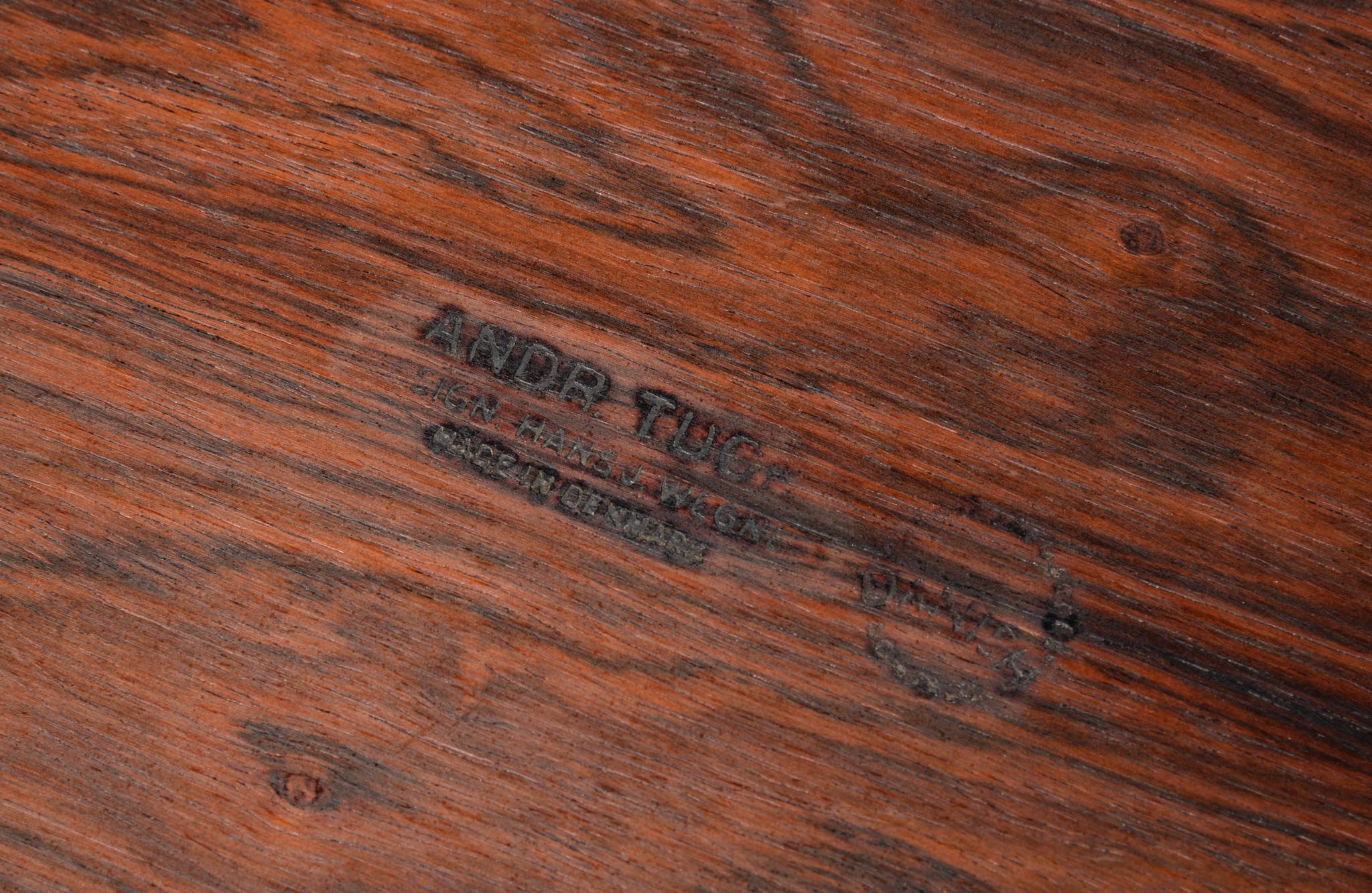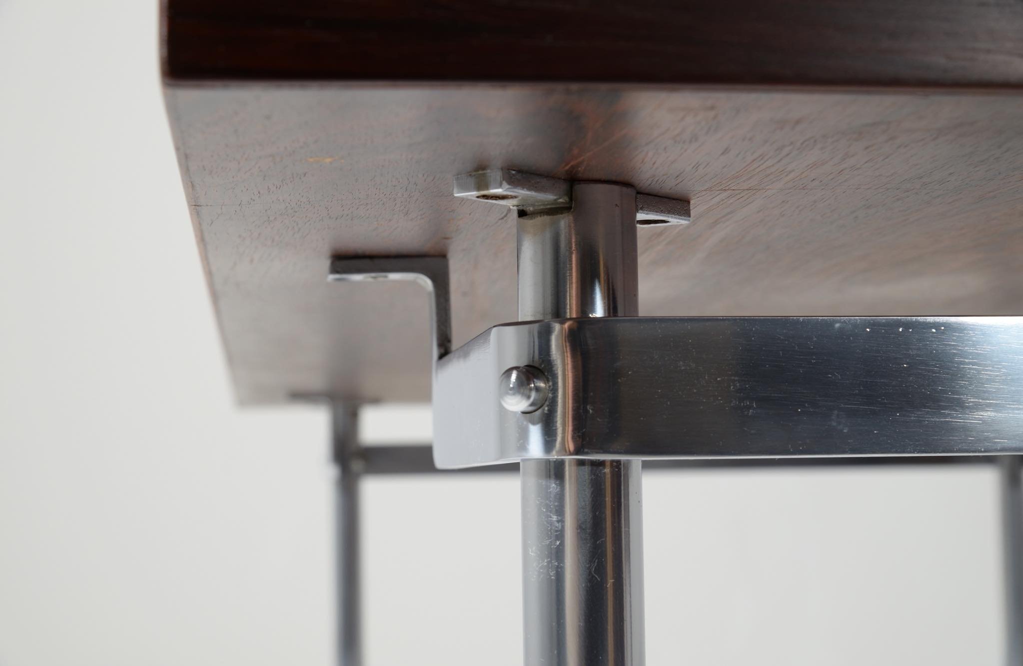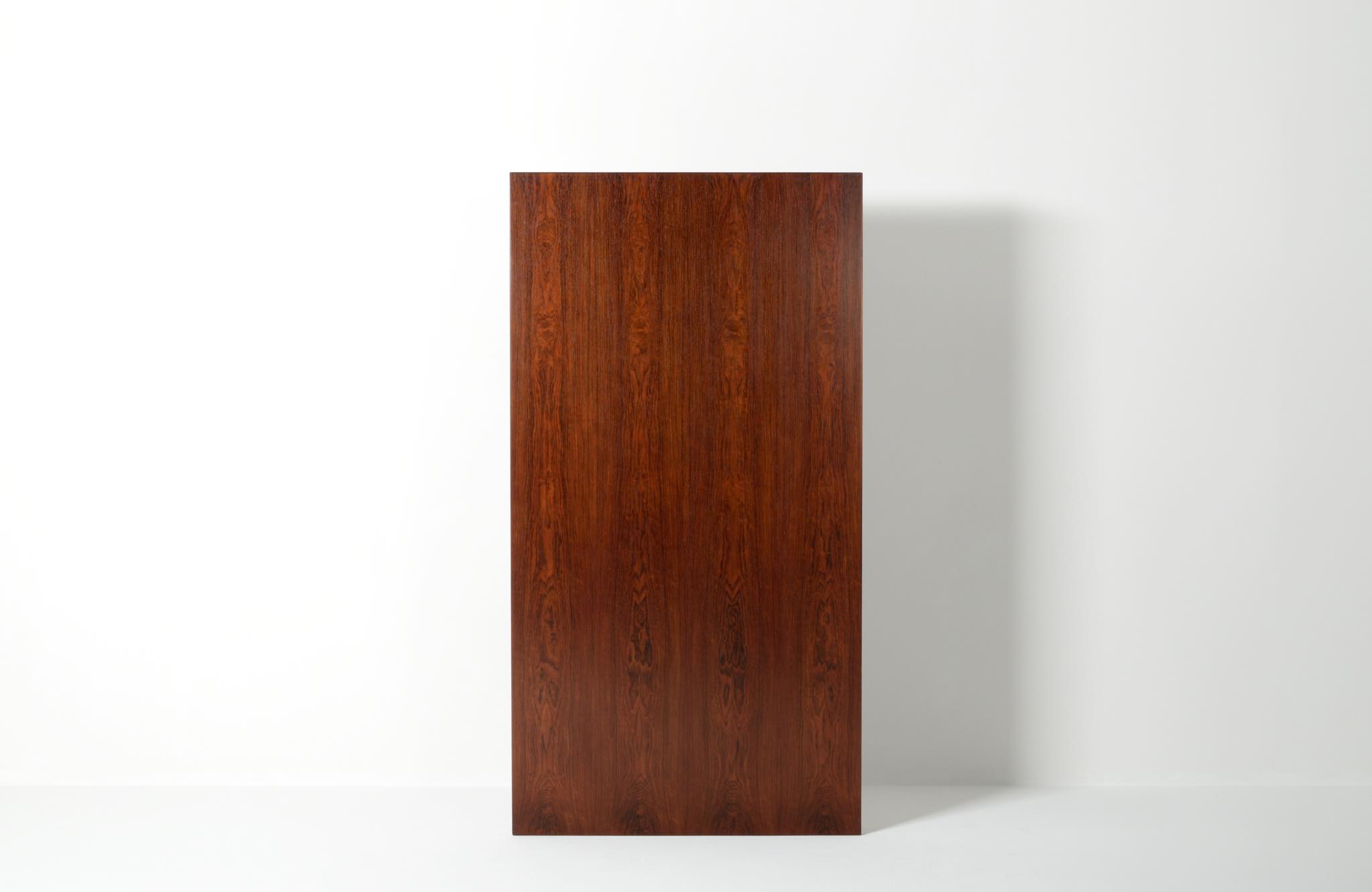 デンマークを代表する家具デザイナー、Hans J. Wegner/ハンス・ウェグナーによるダイニングテーブルです。ローズウッドの天板とクロームドスティールレッグとのコントラストが効いたスクエアな雰囲気のテーブルです。脚の揺れを抑えるための幕板の構造に特徴があり、ウェグナーの鉄素材へのこだわりを感じさせる作りとなっています。ミニマルでありながら重厚感もあわせ持つデザインで、ワークテーブルとしてもお使いいただけるでしょう。コンディションは良好です。