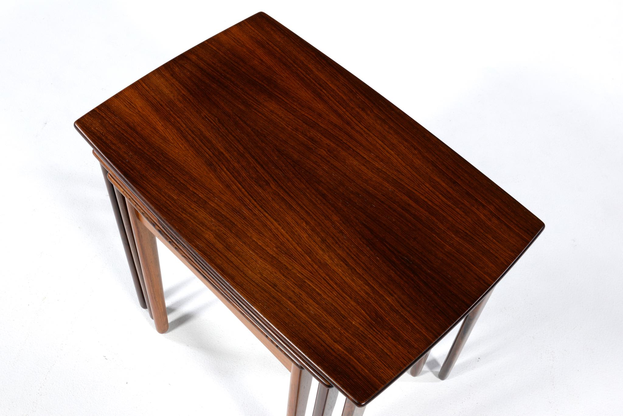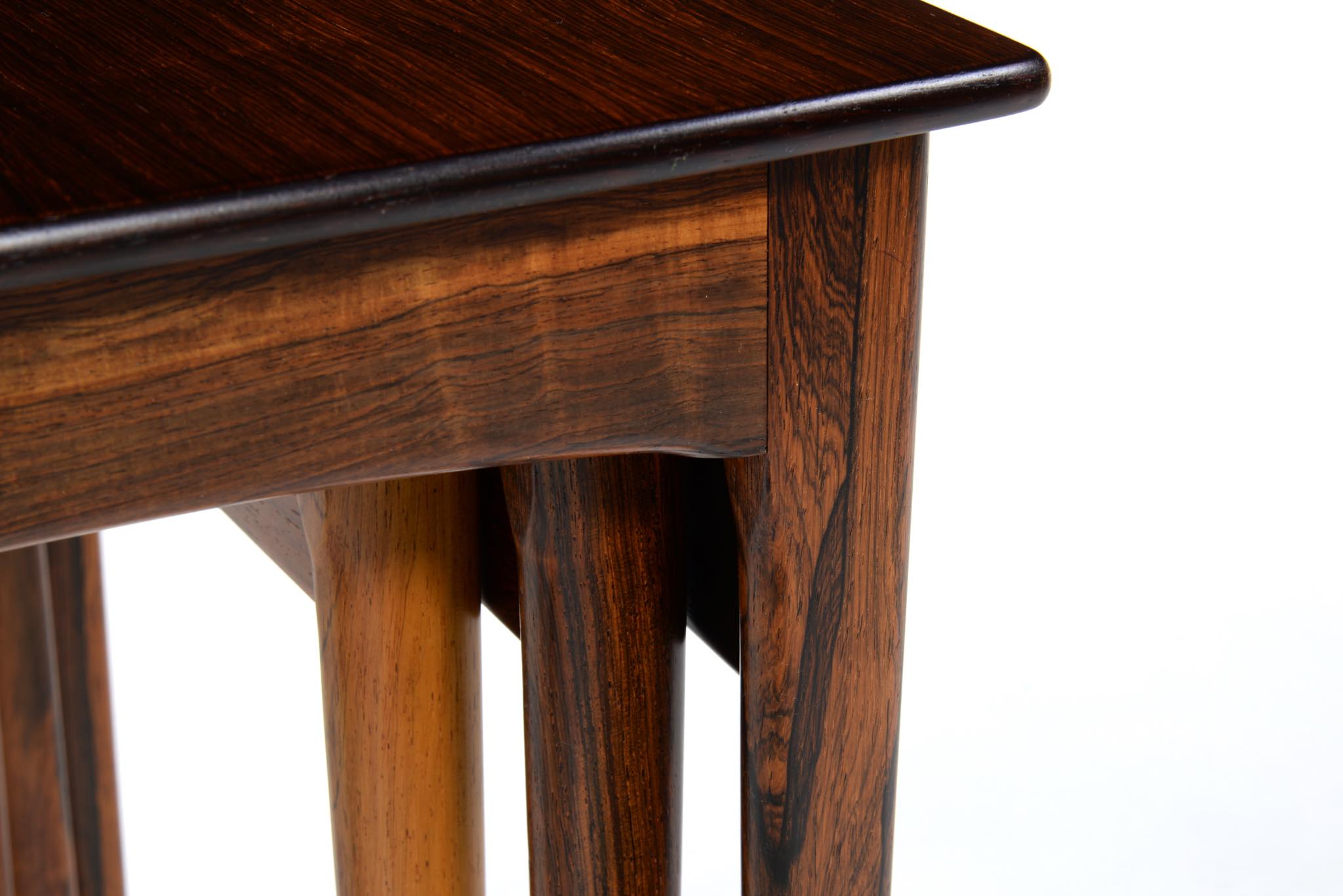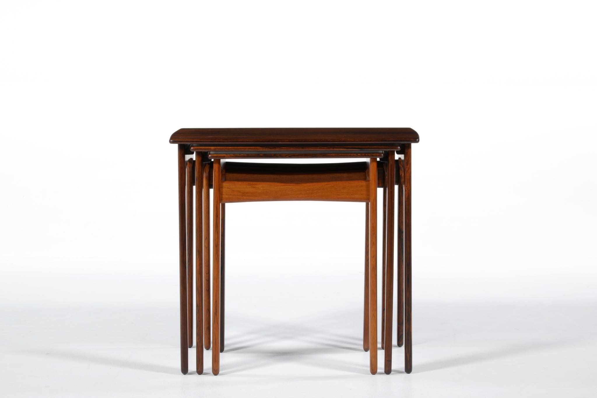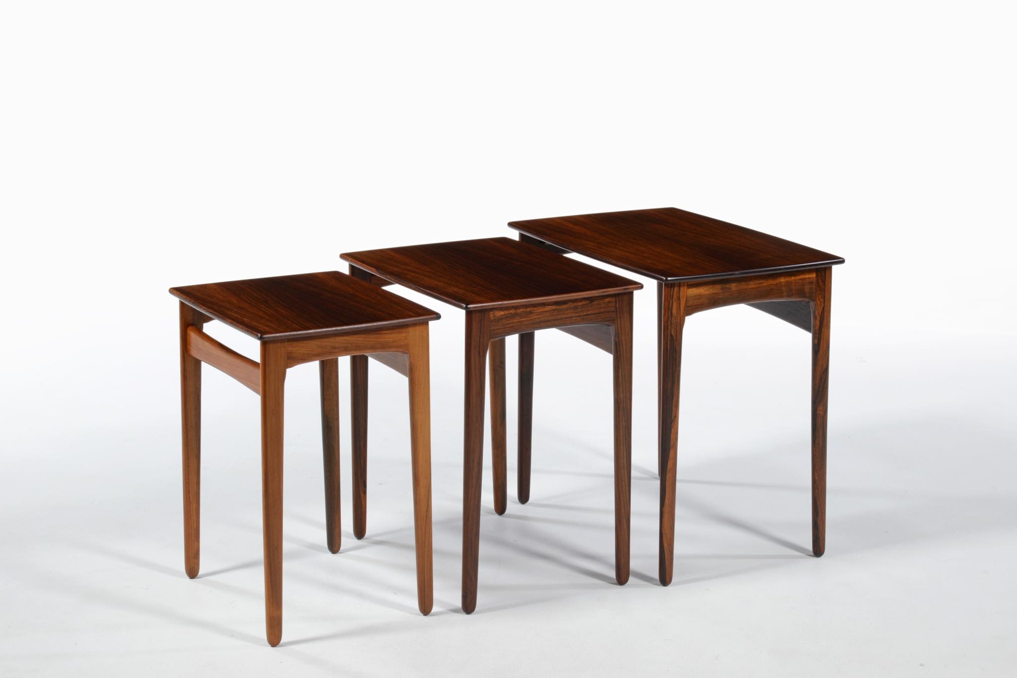 デンマークの家具工房にて1960年代頃に作られたネストテーブルです。詳しい事は判っておりませんが、丁寧に作られたもので、ブラジル原産と思しき特有の木目の現れた材を用いて作られています。