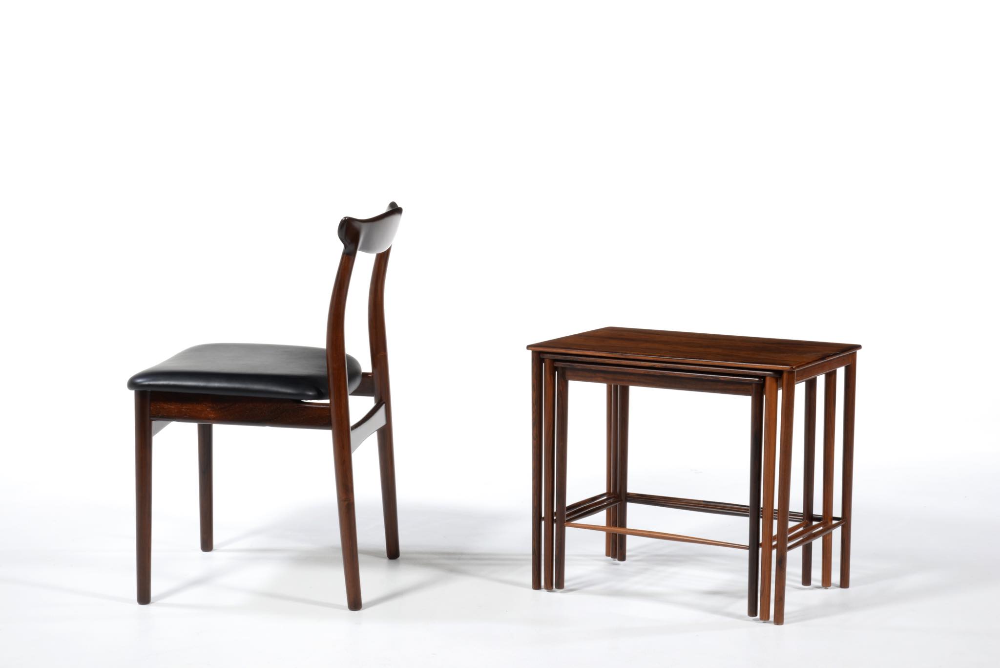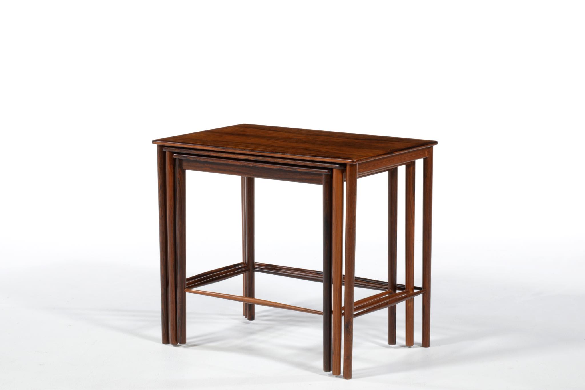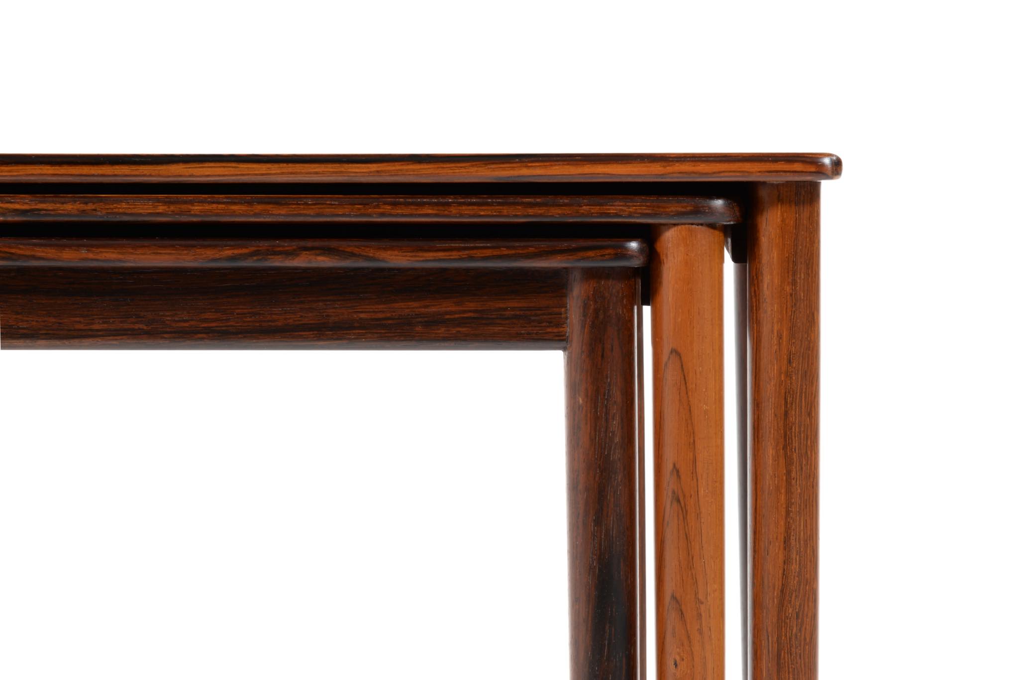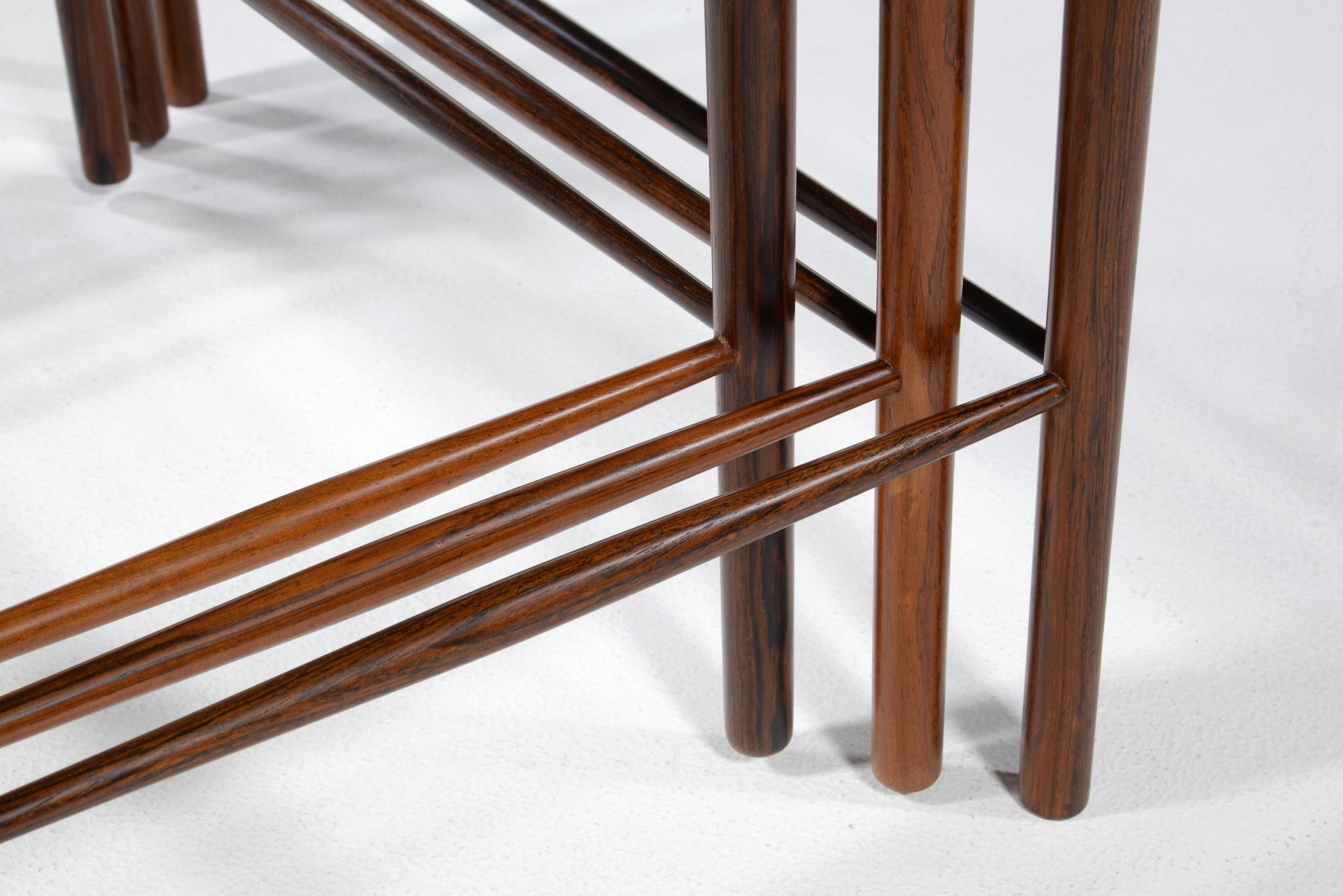 デンマークのデザイナー、Kai Winding/カイ・ウィンディングによるネストテーブルです。ブラジル原産と思しき特有の木目の現れた材を用いて作られています。天板は突き板、脚は無垢材を細く削り出しており、脚の濃淡は個体差でしょう。天然木の強固さを感じるテーブルです。