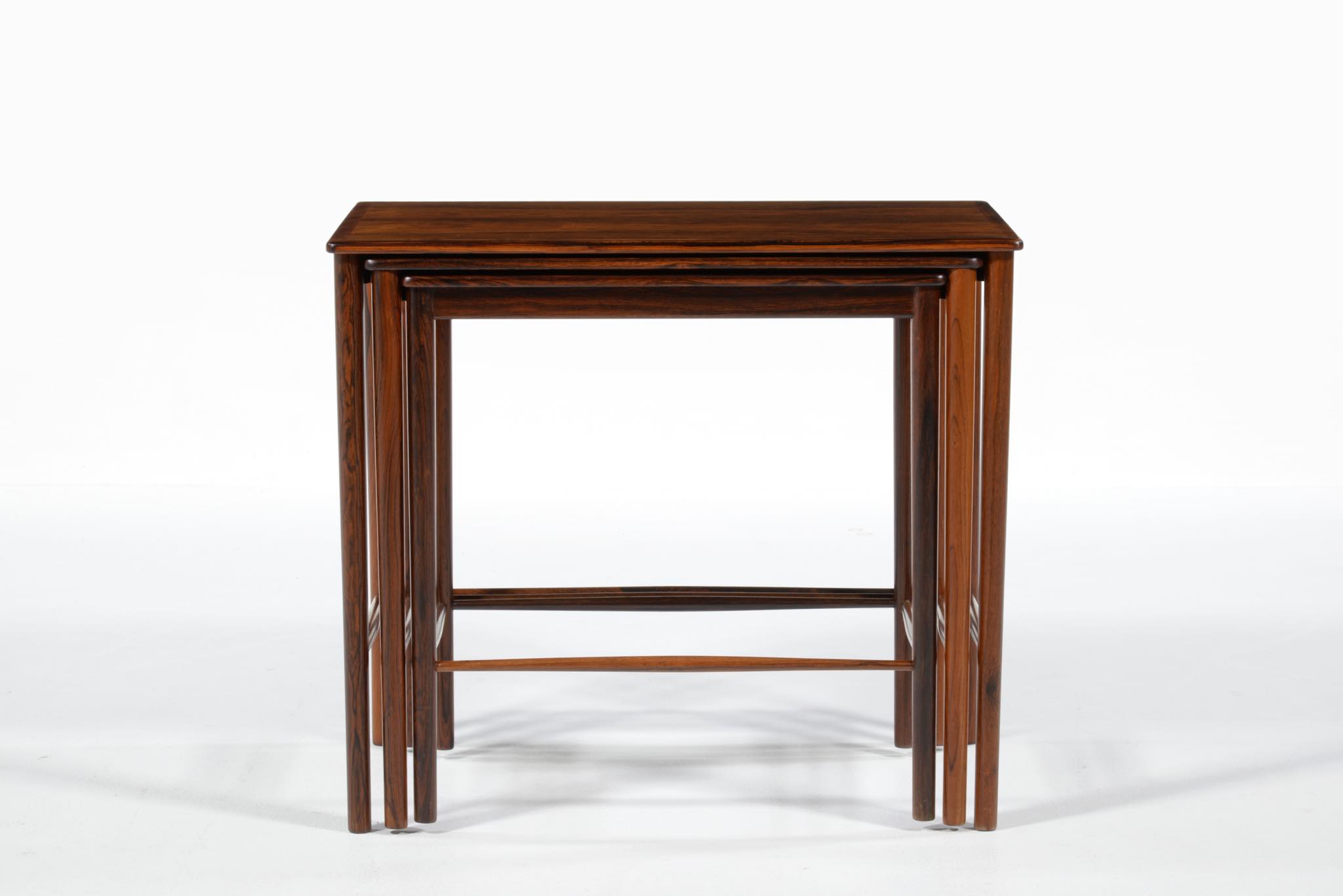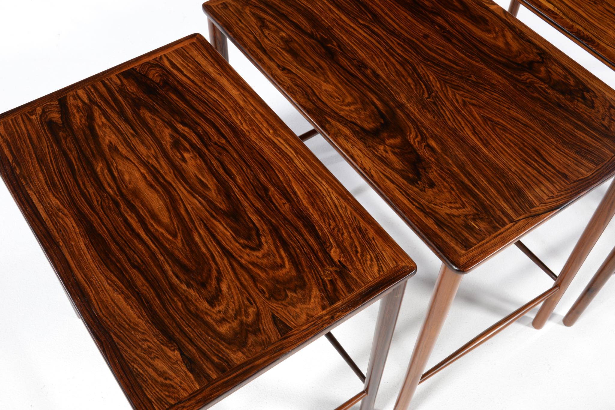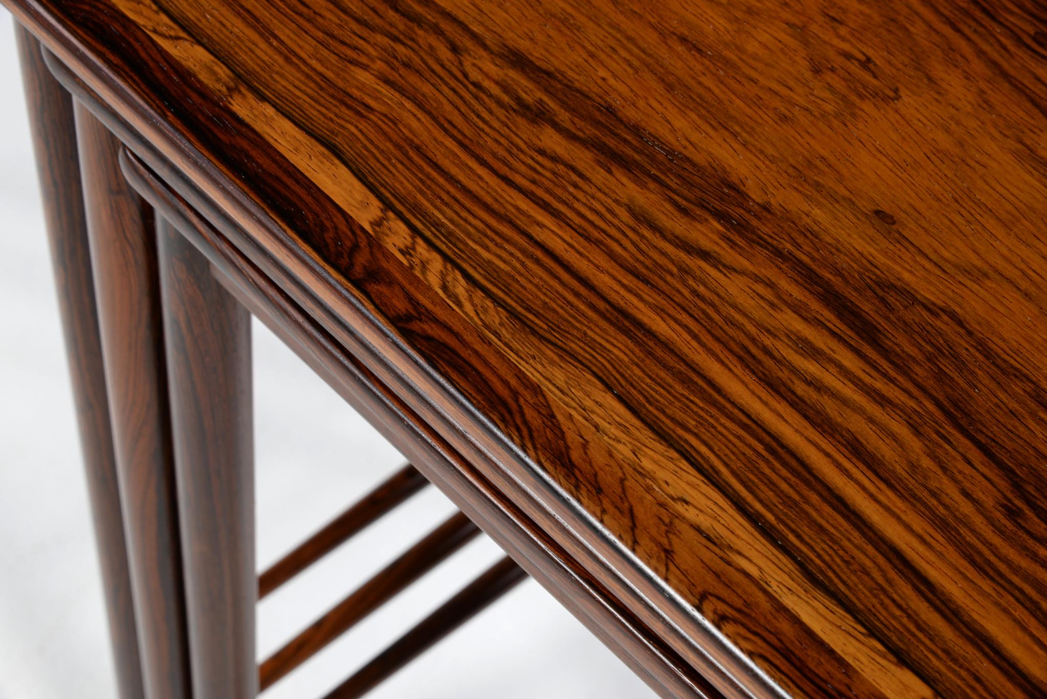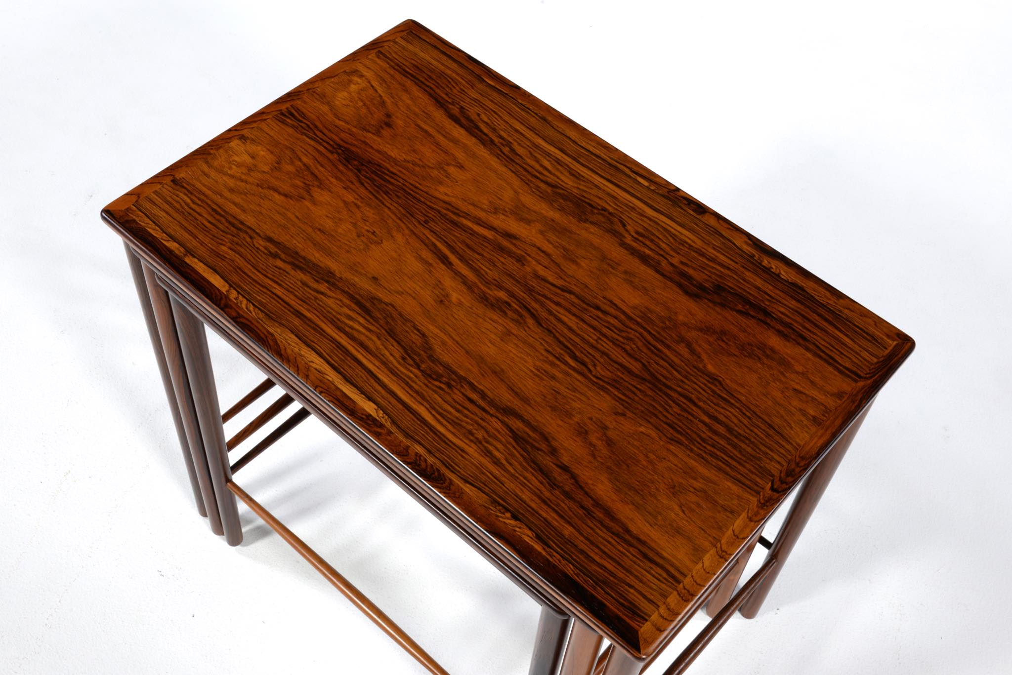 デンマークのデザイナー、Kai Winding/カイ・ウィンディングによるネストテーブルです。ブラジル原産と思しき特有の木目の現れた材を用いて作られています。天板は突き板、脚は無垢材を細く削り出しており、脚の濃淡は個体差でしょう。天然木の強固さを感じるテーブルです。