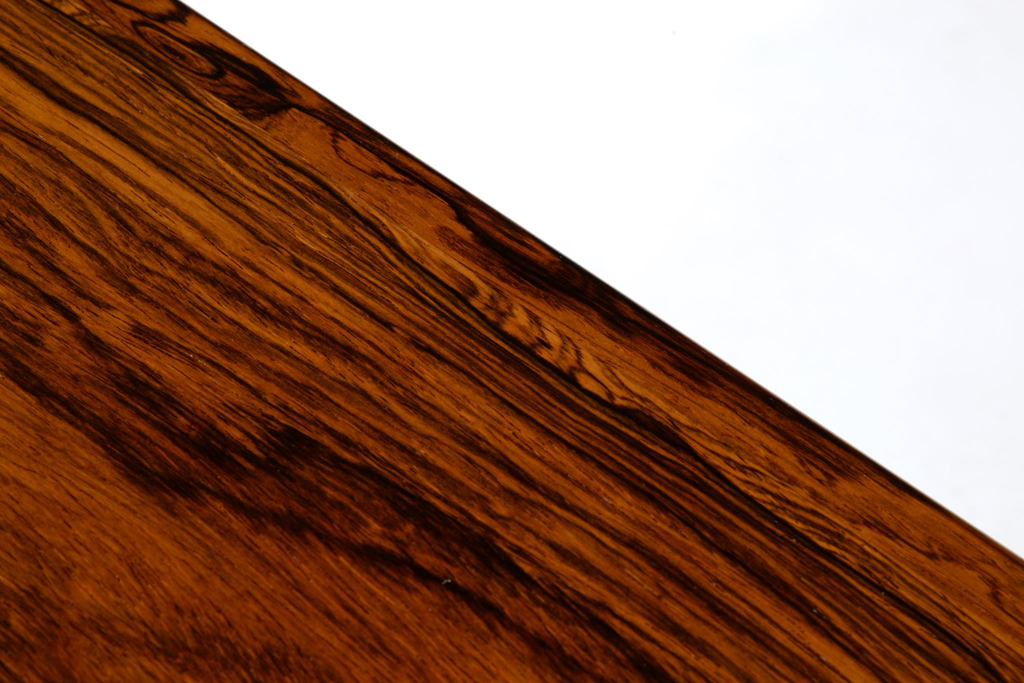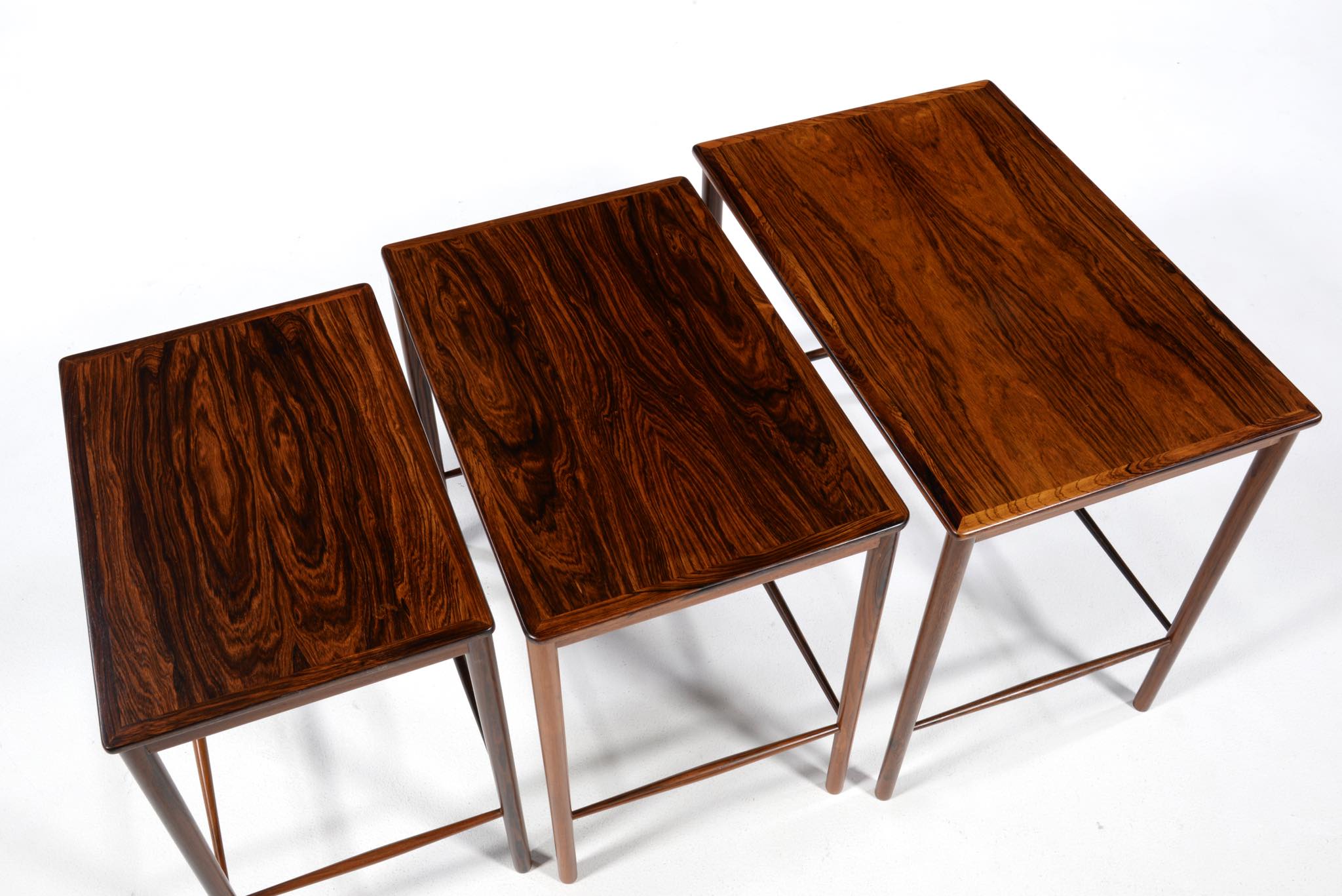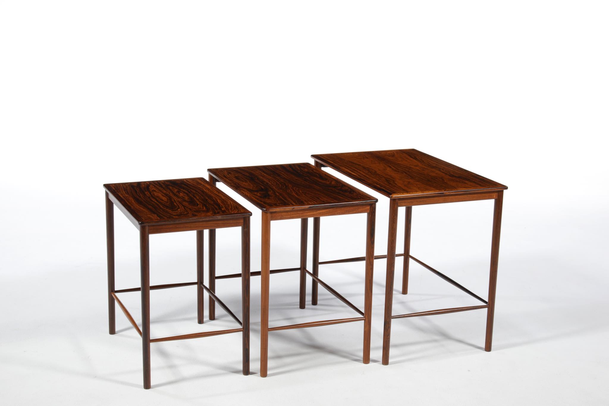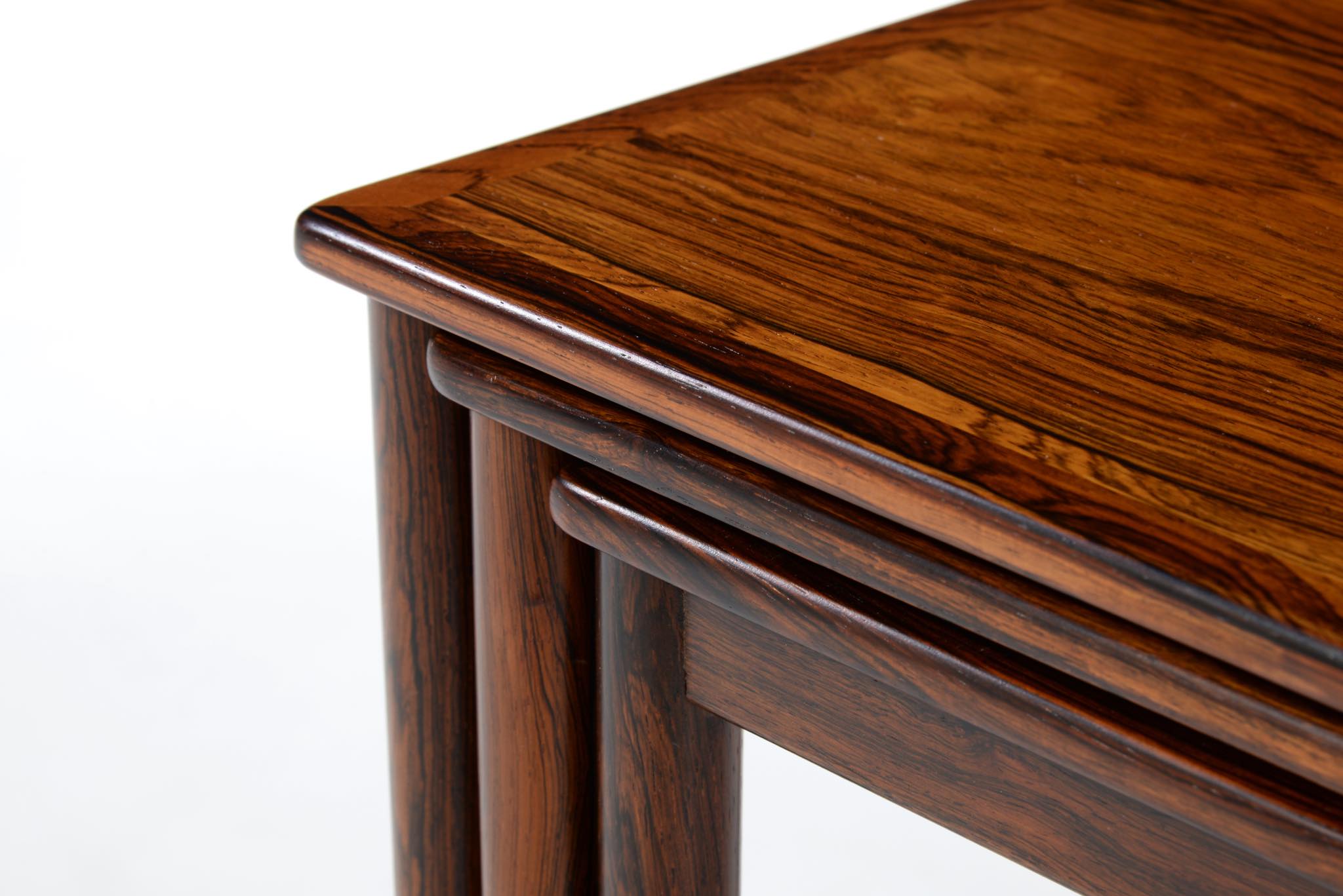 デンマークのデザイナー、Kai Winding/カイ・ウィンディングによるネストテーブルです。ブラジル原産と思しき特有の木目の現れた材を用いて作られています。天板は突き板、脚は無垢材を細く削り出しており、脚の濃淡は個体差でしょう。天然木の強固さを感じるテーブルです。