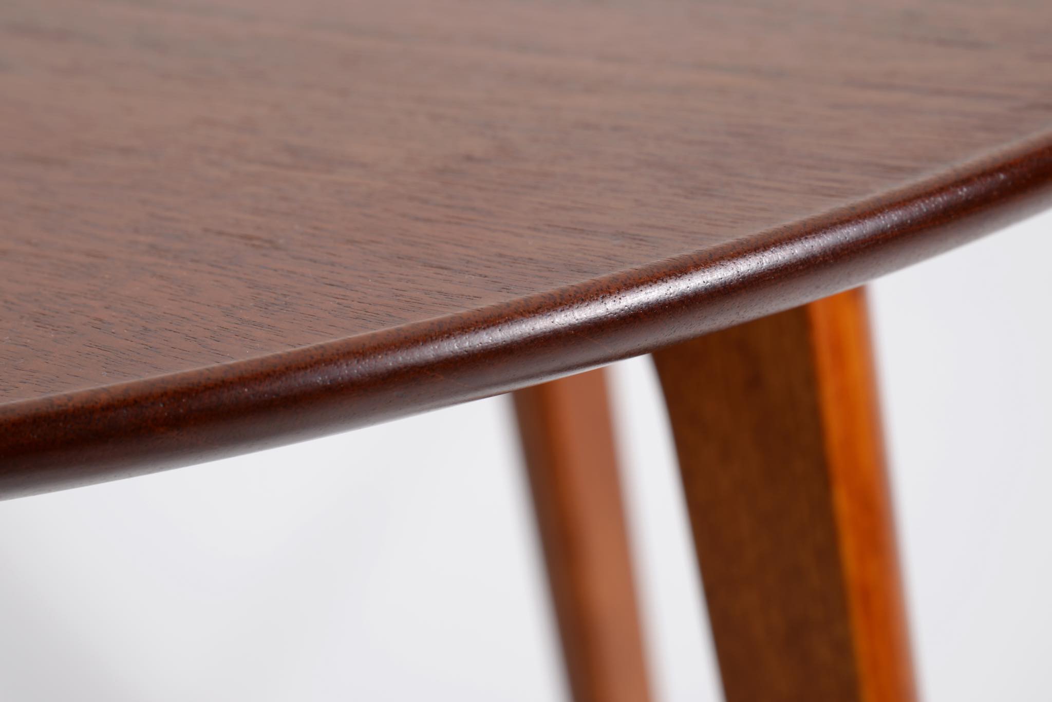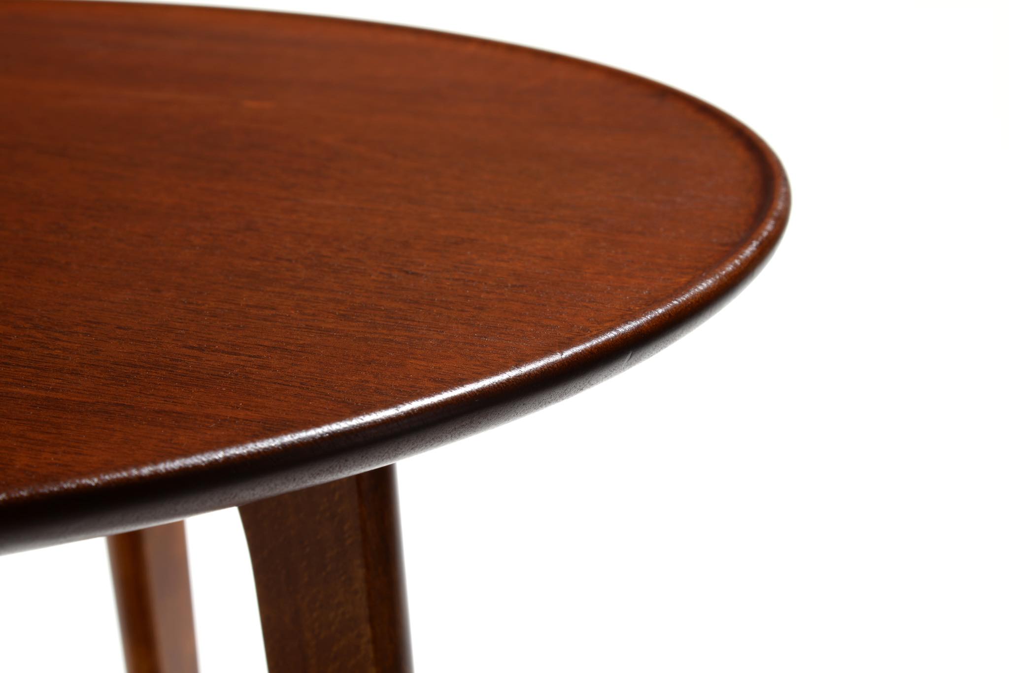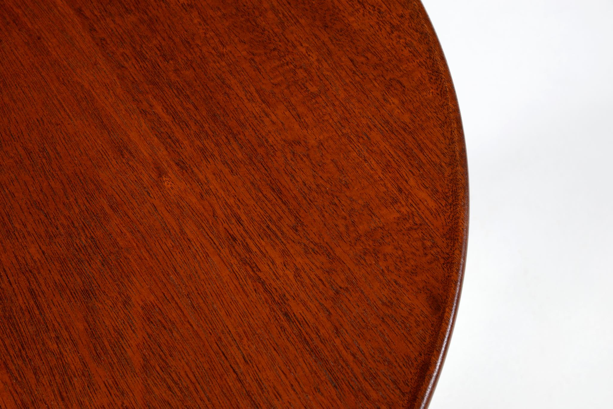 1950年代頃のアノニマス的なテーブルに思えますが、1940年代頃のフリッツ・ヘニングセンの作品にも同等の天板が見られます。天板にはマホガニーの無垢材、脚にはステインドビーチが用いられています。脚が長く細いため、若干の揺らぎは否めませんが、緩みなどはなくコンディションは良好です。