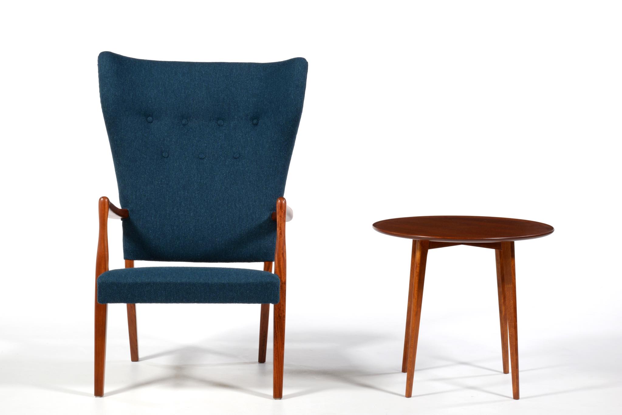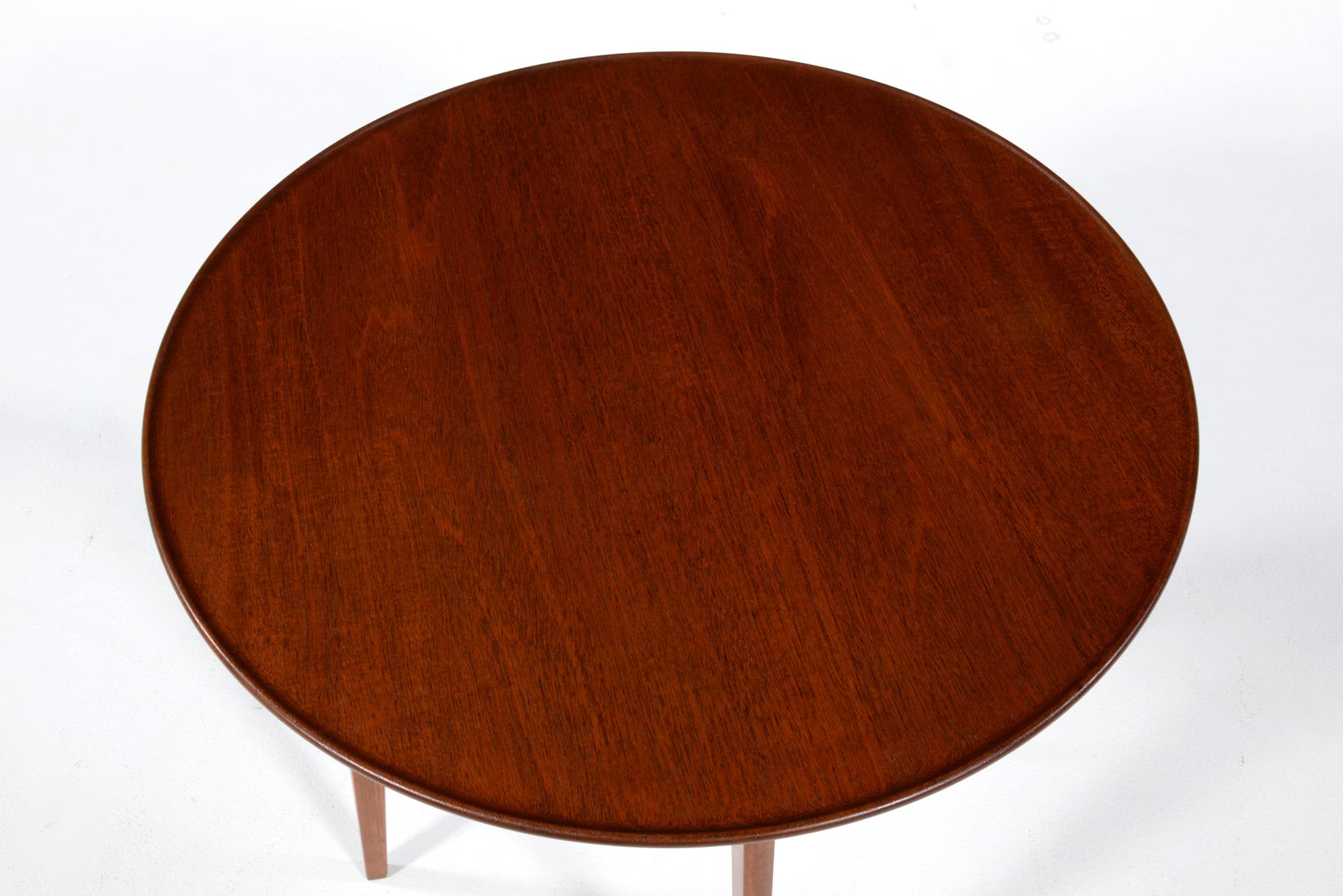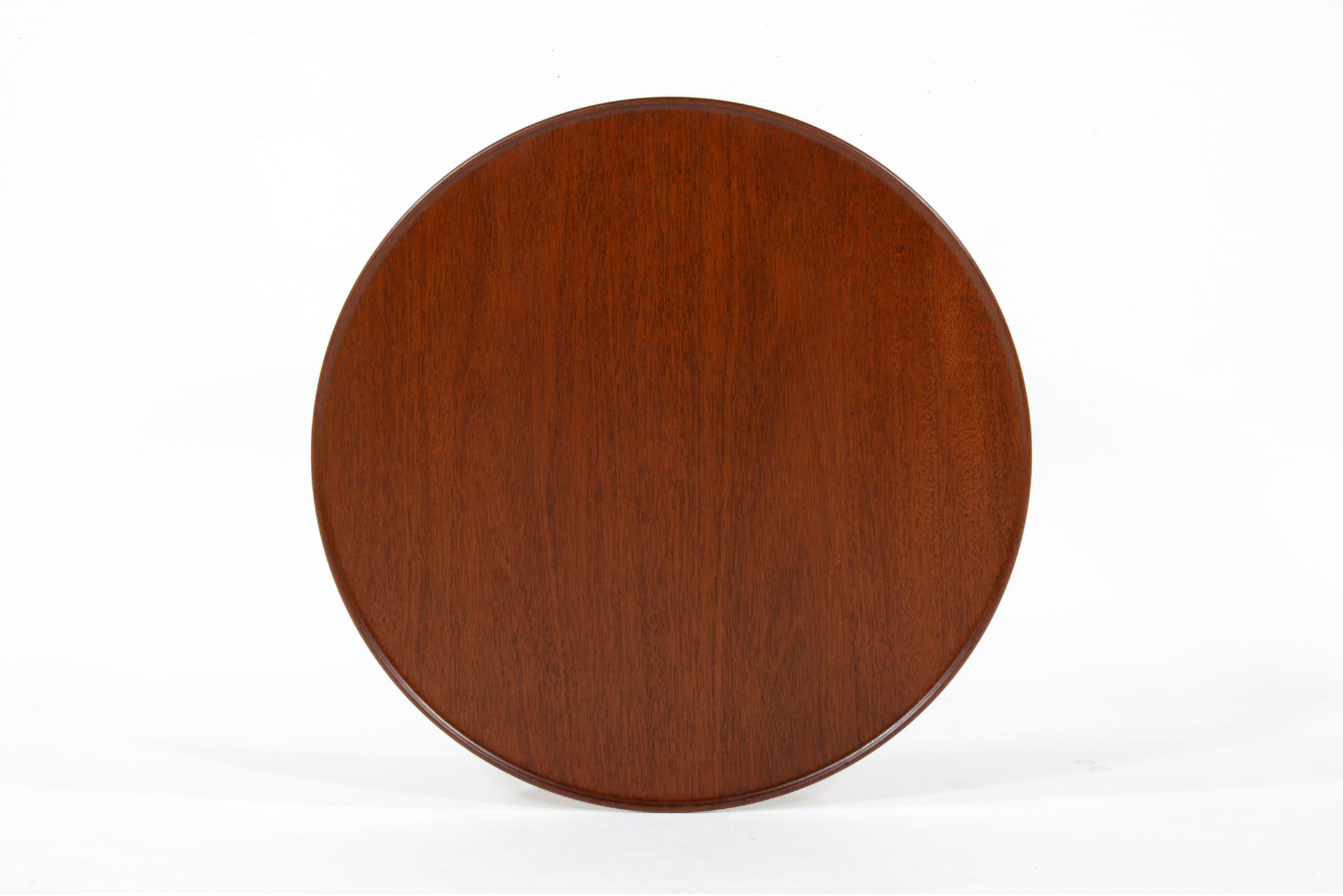 1950年代頃のアノニマス的なテーブルに思えますが、1940年代頃のフリッツ・ヘニングセンの作品にも同等の天板が見られます。天板にはマホガニーの無垢材、脚にはステインドビーチが用いられています。脚が長く細いため、若干の揺らぎは否めませんが、緩みなどはなくコンディションは良好です。
