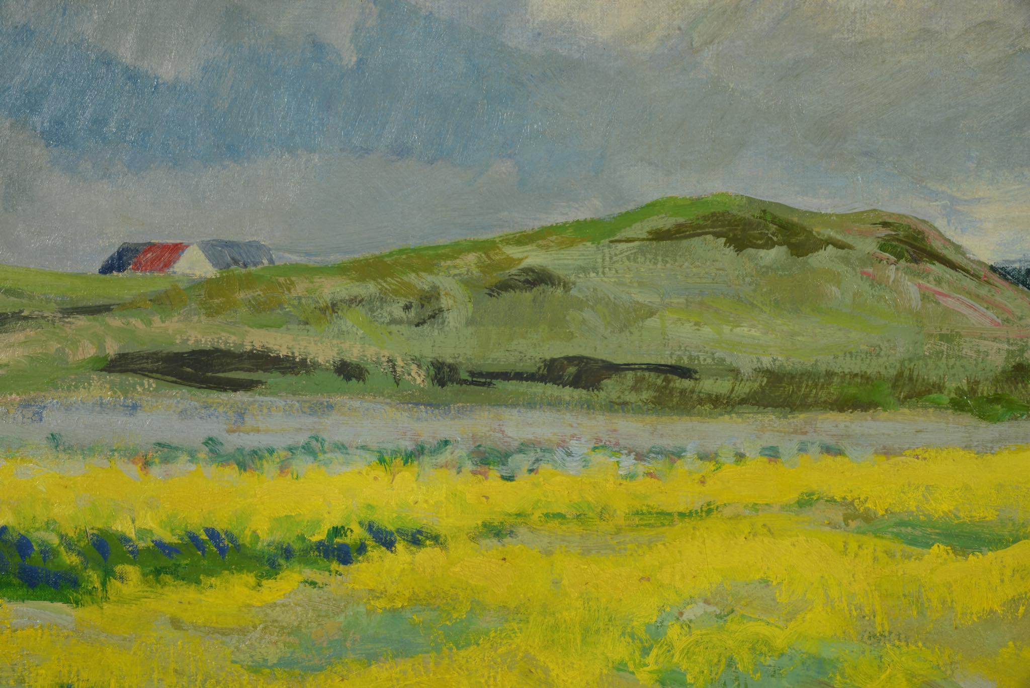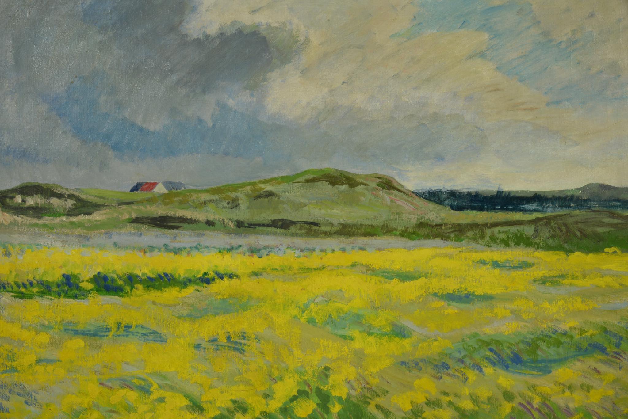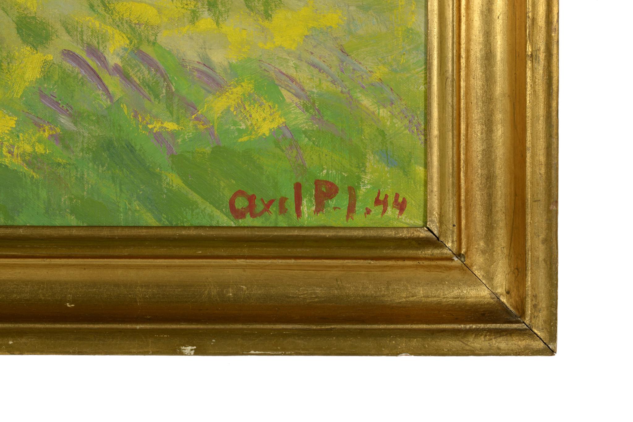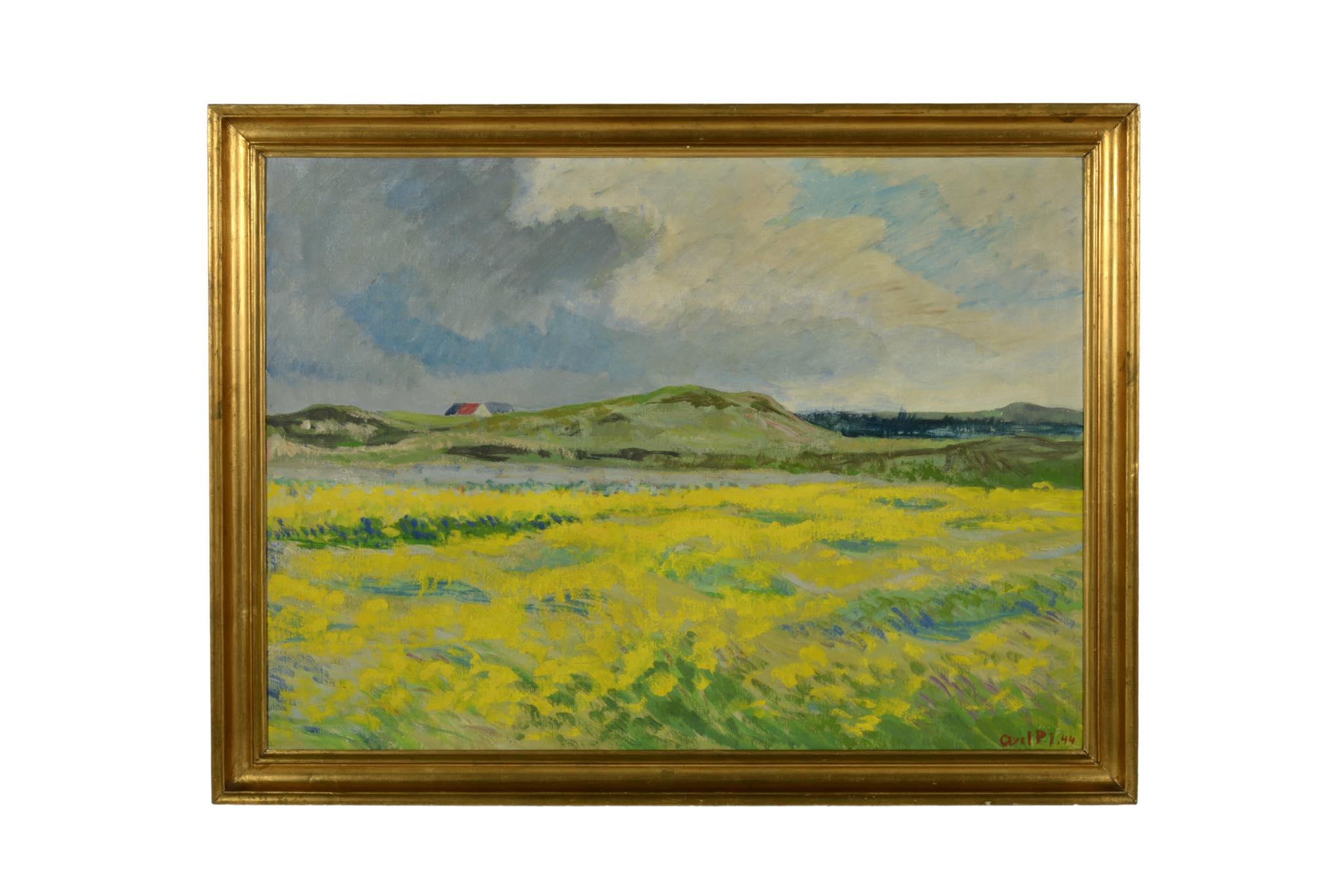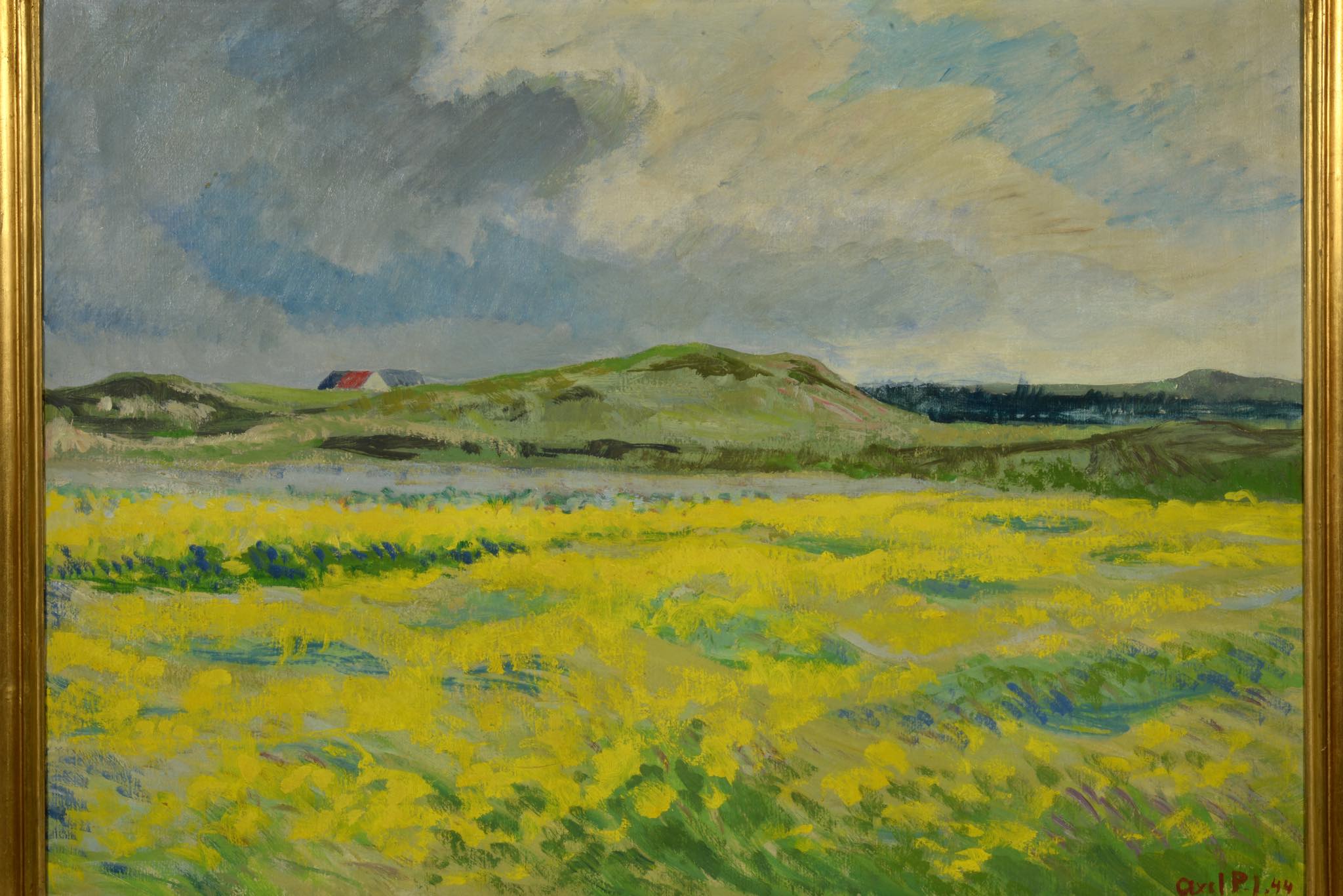 デンマークの画家、Axel Peder. Jensen/アクセル・P・イェンセンによる風景画作品です。デンマークがナチス占領下にあった1944年に描かれたもので、黄色い絨毯のように菜の花が一面に咲き乱れる様子が描かれています。フレームはオリジナルのようで、小傷等見られますが鑑賞の妨げにはならない程度です。